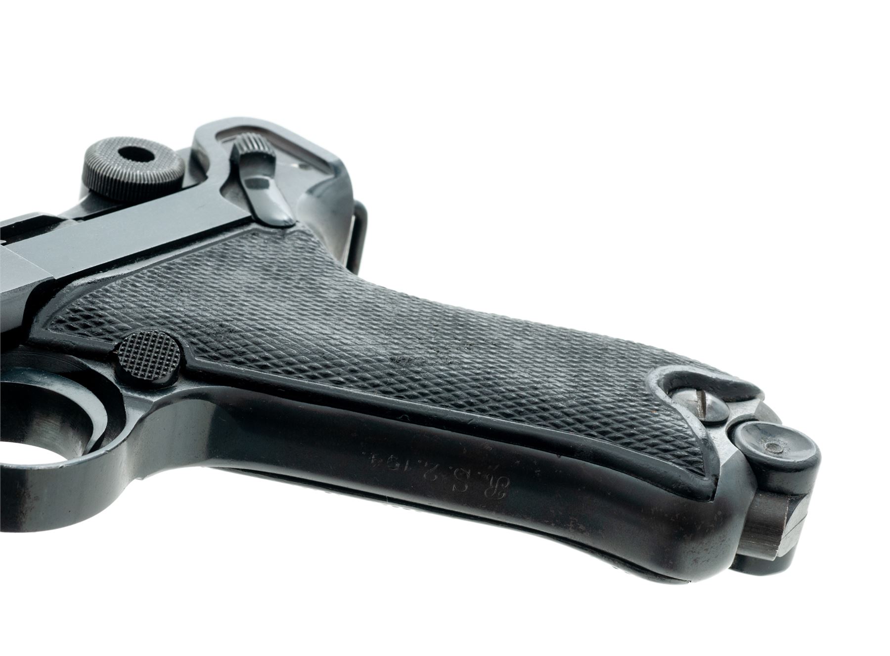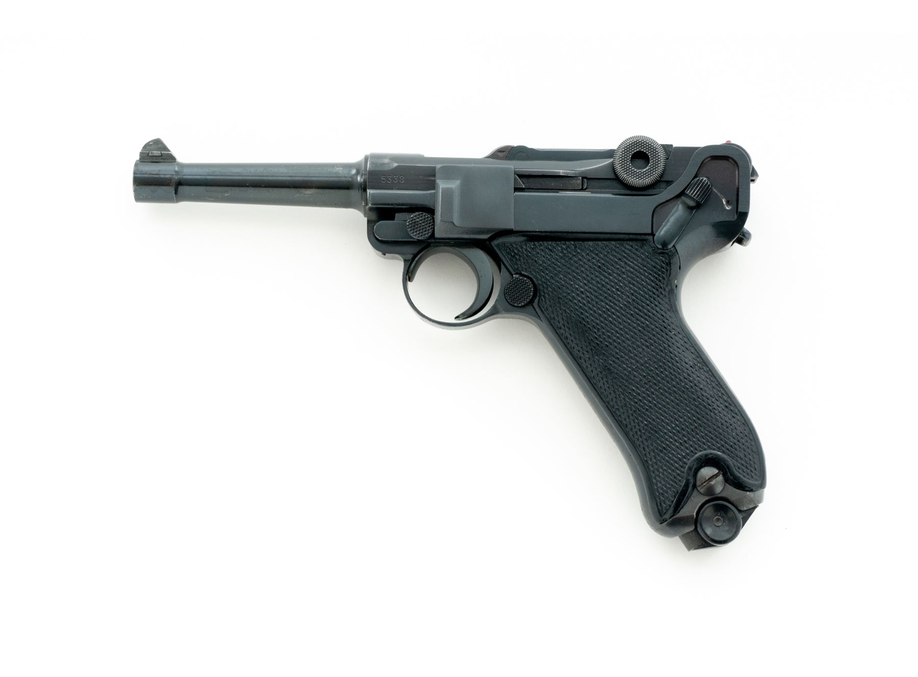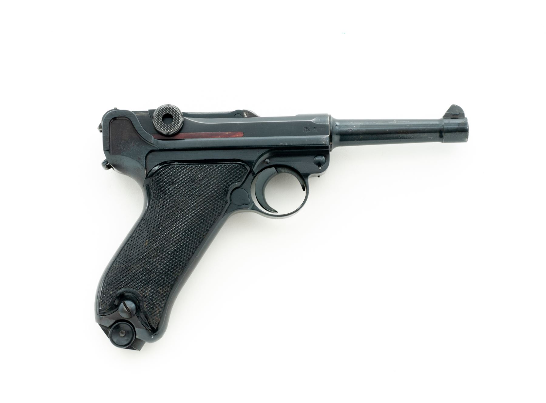 WWII P.08 Luger, by Mauser, #5338, 9mm, 4'' barrel, blue finish, factory checkered black plastic grips, front strap marked ''R.S.2.194'', with one late-war blue-bodied fxo marked magazine. 1940 marked chamber, ''42'' to central toggle link, ''Gesichert'' to thumb safety, and ''Geladen'' to extractor. All visible matching numbers. Condition is excellent as professionally refinished, retaining approx. 97% blue. Grips with moderate to heavy losses of checks. Trigger return spring needs replacement. Bore is bright. Est.: $1,000-$1,500. (C&R)