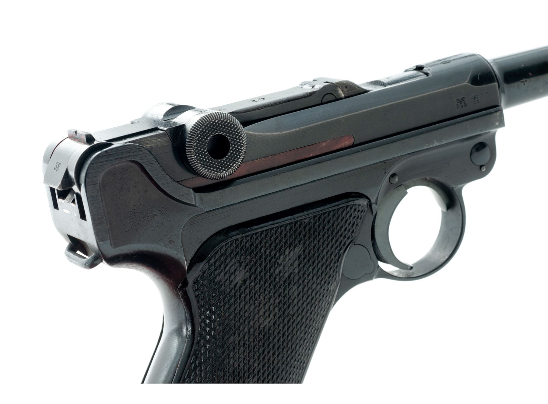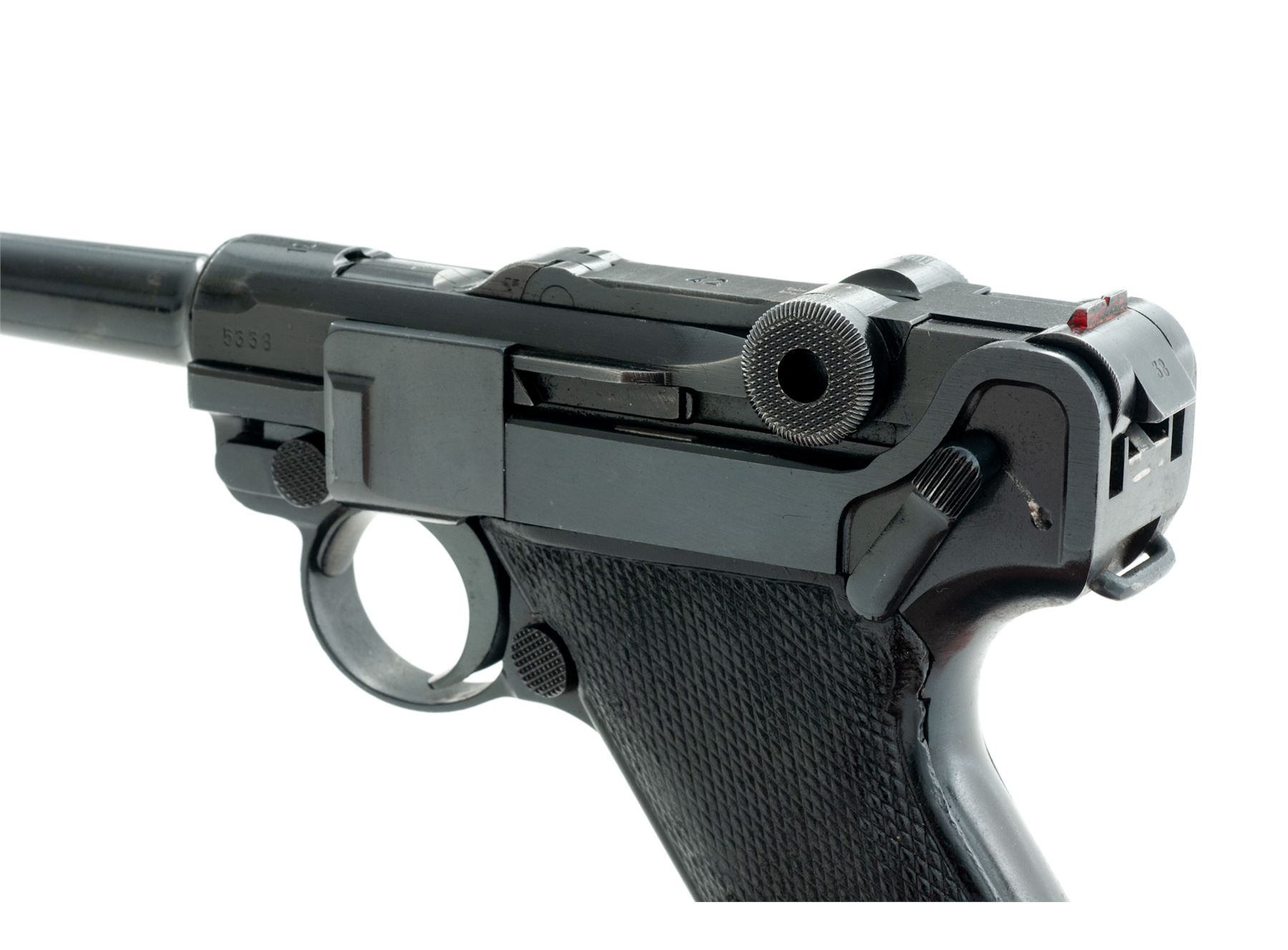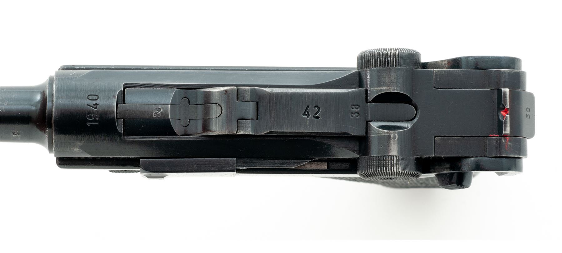 WWII P.08 Luger, by Mauser, #5338, 9mm, 4'' barrel, blue finish, factory checkered black plastic grips, front strap marked ''R.S.2.194'', with one late-war blue-bodied fxo marked magazine. 1940 marked chamber, ''42'' to central toggle link, ''Gesichert'' to thumb safety, and ''Geladen'' to extractor. All visible matching numbers. Condition is excellent as professionally refinished, retaining approx. 97% blue. Grips with moderate to heavy losses of checks. Trigger return spring needs replacement. Bore is bright. Est.: $1,000-$1,500. (C&R)