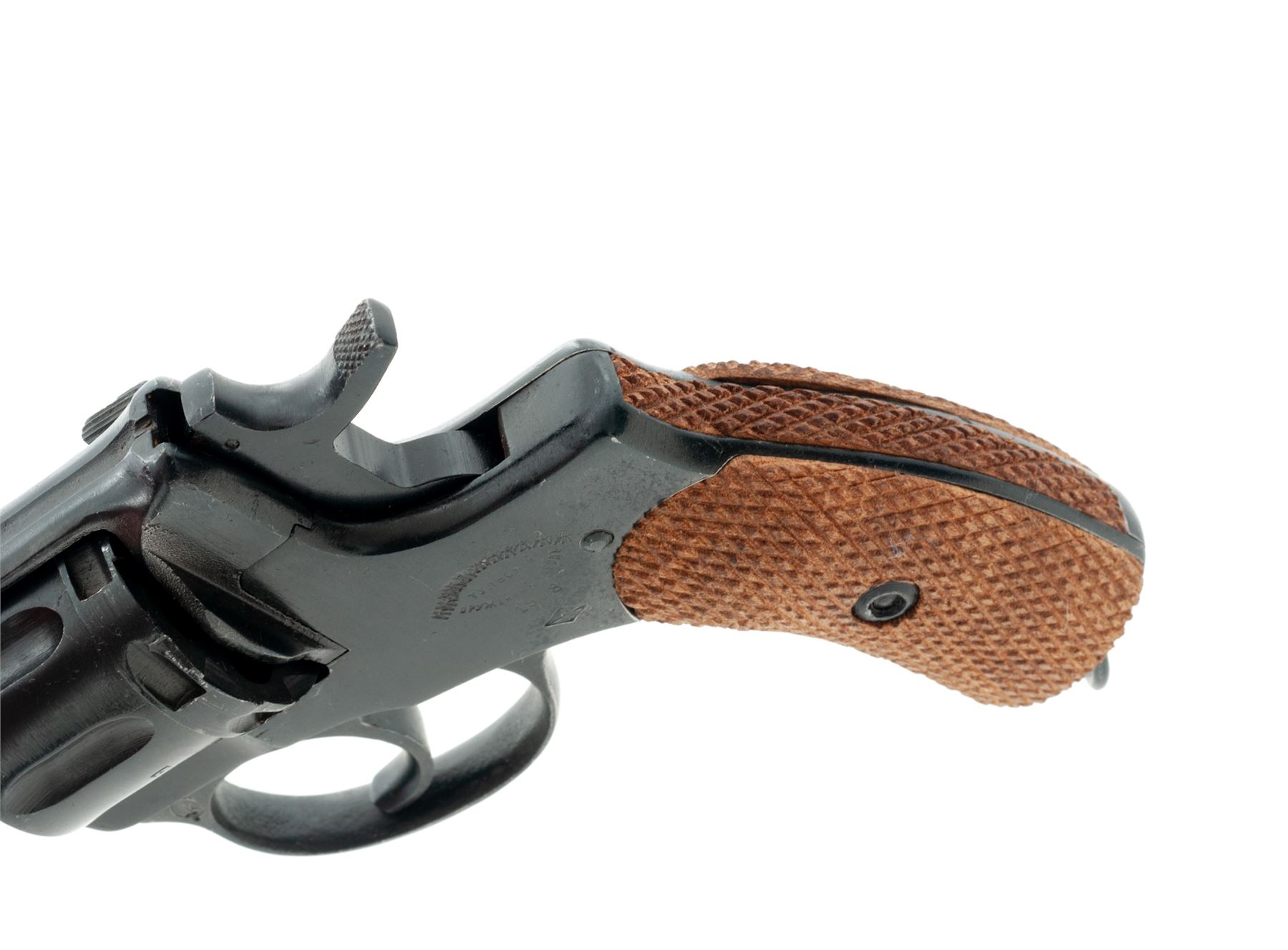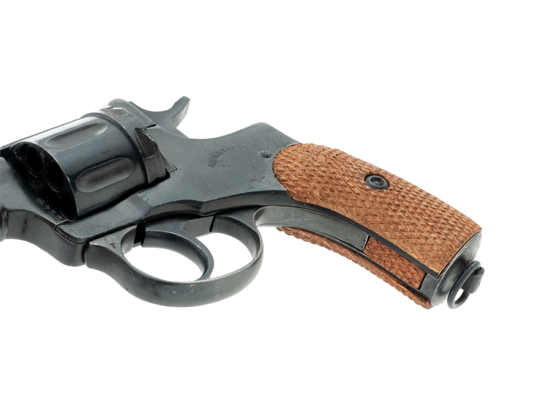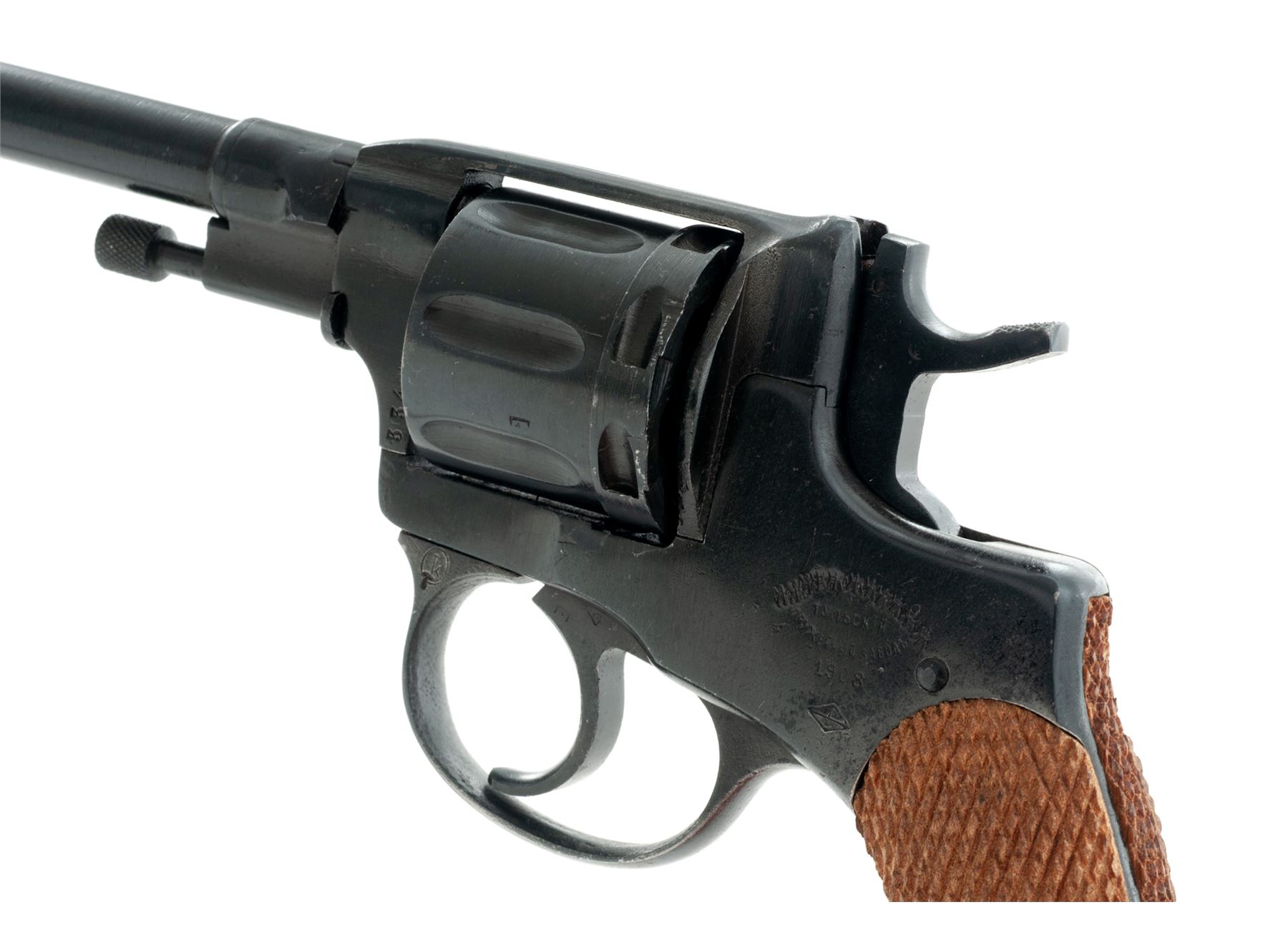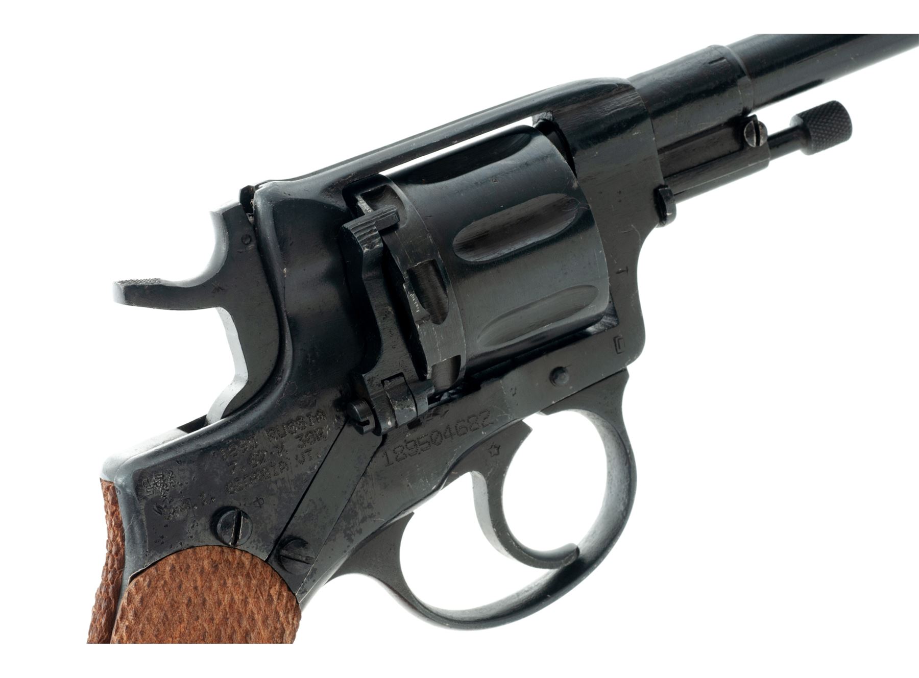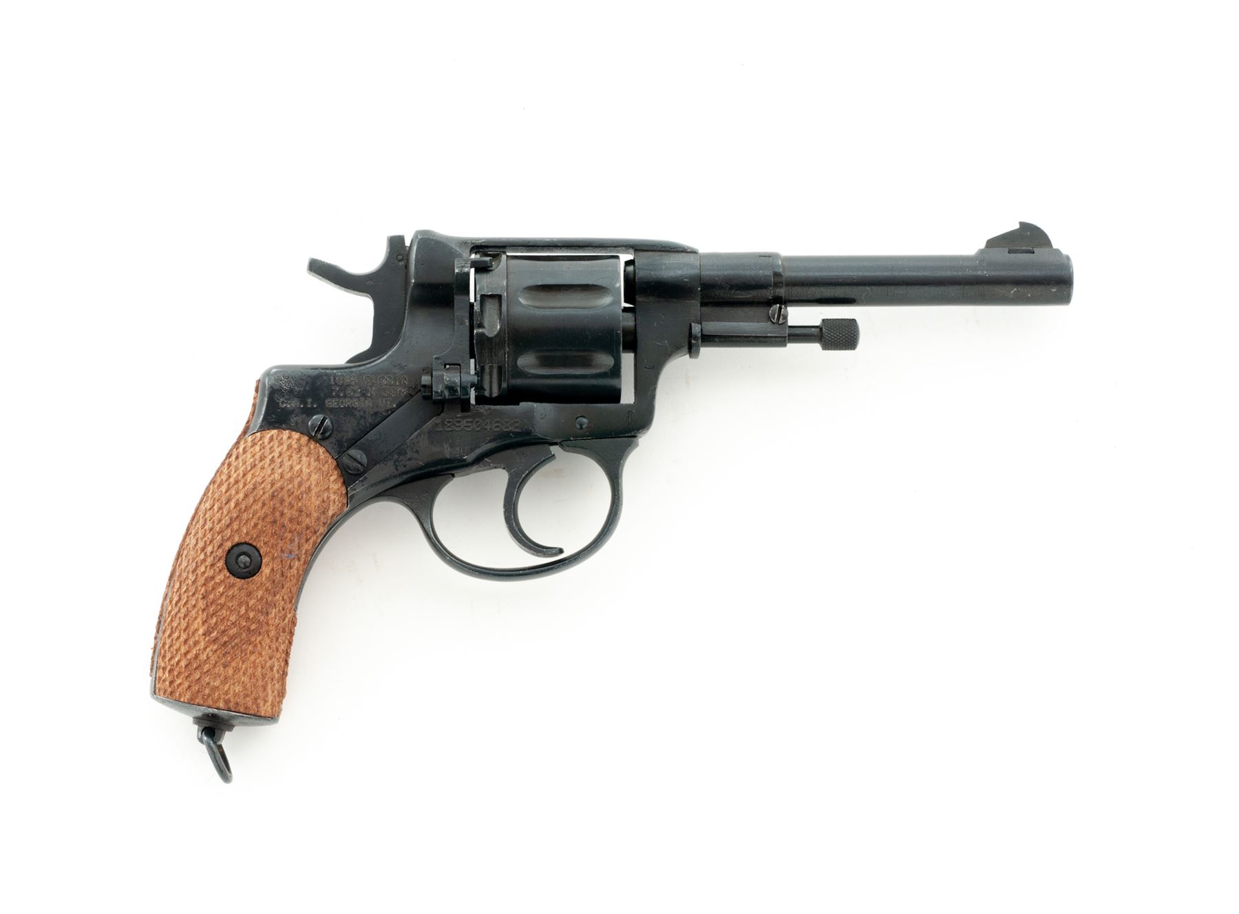 Imperial Russian Model 1895 Nagant ''Gas Seal'' Double Action Revolver, manufactured at Tula Arsenal, importer applied #189504682, 7.62x38mmR cal., 4.5'' barrel, blued finish, checkered wood grips, blade front sight, fixed ''U''-notched rear sight, with lanyard ring. Imperial Tula marks on left side of frame have been partially defaced (stamped over), dated ''1908'', with arsenal refurbishment stamp. Right side of frame is import marked by CAI and renumbered upon importation. The numbers that are visible on the cylinder match what is visible in the original serial number. Metal rates as very good, most of the arsenal re-blued finish remains, which was applied over areas of light to moderate pitting. Grips are excellent and show little wear, checkering is sharp. Very good action; bore with some very light frosting, rifling is excellent. Est.: $200-$300. (C&R/PPT)