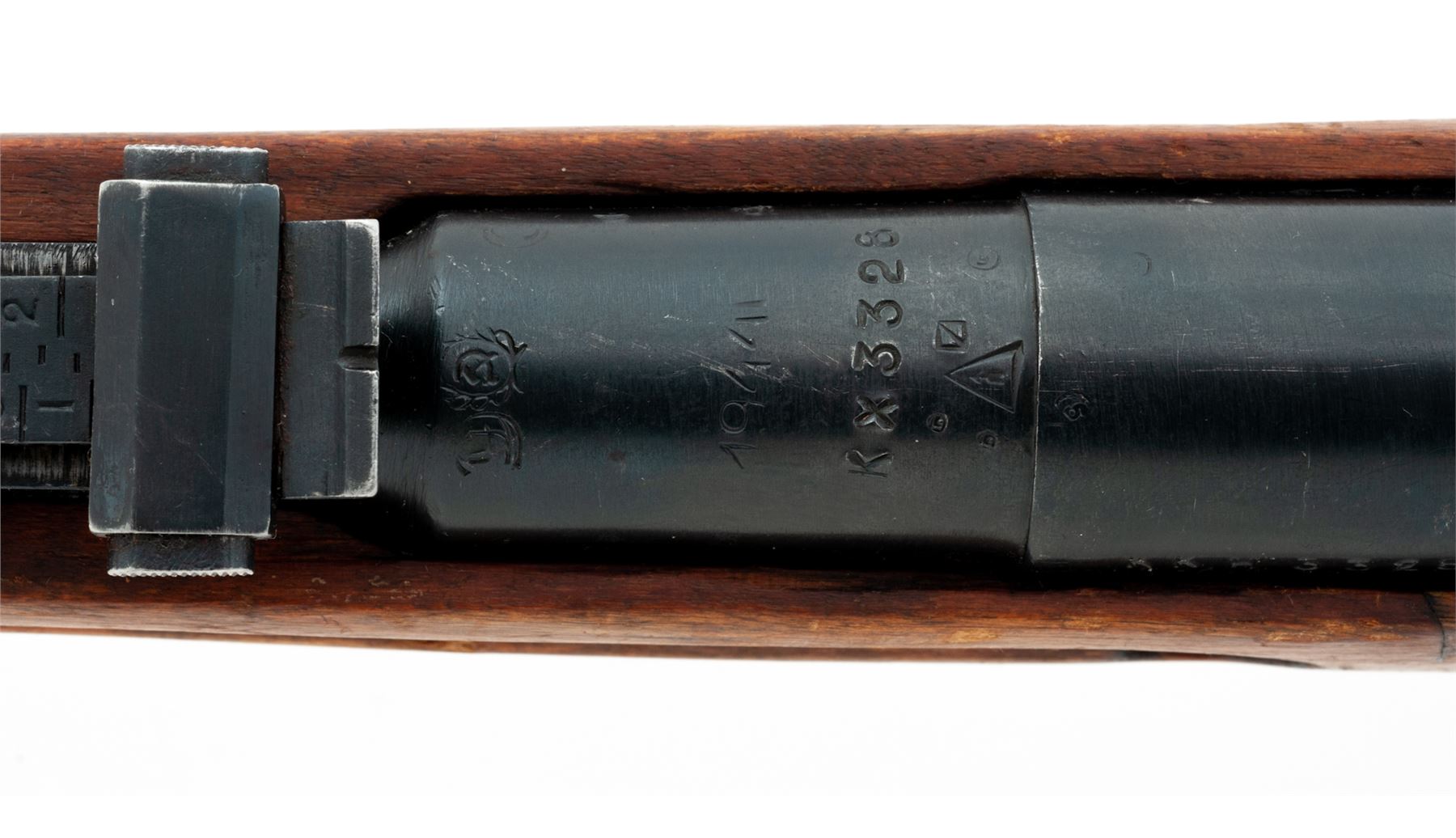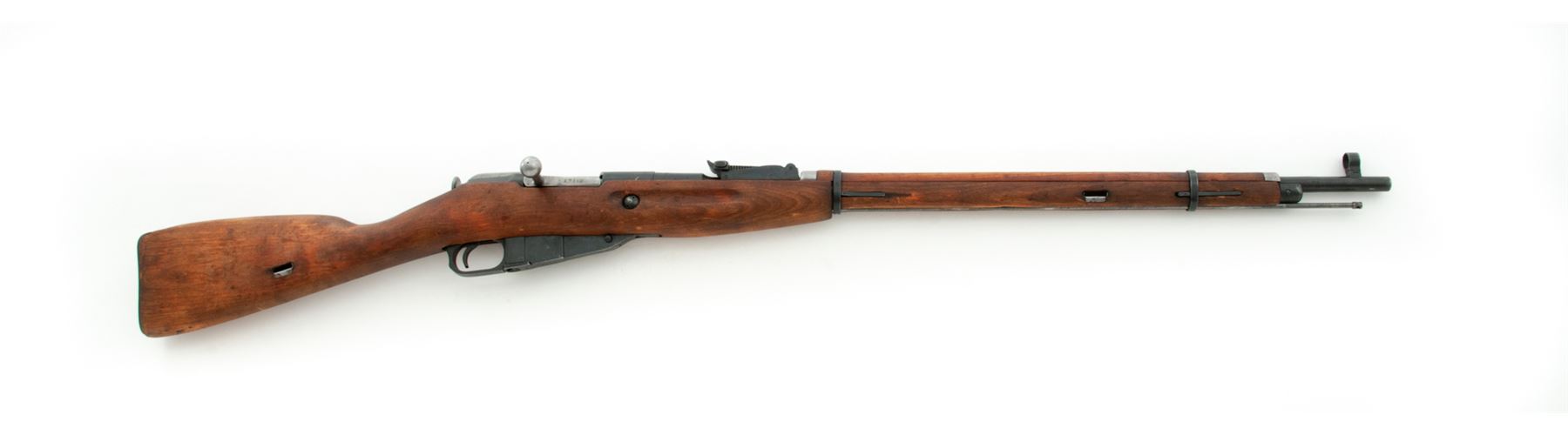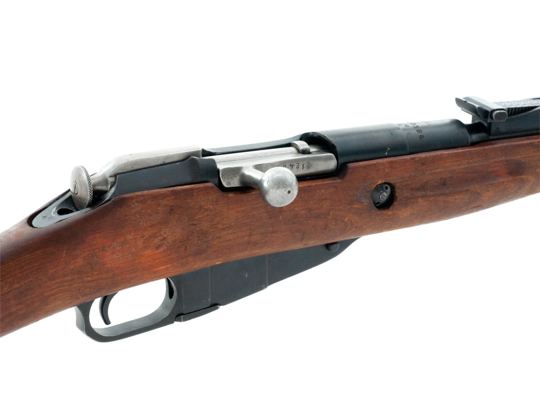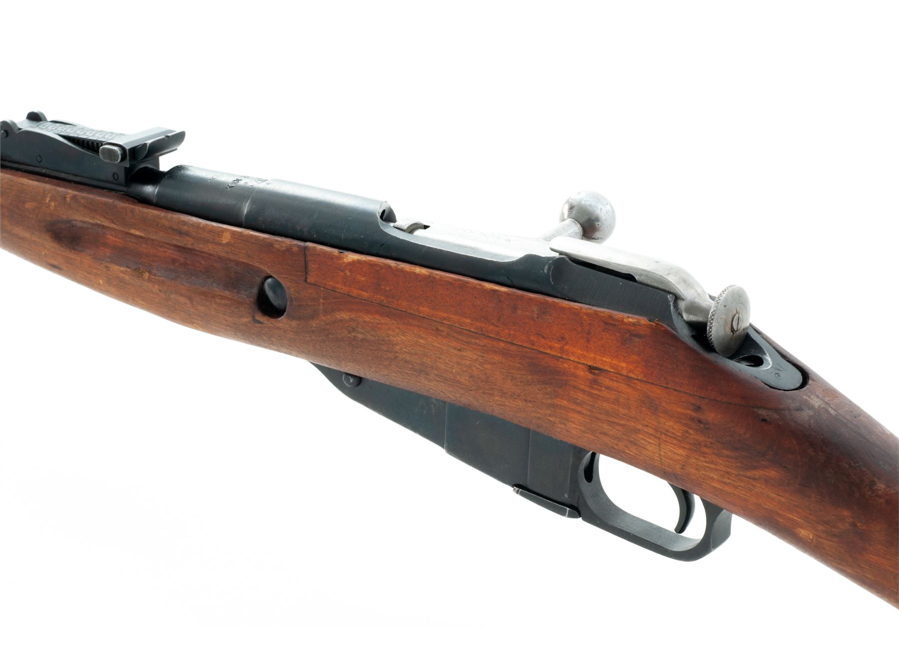 Soviet M91/30 Mosin-Nagant Bolt Action Rifle, #KKH3282, 7.62x54R cal., 28.7'' barrel, blued finish, hardwood stock, hooded post front sight and adjustable tangent rear sight. Marked on barrel shank with ''(Soviet crest)/1944r'' and the Izhevsk Arsenal stamp. A refurbishment mark has been stamped below the serial number. Mismatched number on bolt, other numbers match. Cleaning rod included. Rifle shows evidence of having once been a sniper rifle, as the receiver has been drilled and tapped for a scope that was removed with grinding and other marks visible. Stock has a wood splice added where the slot for the scope base was mounted. Condition is very good as arsenal refinished, with approx. 80% finish remaining on metal surfaces with areas of thinning. Wood has scattered areas of its shellac finish remaining with overall handling marks. Cleaning rod channel area has been sanded. Action is smooth, bore is very good. Import stamped on right side of barrel. Est.: $350-$450. (C&R)