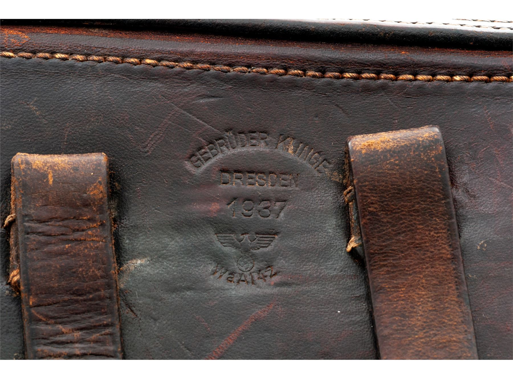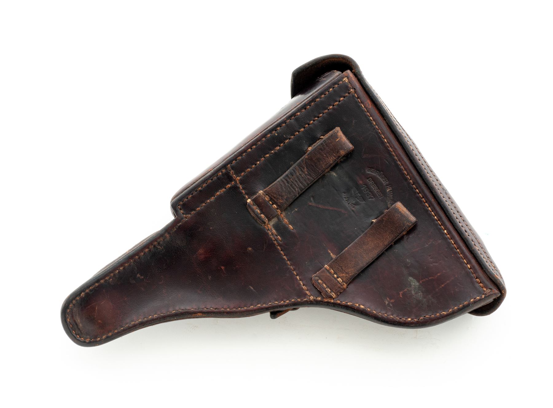 1937 dated P.08 Luger Brown Leather Holster, by Gebruder Klinge, Dresden (1937), with WaA 142 Waffenampt. Condition is fine with light scuffing and tight stitching. Good strap. Est.: $300-$400.