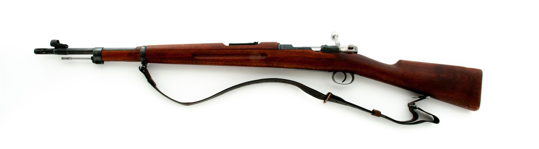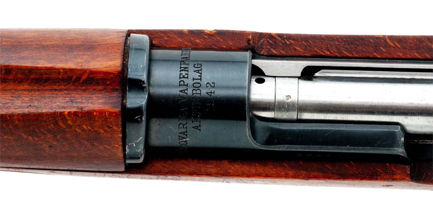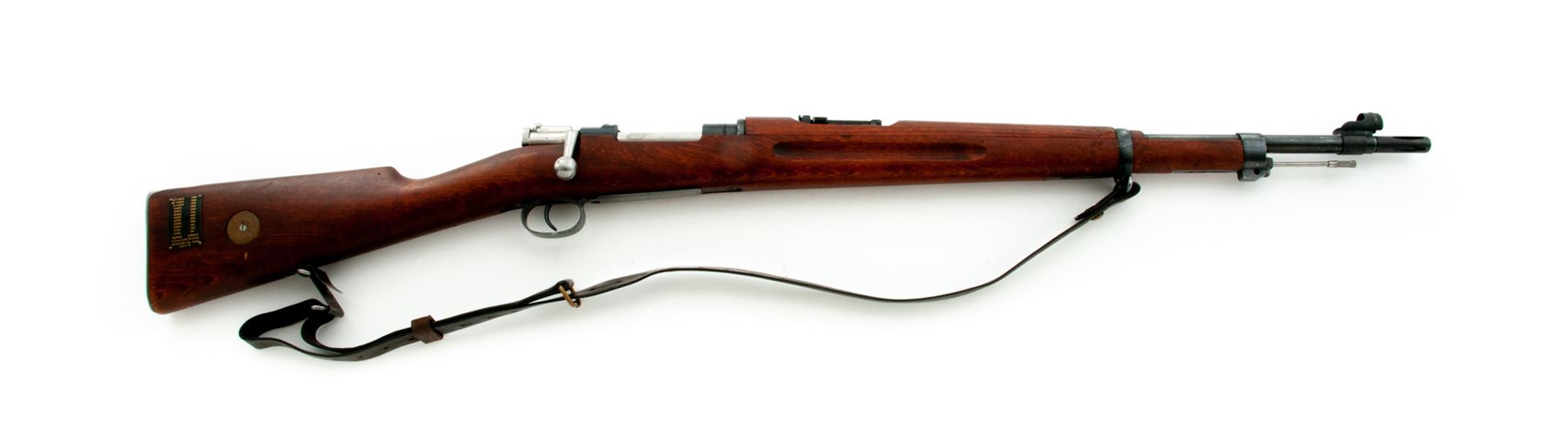Swedish Model 38 Mauser Bolt Action Rifle, #639211, 6.5x55mm cal., 23.6'' barrel, blued finish, hardwood stock, blade front sight with added sight hood and adjustable folding leaf rear sight, and cleaning rod. Marked on receiver ring ''HUSQVARNA VAPENFABRIKS AKTIEBOLAG 1942''. Matching numbers. Right side buttstock has round disc showing bore wear, etc.; a rectangular range/sighting plate is also attached. A commercial muzzlebrake has been attached to the threaded muzzle. Condition overall is very good with approx. 90% finish remaining on the metal, which has thinned bright on the magazine floorplate. Wood is also very good with just a few light handling marks. Action is smooth, bright bore is excellent with sharp rifling. Import stamped on underside of barrel. Swedish leather sling in good condition is included. Est.: $400-$600. (C&R)