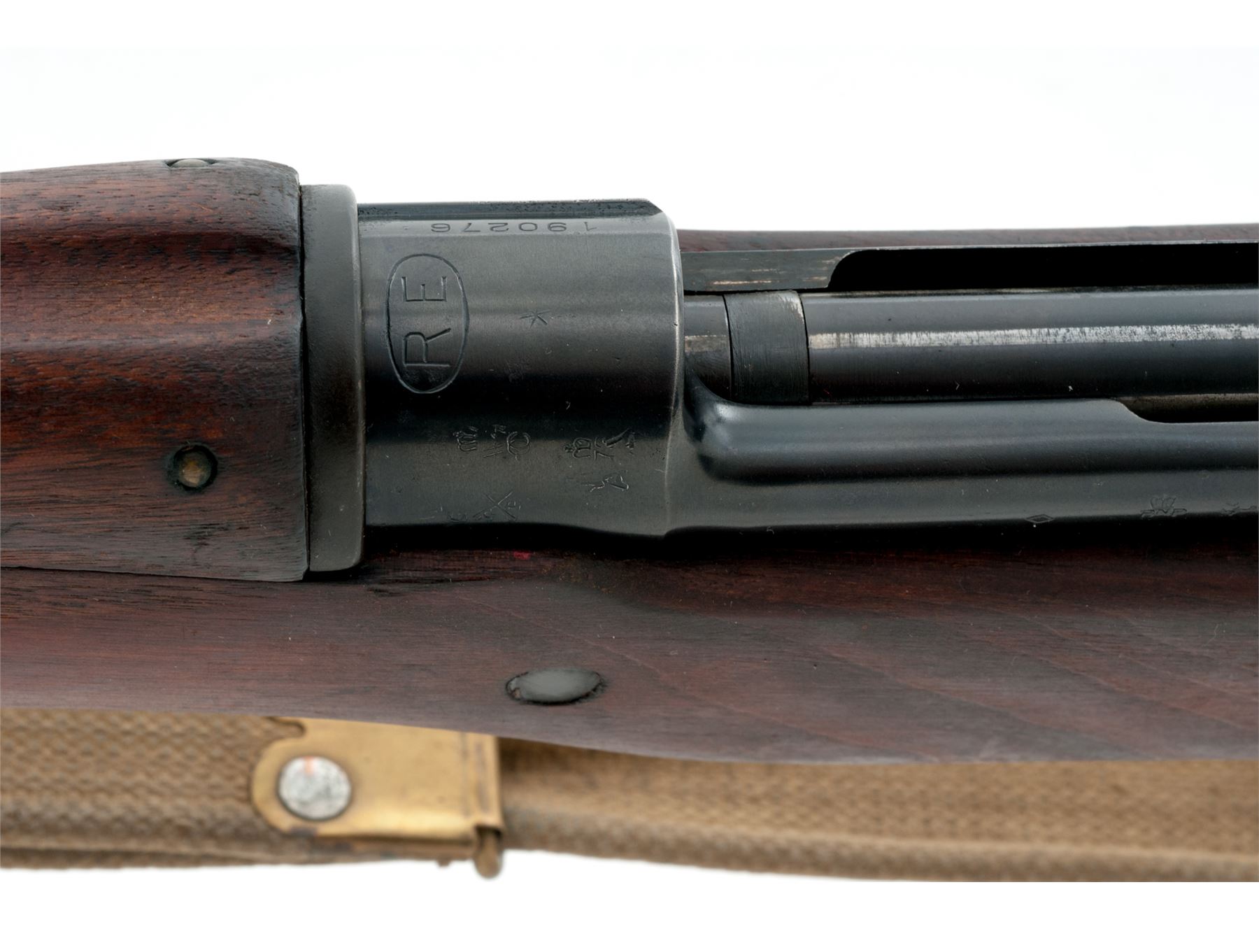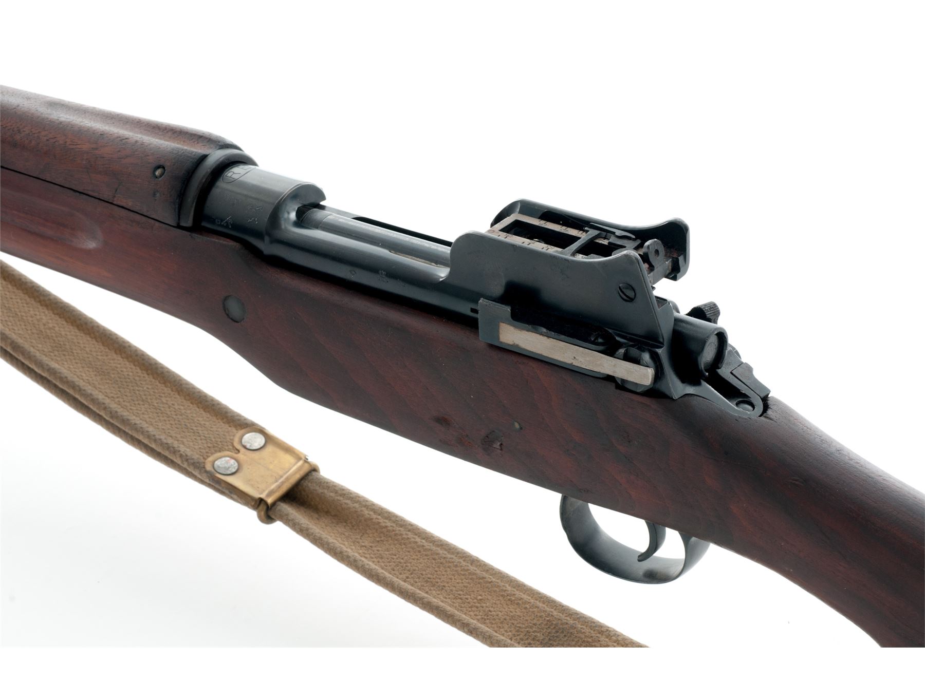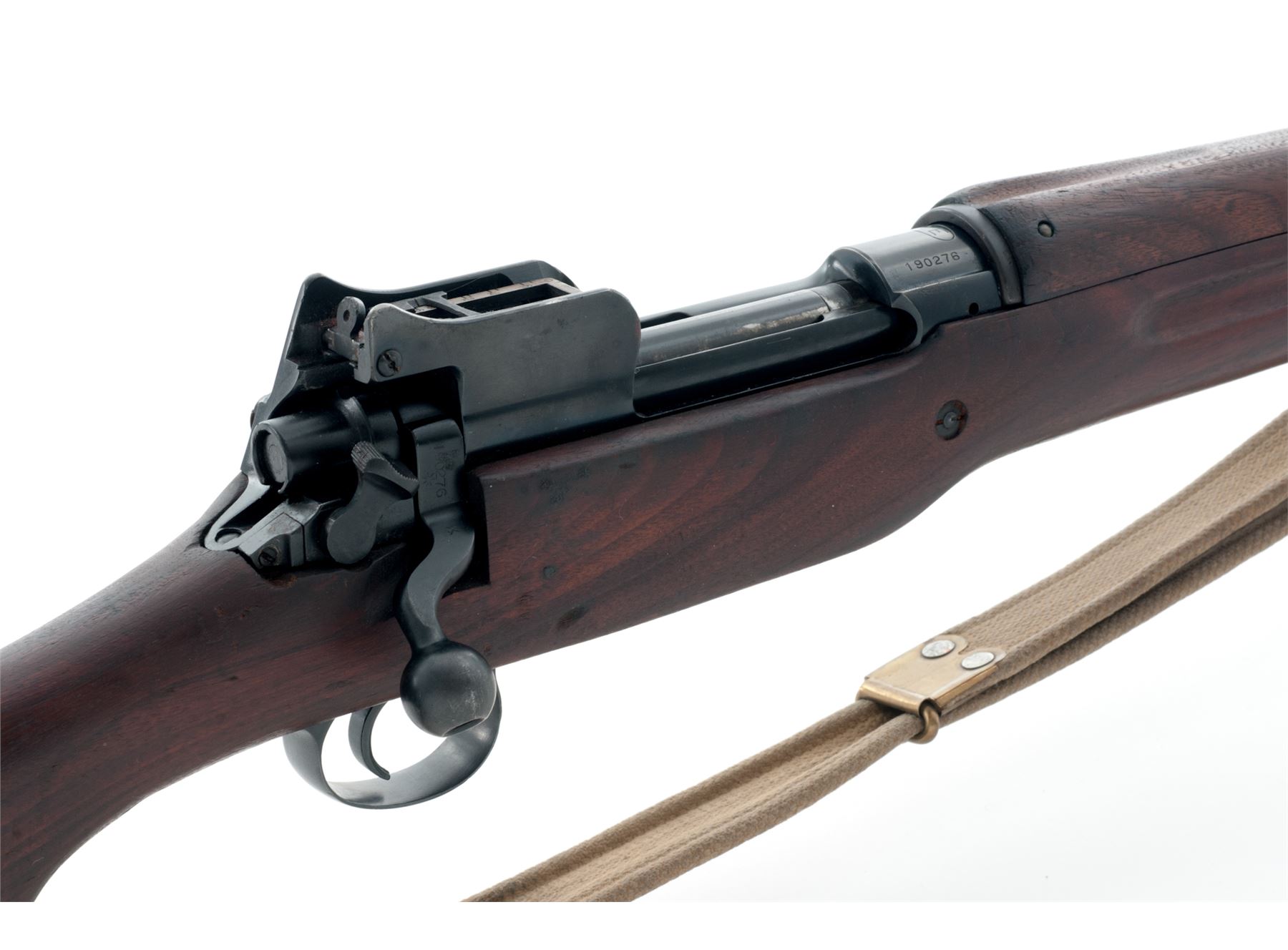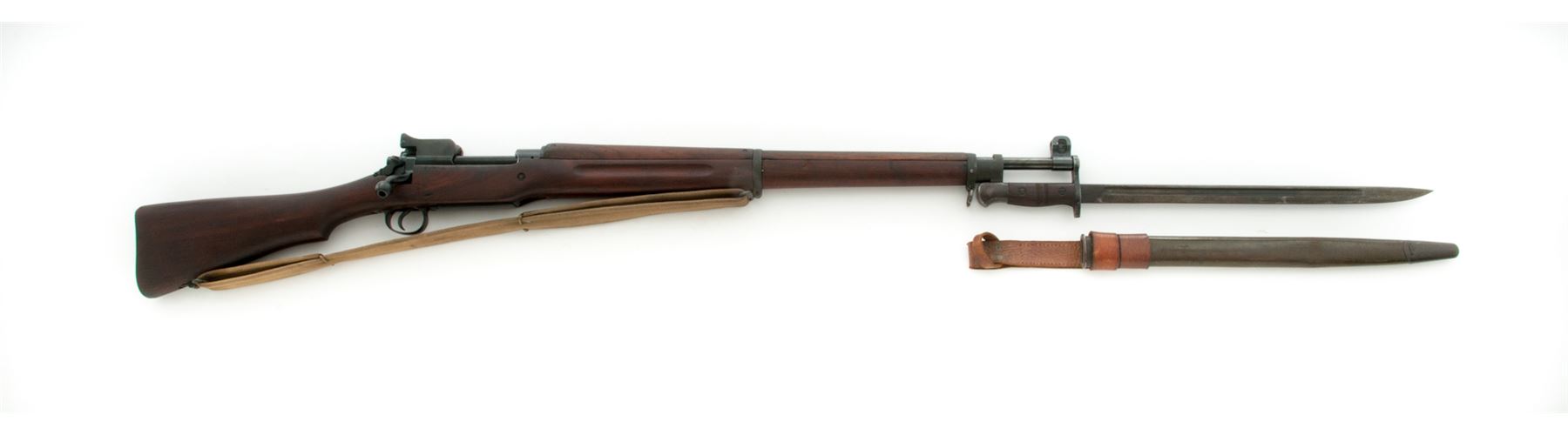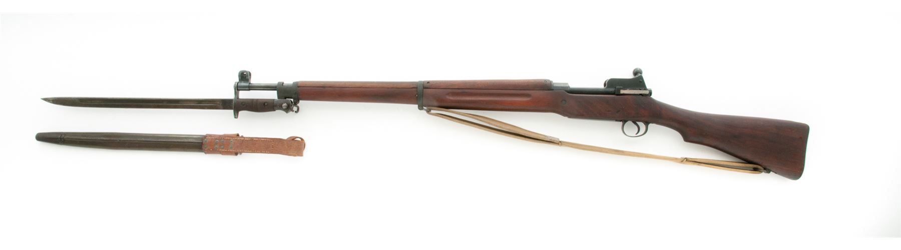 British P-14 Bolt Action Rifle, by Remington, with bayonet and scabbard, #190276, .303 British cal., 26'' barrel, blued/parkerized finish, walnut stock, blade front sight with protecting ears and adjustable folding leaf rear sight with aperture. Marked on top of receiver ring with ''RE'' along with British proof and inspection stamps. ''R'' stamp on underside of bolt handle. An asterisk has been added to the receiver ring and top of bolt handle. Mismatched number on rear sight leaf, matching number on bolt handle. Condition overall is very good with approx. 95% finish remaining on the reblued metal. Wood is very good with dark color and a few impressions and handling marks. Action is smooth, bore is dark with rust but may clean better. No visible import stamps. Bayonet is marked ''1913 6 17/REMINGTON''. British inspection stamps have been struck out and ''U.S'' overstamped. Condition overall is very good with a couple of small nicks to the blade and a mottled appearance to the metal; latch operates smoothly. Scabbard appears to be a U.S. M1917 model with the belt hooks removed and an unmarked British leather frog added. Both in very good condition. Includes a British cotton sling in good condition. Est.: $400-$600. (C&R)
