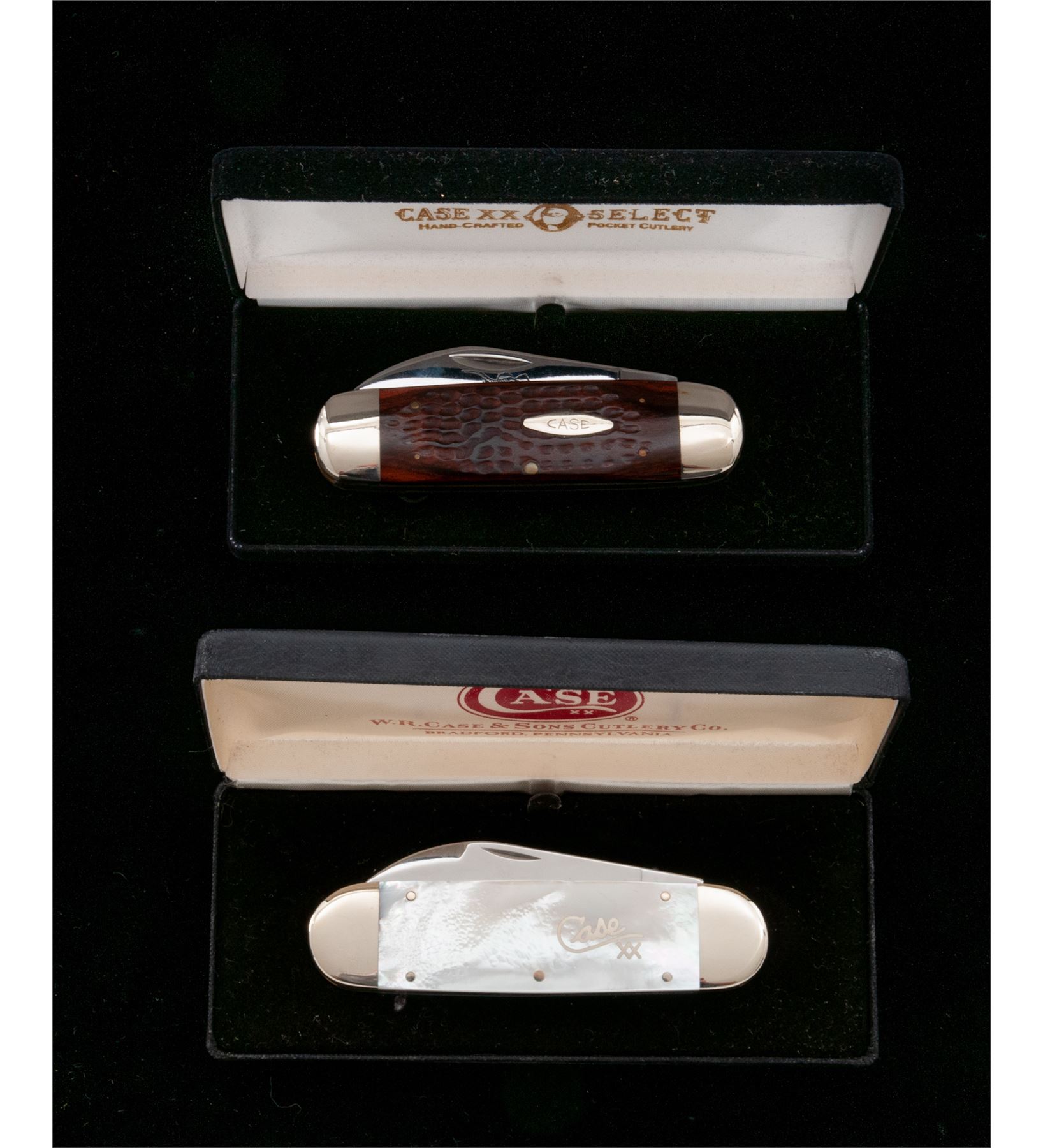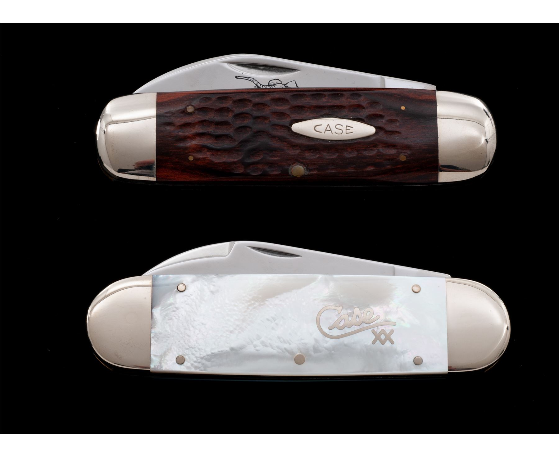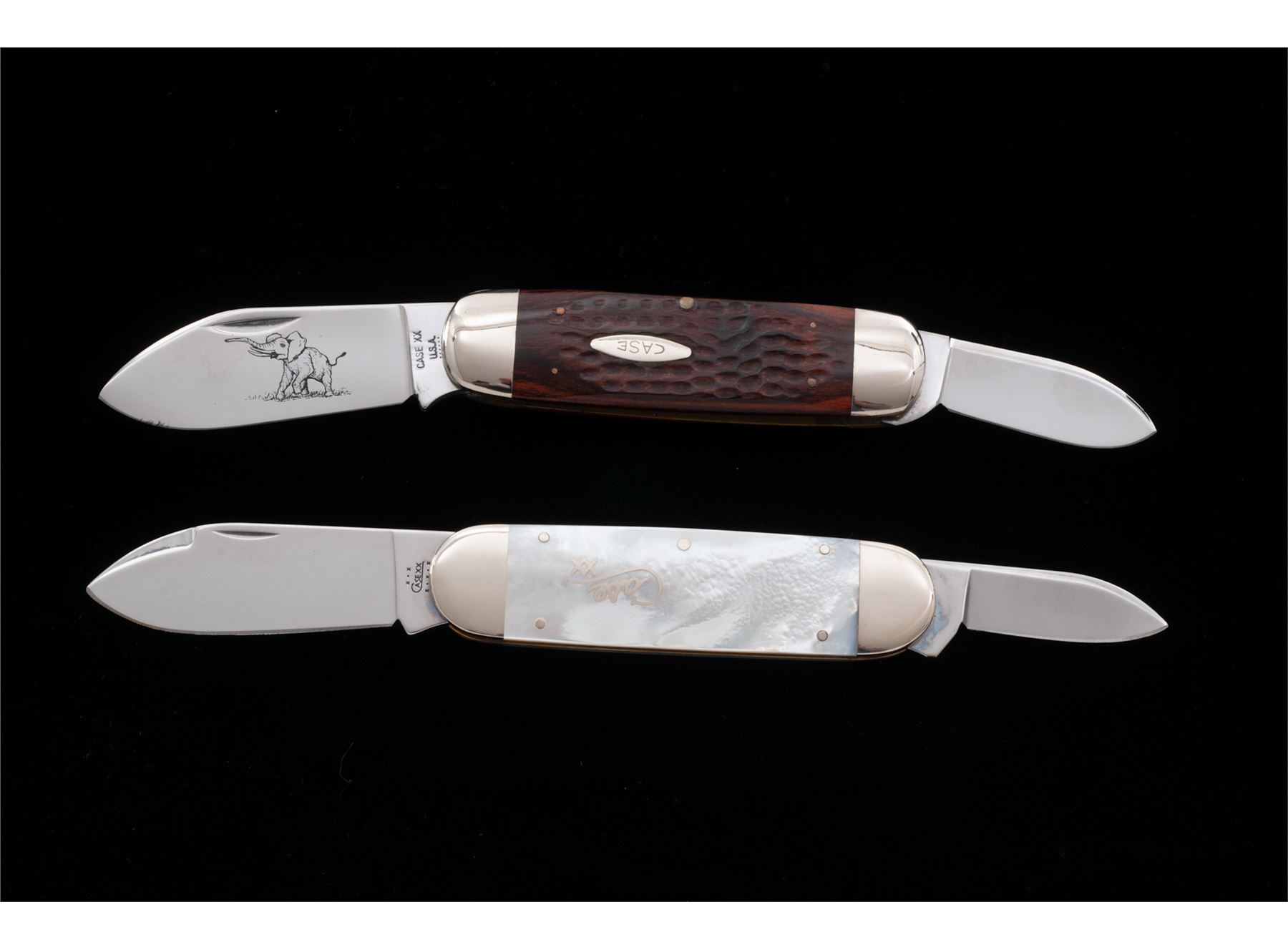 Lot of Two (2) Case #6250 Elephant Toe/Sunfish Knives: 1.) #6250, brown wood handles, made in 1994, etched elephant on the main blade, handle with a ''Case'' shield, 4-3/8'' overall closed length. Condition overall is near excellent. Blades and bolsters with scattered light scratching and small handling marks, blade etching and tang stamps are clear. Handles are excellent. 2.) #6250 SS, pearl handles, made in 2002, handle with silver ''Case XX'' inlay, 4-1/2'' overall closed length. Condition overall is near excellent. Blades and bolsters with scattered light micro-scratching and small handling marks, tang stamps are clear. Pearl handles are excellent and fit well, no chips or cracks. Both knives come in black Case Knives clamshell cases; one with a faux leather exterior that is a little tacky to the touch and one of the elastic retaining bands is broken. Est.: $300-$450/lot.