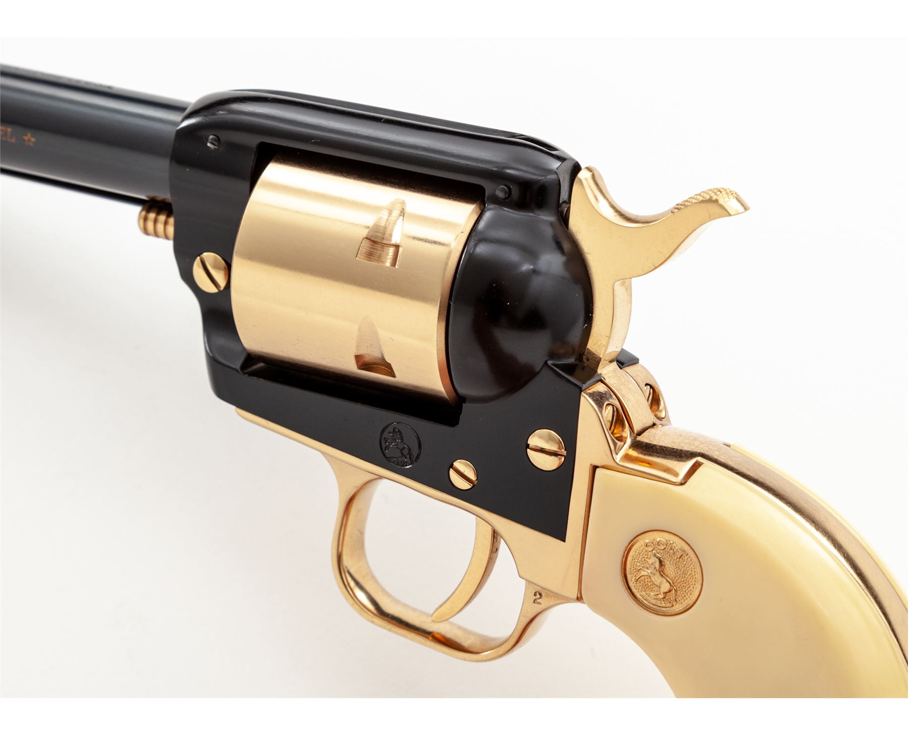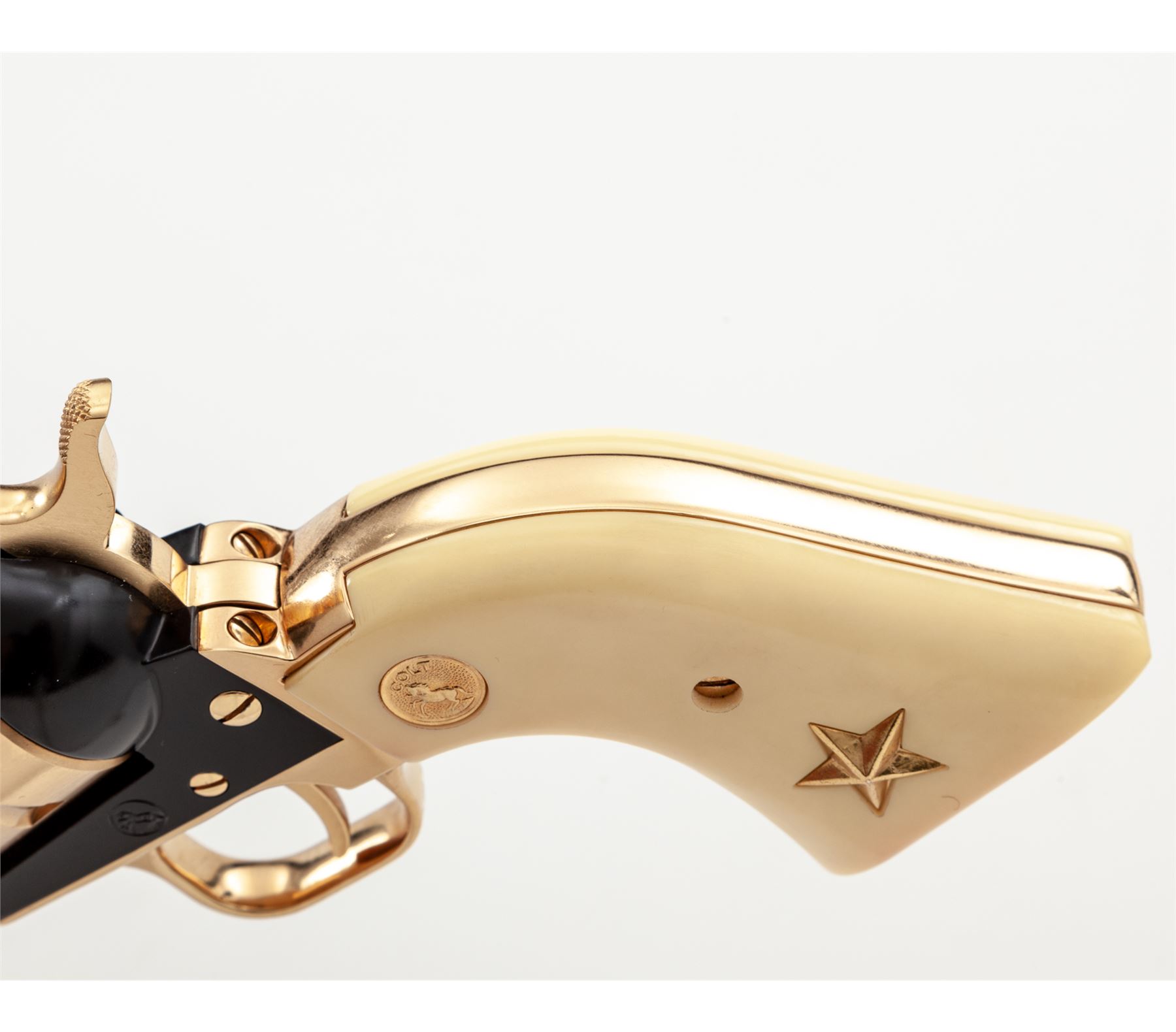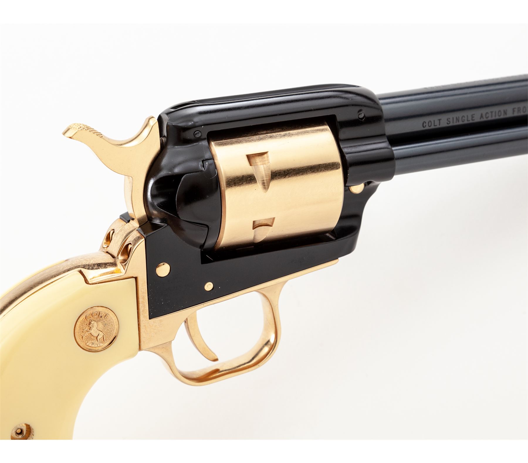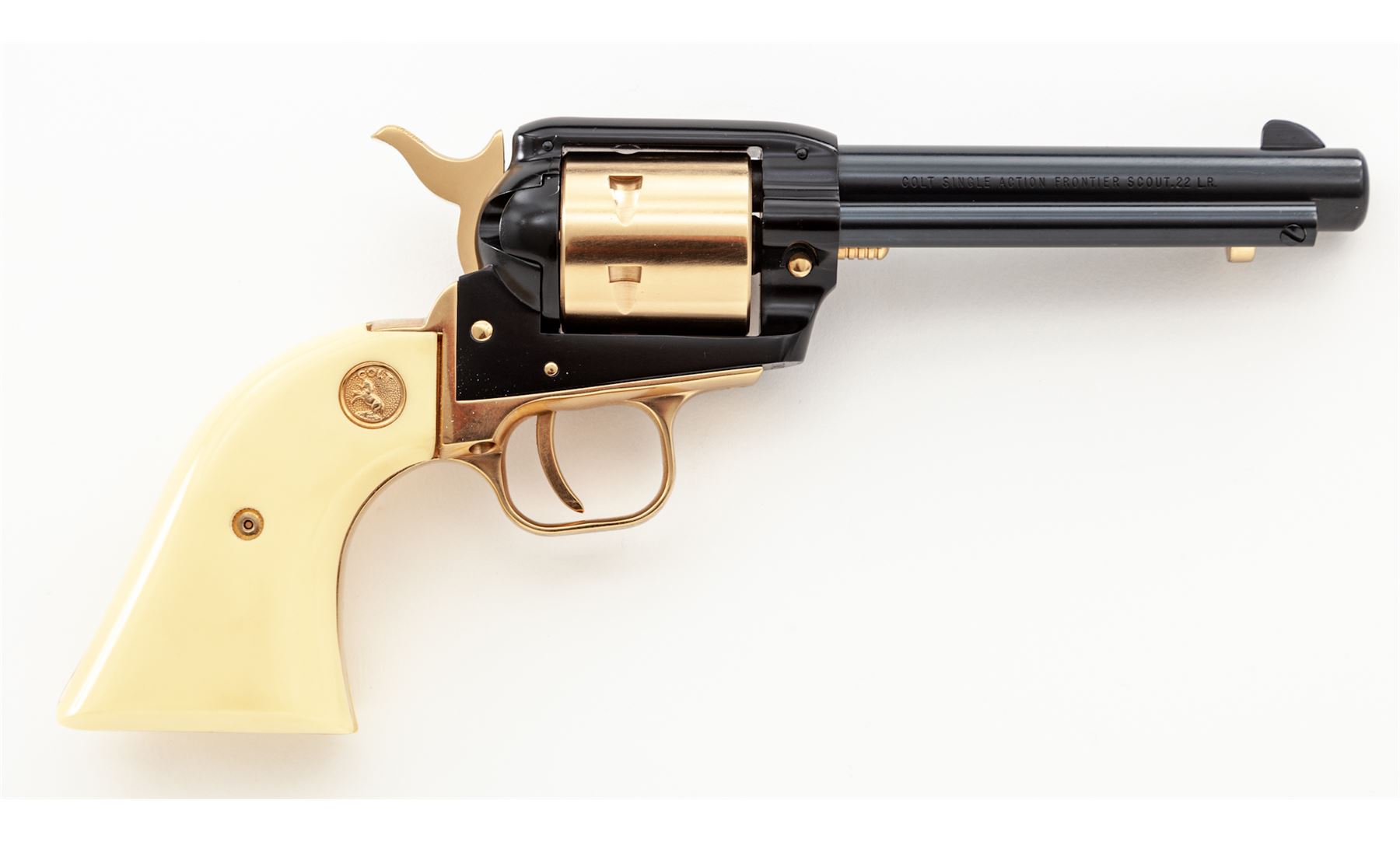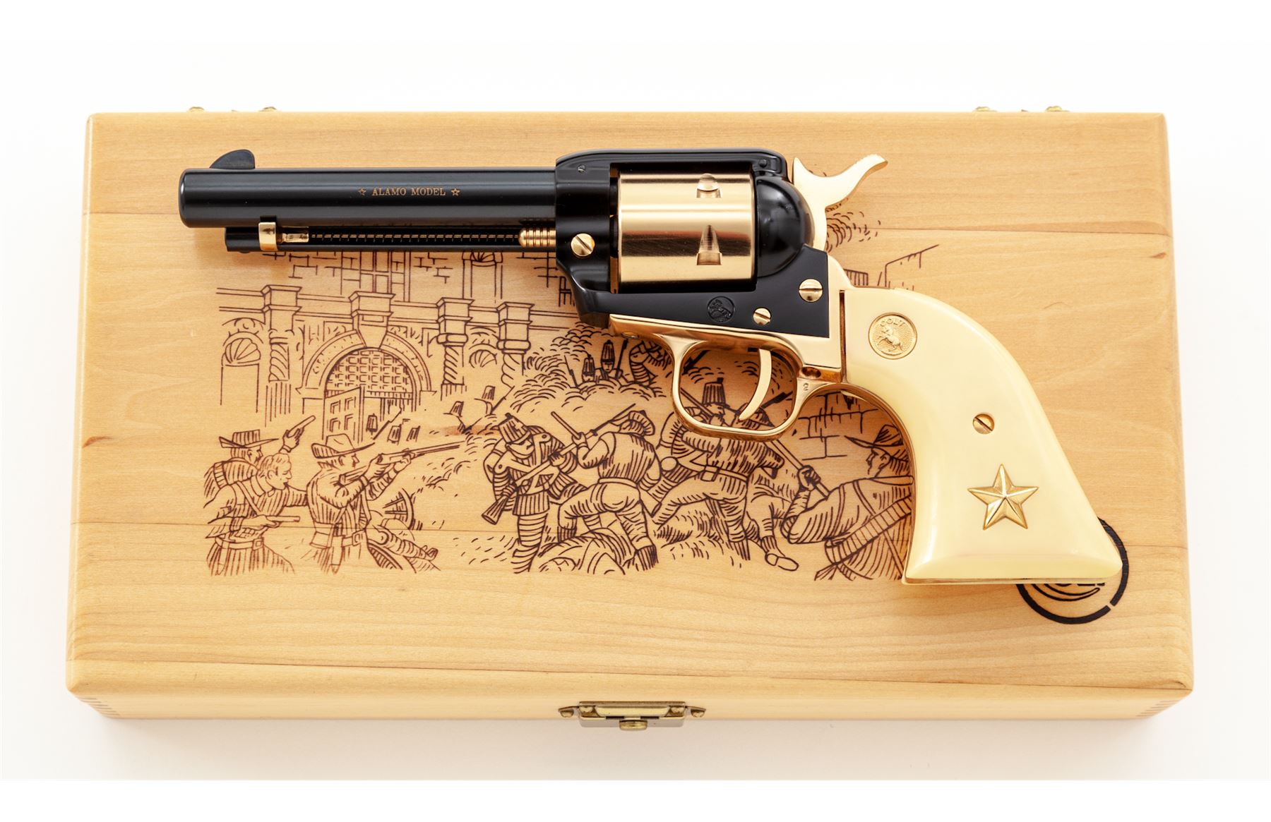 Cased Colt Frontier Scout Alamo Model Single Action Revolver, #3794A22, .22 LR cal., 4.75'' blued steel barrel, black frame, remaining metal pieces are gold colored. Faux bone or ivory grips with gold Colt medallions and gold Texas star in the left grip. In original wood display case with blue interior; lid with Alamo battle scene. Limited to a production of 4,250 in 1967. Overall condition is excellent, appearing unfired. Approx. 99% original blue and black finish remains. Gold-colored pieces with light micro-scratching, most notable on the cylinder; cylinder face with no powder burn rings or index line. Grips are excellent with only a few very minor handling marks. Bore is bright. Wood box is in very nice overall condition, showing only slight storage type wear. Est.: $400-$600. (C&R/PPT)