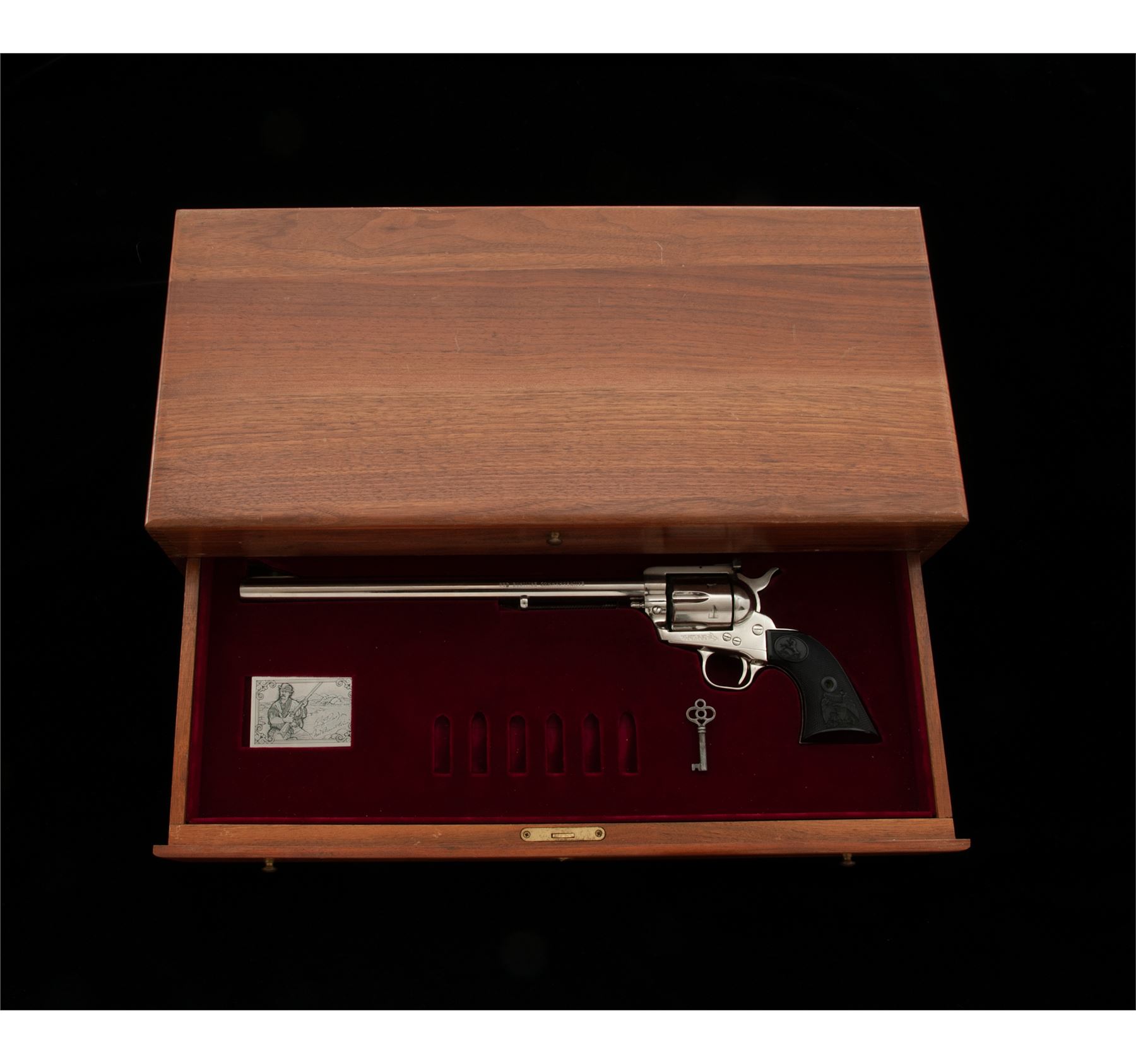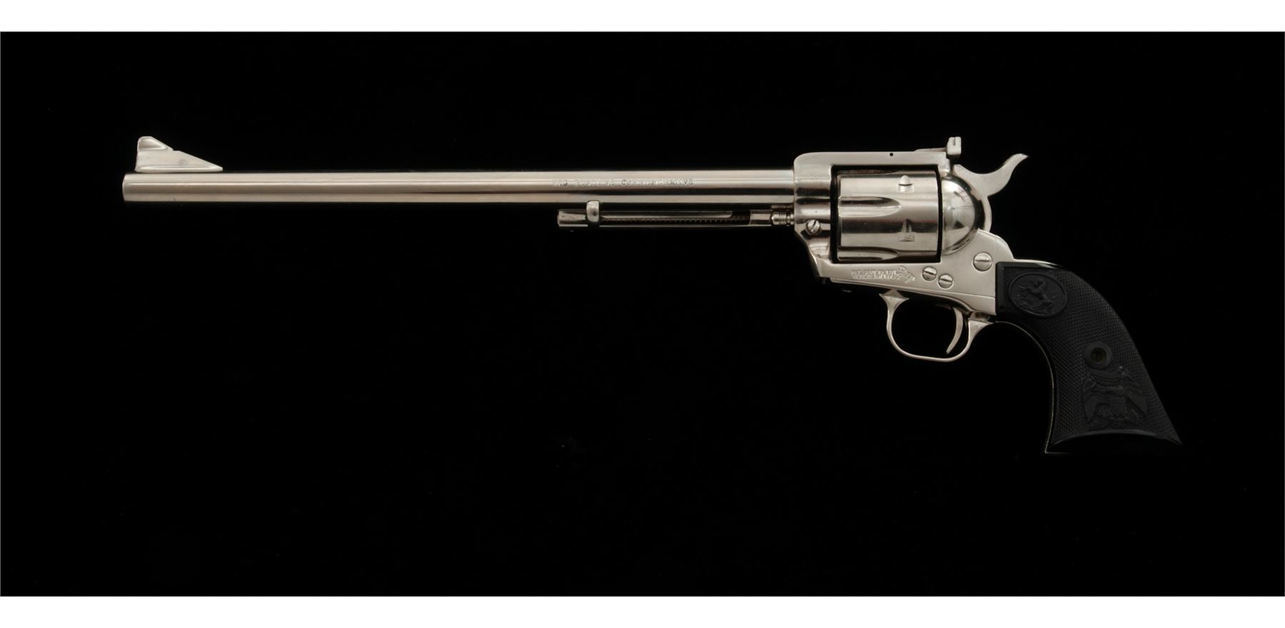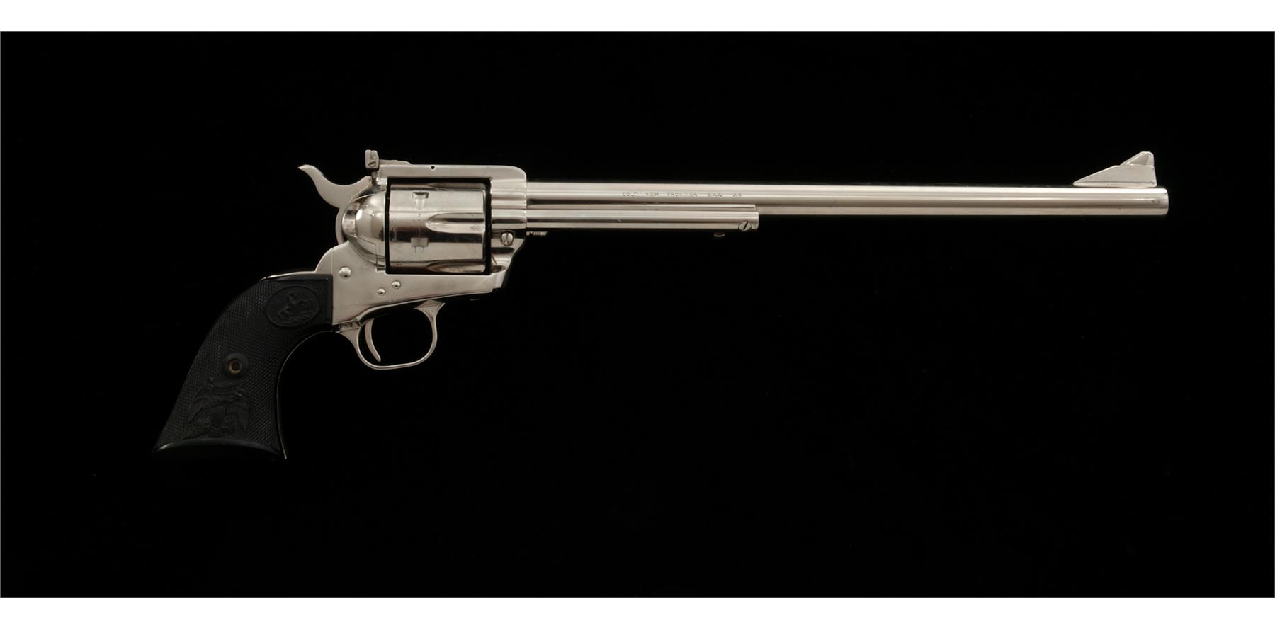Colt Ned Buntline Commemorative Single Action Revolver, #NB0958, .45 LC cal., 12'' barrel, bright nickel finish, factory checkered black plastic eagle grips with ''Rampant Colt'', tall blade front sight, square notched fully adjustable rear sight. Left side of barrel is marked ''NED BUNTLINE COMMEMORATIVE''. In wood display case with fitted burgundy colored interior, key, and Ned Buntline plaque. This shooter grade revolver is in very good overall condition. Bright nickel finish with general scratching and wear with some spots of light flaking. Factory lettering is crisp and clear. Left grip with a small chip to the bottom edge, otherwise both are excellent. Crisp action, very good bore. Wood display case with scattered light scratches and storage wear. Interior piece of glass is missing and the gold colored trim that holds the glass in place is dented and creased in spots; lining is excellent. 1 of 3,000 Ned Buntline Commemoratives mfg'd in 1979. Est.: $600-$800. (C&R/PPT)