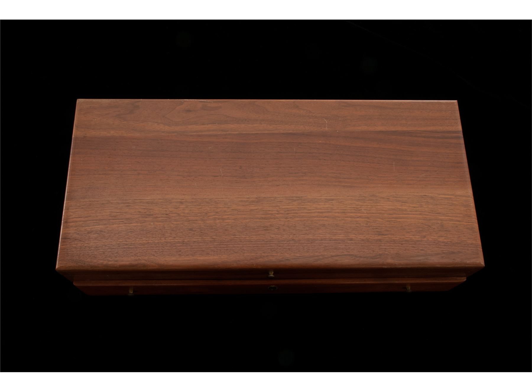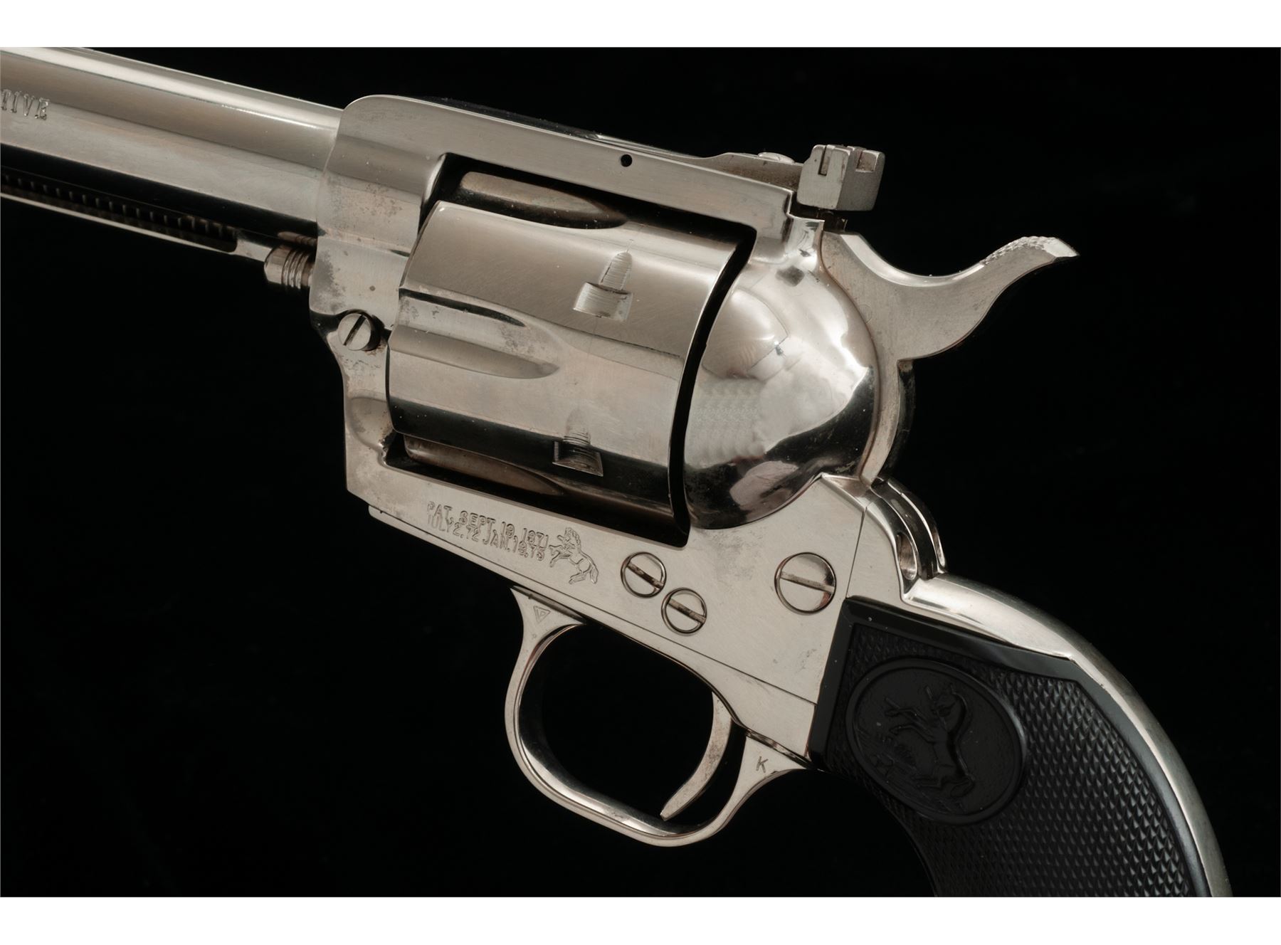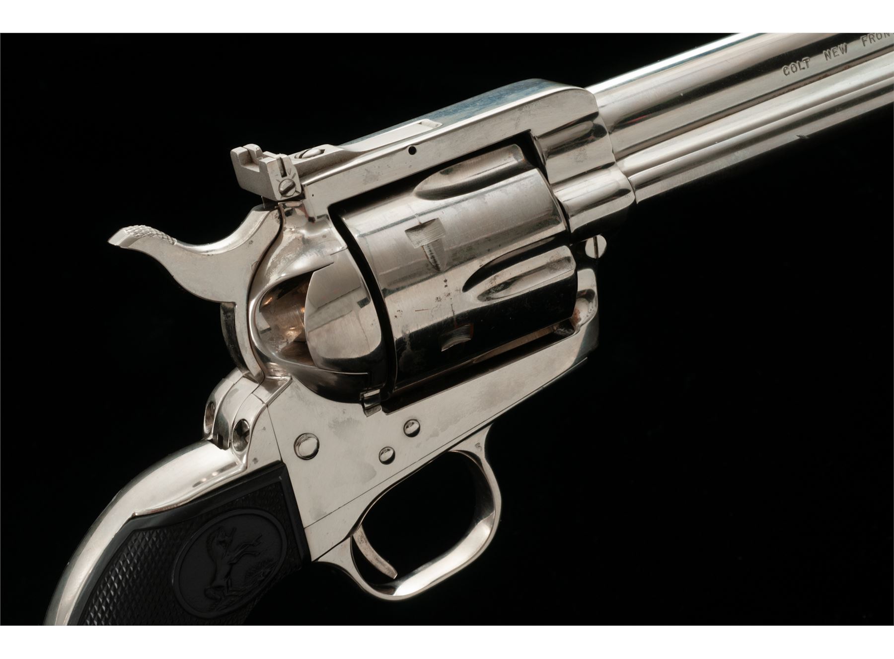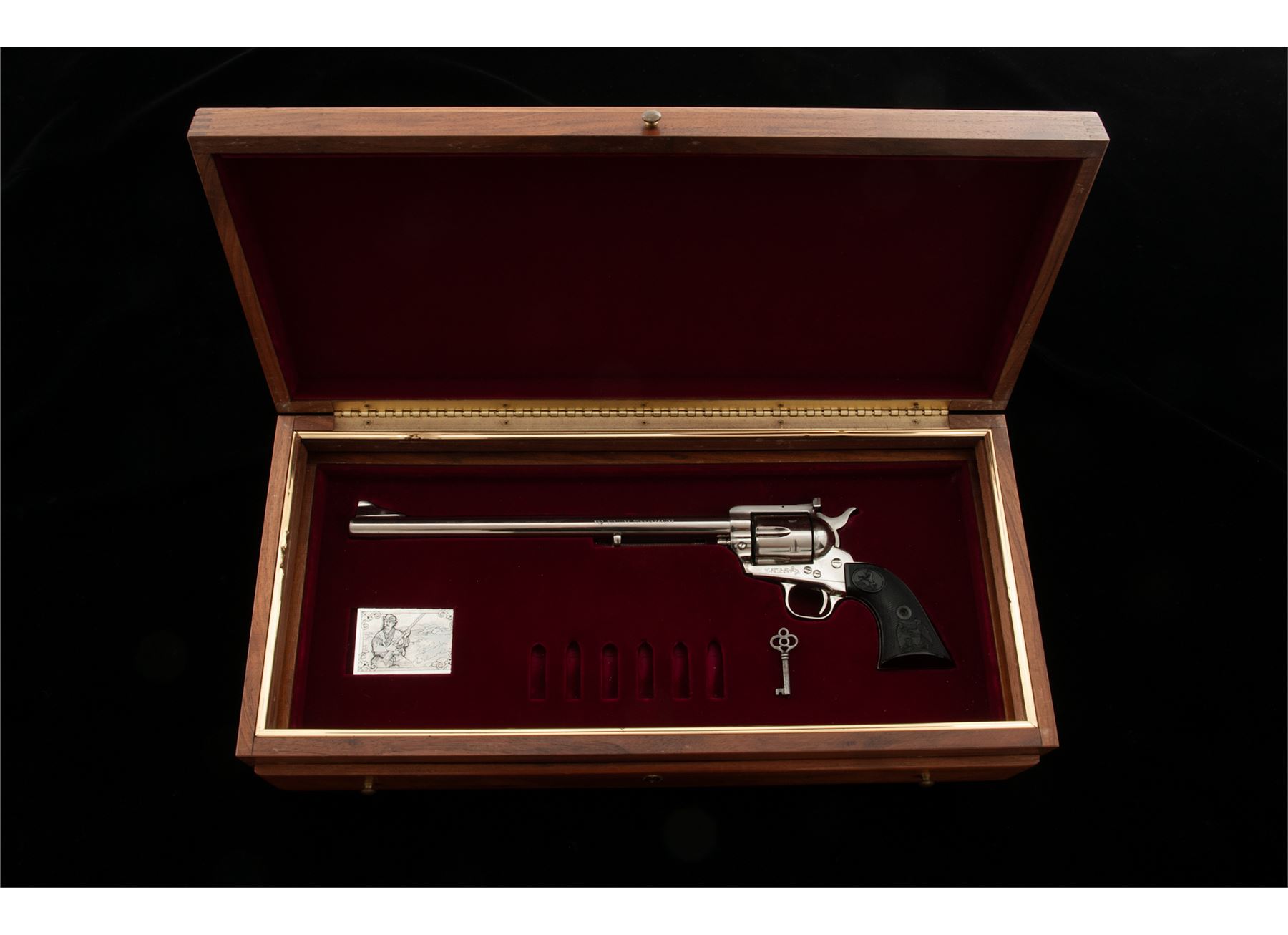 Colt Ned Buntline Commemorative Single Action Revolver, #NB0958, .45 LC cal., 12'' barrel, bright nickel finish, factory checkered black plastic eagle grips with ''Rampant Colt'', tall blade front sight, square notched fully adjustable rear sight. Left side of barrel is marked ''NED BUNTLINE COMMEMORATIVE''. In wood display case with fitted burgundy colored interior, key, and Ned Buntline plaque. This shooter grade revolver is in very good overall condition. Bright nickel finish with general scratching and wear with some spots of light flaking. Factory lettering is crisp and clear. Left grip with a small chip to the bottom edge, otherwise both are excellent. Crisp action, very good bore. Wood display case with scattered light scratches and storage wear. Interior piece of glass is missing and the gold colored trim that holds the glass in place is dented and creased in spots; lining is excellent. 1 of 3,000 Ned Buntline Commemoratives mfg'd in 1979. Est.: $600-$800. (C&R/PPT)