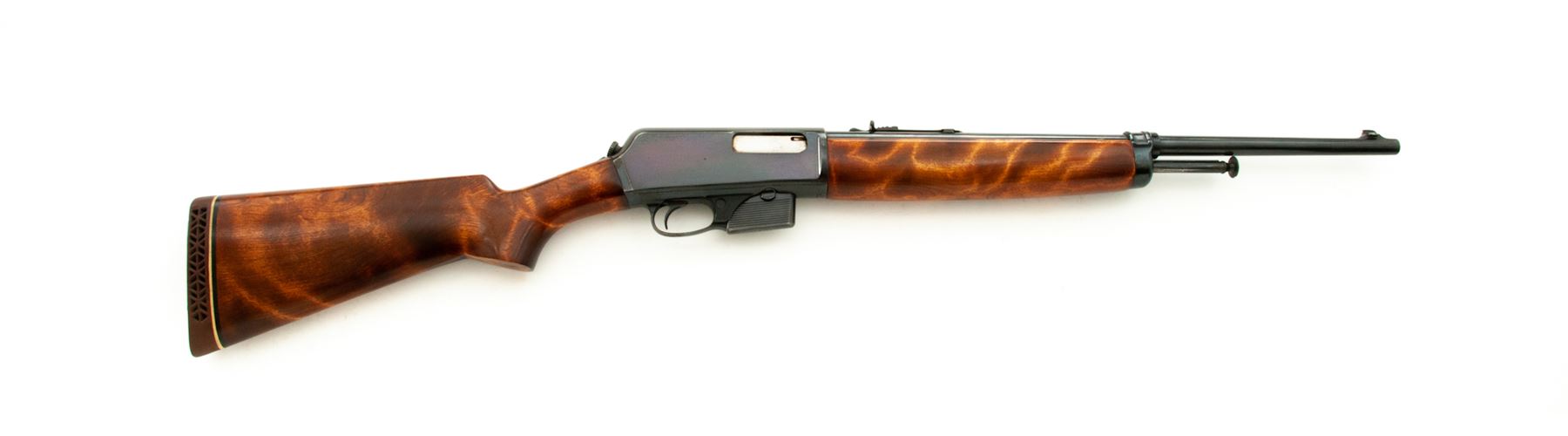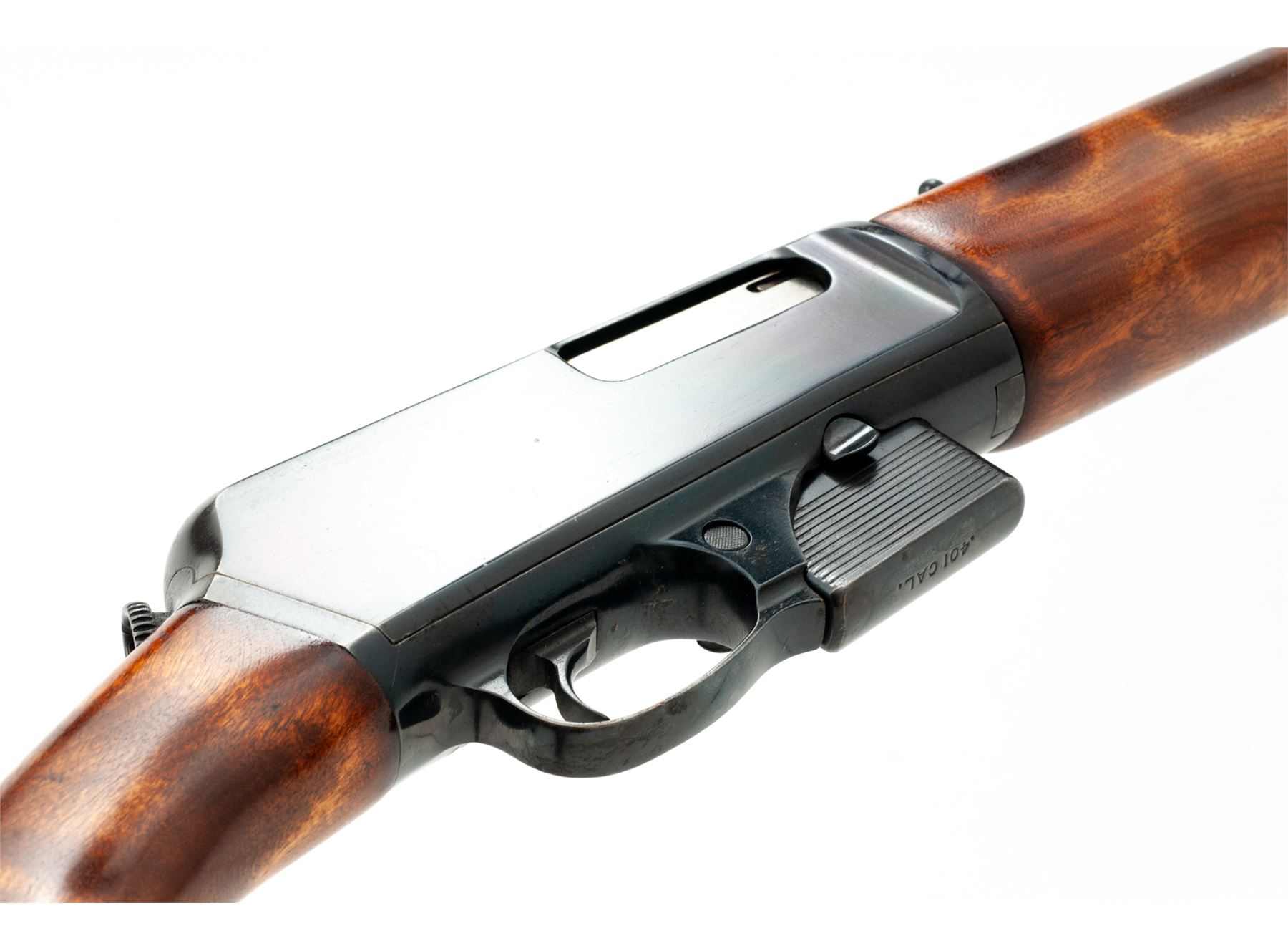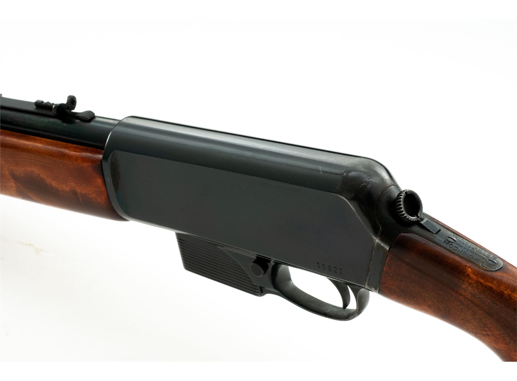 Winchester Model 1910 SL Self-Loading Rifle, #11827, .401 SL cal., 20'' barrel, blue finish, birch stock and forend. Mfg'd 1914. Condition is fine as restored retaining approx. 95% of a later accomplished inky black/blue finish. Newly made stocks fit very well; buttstock with brown Whiteline butt pad. Crisp action, bright bore. A great pig gun. Est.: $450-$650. (C&R)