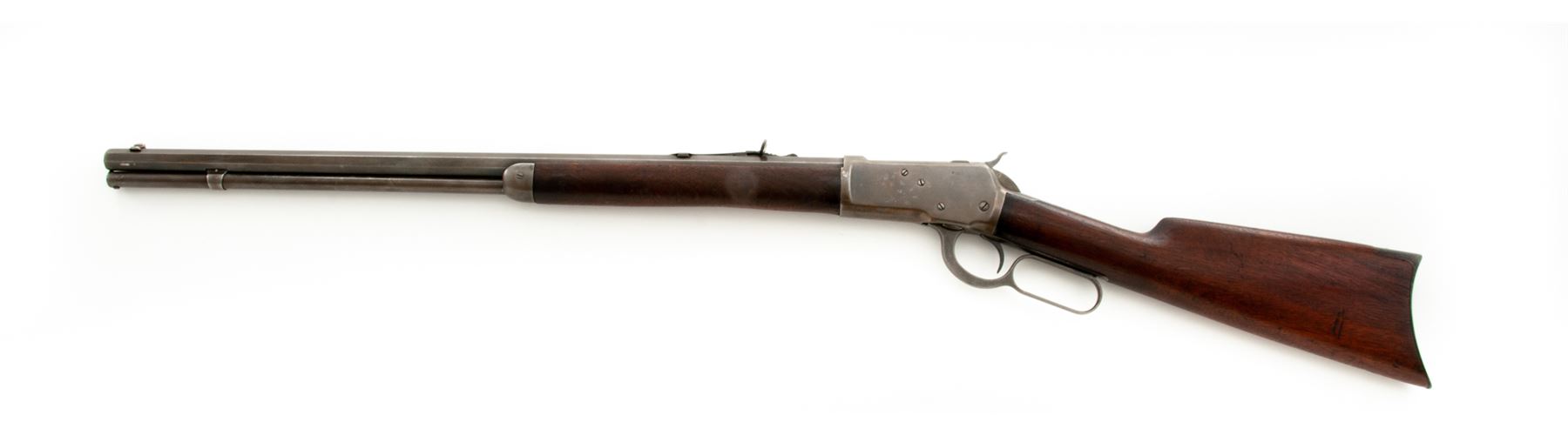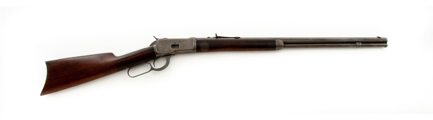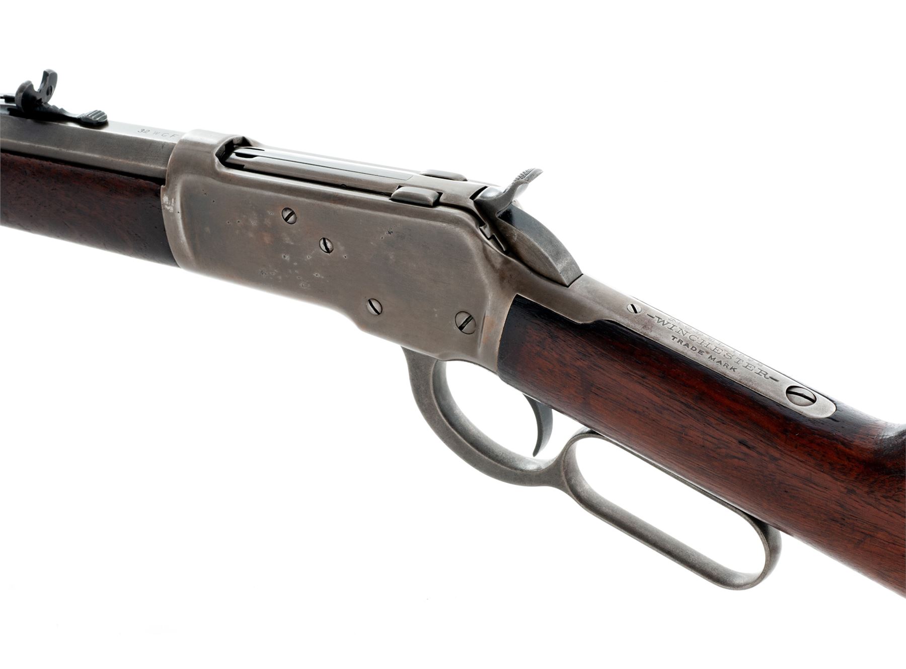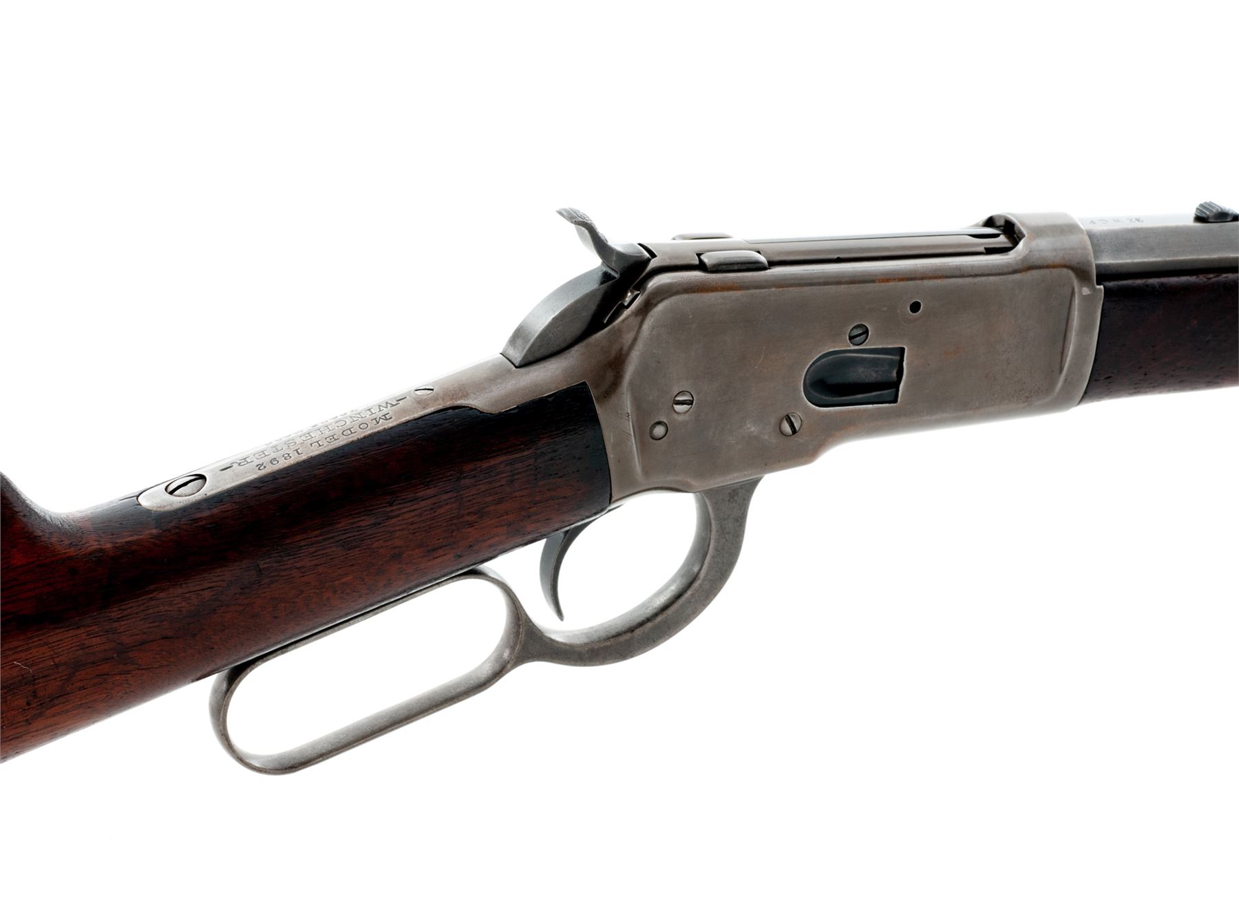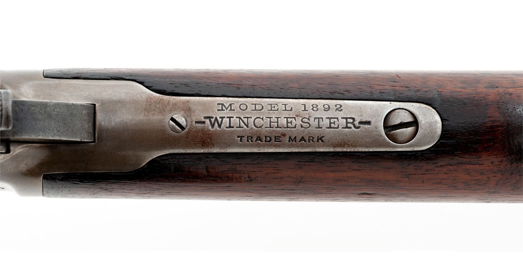 Winchester Model 1892 Lever Action Repeating Cartridge Rifle, #283833, .32-20 WCF cal., 24'' octagonal barrel with dovetailed blade front and adjustable buckhorn sporting rear sights marked on top flat with Winchester address and 1884 patent date in two lines ahead of rear sight, and ''32 W.C.F.'' ahead of breech; full-length under-barrel cartridge magazine tube; steel receiver marked on top tang ''Model 1892/-Winchester-/Trade Mark'' in three lines; oil-stained walnut forend and buttstock with steel crescent buttplate. Originally blued and case hardened finishes. Mfg'd 1905. Condition is very good, the barrel retaining approx. 20% thinning blue, the balance of the metal a smooth brownish-gunmetal patina. Stocks are smooth with minor handling marks and saddle wear to bottom of forestock. Action is smooth and crisp; bore is bright with pronounced rifling. Est.: $500-$750. (C&R)
