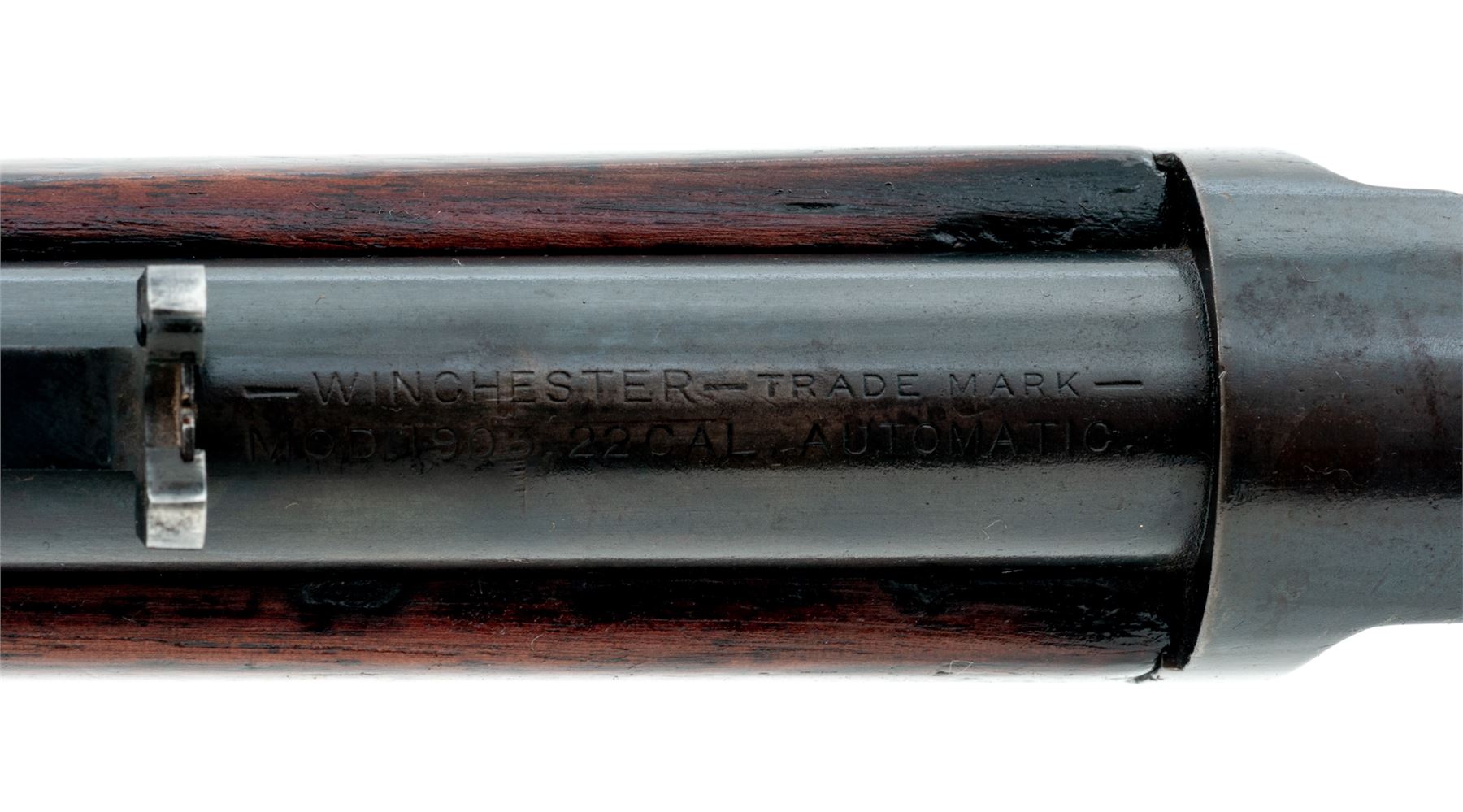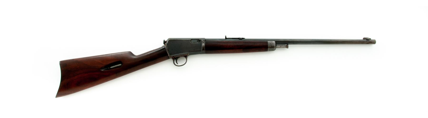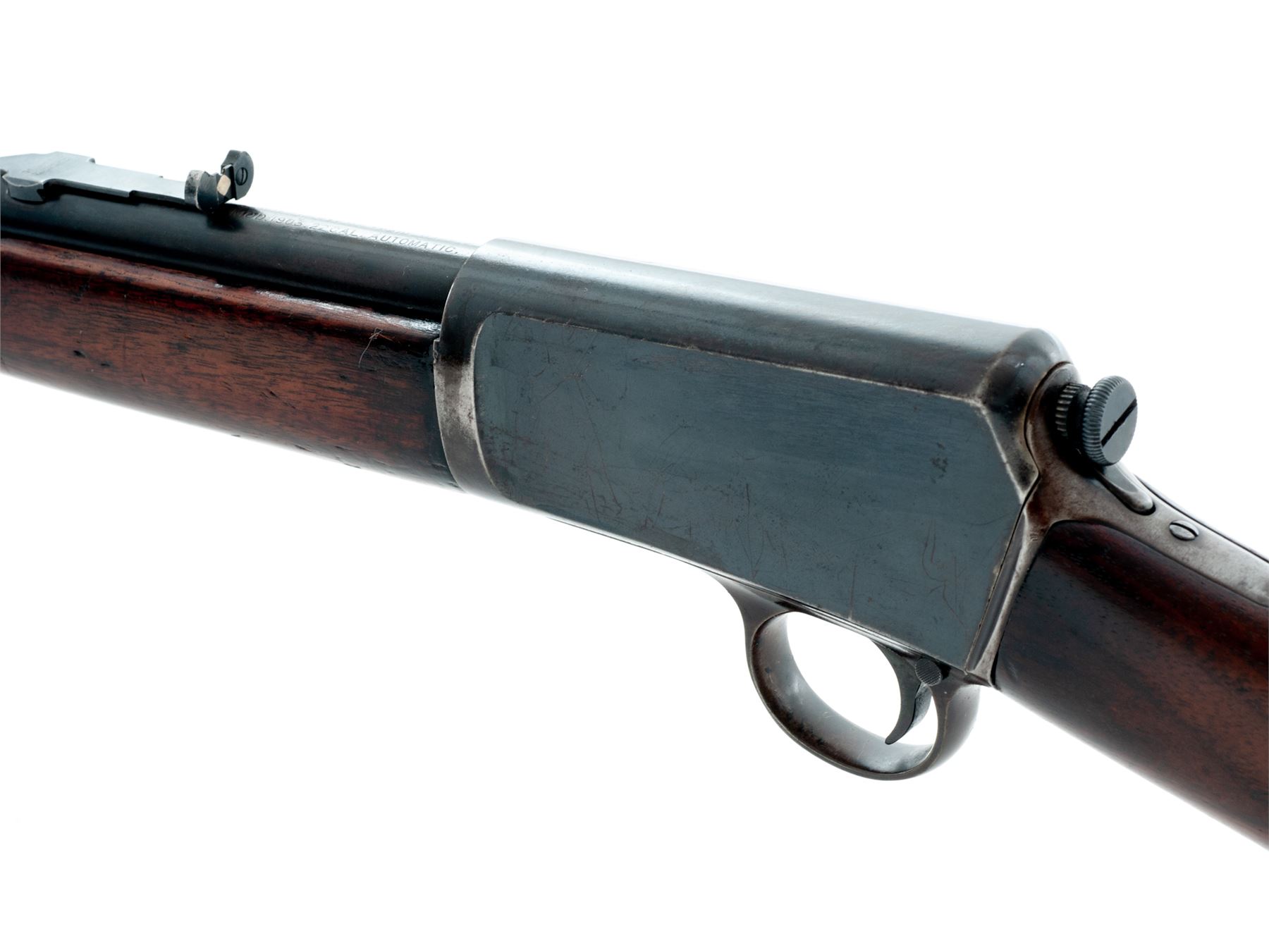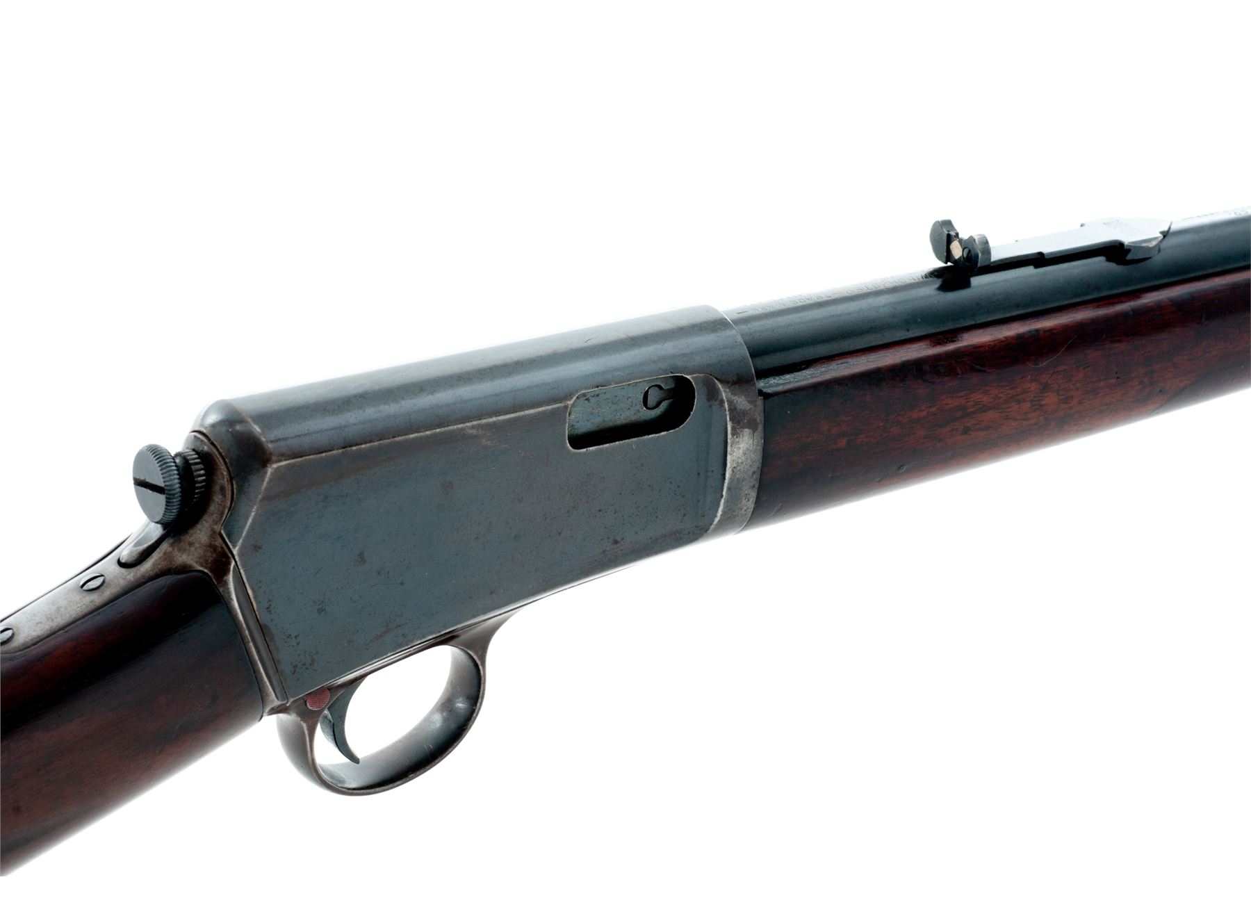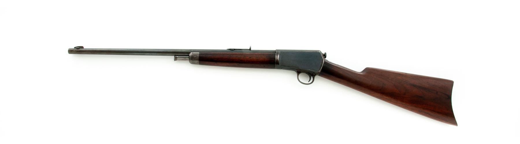 Winchester Model 1903 Semi-Automatic Rifle, #4149, .22 Auto cal., 20'' barrel, blue finish, walnut stock and forend, with Marbles rear and Sheard copper bead front sight. Mfg'd 1903, first year of production. Condition is very good to near fine retaining approx. 85% original thinning and toning blue. Buttstock with some oil darkening and minor impressions; forend with a little bit more of both. Good action, fine bore. Est.: $450-$650. (C&R)