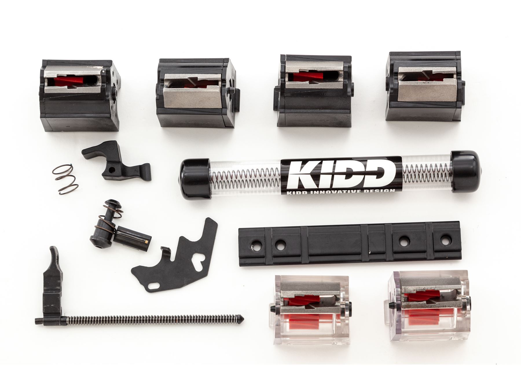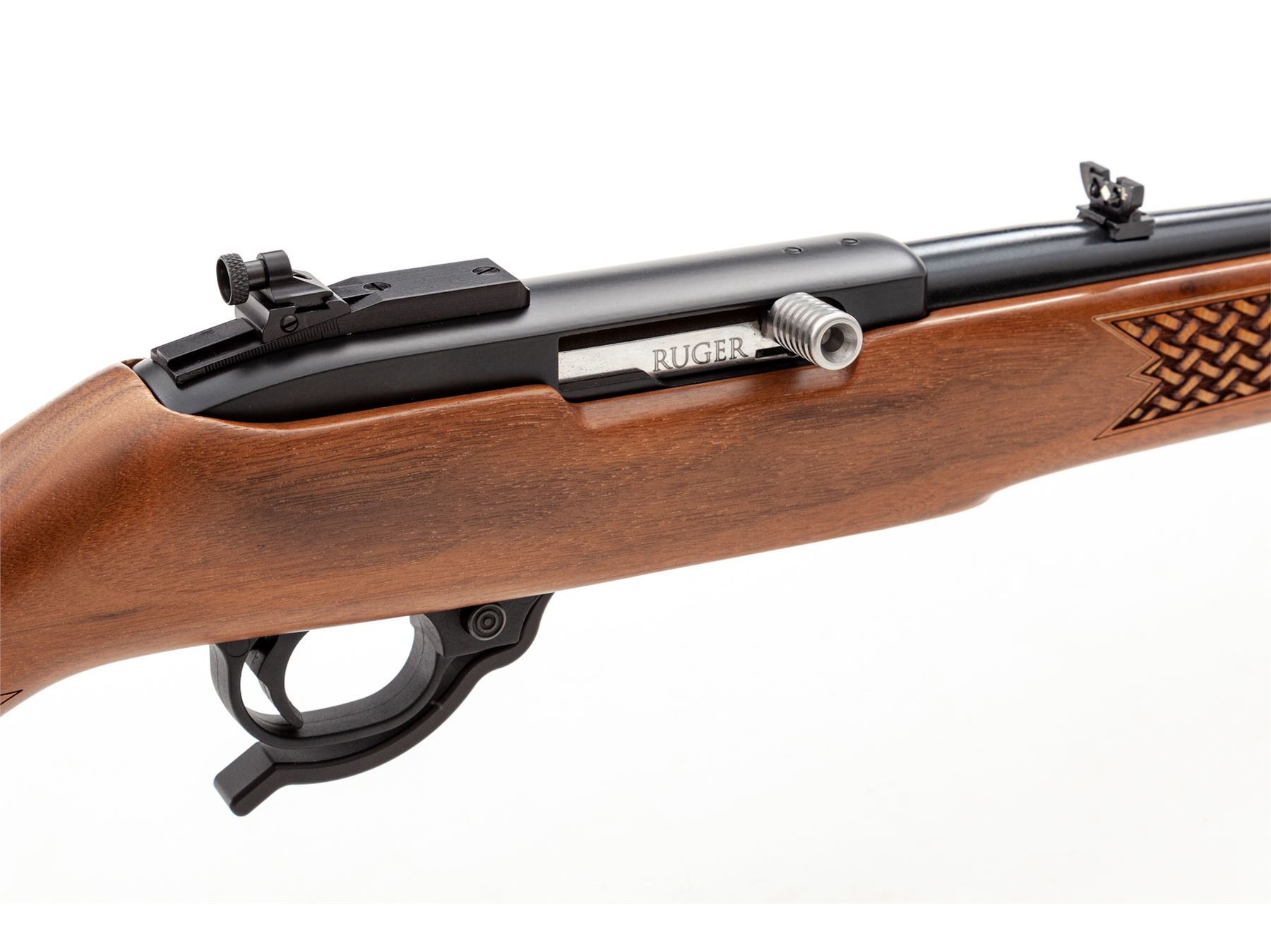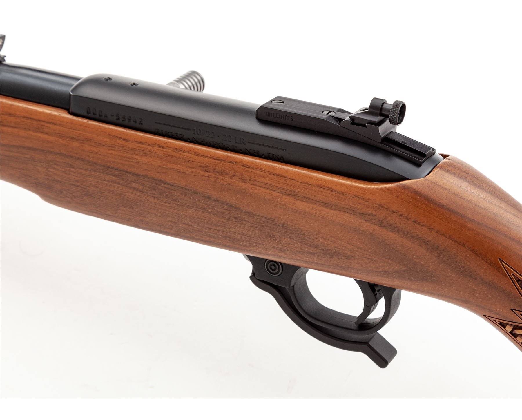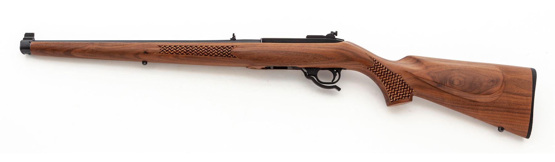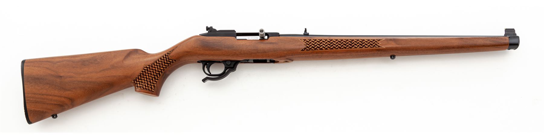 Upgraded Ruger 10/22 International Semi-Automatic Rifle, with seven (7) magazines, #0004-55942, .22 LR cal., 18.5'' barrel, blue finish, bright ''Ruger'' marked bolt, tall blade front sight with brass bead and standard folding rear sight, and receiver mounted Williams peep sight. One-piece pistol-grip Mannlicher walnut stock with fancy basketweave pattern checkering, oil finish, sling swivel studs, and black plastic Ruger buttplate. Upgrades include a Tactical Solutions magazine release; Kidd auto bolt release, bolt handle, and spring kit. Included are the original parts, five (5) black 10-round Ruger magazines, and two (2) clear 10-round Ruger magazines. Rifle is in excellent as new overall condition, appearing to have been fired very little. Est.: $400-$600. (Modern)
