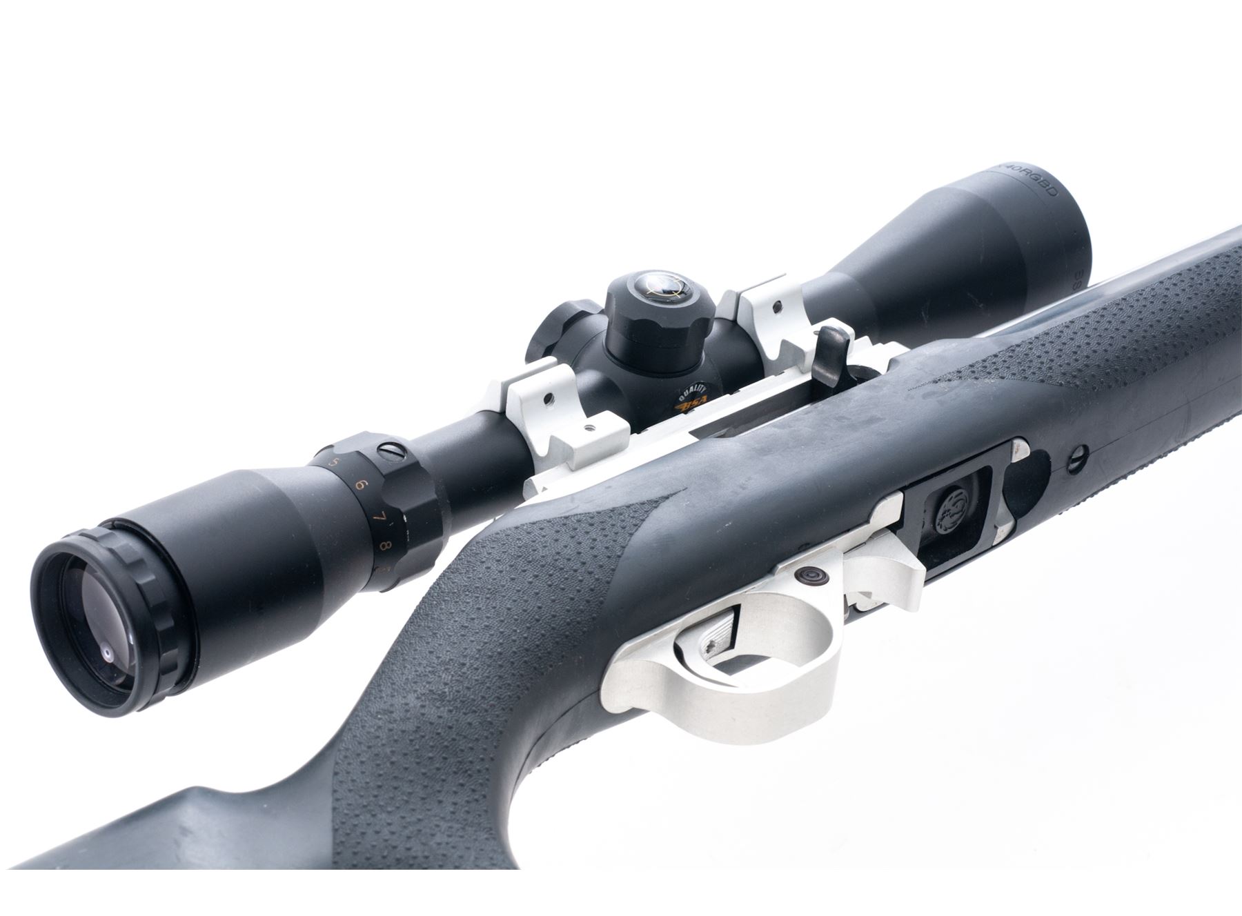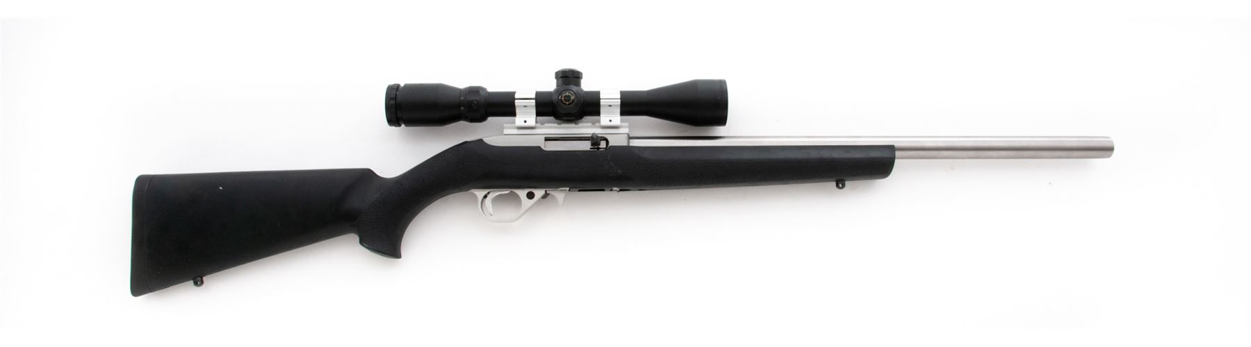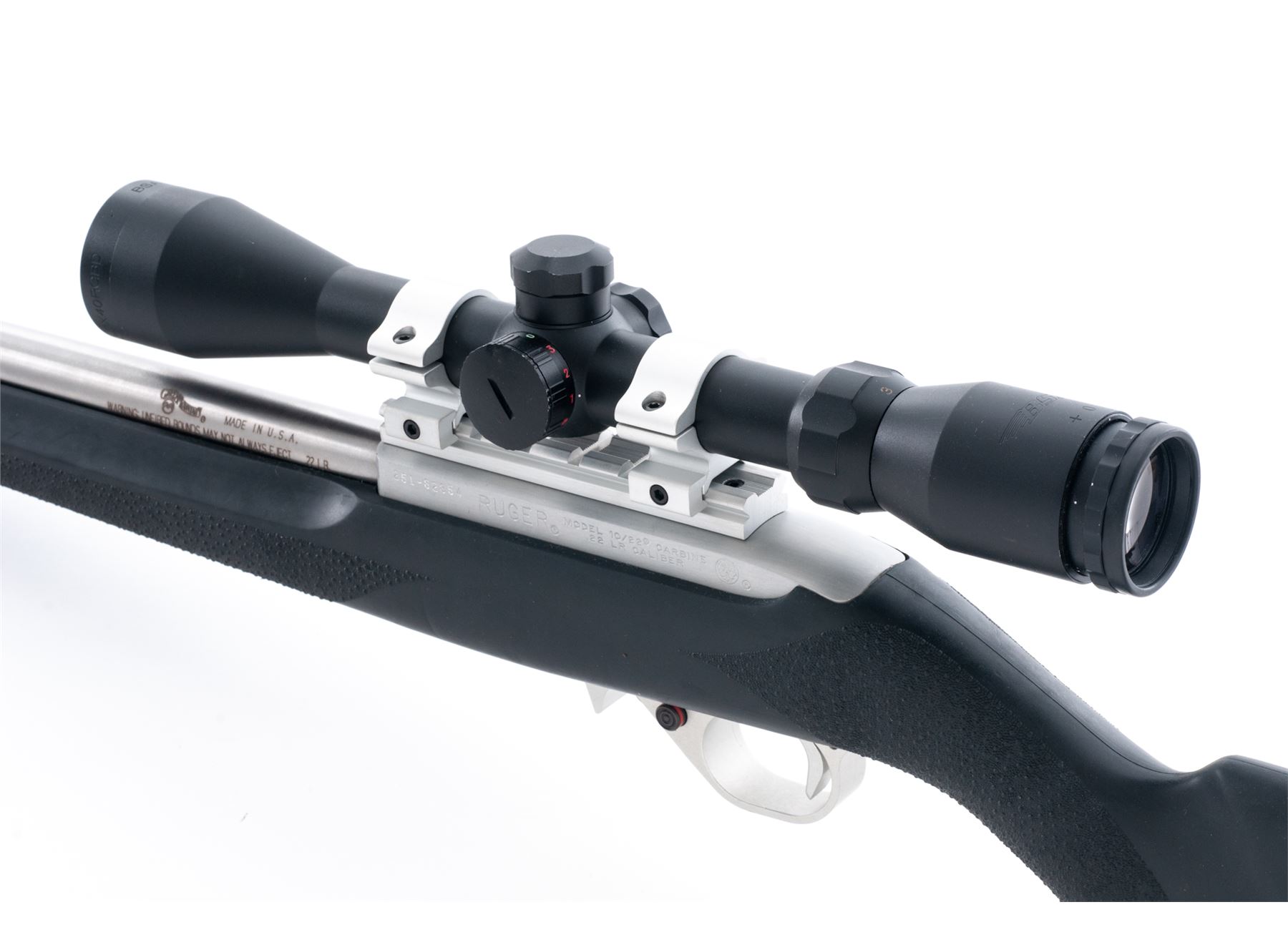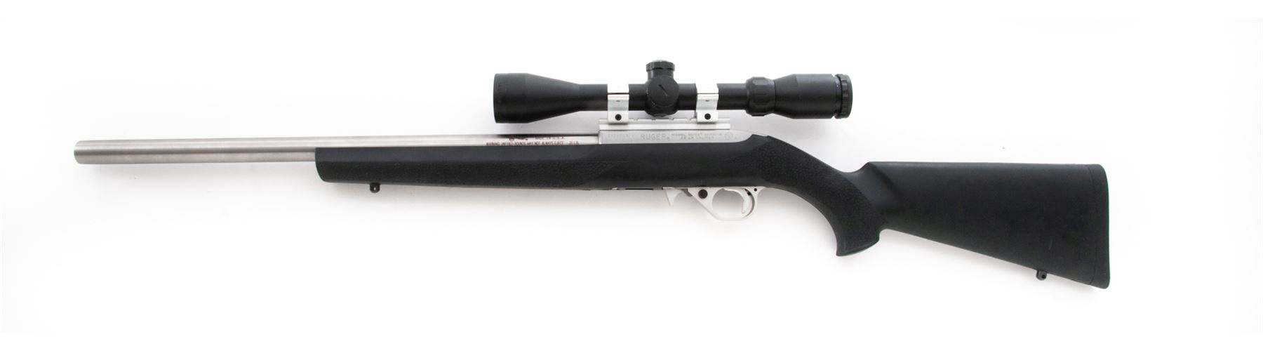 Ruger 10/22 Semi-Automatic Carbine, with aftermarket heavy barrel, #251-82854, .22 LR cal., 20'' stainless steel bull barrel by Green Mountain, stainless receiver, black Hogue OverMolded stock, sling swivel studs, and one 10-round Ruger magazine. Barrel is not drilled or tapped for sights and rifle is topped with a BSA 3-9x40 RGBD scope with duplex reticle. Metal rates as near excellent overall with the exception of one 4'' surface scratch to the top of the barrel. Stock is very good with general light scuffs and handling mars to the rubber surface. Excellent action and bright bore. Scope with only a few very minor handling marks to the exterior, optics are clear. Est.: $250-$450. (Modern)