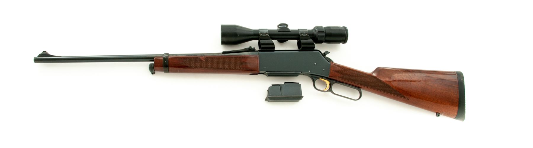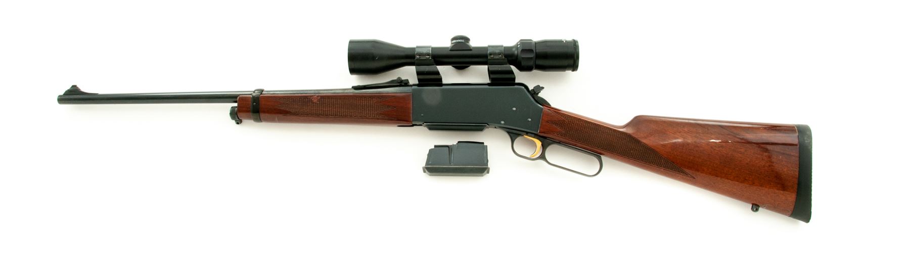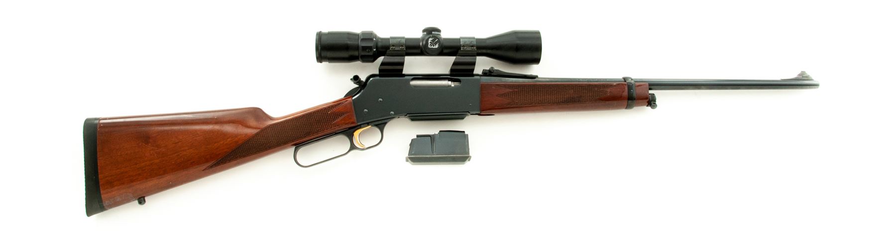 Browning Model BLR 81 Lever Action Rifle, #18763NM227, .243 cal., 20'' round barrel, steel receiver, blue finish, with gold-colored trigger; gloss finished straight grip walnut stock is checkered at both the wrist and forend, with sling swivel studs and a black rubber Browning recoil pad. Also featuring a hammer extension, dovetailed blade front sight with brass bead, notched rear sight, and fitted with a Bushnell 3-9x40mm scope with duplex reticle. Includes two (2) magazines. Metal rates as fine with approx. 97% original blue finish; left rear section of receiver with a few vertical scratches. Wood is very good showing signs of some field use, including shallow scratches and surface nicks; buttstock checkering is clean and shows no mentionable wear; forend checkering with a few flat spots, the largest being on the left side. Action is crisp and smooth; bright bore with excellent rifling. Scope exterior shows a few light handling marks, optics are clear. Est.: $400-$600. (Modern)