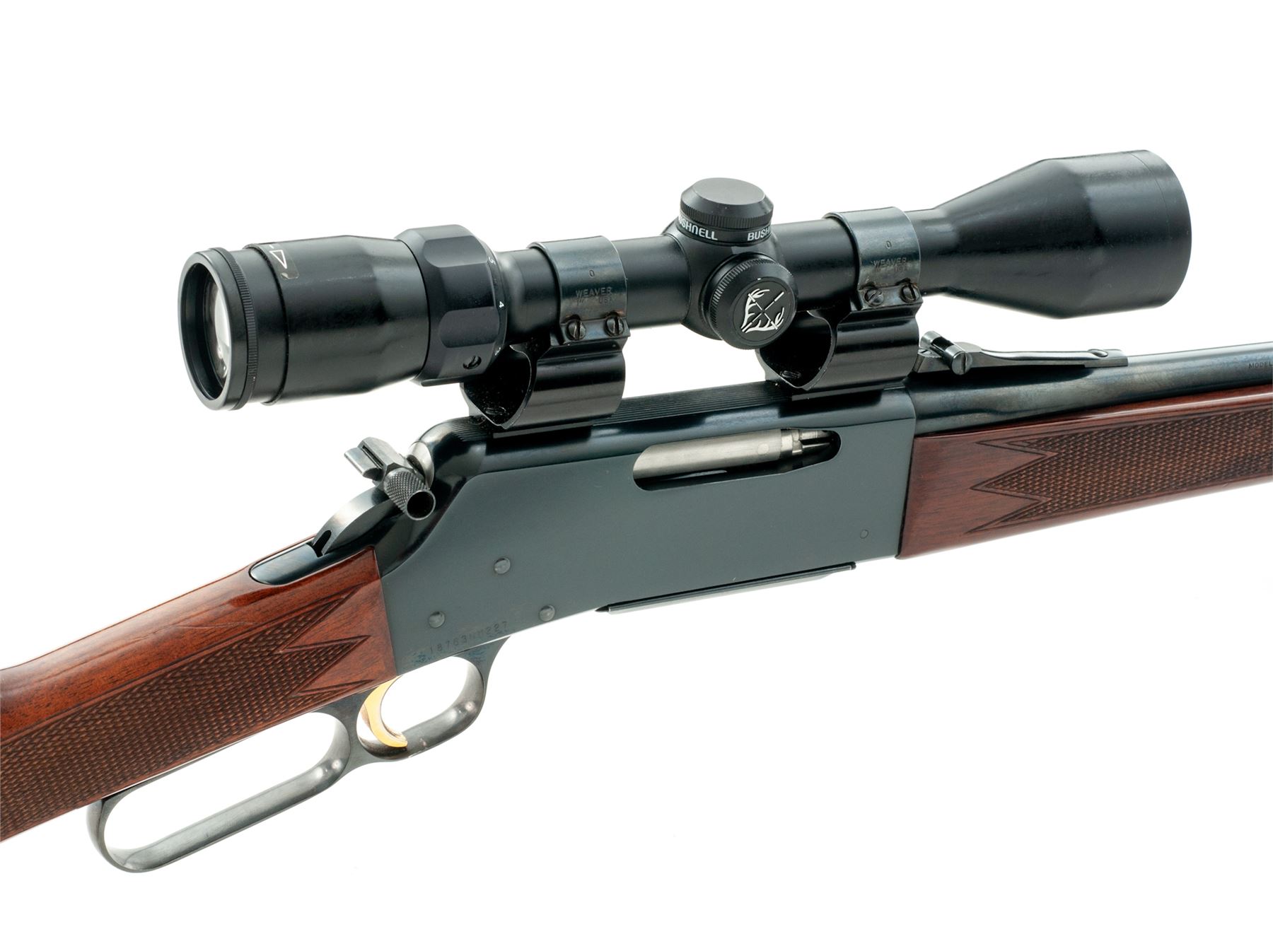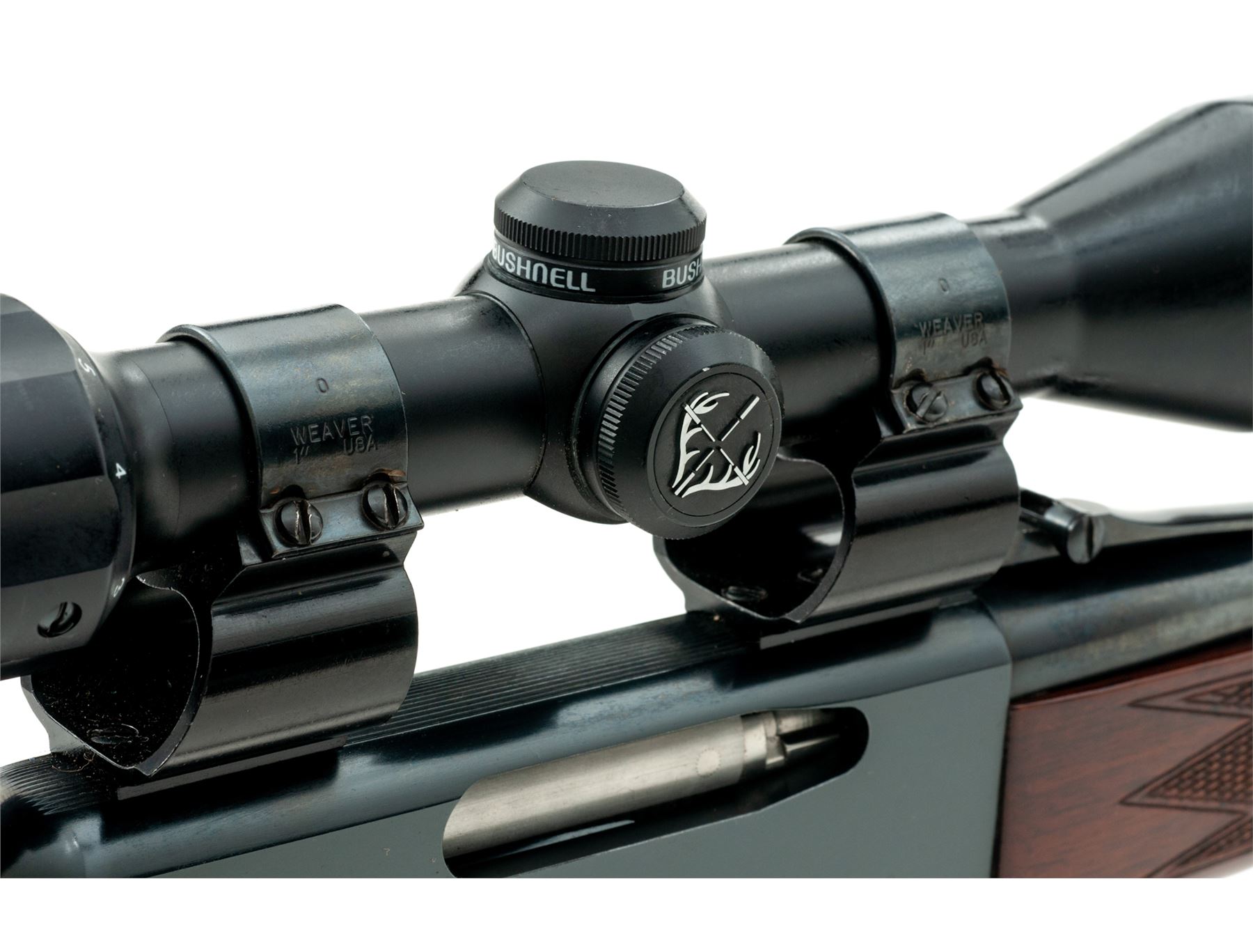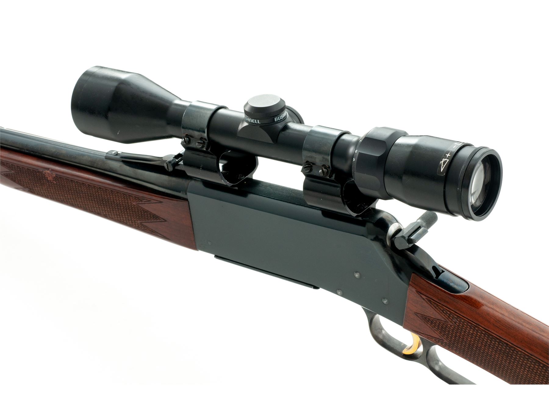 Browning Model BLR 81 Lever Action Rifle, #18763NM227, .243 cal., 20'' round barrel, steel receiver, blue finish, with gold-colored trigger; gloss finished straight grip walnut stock is checkered at both the wrist and forend, with sling swivel studs and a black rubber Browning recoil pad. Also featuring a hammer extension, dovetailed blade front sight with brass bead, notched rear sight, and fitted with a Bushnell 3-9x40mm scope with duplex reticle. Includes two (2) magazines. Metal rates as fine with approx. 97% original blue finish; left rear section of receiver with a few vertical scratches. Wood is very good showing signs of some field use, including shallow scratches and surface nicks; buttstock checkering is clean and shows no mentionable wear; forend checkering with a few flat spots, the largest being on the left side. Action is crisp and smooth; bright bore with excellent rifling. Scope exterior shows a few light handling marks, optics are clear. Est.: $400-$600. (Modern)