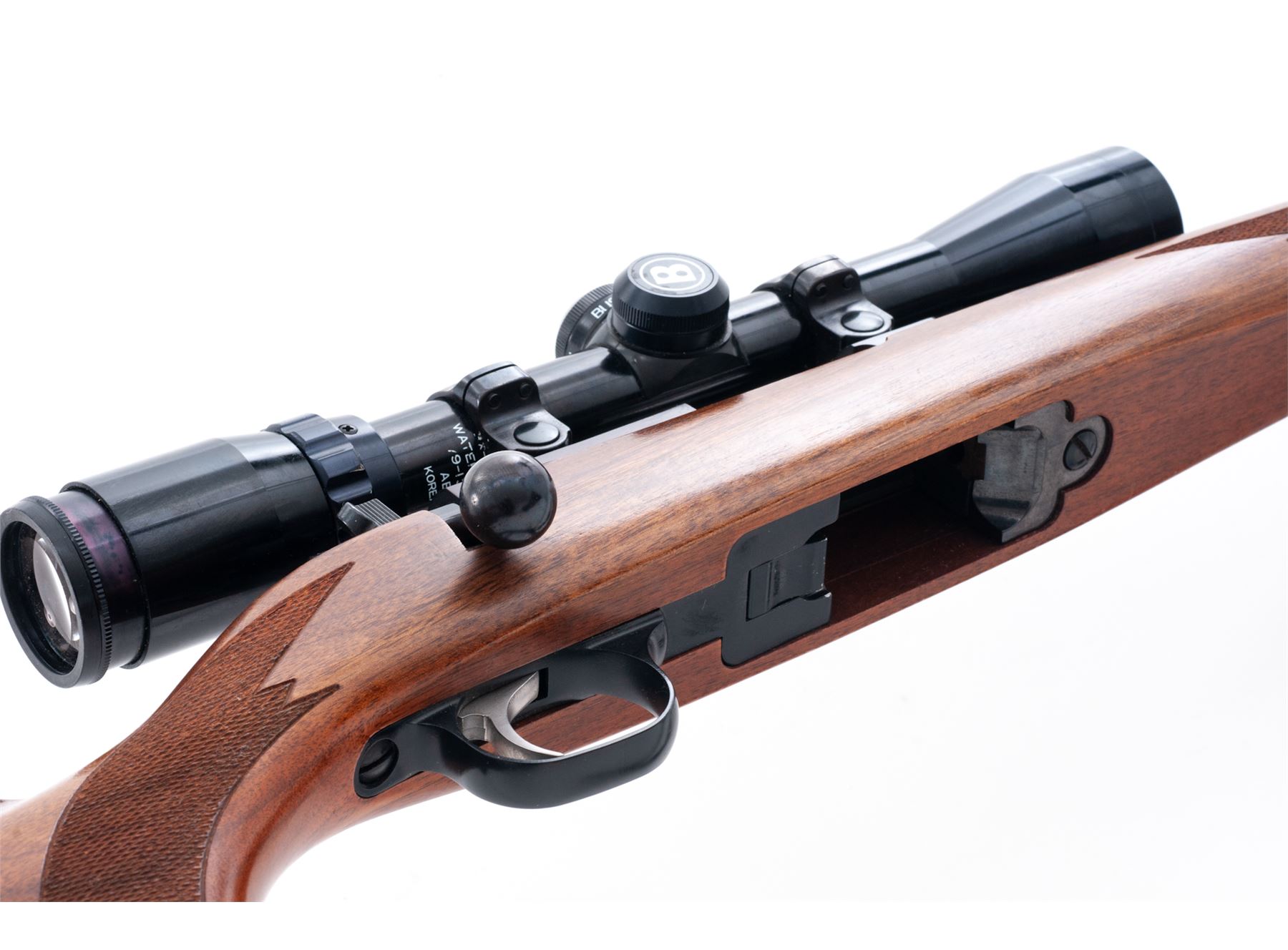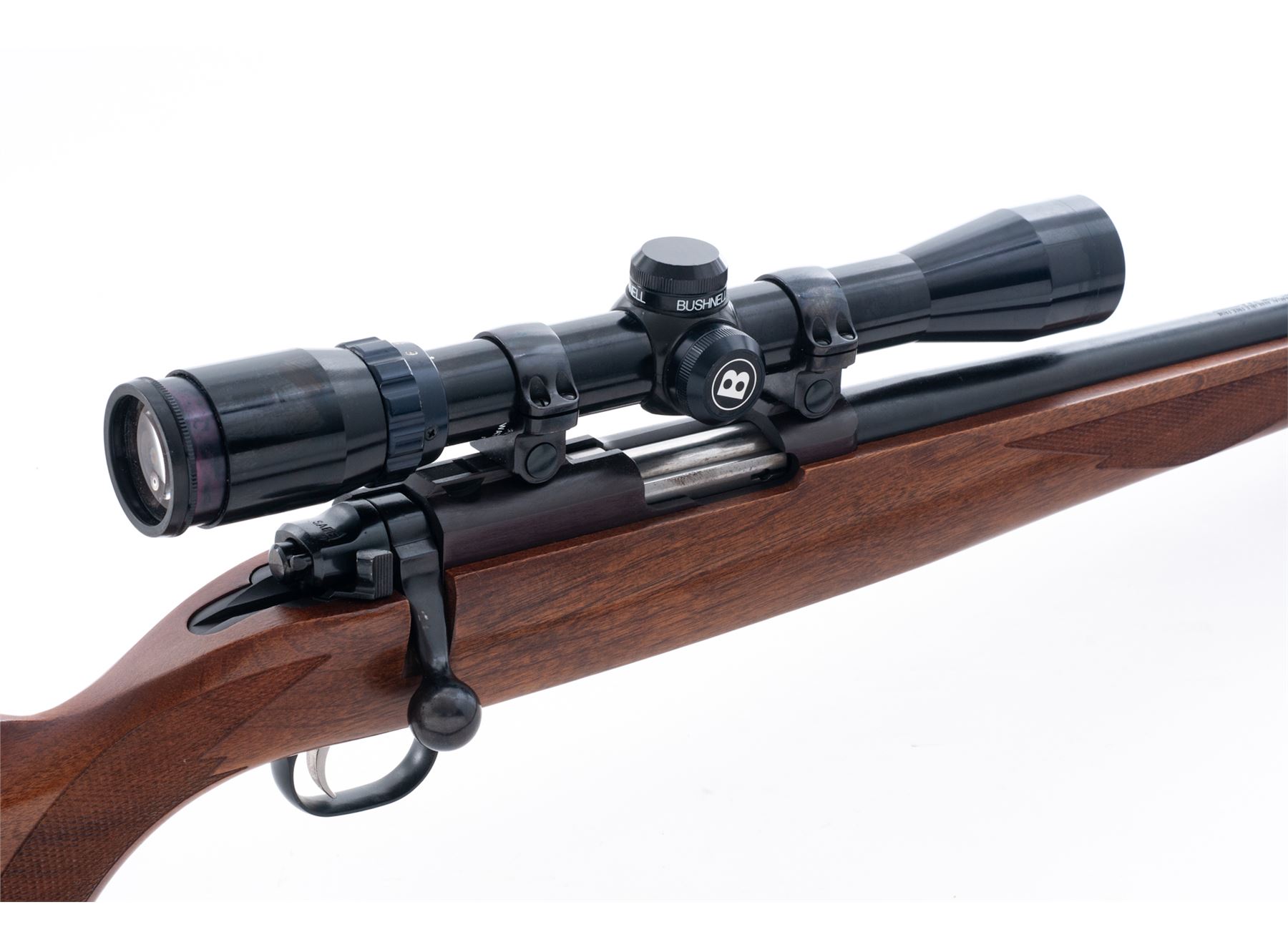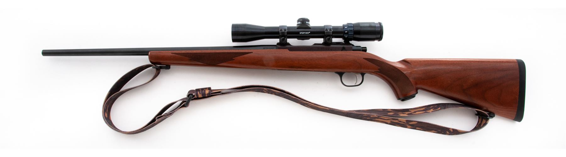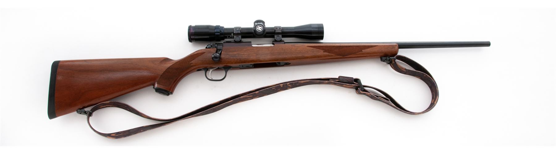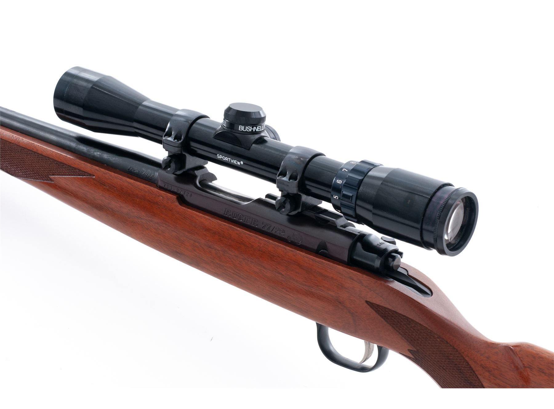 Ruger 77/22 Magnum Bolt Action Rifle, with Bushnell scope, #701-92724, .22 Magnum cal., 20'' barrel, blue finish, one-piece checkered pistol-grip walnut stock, black rubber Ruger pad with black spacers, quick-release sling swivels, camouflage nylon sling, from the factory without sights, missing magazine. Factory grooved receiver with Ruger rings and a Bushnell Sportview 3-9x32 scope with duplex reticle. Barrel retains approx. 98% factory finish but does have general fine specks of light rust scattered across the surface. A thorough cleaning would improve the overall barrel condition. Receiver is excellent and retains nearly all of the original finish which has toned to a light plum-colored appearance. Stock with intermittent normal shallow marks in the handling areas, checkering is clean and sharp. Smooth action; bright, clean bore. Scope with a few light marks to the exterior, optics are clear. Est.: $300-$500. (Modern)
