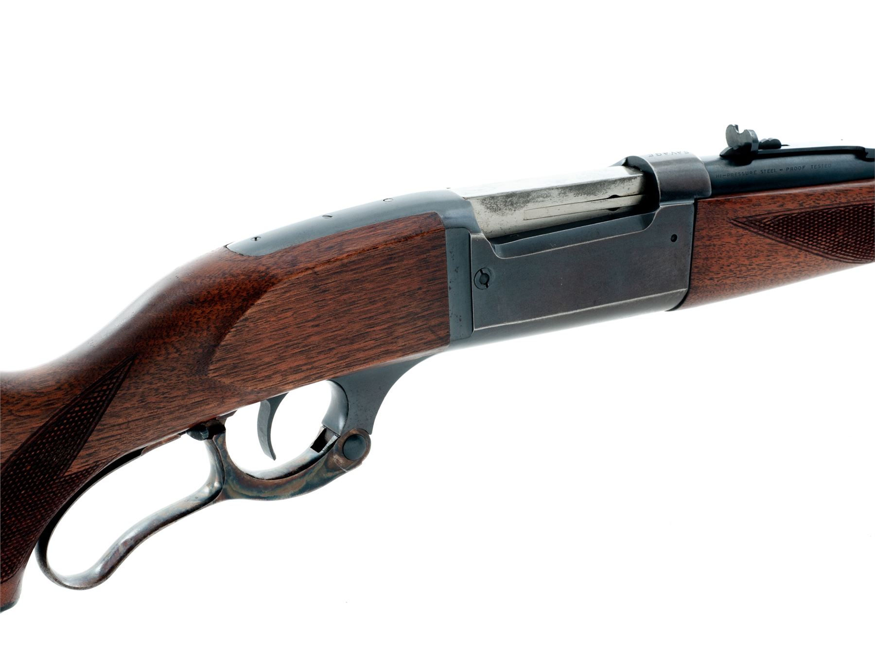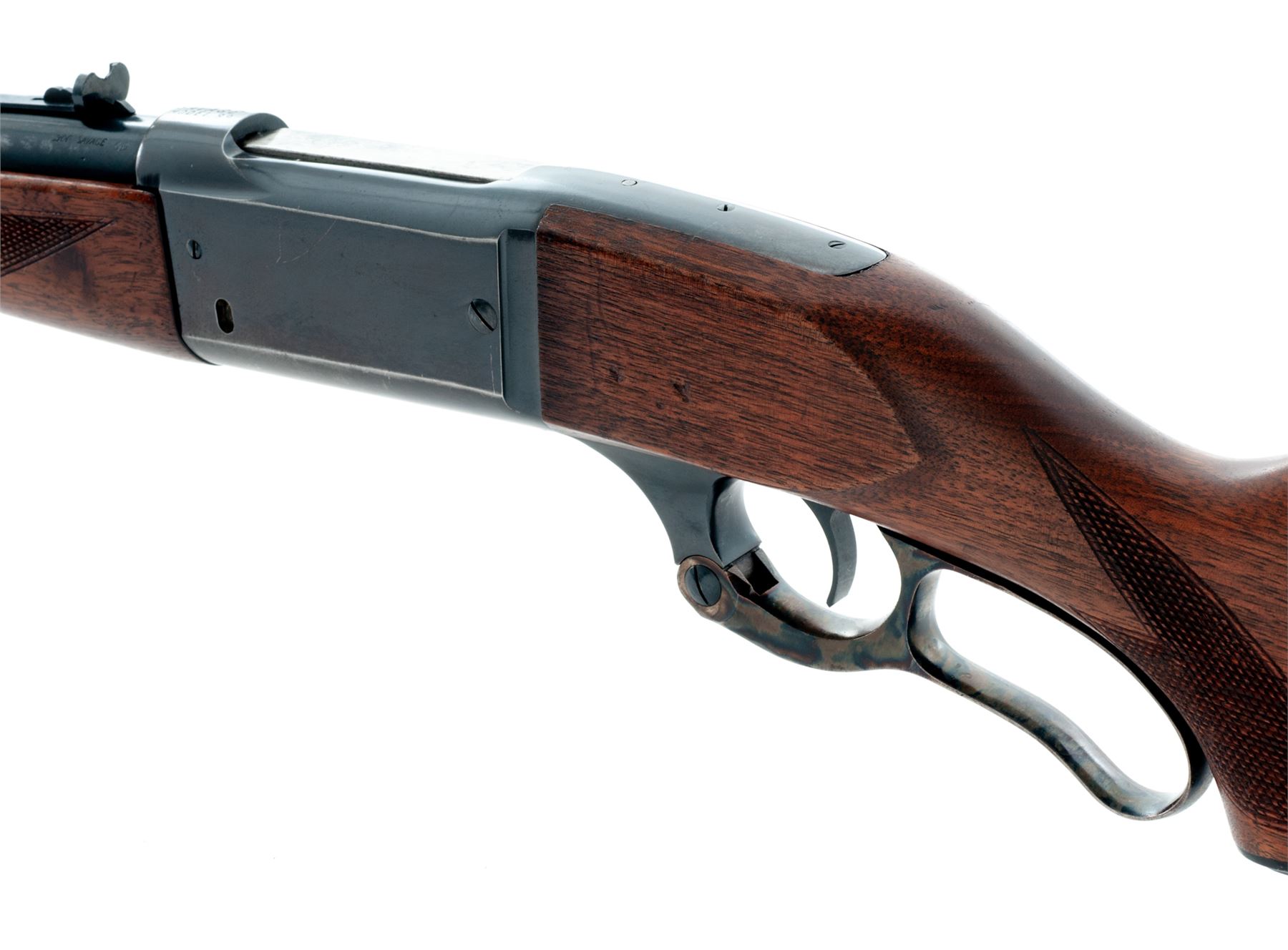 Savage Model 99 Lever Action Rifle, #640793, .300 Sav. cal., 24'' barrel, blue finish, case hardened lever, checkered pistol-grip walnut stock and forend, with serrated steel buttplate. Mfg'd 1951. Condition is fine. Metal surfaces retain approx. 92% thinning blue with some small scratches. Stock and forend are excellent with just the lightest impressions at cheek and top left edge of forend. Good action, mirror bright bore. Est.: $400-$600. (C&R)