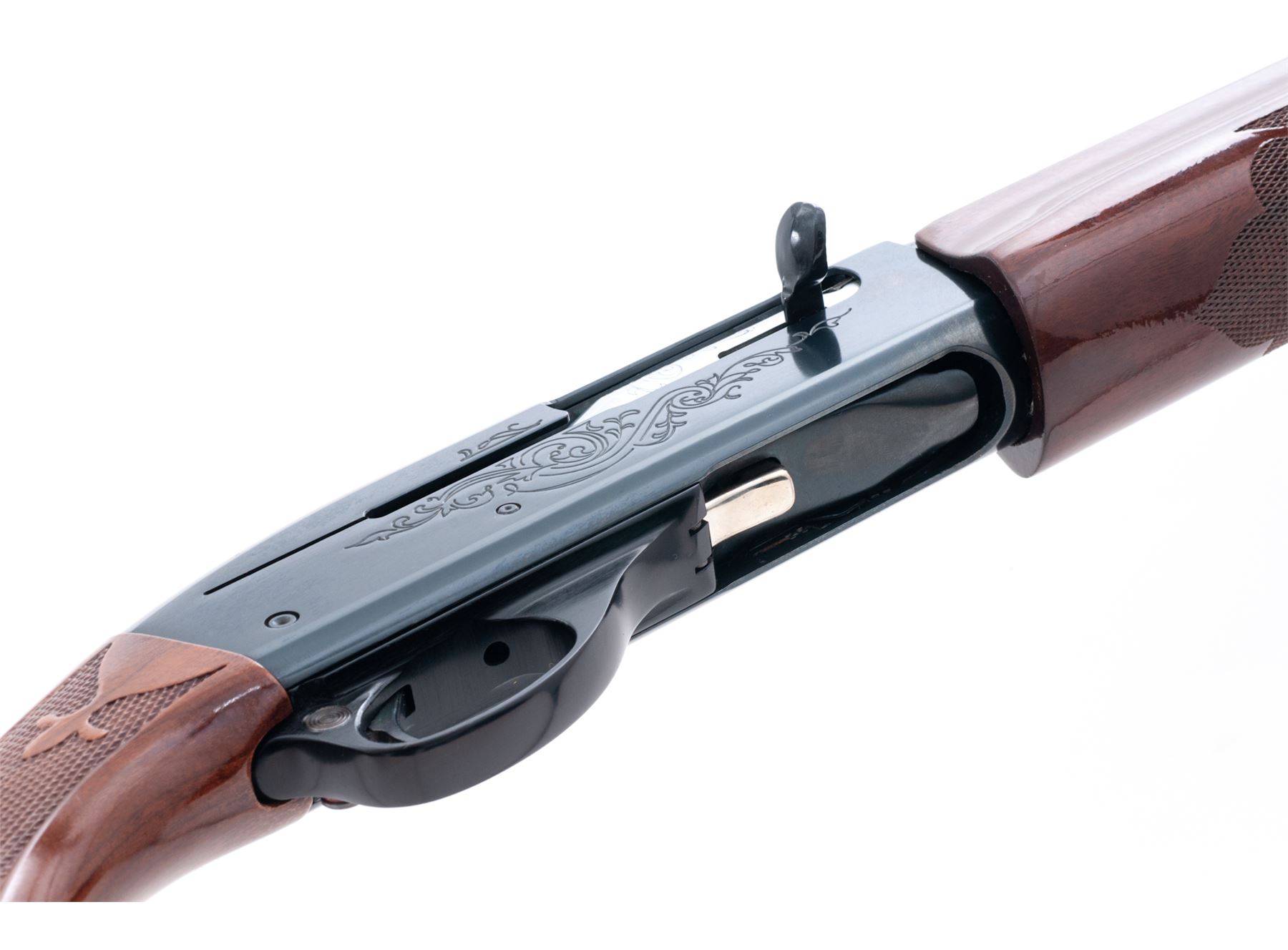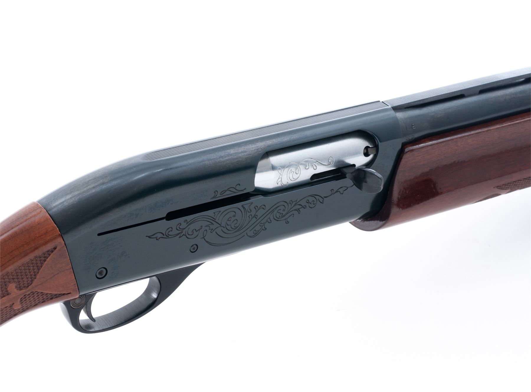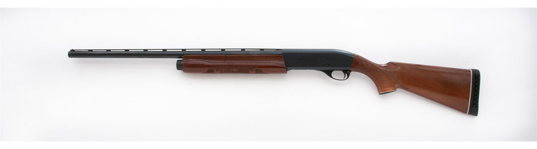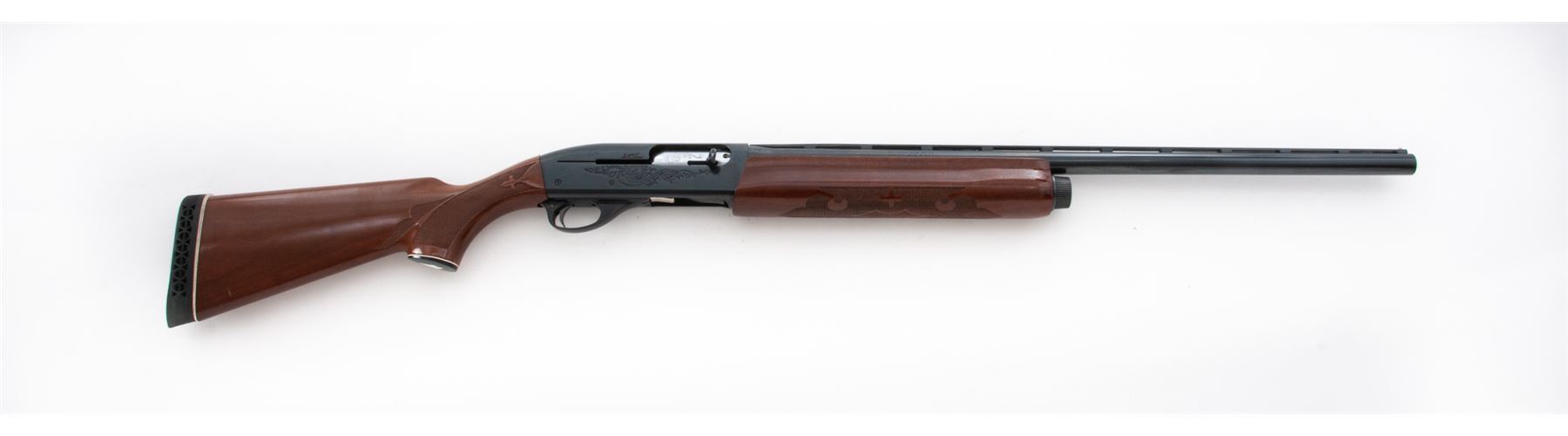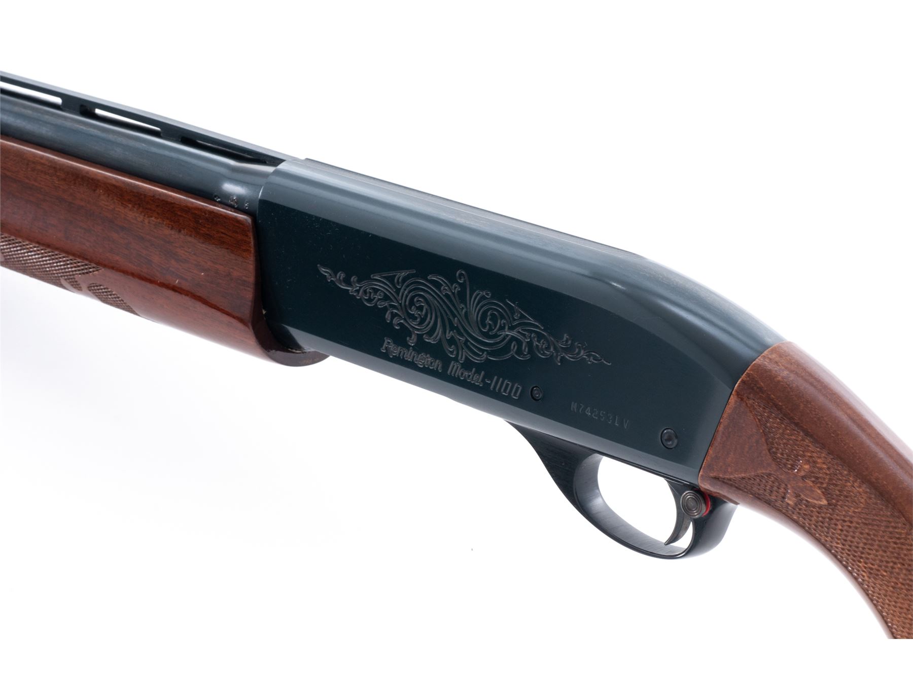 Remington Model 1100 Semi-Automatic Shotgun, #M742531V, 12 ga. 2-3/4'' chamber, 26'' vent rib barrel choked Imp., blue finish, pressed checkered mahogany stock and forend, with black rubber butt pad. Condition is excellent showing just the lightest field use as minor impressions to stock. Good action, bright bore. Est.: $300-$500. (Modern)