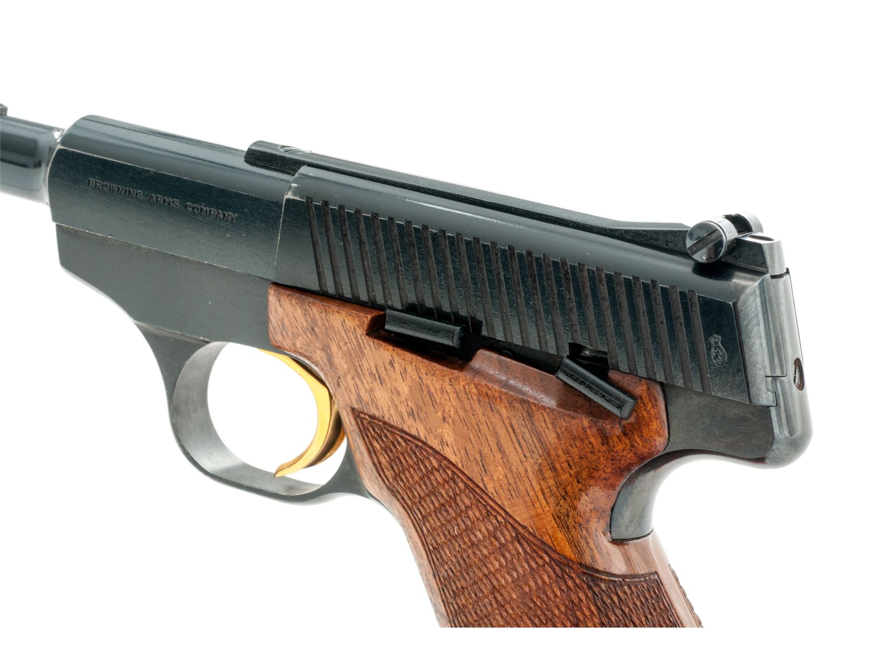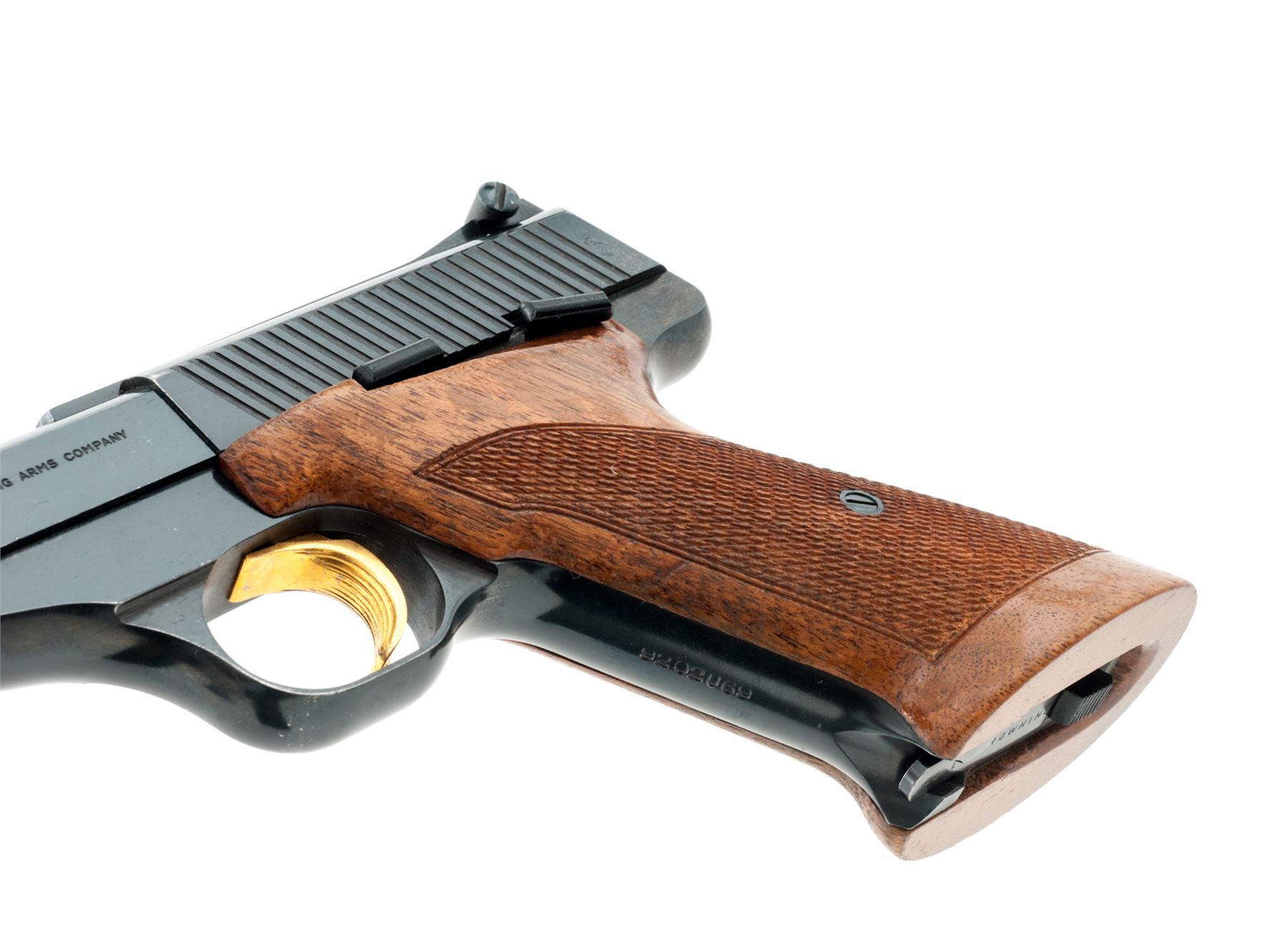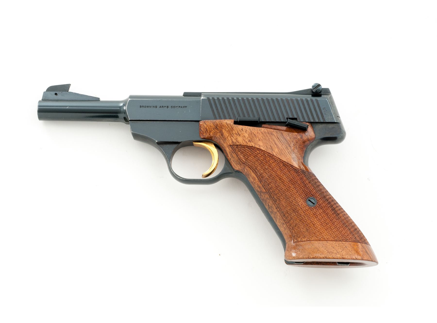 Belgian Browning Challenger Semi-Automatic Pistol, #9202U69, .22 LR cal., 4.5'' barrel, blue finish, wraparound checkered walnut grips, gold-colored trigger, Patridge front sight, adjustable rear sight, with one 10-round Browning magazine. Mfg'd 1969. Condition is very good. Metal with approx. 97% remaining blue finish showing general small handling marks; factory lettering is defined. Grips with shallow impressions and scratches, mainly to the flat borders; approx. 75% finish remains; checkering with a few spots of minor wear. Action is smooth; bright bore rates excellent. Est.: $300-$500. (Modern)