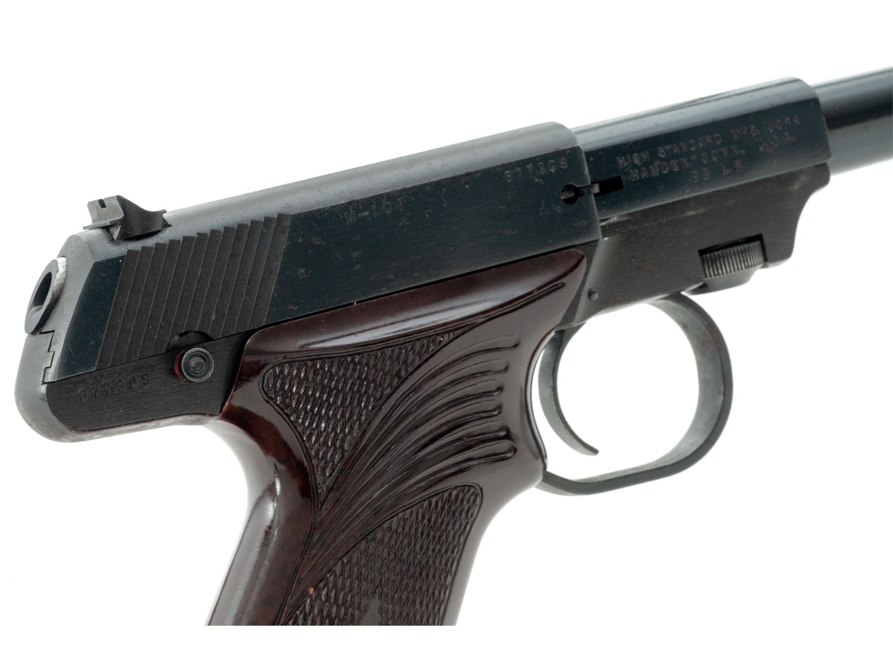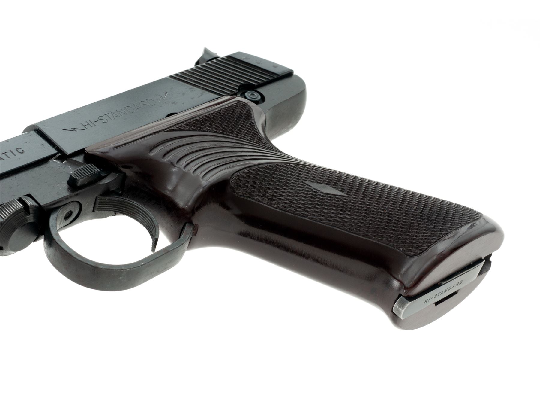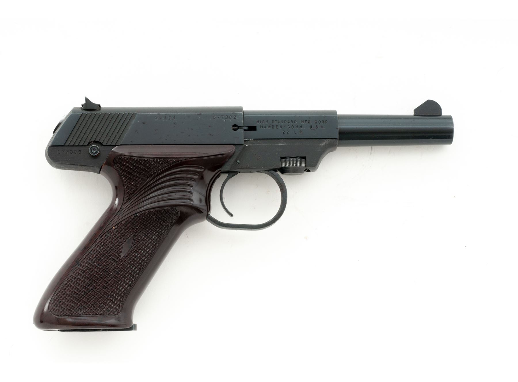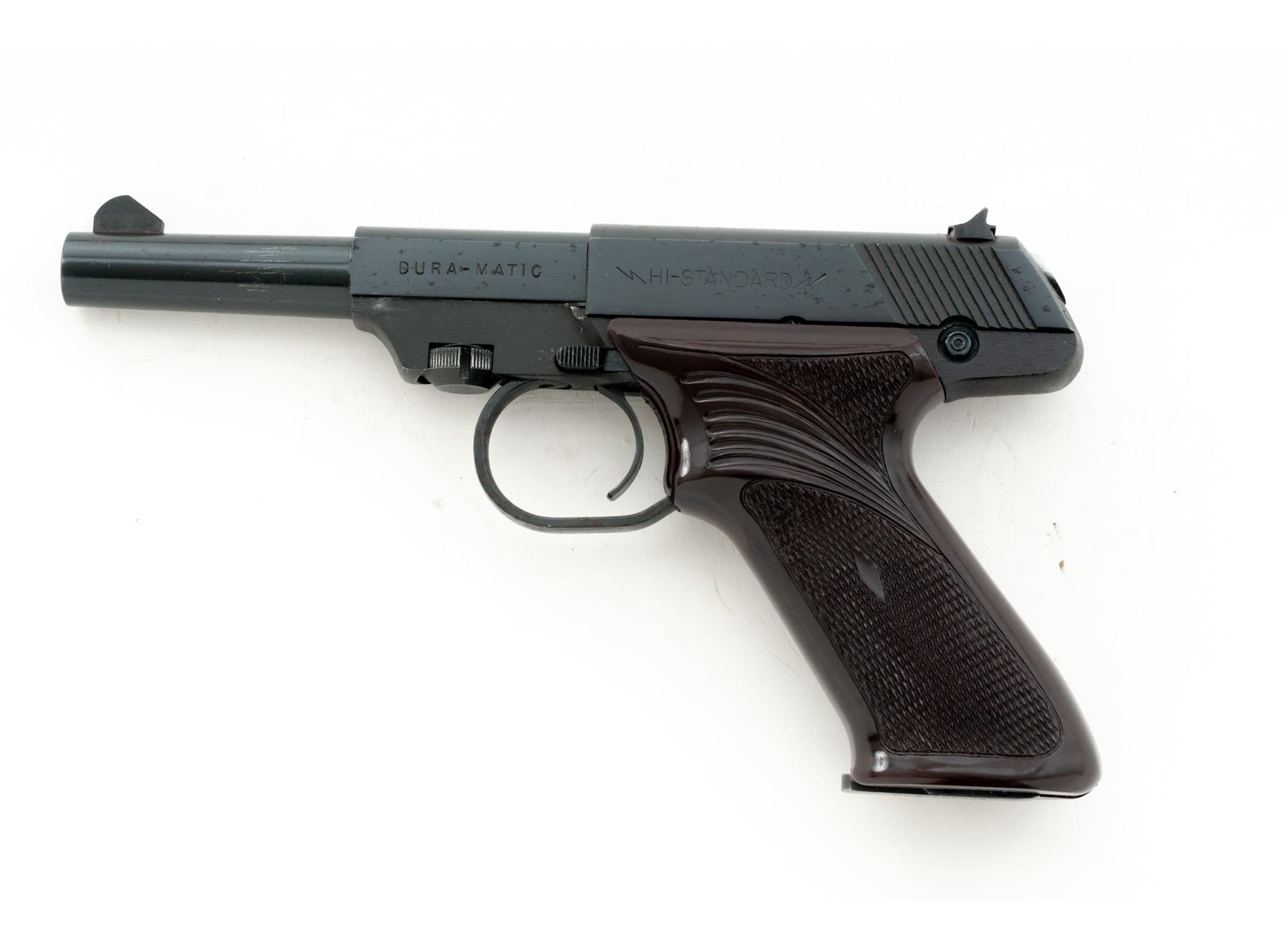 Hi-Standard Duramatic Semi-Automatic Sporting Pistol, #677309, .22 LR cal., 4.5'' barrel, blue finish, factory brown checkered plastic grips, with one factory magazine. Condition is excellent retaining approx. 96% original finish with very light just beginning pitting. Grips and action are excellent, bore is bright. Est.: $250-$450. (C&R/PPT)