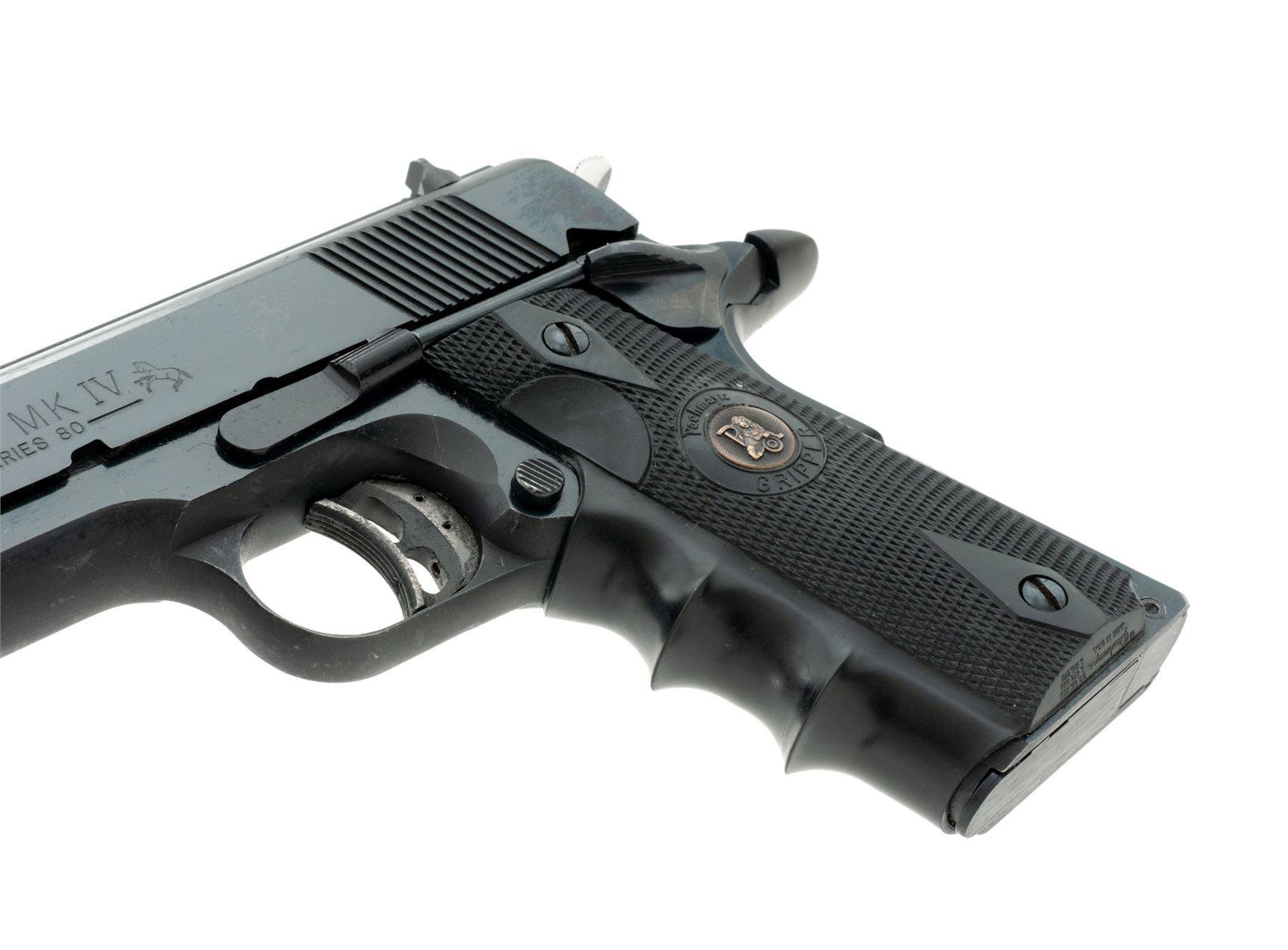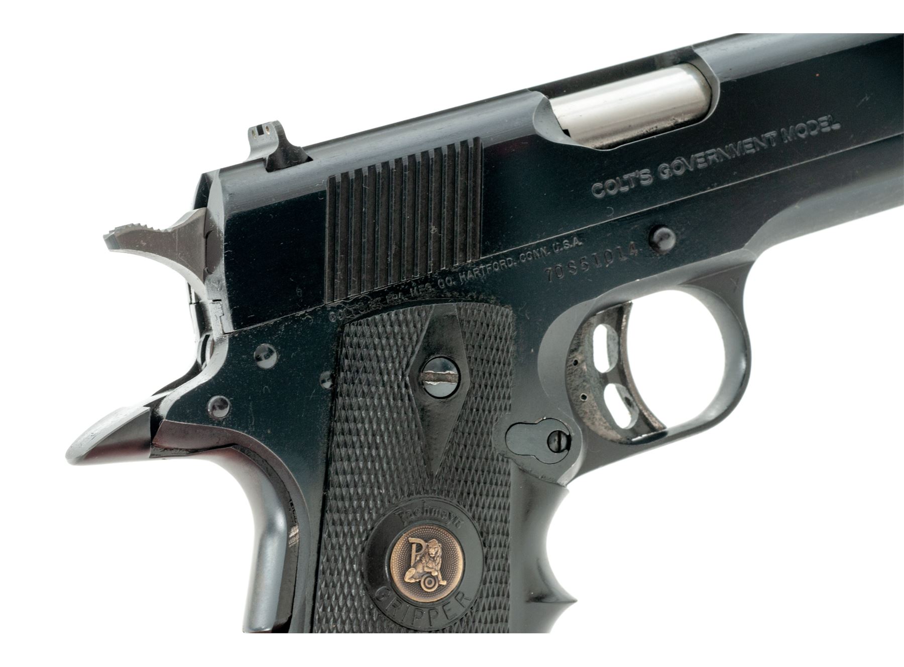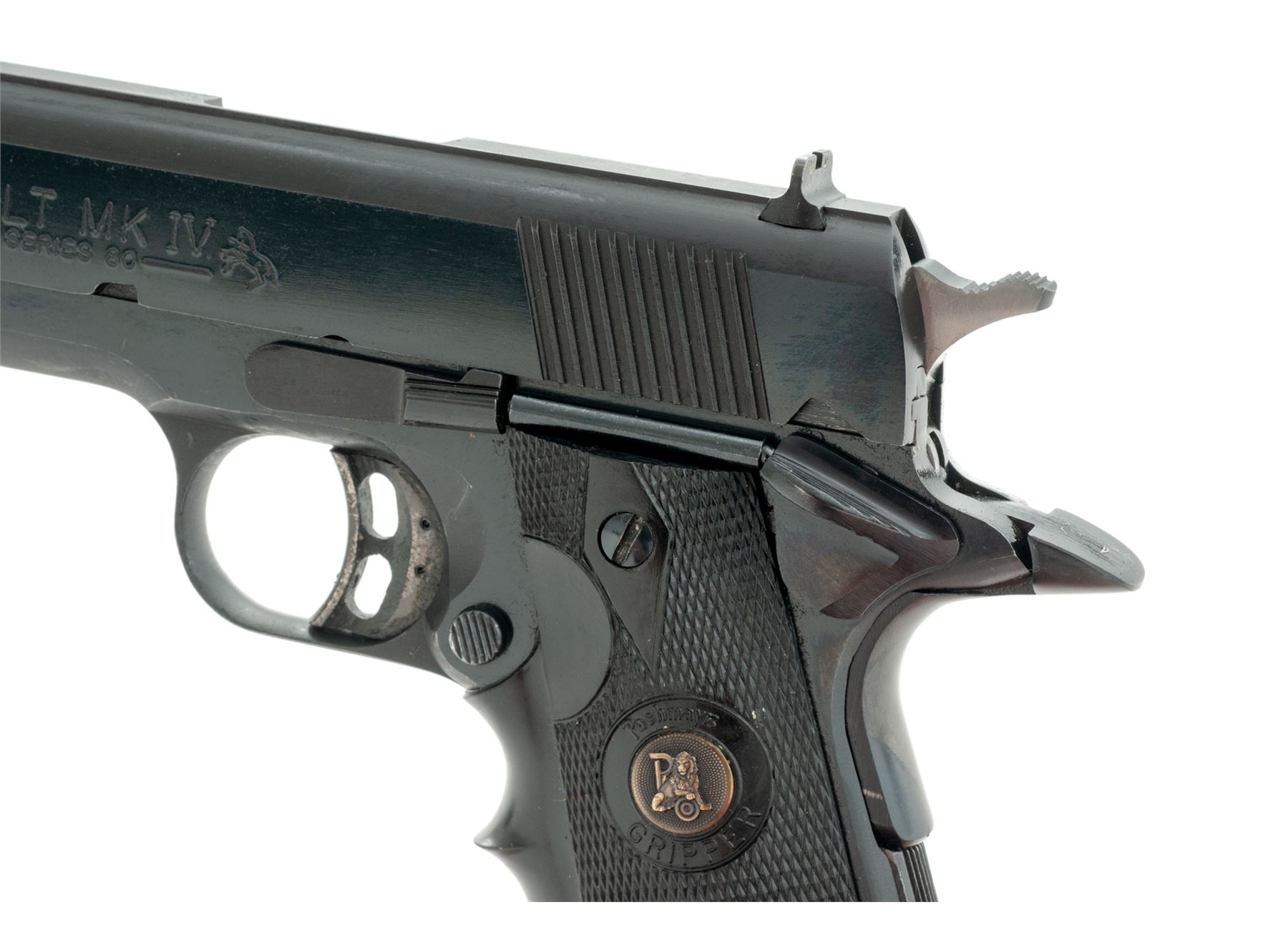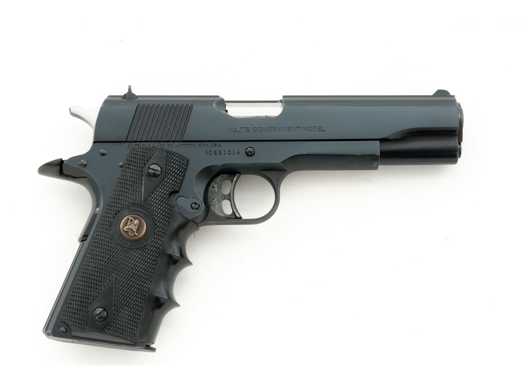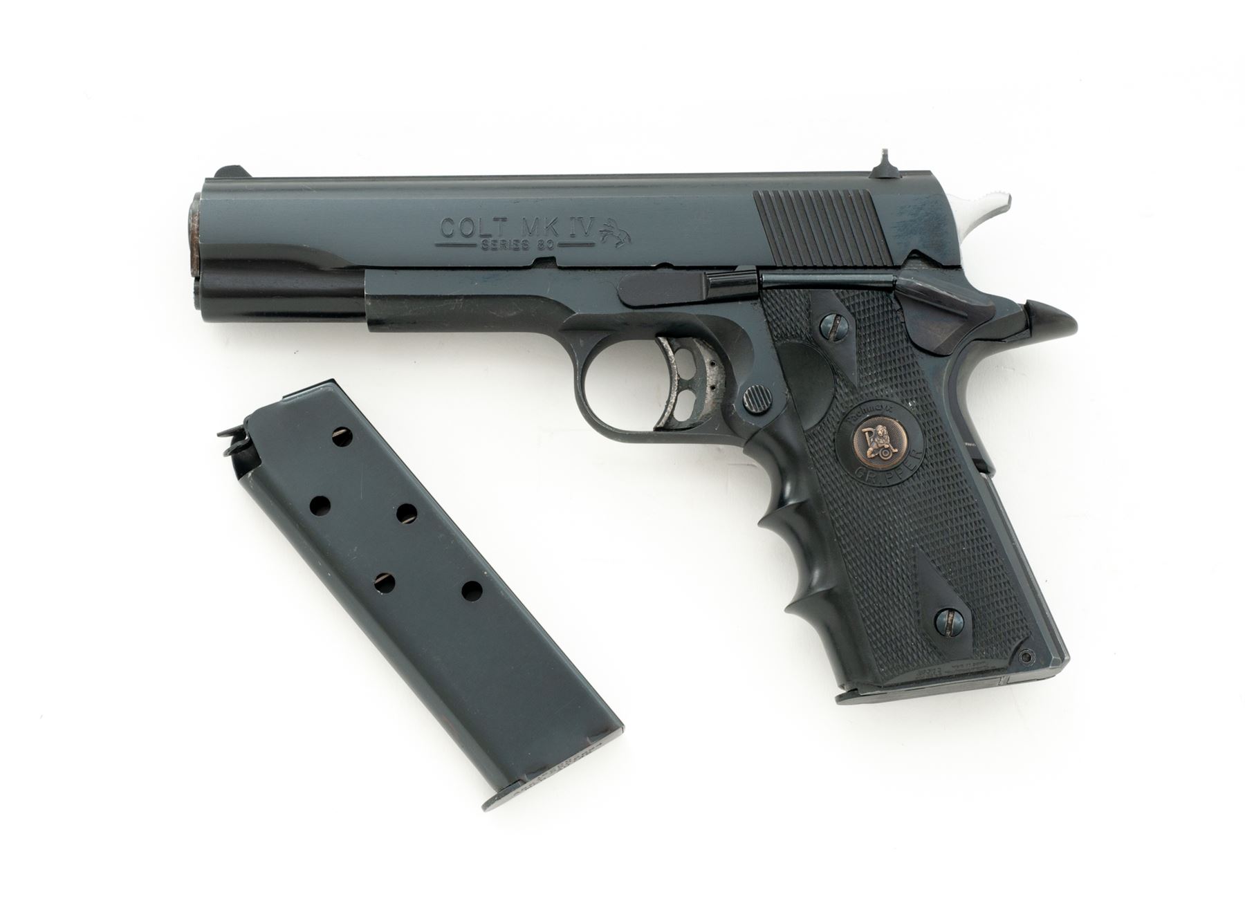 Colt MK IV Series 80 Combat Gov't Model Semi-Automatic Pistol, #70S51014, .38 Super cal., 5'' barrel, blue finish, Pachmayr wraparound black rubber grips, with one unmarked .38 Super magazine, and three-dot sight system on flat-top slide. Dating from the early l980s. Condition is excellent retaining approx. 98% factory blue. Grips and action are very good, Series 80 safety has been removed and aftermarket trigger and National Match bushing have been added; bore is bright. Est.: $600-$800. (Modern/PPT)