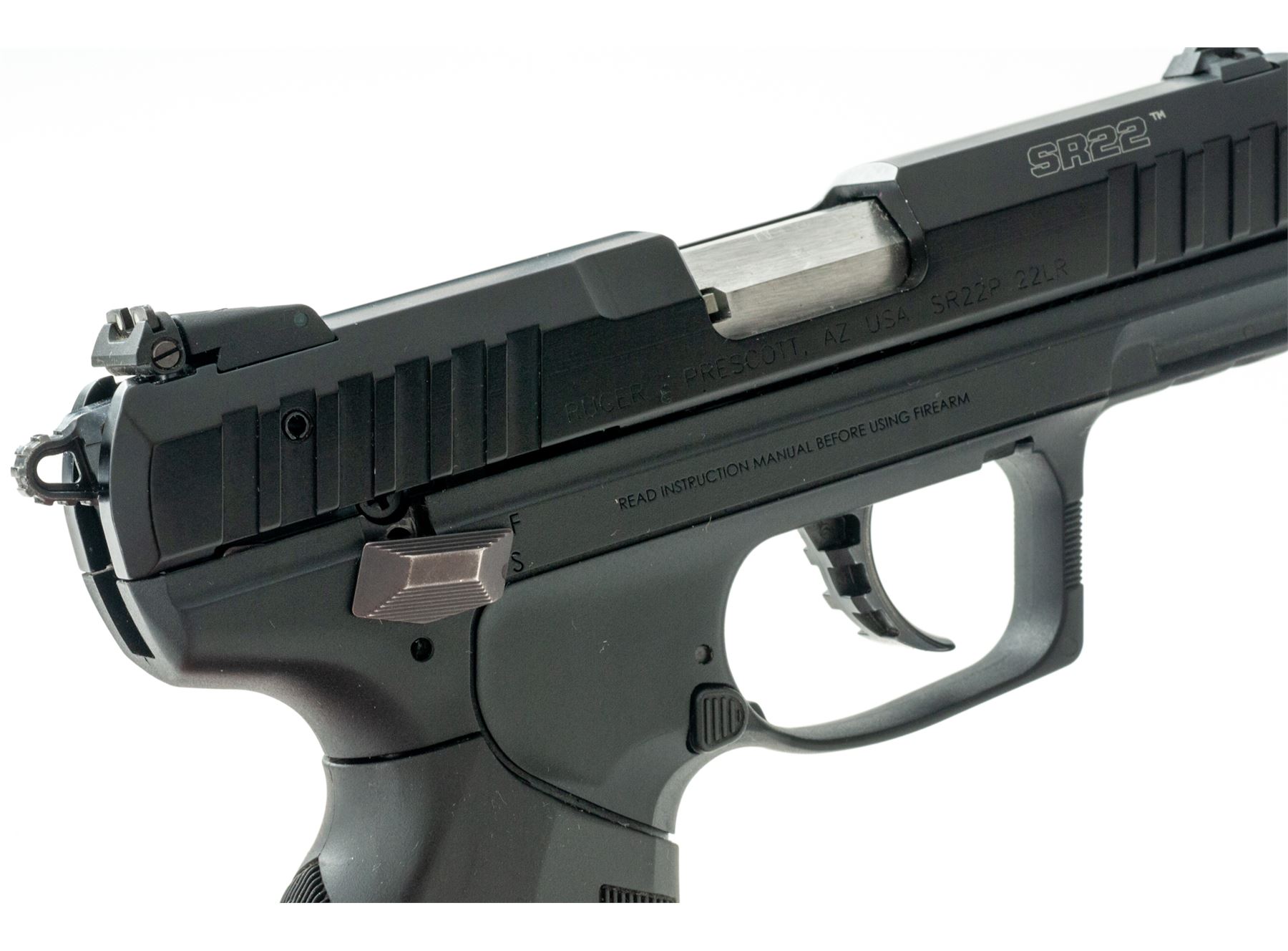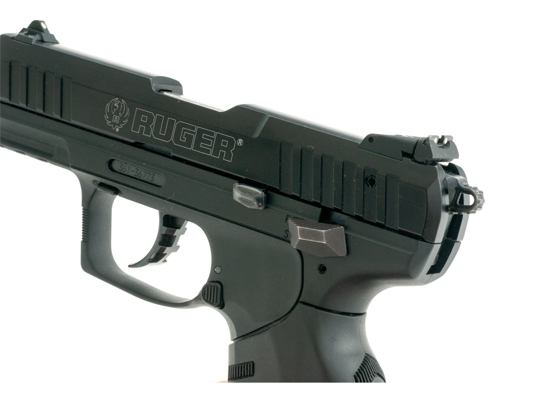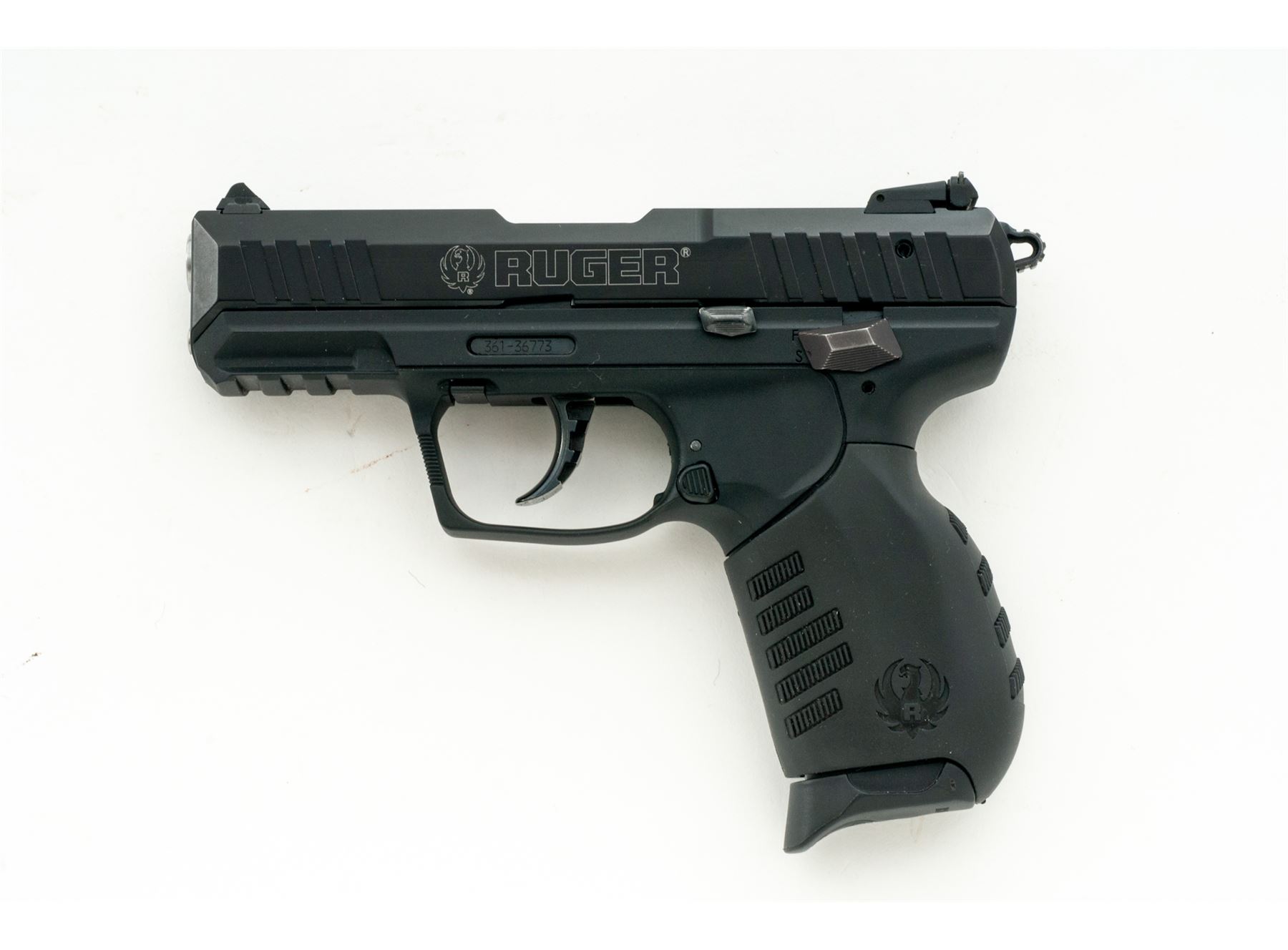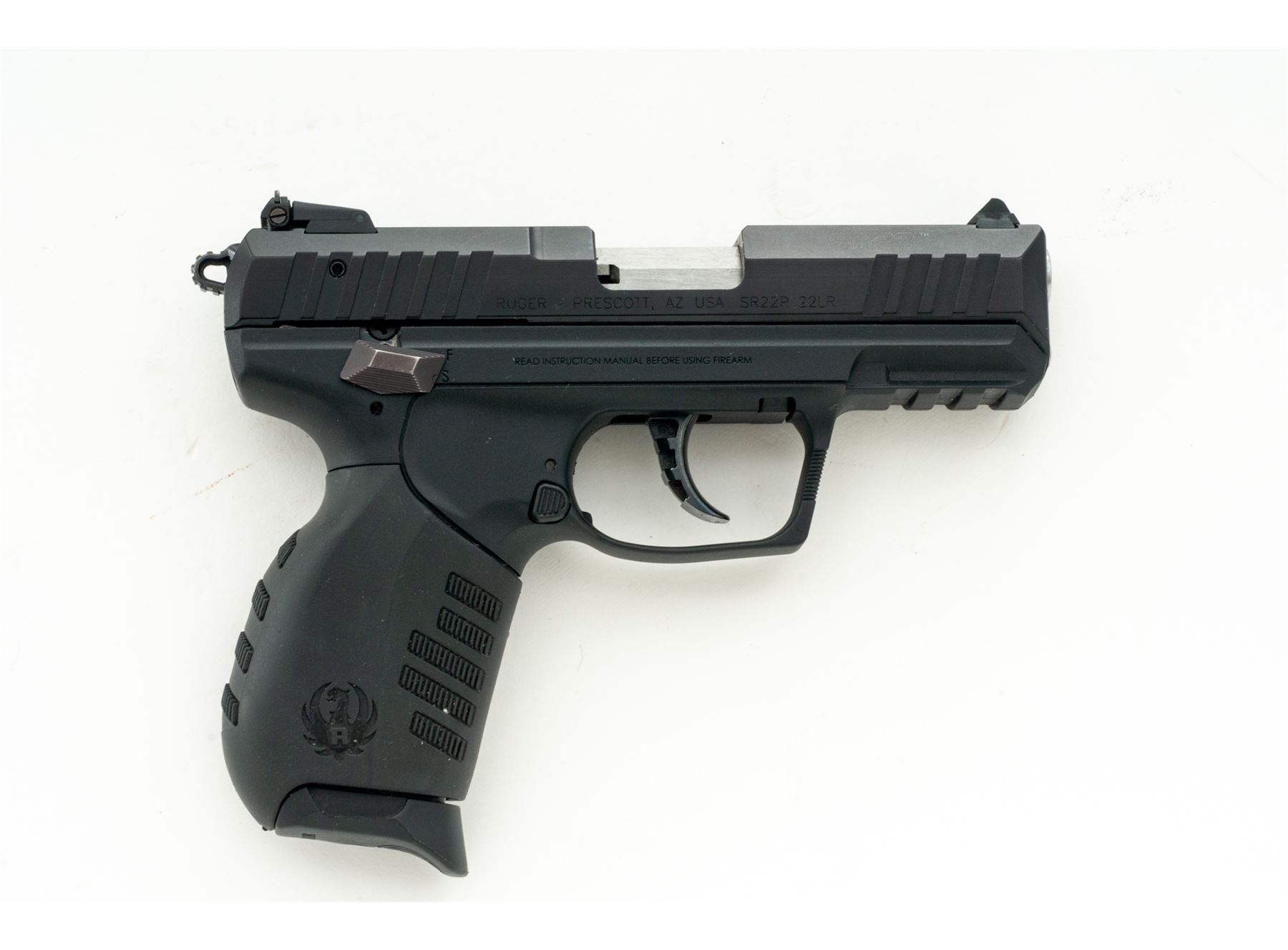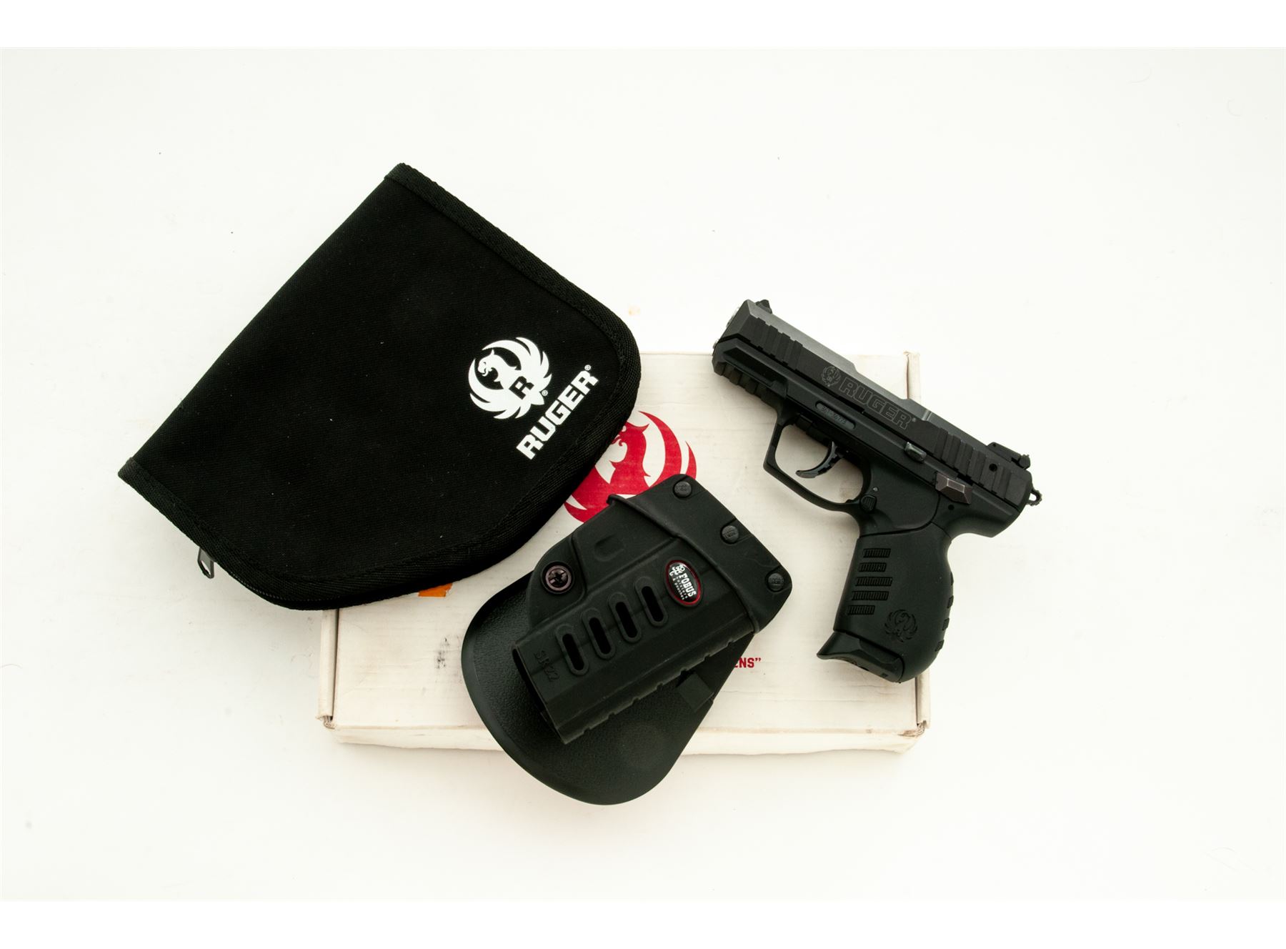 Ruger SR-22 Semi-Automatic Pistol, #361-36773, .22 LR cal., 3.5'' barrel, black aluminum slide, black polymer frame with interchangeable grip, white 3-dot sights, rear sight is adjustable for windage and elevation, lower accessory rail, ambidextrous safety and magazine release, with one 10-round Ruger magazine. In original box with matching end label, Ruger soft boot, owner's manual, gun lock, extra black rubber grip, and right-hand Fobus paddle holster. Overall condition is excellent showing just light handling marks. Smooth action, bright bore; overall appearing to have been fired very little. Est.: $250-$350. (Modern/PPT)