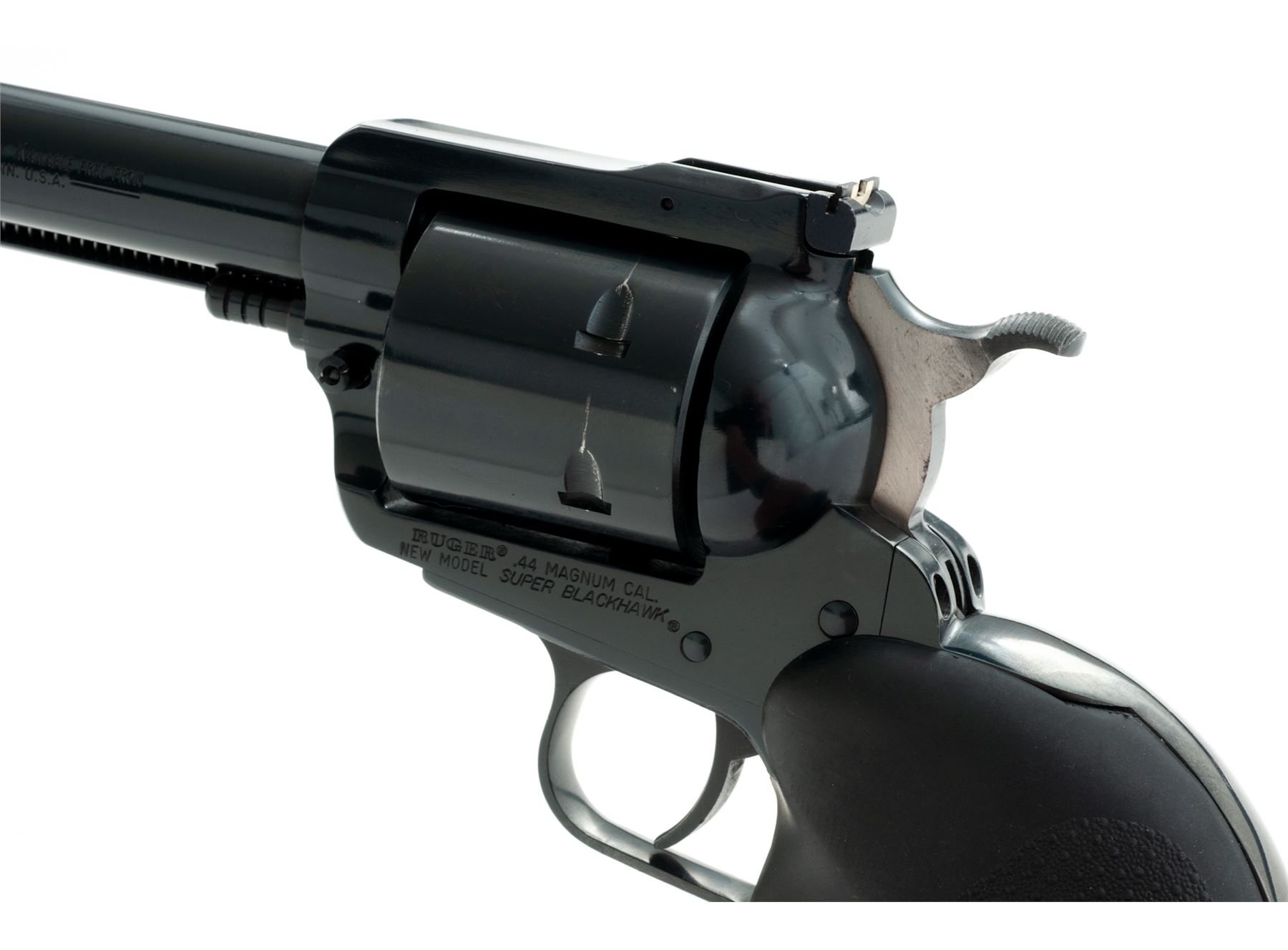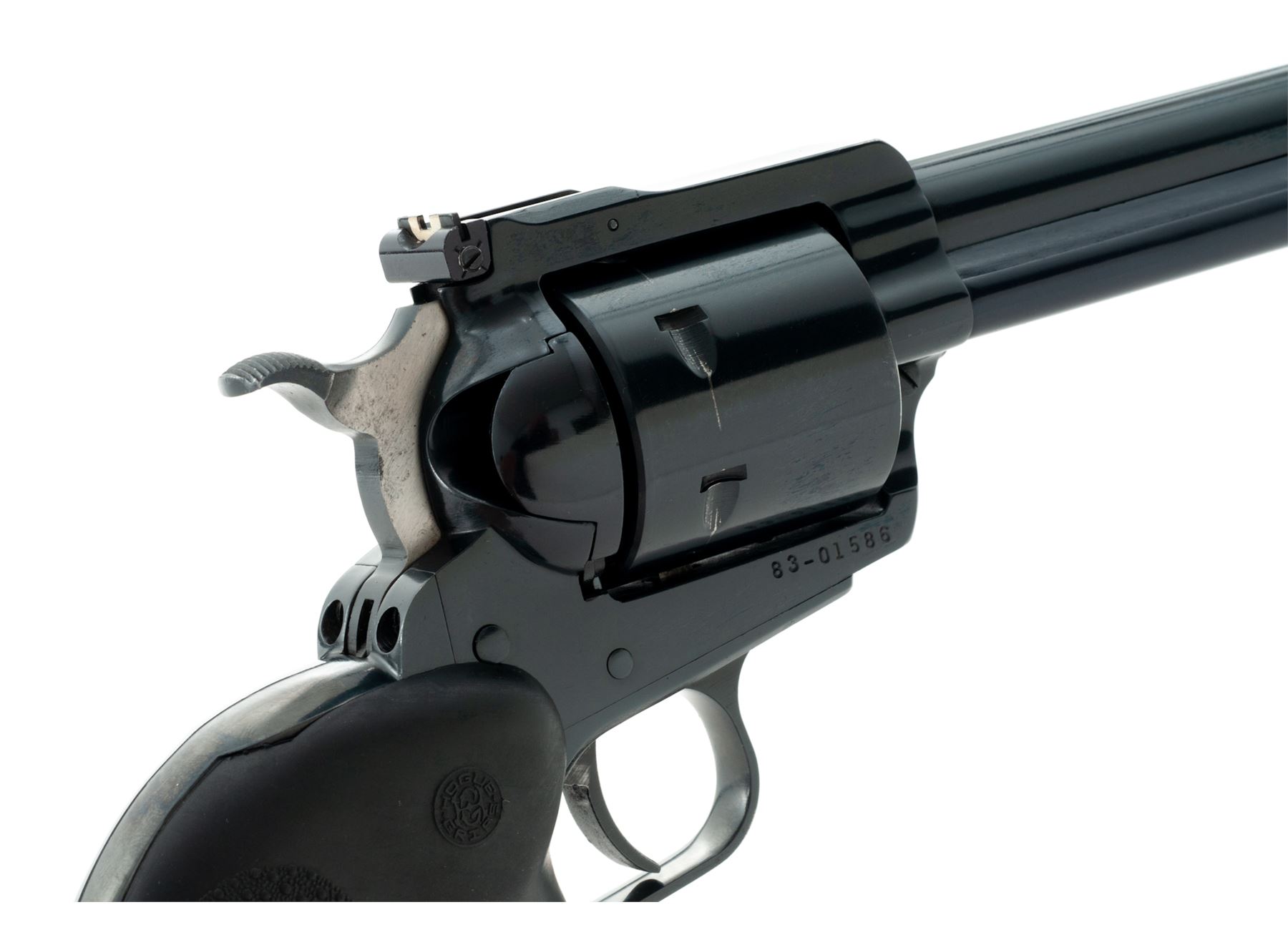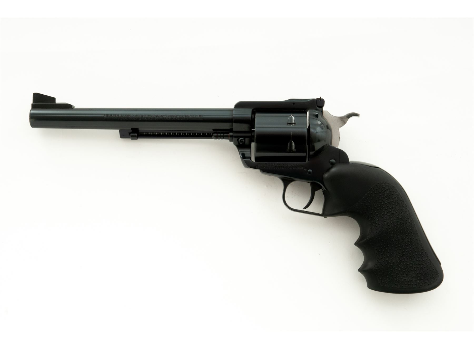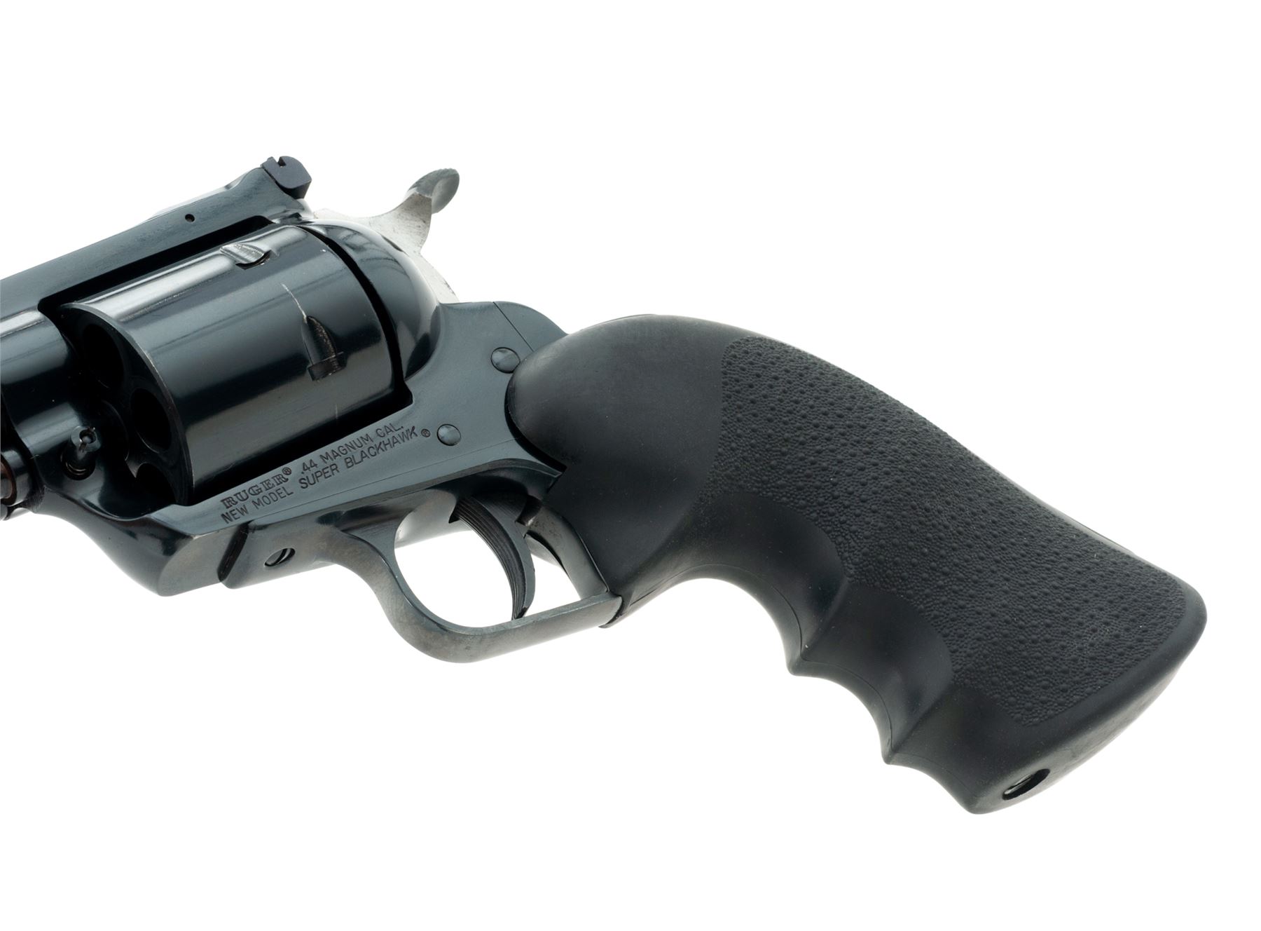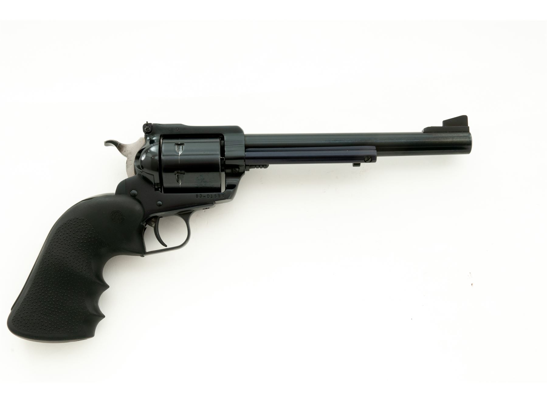 Ruger New Model Super Blackhawk Single Action Revolver, #83-01586, .44 mag. cal., 7.5'' barrel, blue finish, unfluted cylinder, stippled black rubber Hogue grips with finger grooves, blade front sight and adjustable square notched rear sight with added white paint. Overall the condition is excellent. Metal retains approx. 98% original blue finish; left side with a little muzzle wear; cylinder with a thin index line. Grips with a few normal small handling marks. Action is smooth and crisp; bore is bright with a little powder fouling in the grooves, rifling is excellent. Est.: $400-$600. (Modern/PPT)