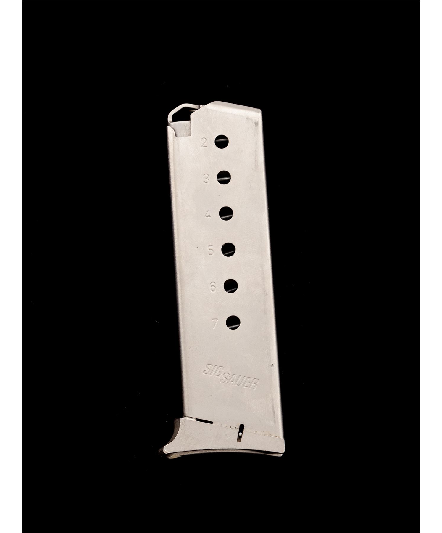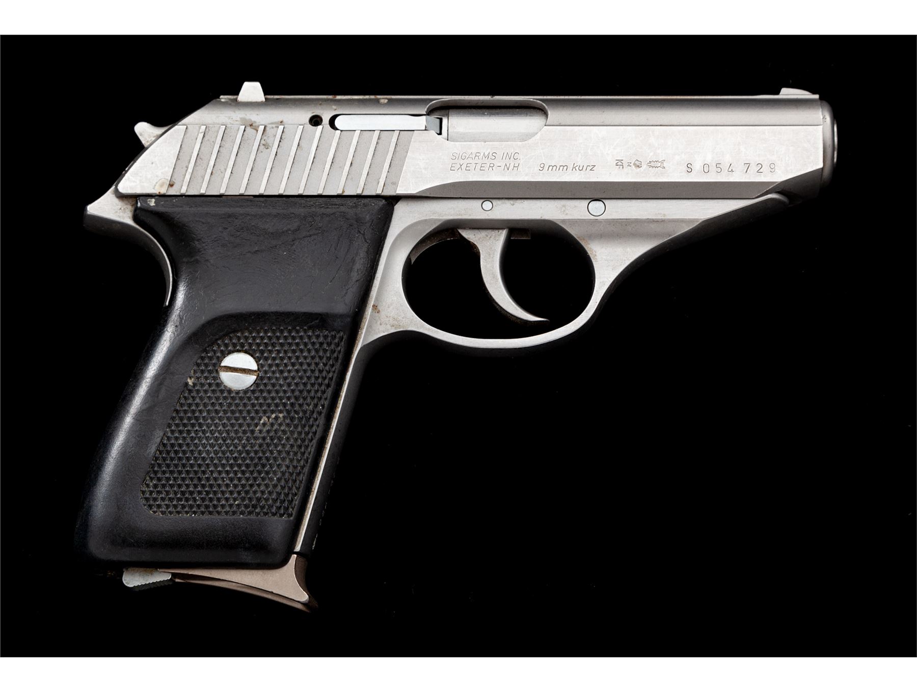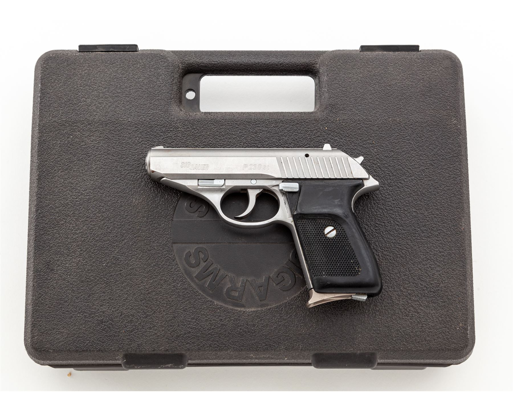 Sig Sauer P230 SL Semi-Automatic Pistol, #S054729, .380 ACP cal., double/single action, 3-5/8'' barrel, satin stainless steel, checkered black plastic wraparound grips, red-dot front sight, square notched rear sight with red post, and two (2) 7-round stainless magazines. In Sig Arms hard plastic case with owner's manual and original test target. Condition overall is good with light scuffs and scratches overall. Grips with some crazing to the surface. Excellent action and bright bore. Est.: $250-$350. (Modern/PPT)