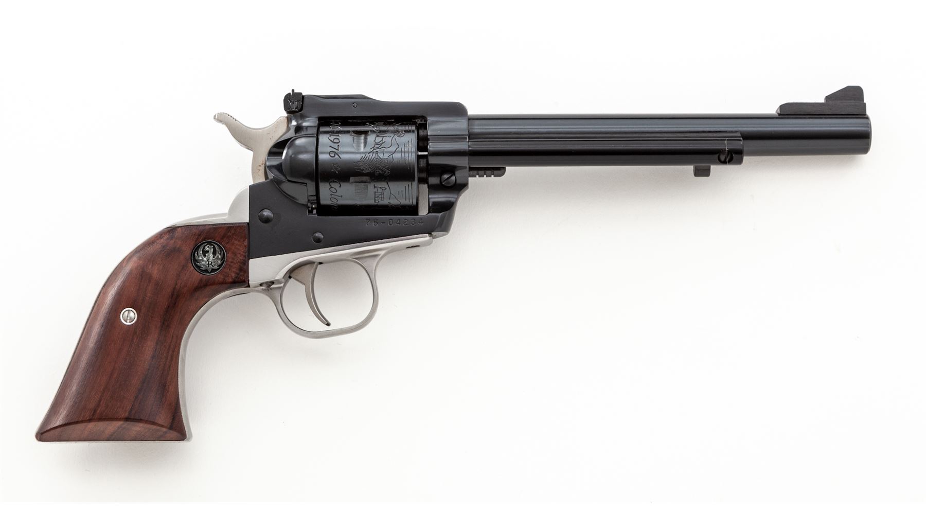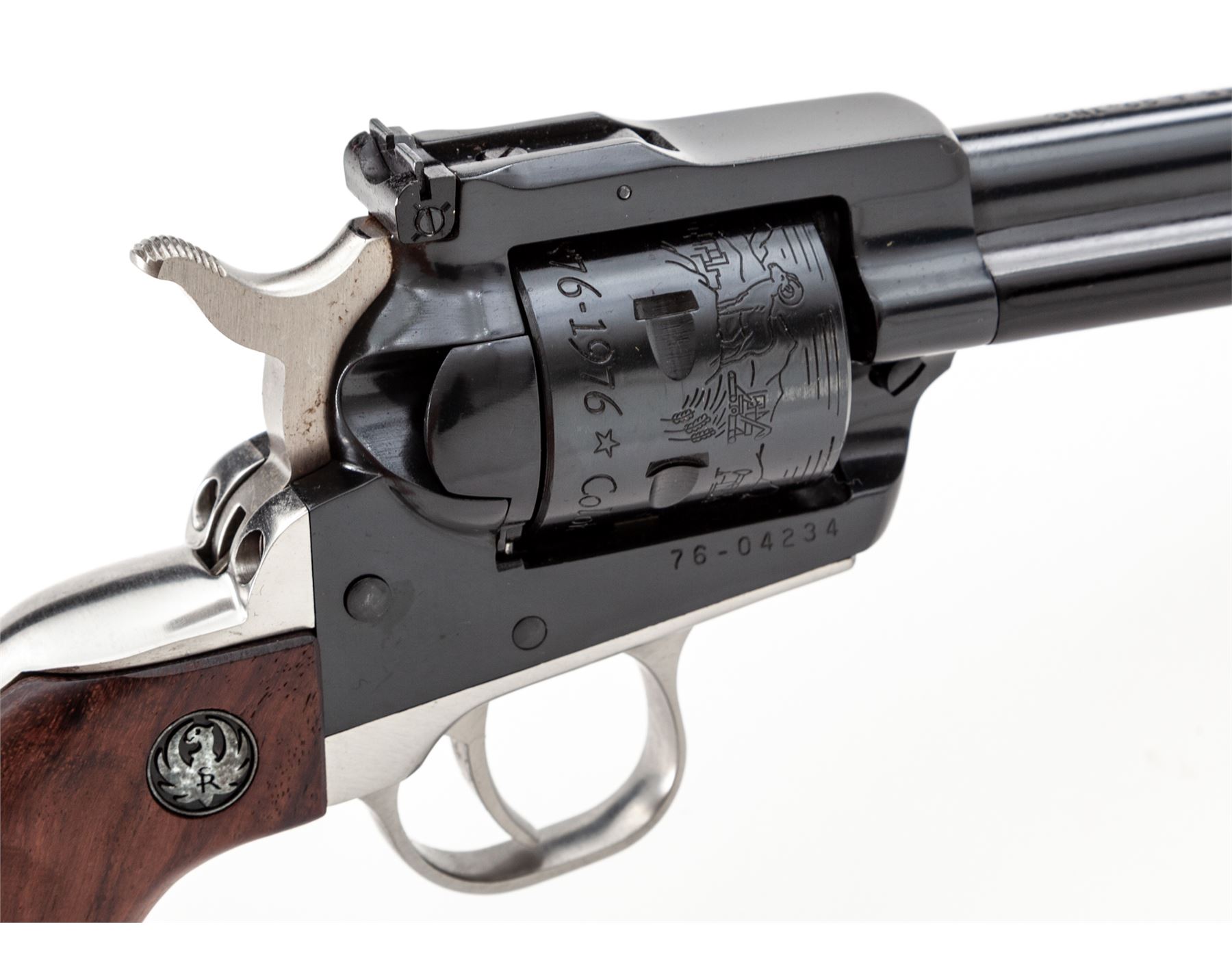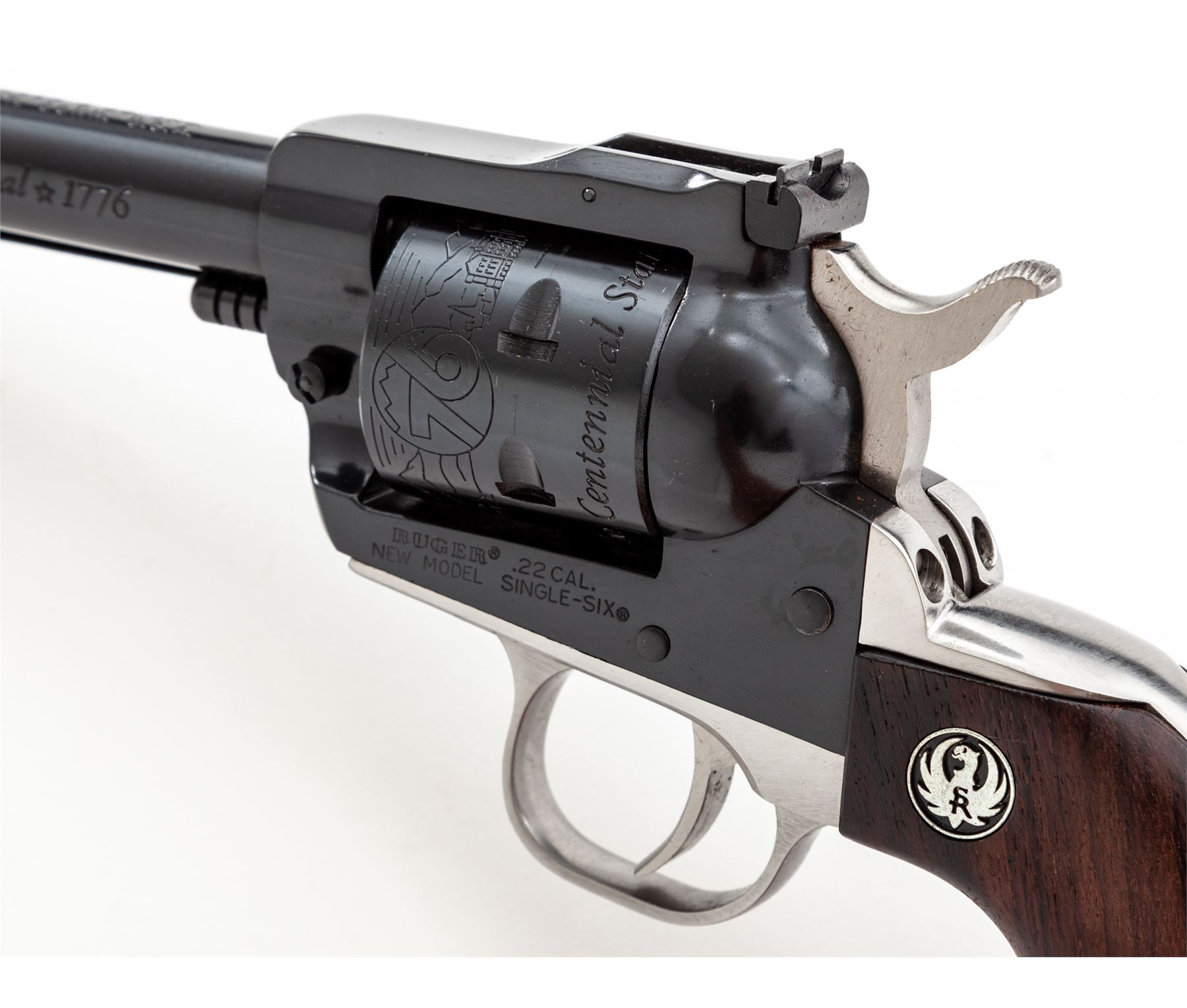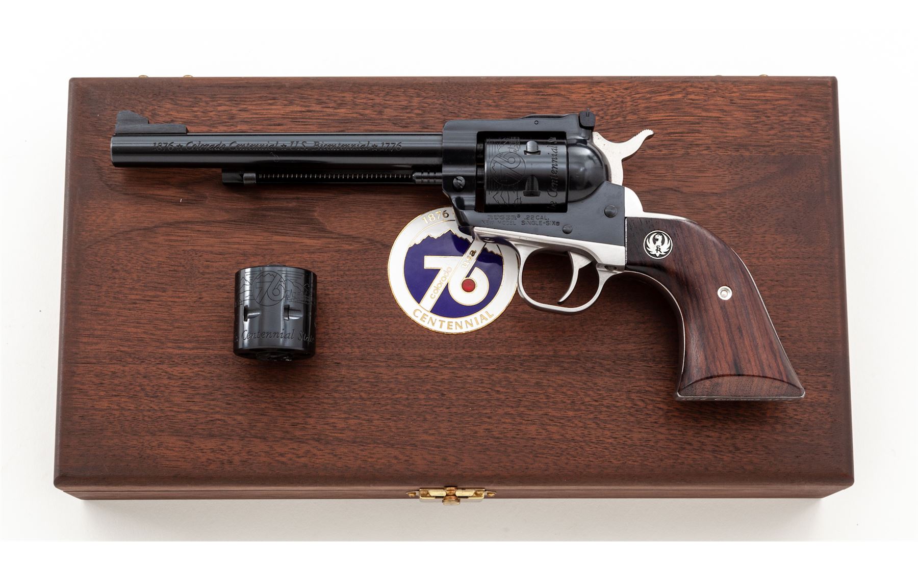 Ruger Colorado Centennial New Model Super Single Six Revolver, #76-04234, .22 LR cal., with additional .22 mag. cylinder; both cylinders are numbered to the gun. 6.5'' barrel, blue finish, polished stainless steel backstrap and triggerguard, walnut grips with inlaid Ruger ''silver eagle'' medallions, blade front sight and square notched rear sight adjustable for both windage and elevation. In original 1976 Colorado Centennial wood case with medallion on lid and includes instruction/parts list, Centennial card, and display case key. Both cylinders with commemorative engraving. Condition is excellent retaining approx. 99% factory blue, both cylinders with a slight index line, gripstrap with a few light marks from handling, factory lettering is crisp and defined. Grips are also excellent, showing only a few minor marks from handling. Bore is mirror bright. Both the interior and exterior of the case are excellent. Est.: $350-$500. (Modern/PPT)