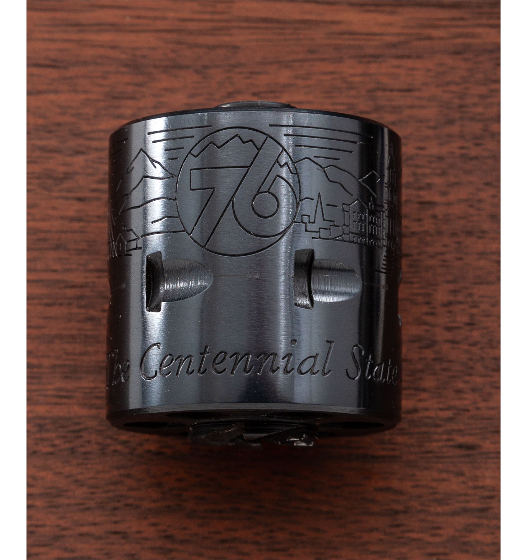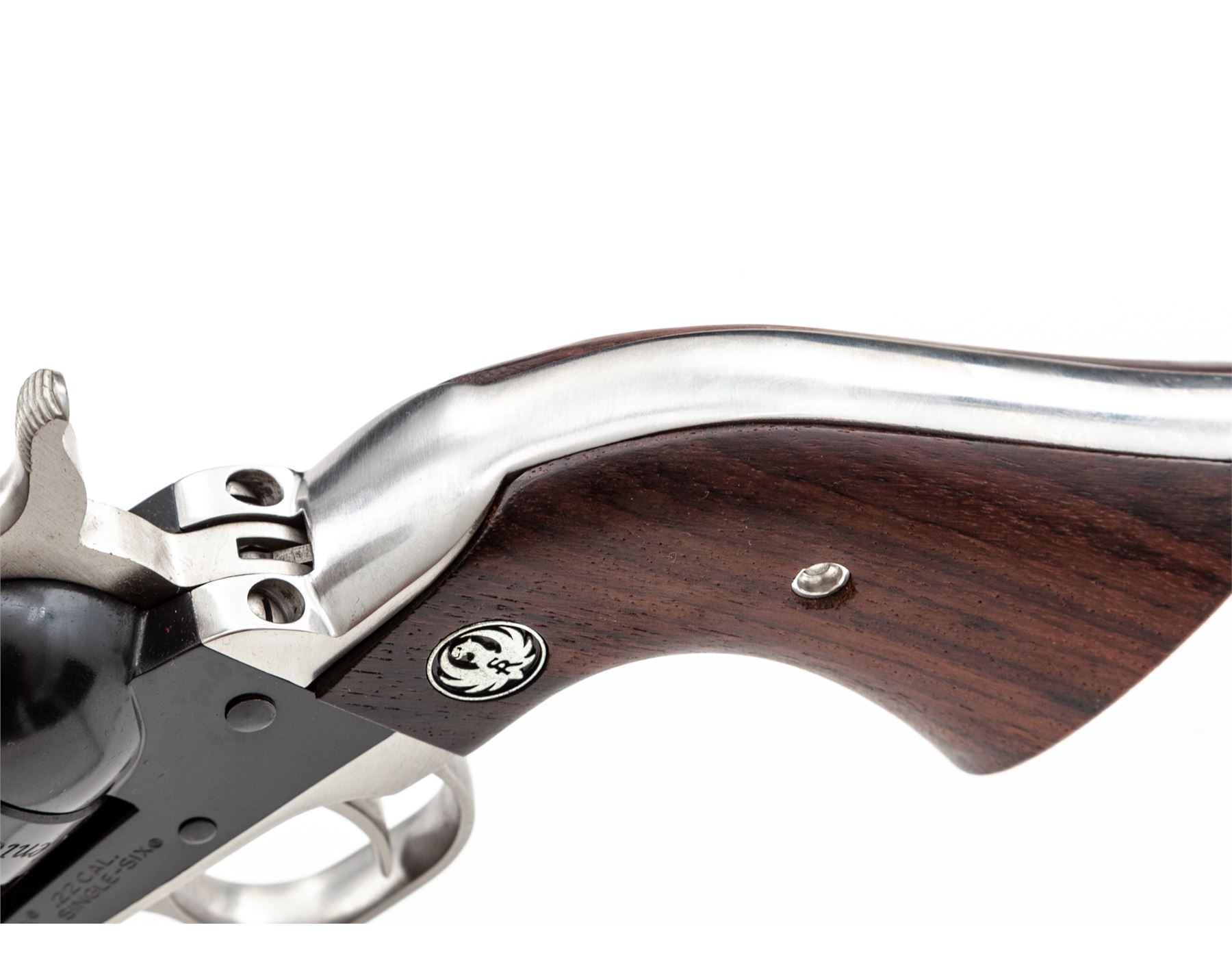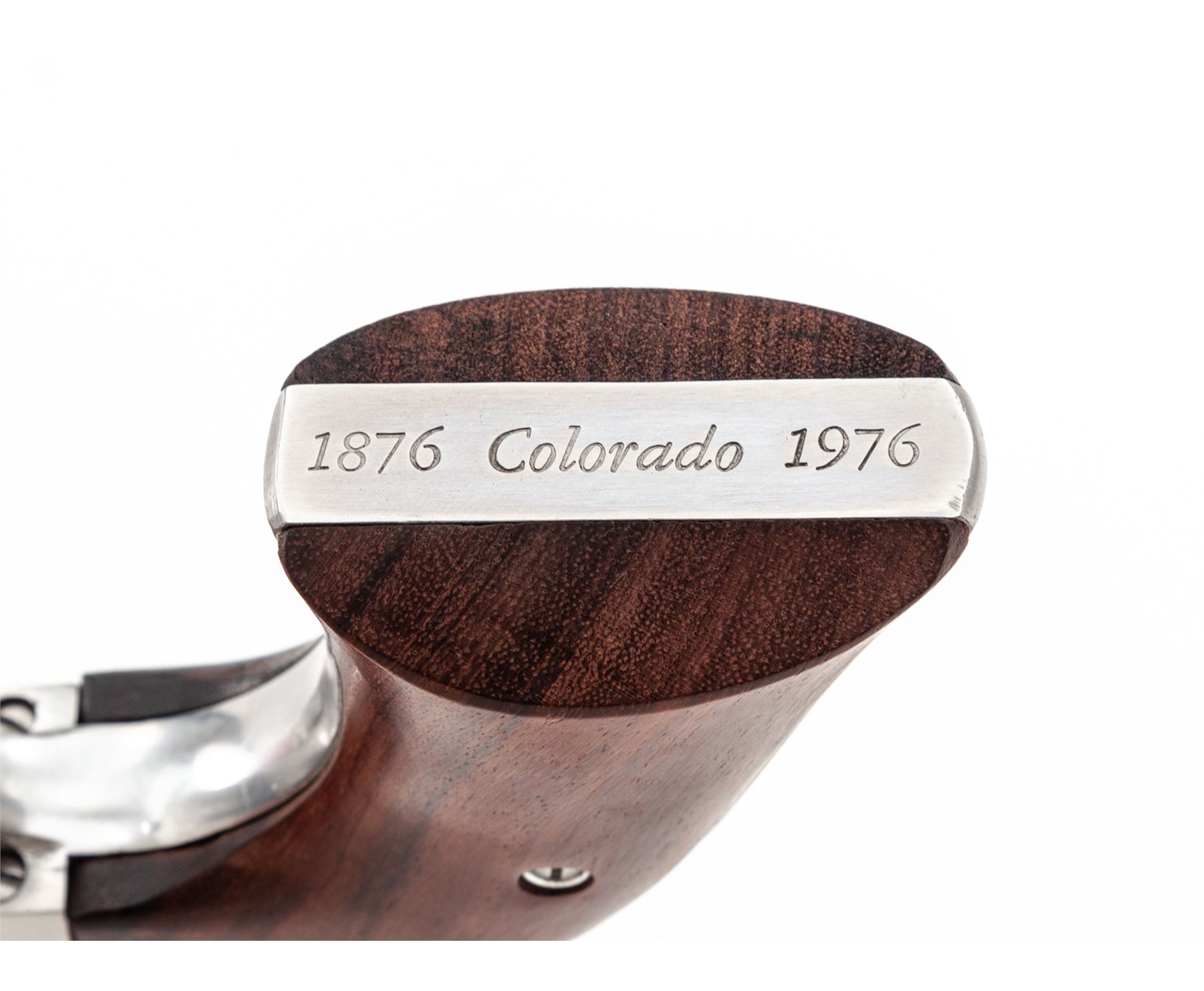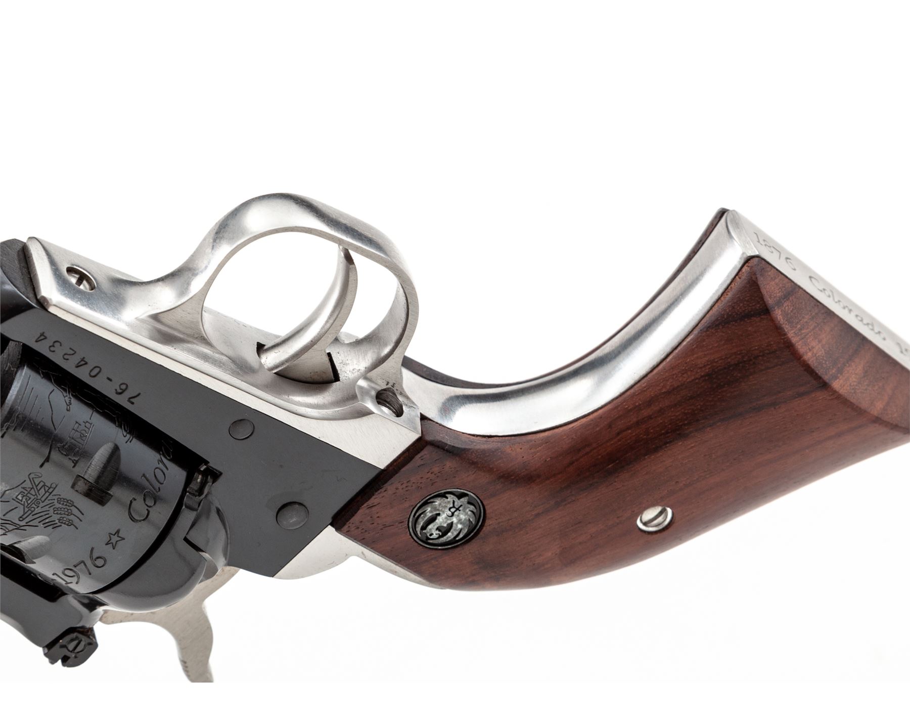 Ruger Colorado Centennial New Model Super Single Six Revolver, #76-04234, .22 LR cal., with additional .22 mag. cylinder; both cylinders are numbered to the gun. 6.5'' barrel, blue finish, polished stainless steel backstrap and triggerguard, walnut grips with inlaid Ruger ''silver eagle'' medallions, blade front sight and square notched rear sight adjustable for both windage and elevation. In original 1976 Colorado Centennial wood case with medallion on lid and includes instruction/parts list, Centennial card, and display case key. Both cylinders with commemorative engraving. Condition is excellent retaining approx. 99% factory blue, both cylinders with a slight index line, gripstrap with a few light marks from handling, factory lettering is crisp and defined. Grips are also excellent, showing only a few minor marks from handling. Bore is mirror bright. Both the interior and exterior of the case are excellent. Est.: $350-$500. (Modern/PPT)