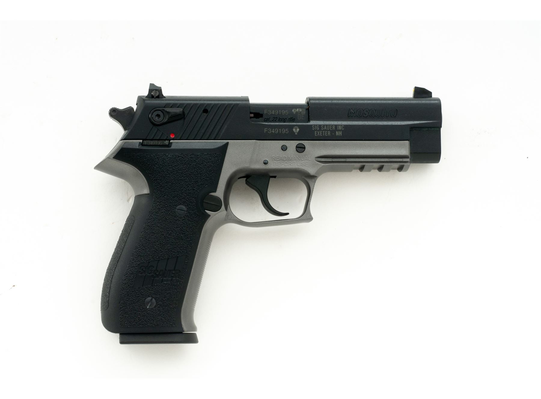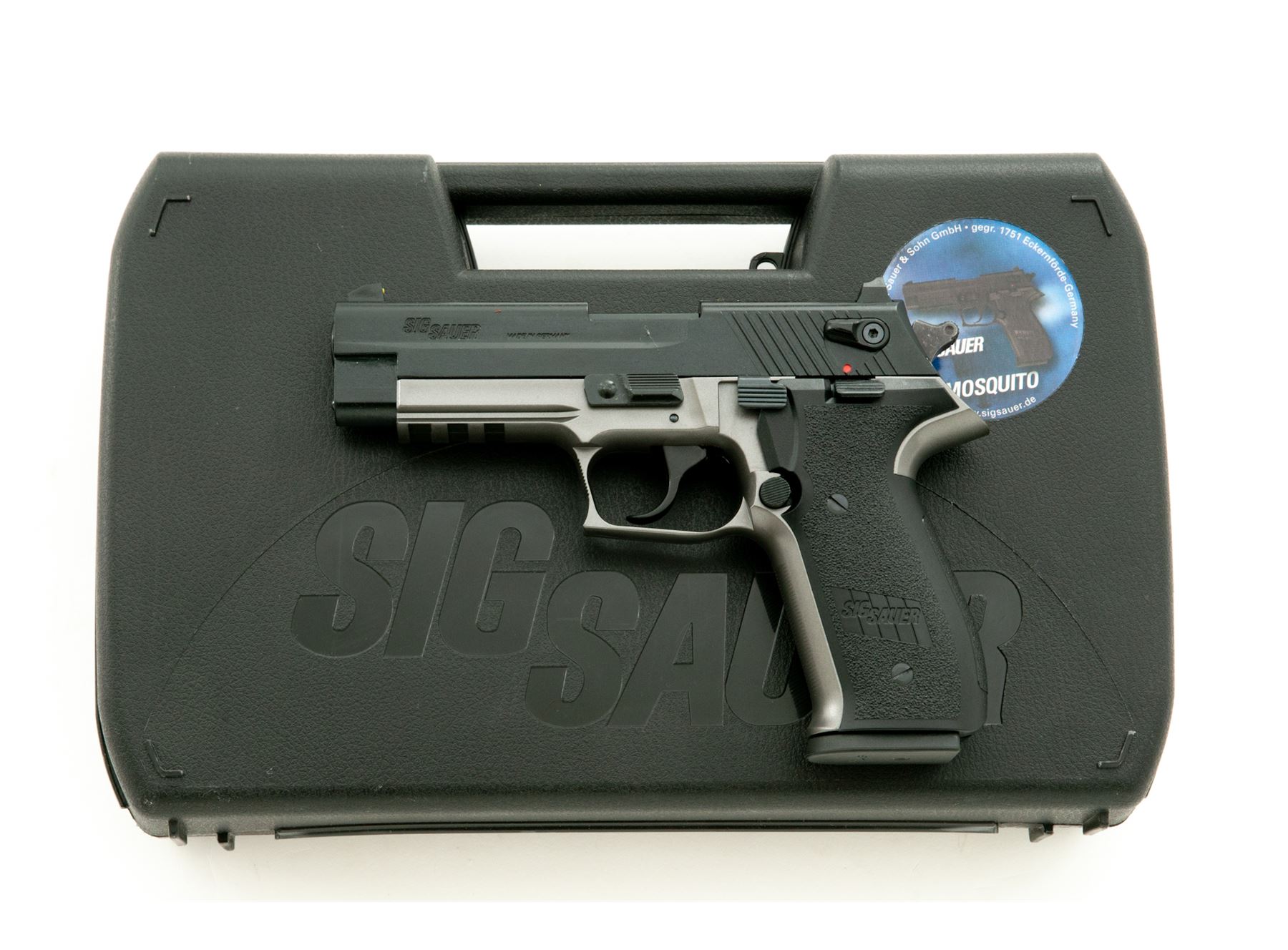 Two-Tone Sig Sauer Mosquito Semi-Automatic Pistol, #F349195, .22 LR cal., 4'' barrel, black slide, gray polymer frame, factory black plastic grips, yellow 3-dot sights, ambidextrous safety, lower accessory rail, with one 10-round Sig Sauer magazine. In original plastic case with matching end label, owner's manual, and a few misc. small parts. Condition is excellent appearing near new, showing only a few slight handling marks. Smooth action, bright bore. Est.: $250-$350. (Modern) (Not available to Calif. residents.)