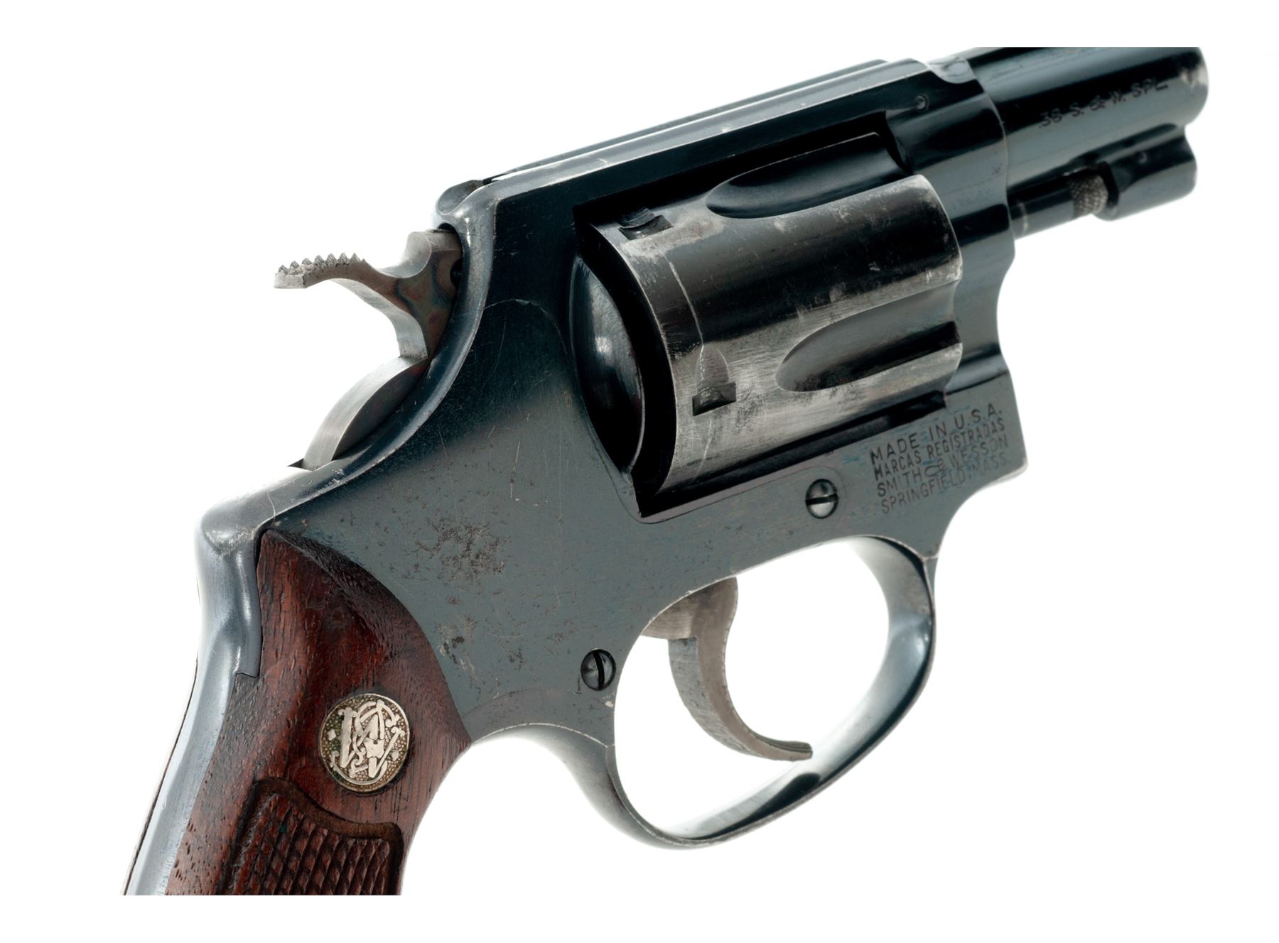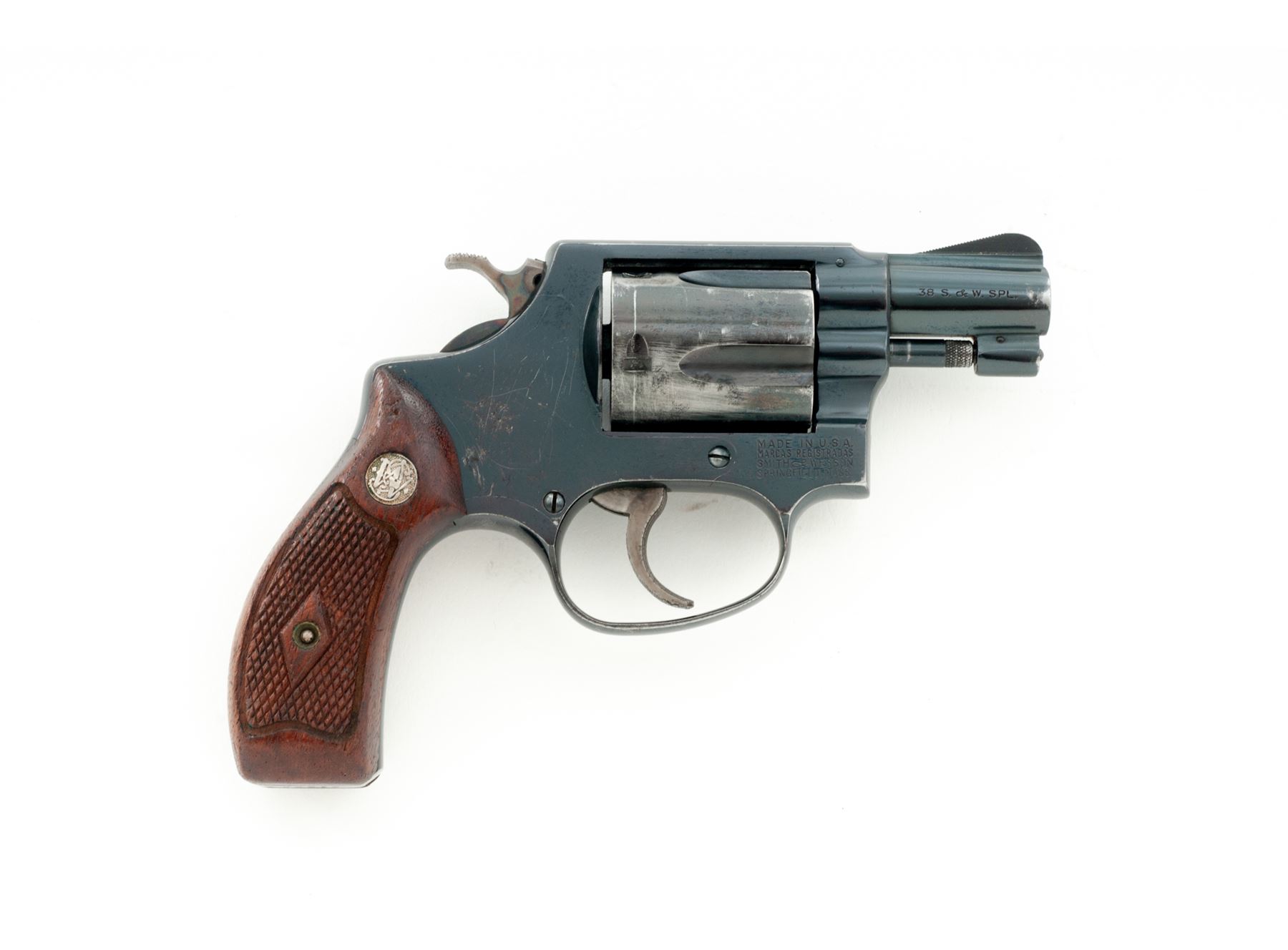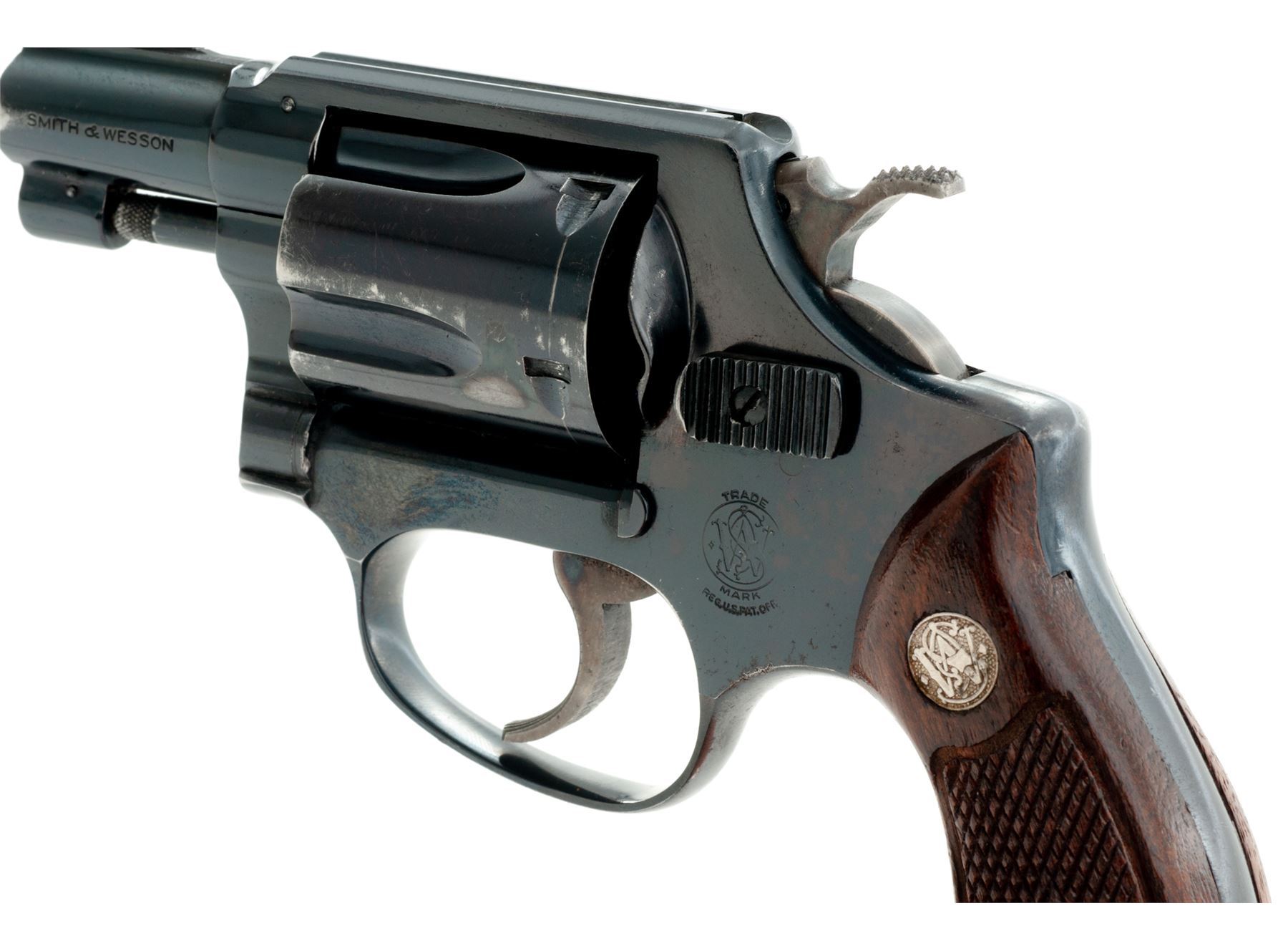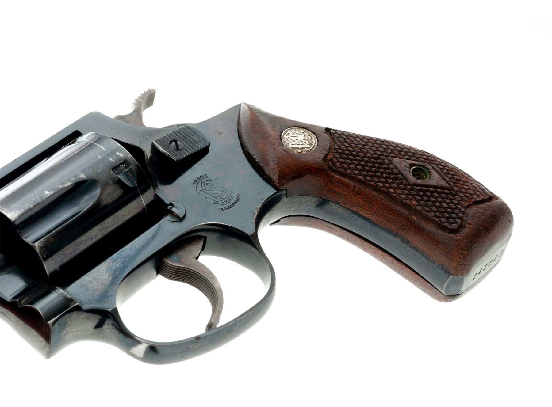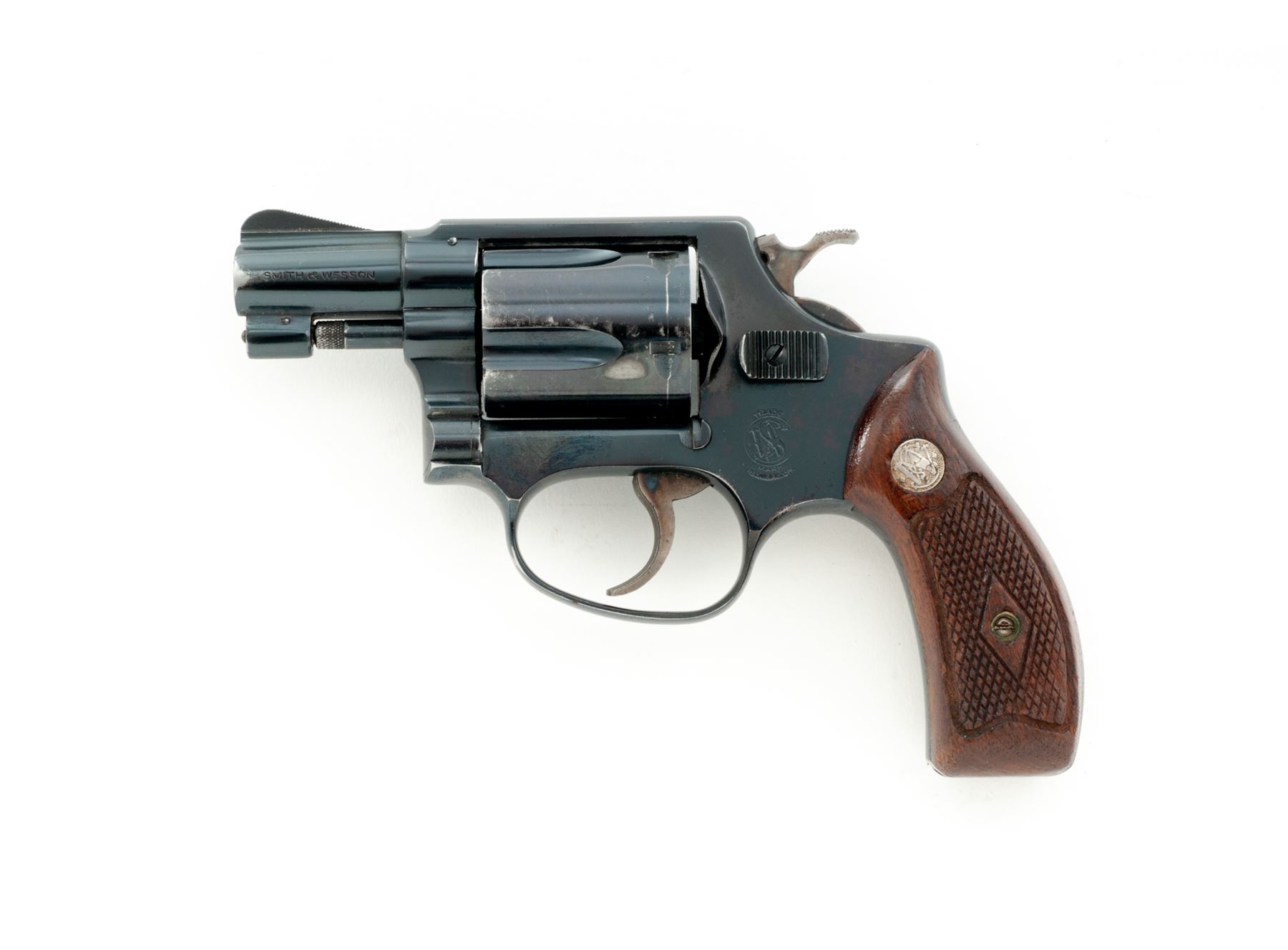 Smith & Wesson Model 36 Chief's Special Double Action Revolver, #242223, .38 Special, 3-screw frame, 1-7/8'' pinned barrel, blue finish, checkered diamond center walnut grips with silver S&W medallions, grips are numbered to another gun, standard sights, and case hardened hammer and trigger. Mfg'd circa late 50's-early 60's. Condition is good with approx. 80% remaining original blue finish. Metal with general thin scratches, majority of the finish loss is on the cylinder and muzzle. Cylinder and sideplate with some spots of very fine pitting. Flat sides of grip frame under the grips with light surface rust that should clean. Factory lettering is clear. Grips with scattered small impressions from handling, most of the finish remains. Crisp action, excellent bore. Est.: $300-$400. (C&R)