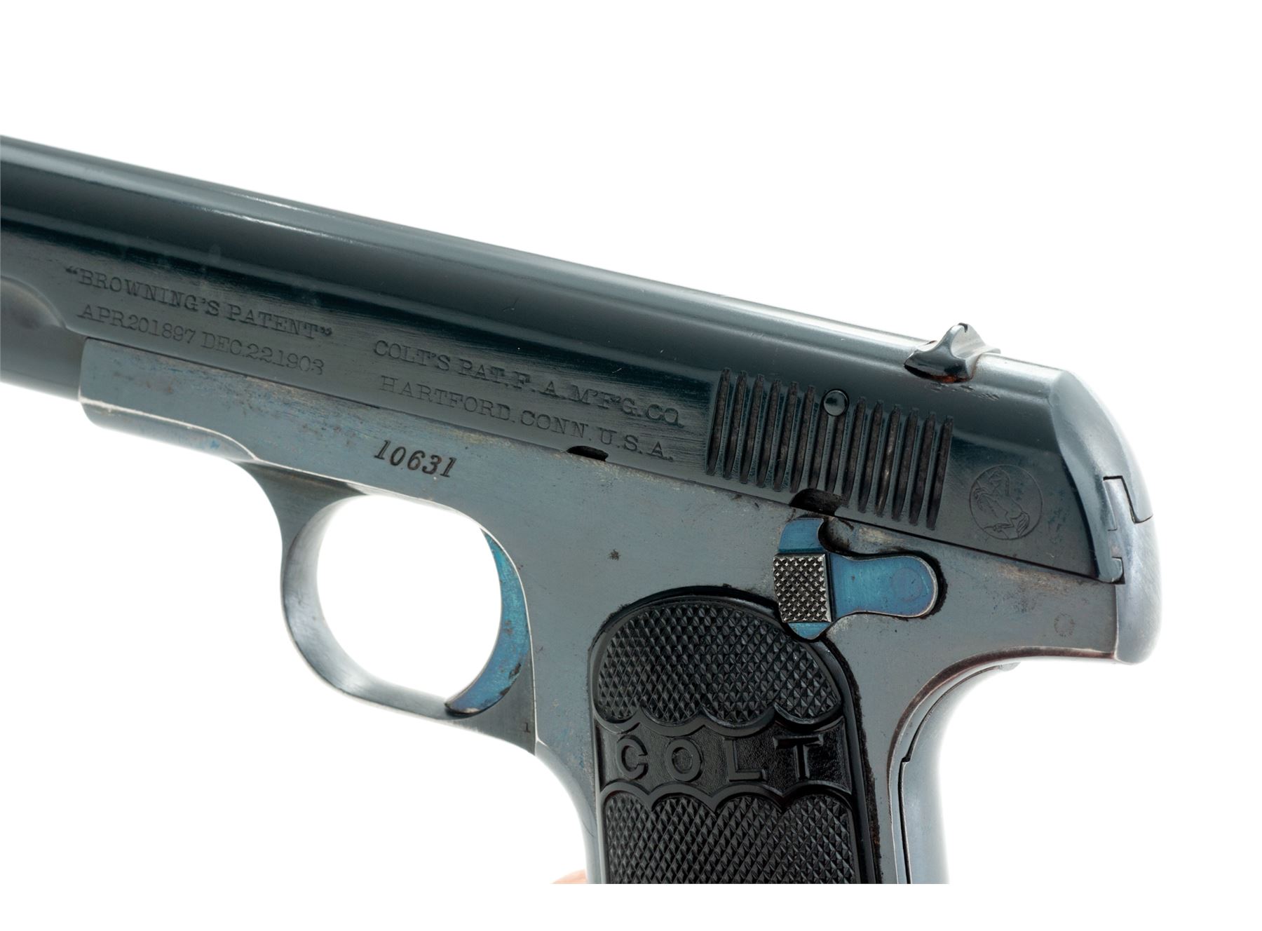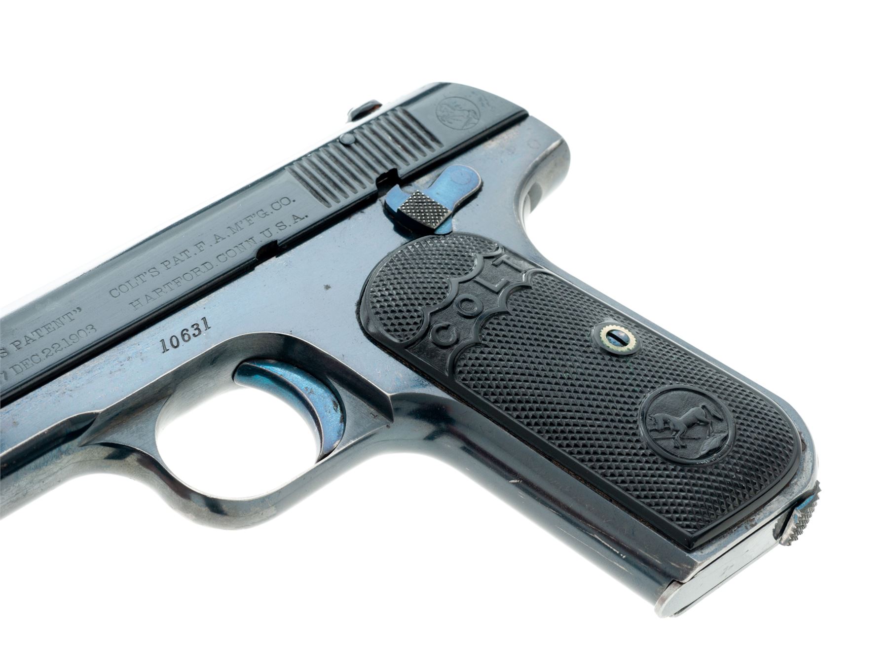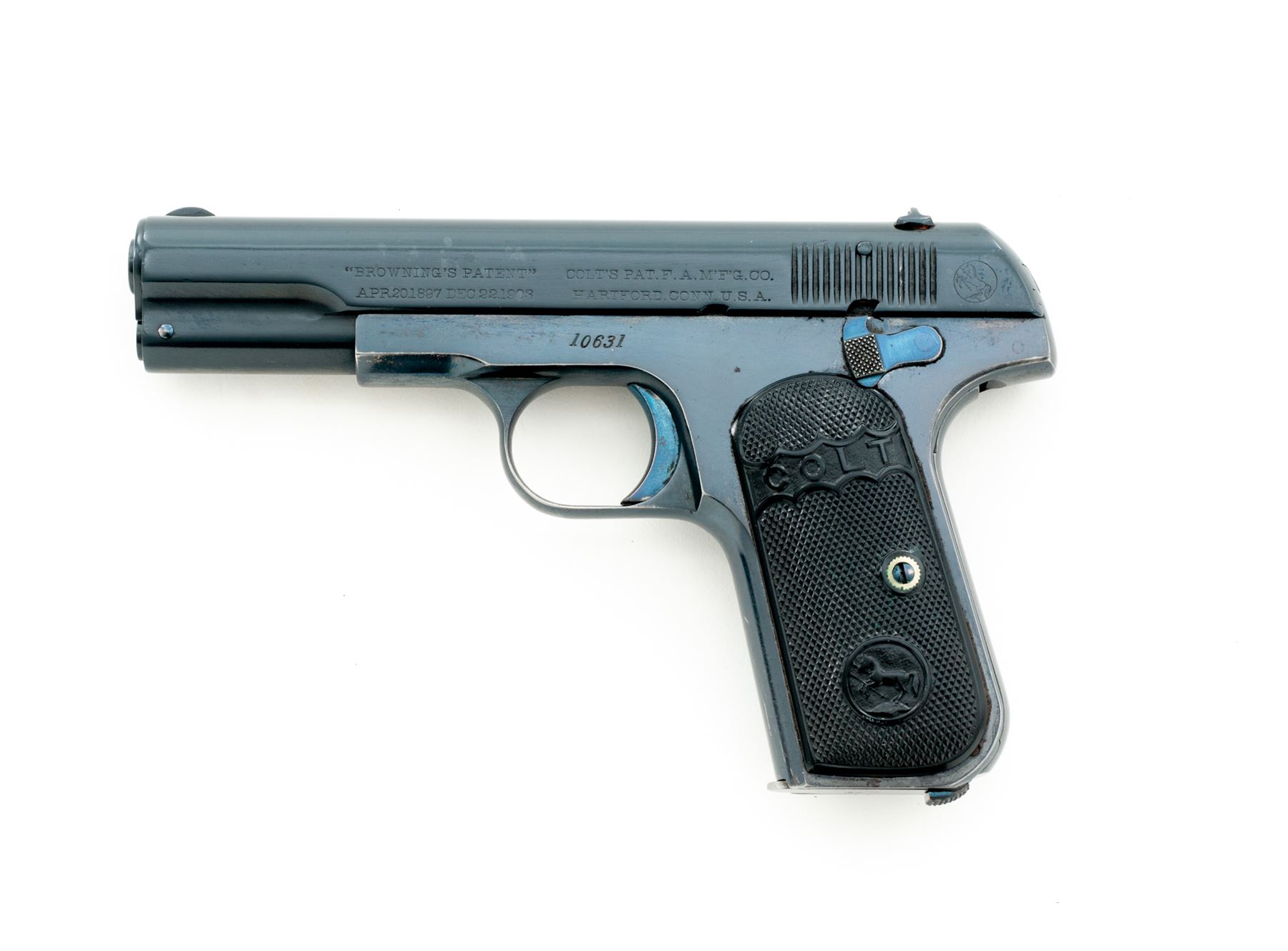 Colt Model 1903 Pocket Hammerless Semi-Automatic Pistol, #10631, .32 Auto cal., 4'' barrel, blue finish, factory checkered hard rubber grips, with early features such as checkered mag release, barrel bushing, with safety retained on right side by screw. Includes one correct unmarked blue magazine. Mfg'd 1911. Condition is very good as partially refinished. Frame and its small parts retain approx. 85% high polish blue. Slide, barrel and bushing have been later refinished and retain 94% blue. Grips with mild flattening. Good action and bore. Est.: $350-$500. (C&R/PPT)