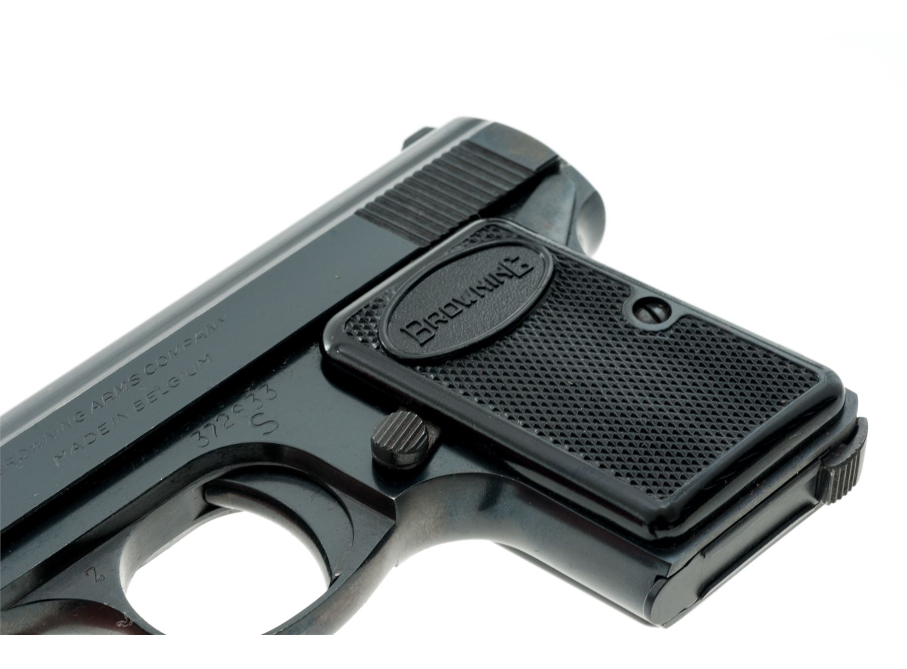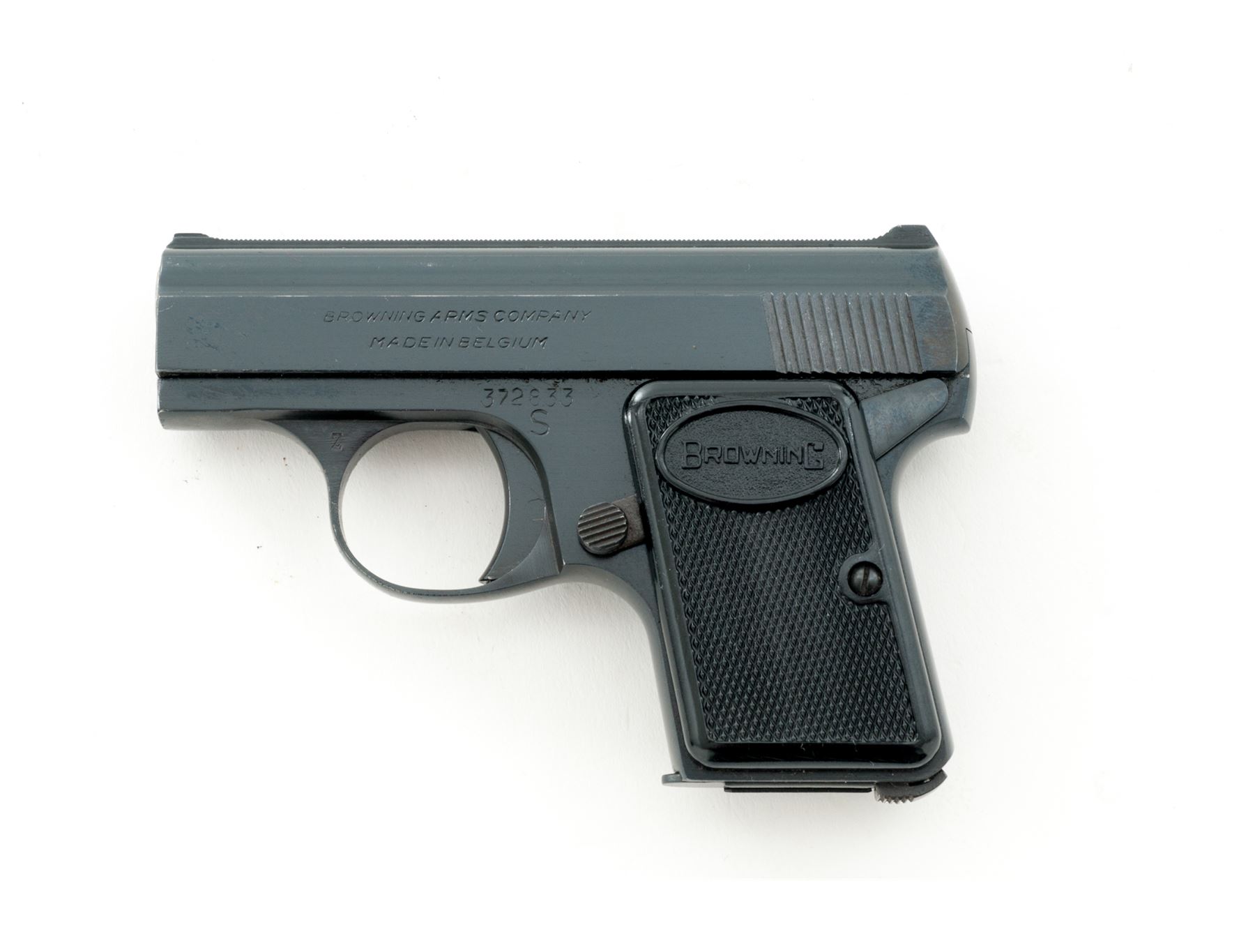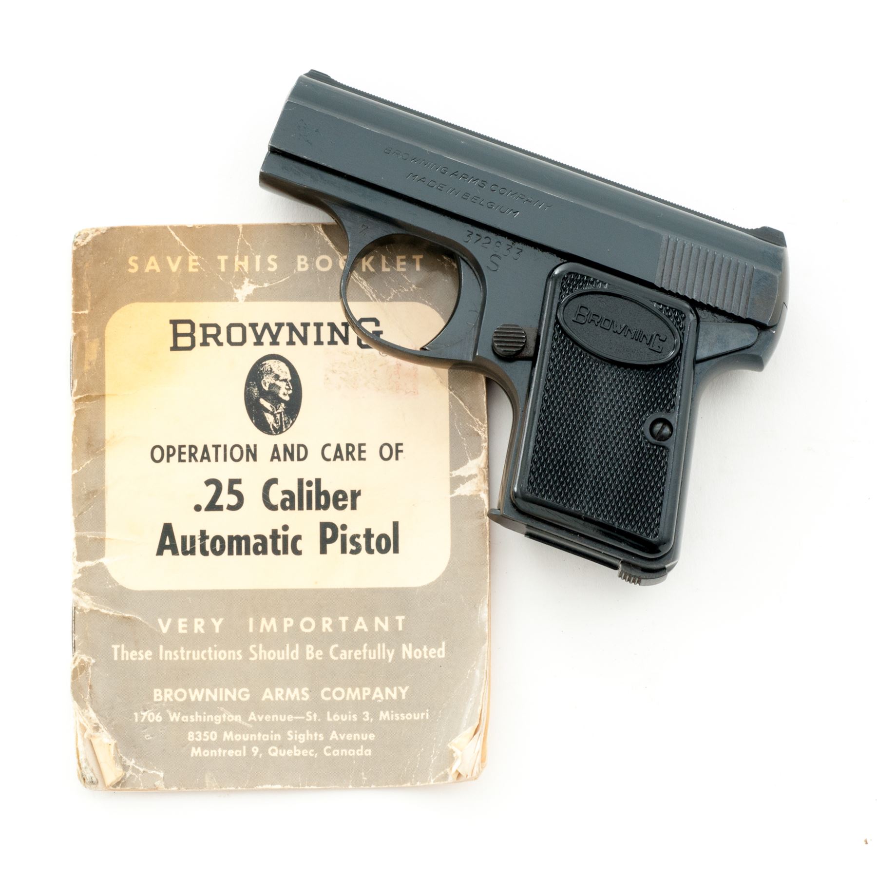 Browning ''Baby'' Semi-Automatic Pistol, #372833, .25 ACP cal., 2'' barrel, blue finish, checkered black plastic Browning grips, standard integral sights, with one ''FN'' marked magazine and vintage manual. Left side of slide is marked ''BROWNING ARMS COMPANY / MADE IN BELGIUM''. Mfg'd 1967. Metal surfaces rate as near excellent with approx. 98% original blue finish, with minor handling marks and light edgewear, most noticeable on right side of slide; factory lettering is clear. Right grip with a small chip to the edge of the Browning logo, both are in otherwise excellent condition. Action is smooth; bore is bright. Manual shows age and wear. Est.: $300-$500. (C&R)