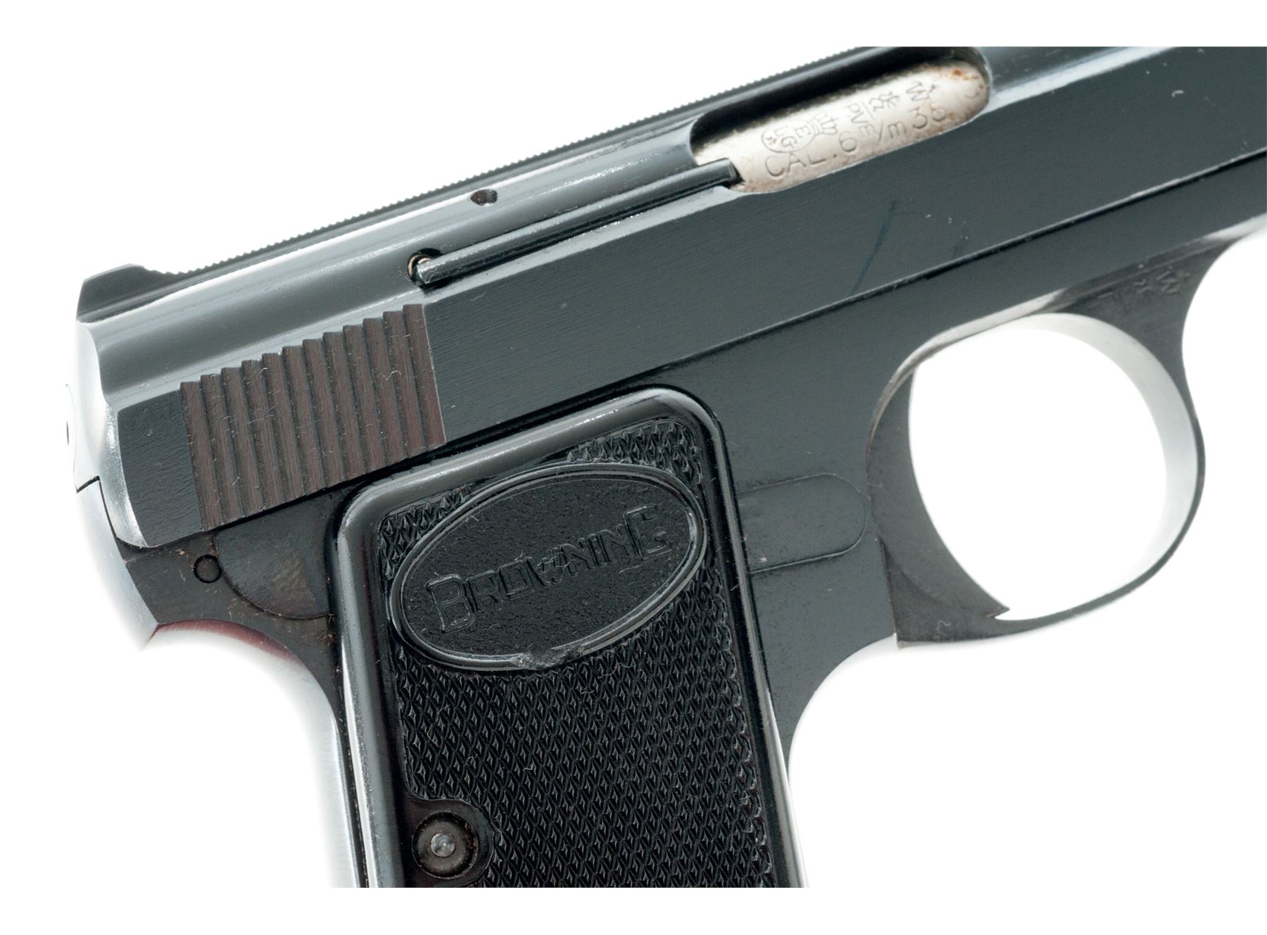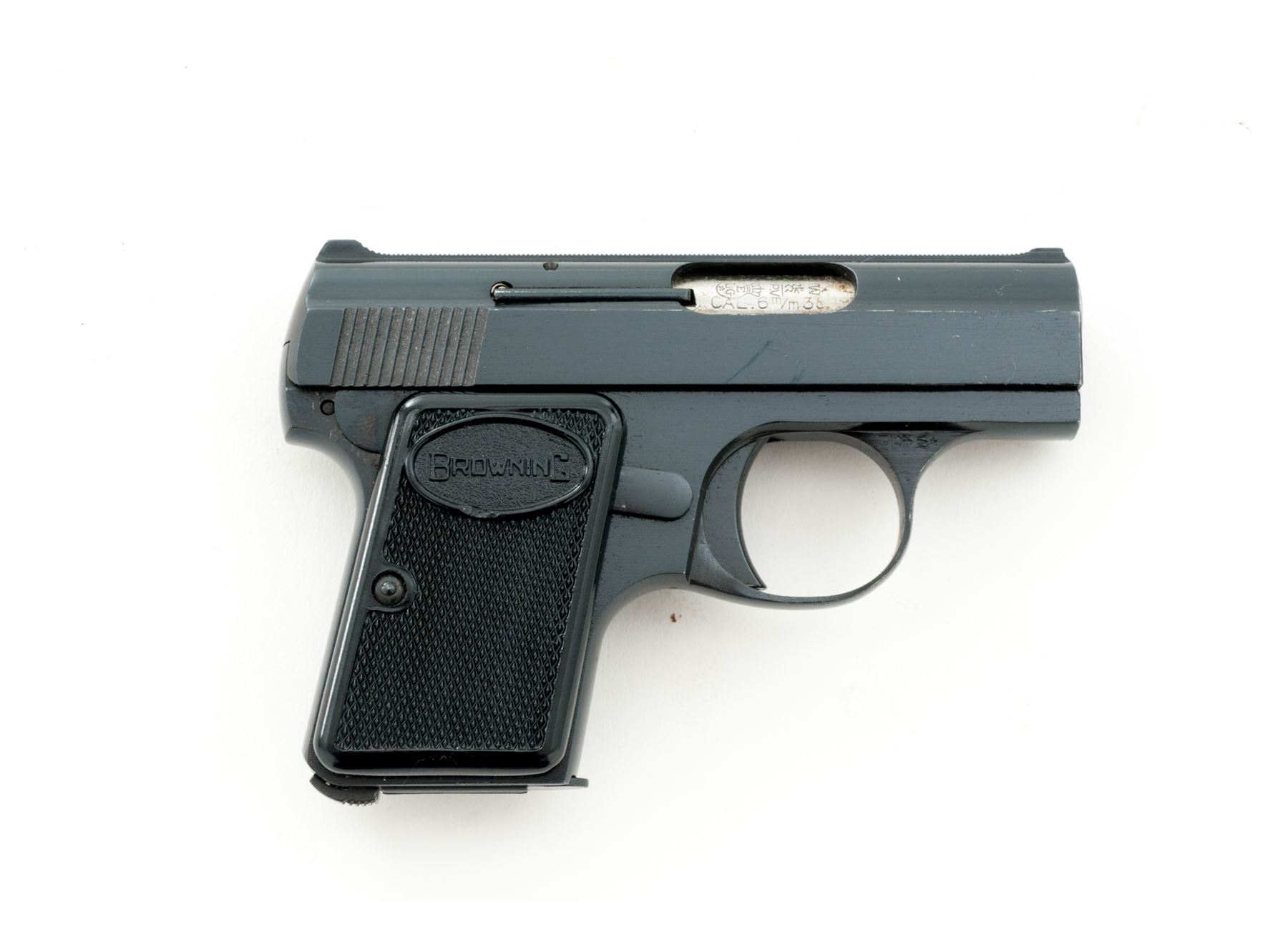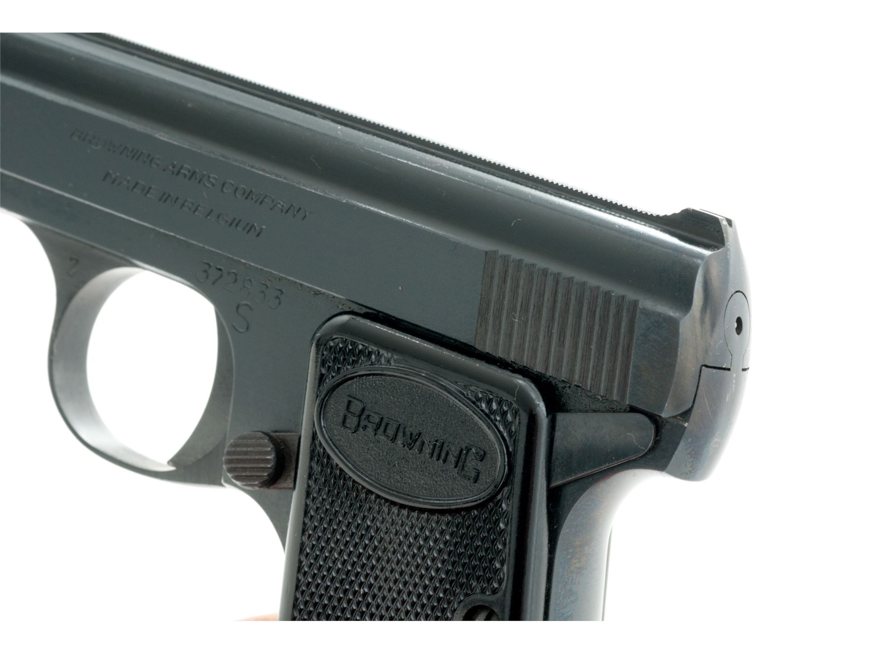 Browning ''Baby'' Semi-Automatic Pistol, #372833, .25 ACP cal., 2'' barrel, blue finish, checkered black plastic Browning grips, standard integral sights, with one ''FN'' marked magazine and vintage manual. Left side of slide is marked ''BROWNING ARMS COMPANY / MADE IN BELGIUM''. Mfg'd 1967. Metal surfaces rate as near excellent with approx. 98% original blue finish, with minor handling marks and light edgewear, most noticeable on right side of slide; factory lettering is clear. Right grip with a small chip to the edge of the Browning logo, both are in otherwise excellent condition. Action is smooth; bore is bright. Manual shows age and wear. Est.: $300-$500. (C&R)