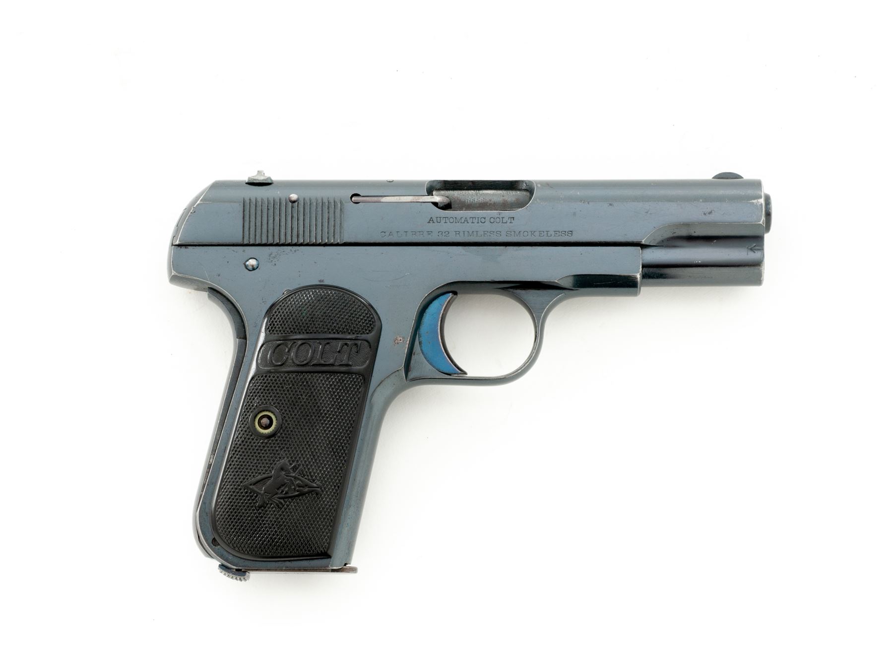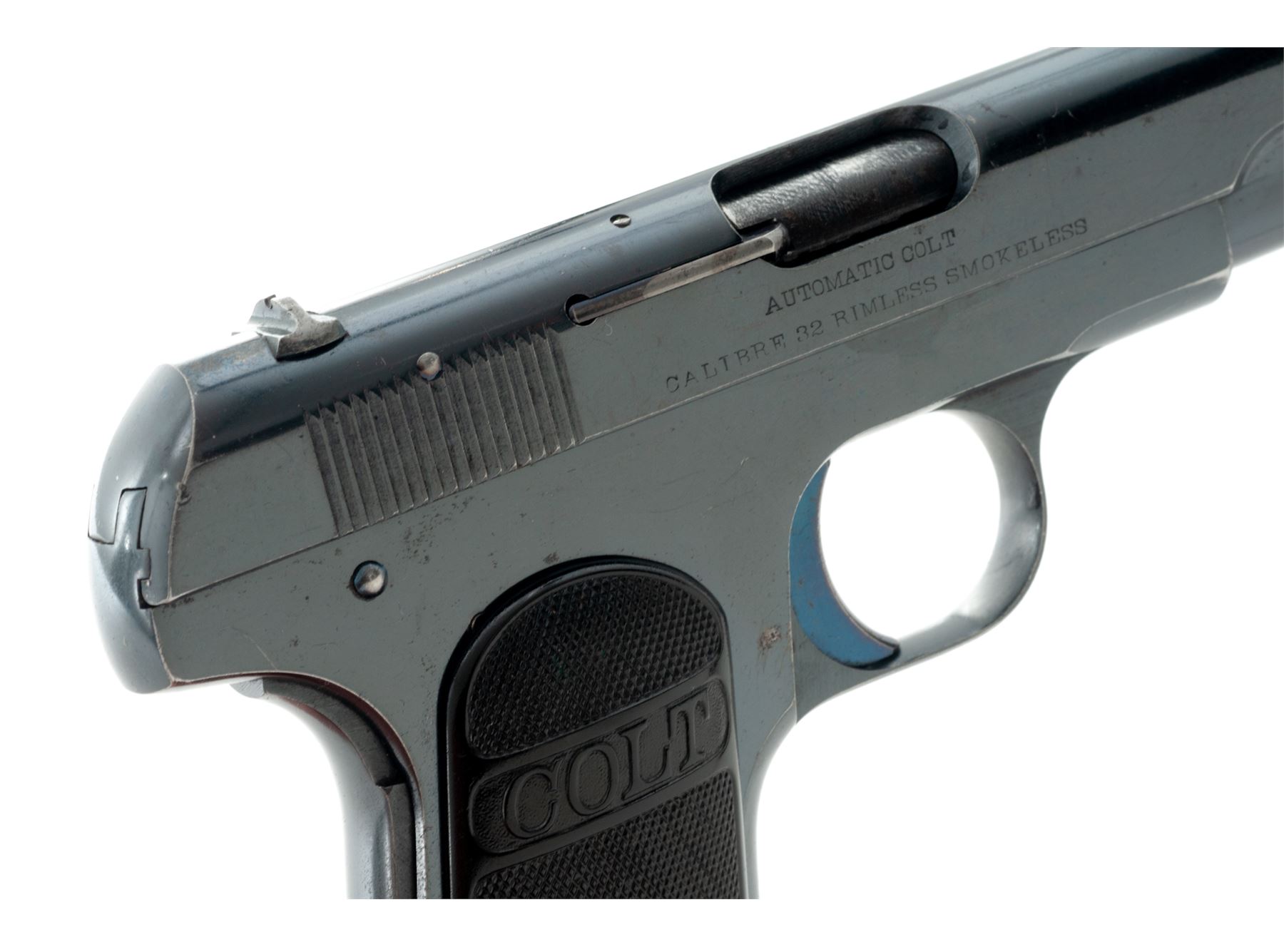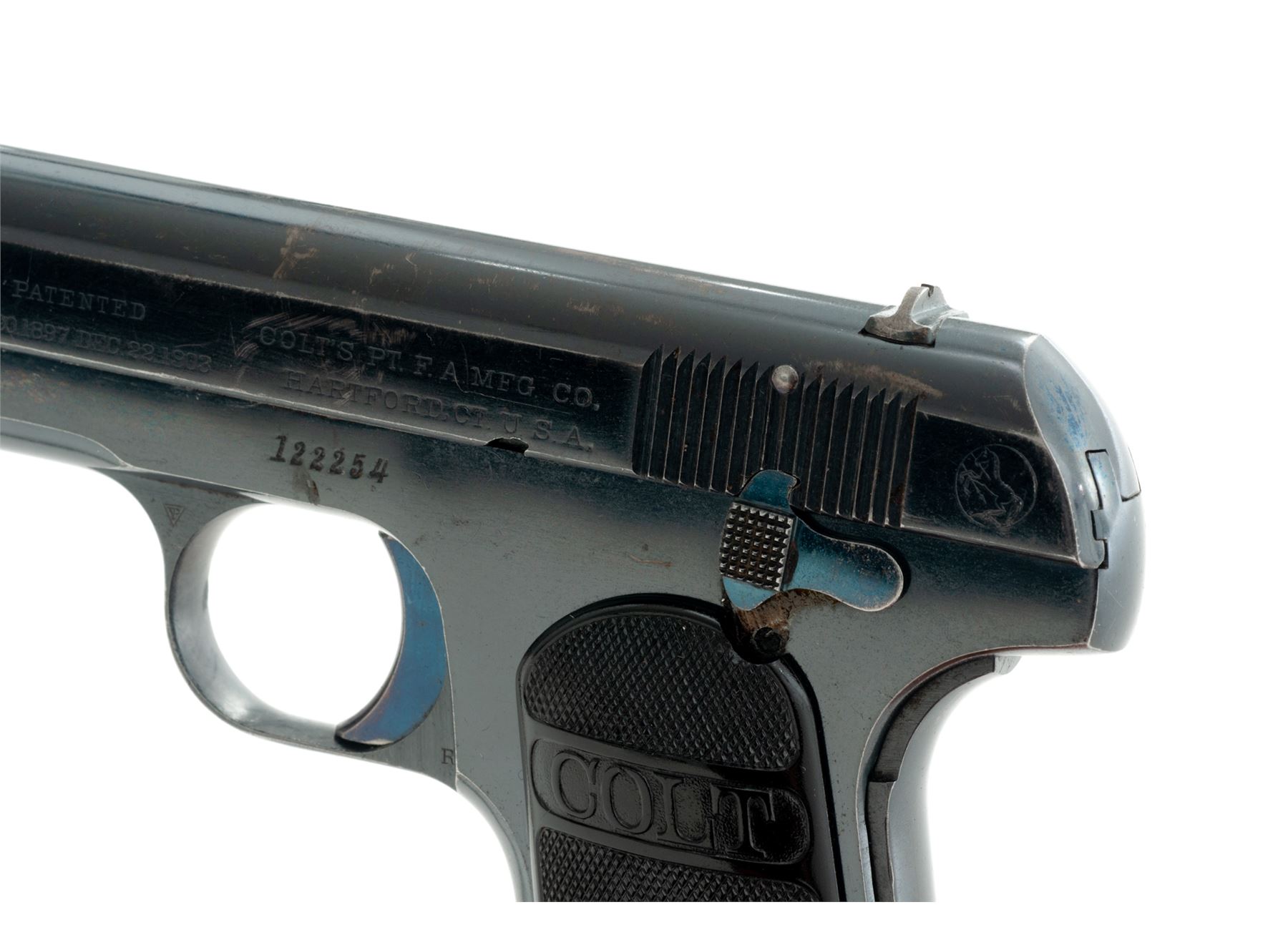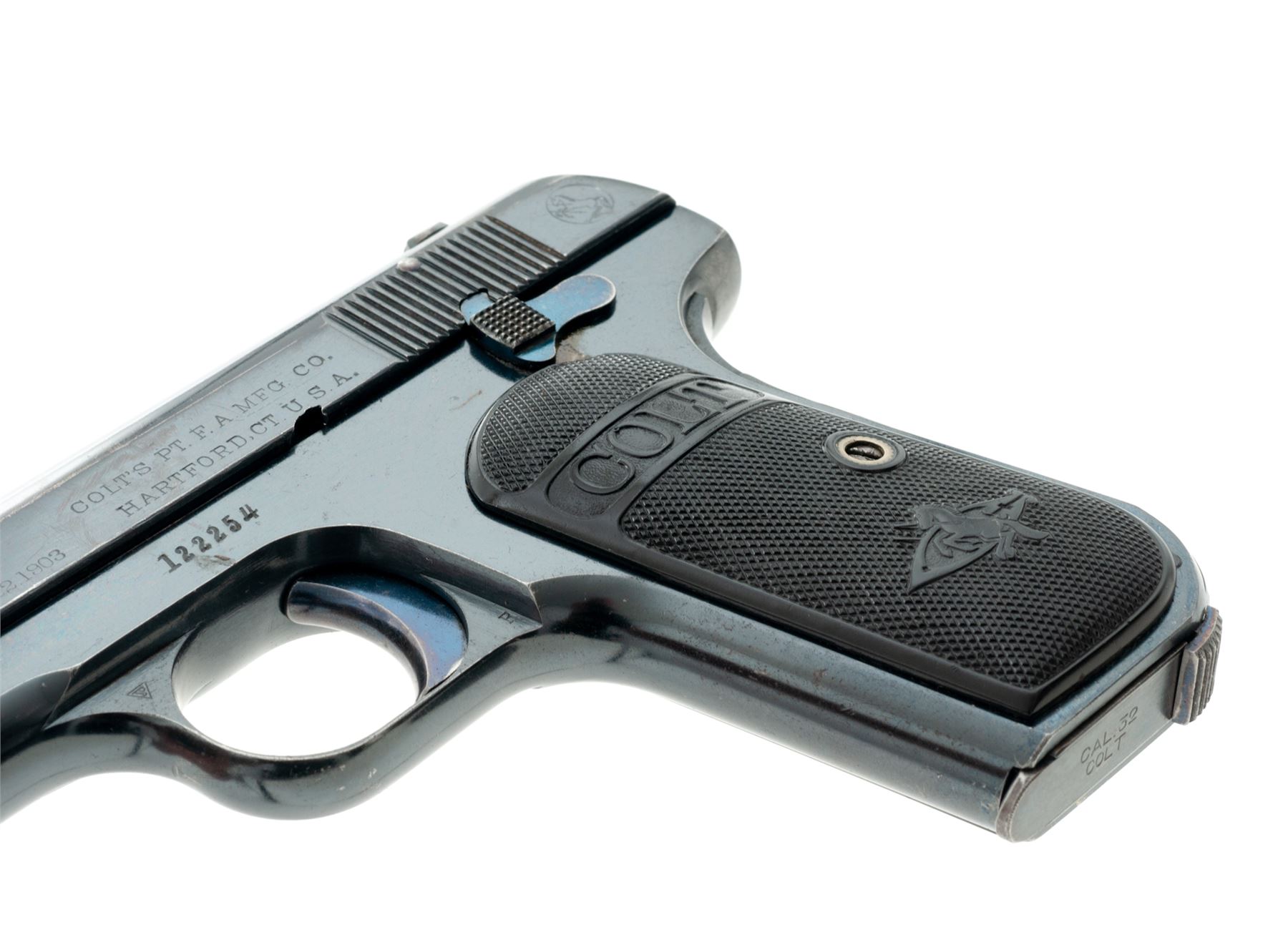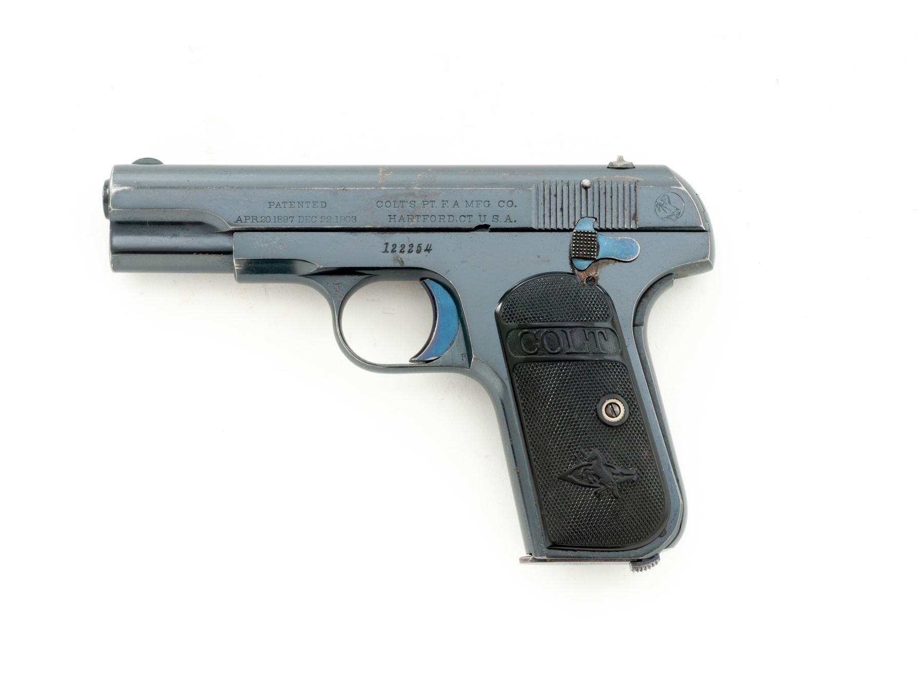 Colt Model 1903 Pocket Hammerless Semi-Automatic Pistol, #122254, .32 ACP cal., 3.75'' barrel, high polish blue finish, factory checkered hard rubber grips, with one two-tone magazine marked ''Cal.32/Colt''. Mfg'd 1911. Condition is fine retaining approx. 88%-92% early high polish blue, with most of the losses to the left and top portion of slide. Front strap and grip safety are strong showing well over 90% finish. Grips with mild flattening to details. Good action, fine bore. Est.: $450-$650. (C&R)