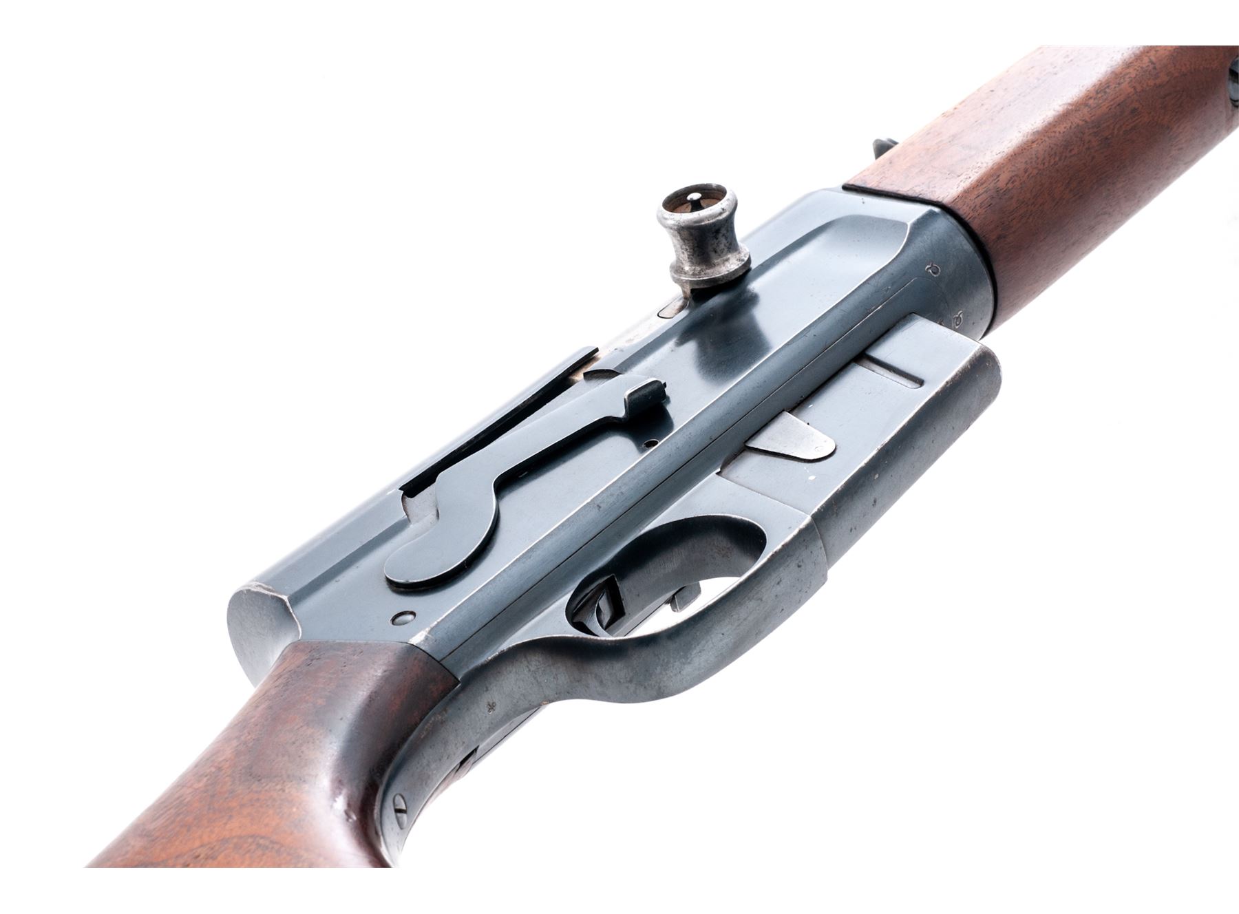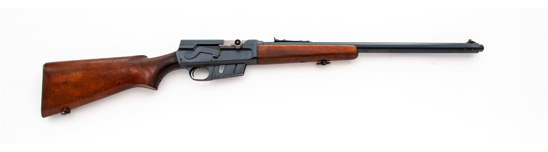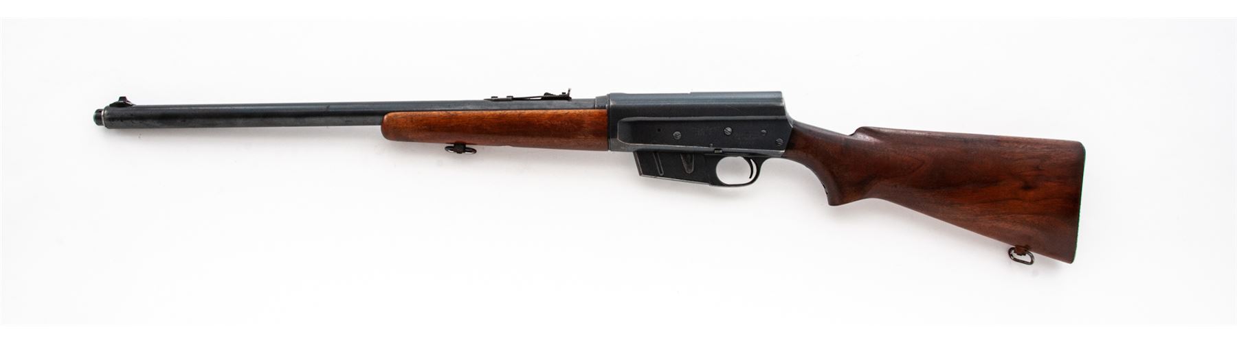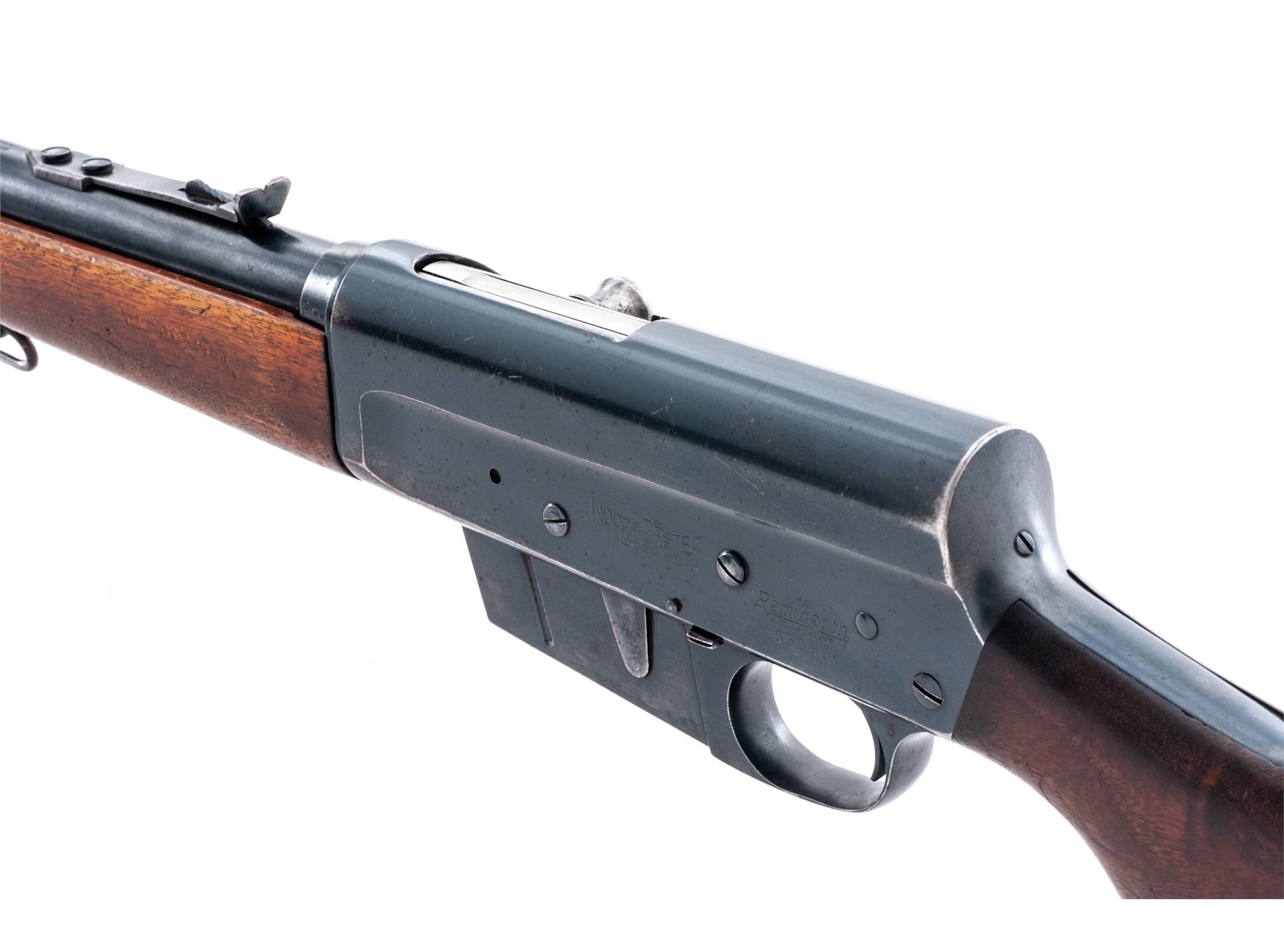 Remington Woodmaster Model 81 Semi-Automatic Rifle, #55896, .300 Sav. cal., 22'' barrel, blue finish, smooth pistol-grip walnut stock and forend, checkered aluminum buttplate, bright bead front and standard rear sight. Condition is fine retaining approx. 90%-92% lightly thinning blue. Stock retains approx. 80% original varnish, with one very small loss to left side lower tang. Quick-detached sling swivels are a later addition and show slight corrosion. Good action, bright bore. Est.: $450-$650. (C&R)