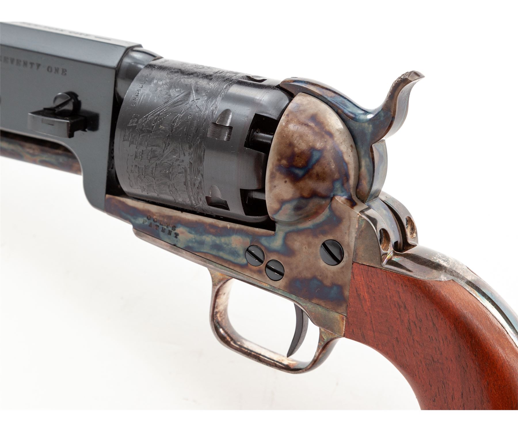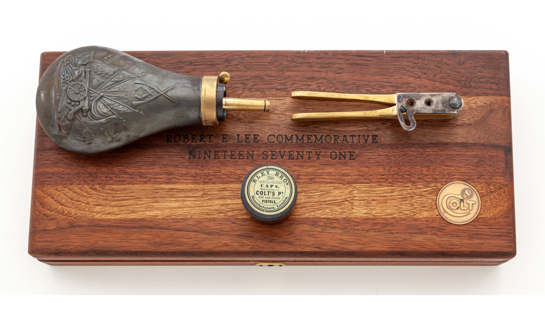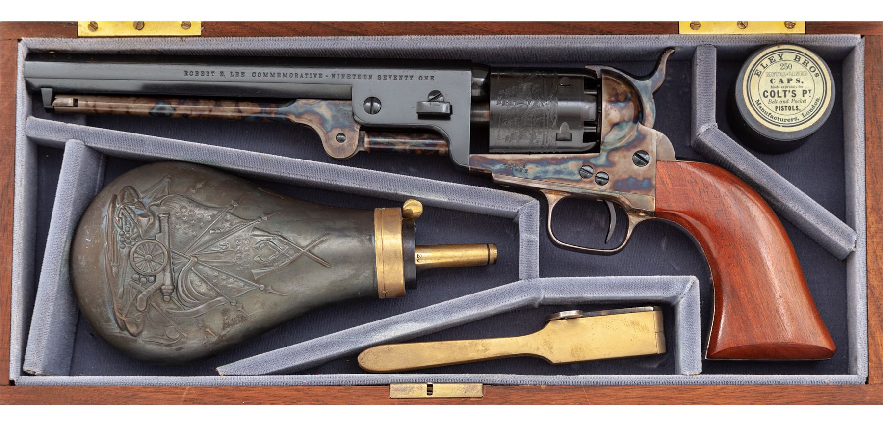 Second Generation Colt Model 1851 Navy Percussion Revolver, in original wood case complete with accessories, #3127REL, .36 cal., blued 7.5'' octagonal barrel is marked on top flat ''Address Saml Colt New-York City'' flanked by dashes, and ''Robert E. Lee Commemorative - Nineteen Seventy One'' on left flat; blued round 6-shot cylinder is roll-engraved with the standard naval battle scene, case hardened hammer, lever and plunger; silver-plated brass backstrap and rounded triggerguard; one-piece varnished walnut grips. Condition is mint and unfired, retaining 100% original blued finish, brilliant case colors, silver with a soft patina, and perfect grips with all of their original vanish finish. Action is crisp; bore shows brilliant blue with deep rifling. Mahogany case retains its soft oil-stained finish (a few dings along back side) with a brass ''Colt'' logo medallion inlay, and is marked on top lid ''Robert E. Lee Commemorative/Nineteen Seventy One''. Now almost a half-century old, these first Colt commemoratives are scarce; in this pristine state, they are almost impossible to find. Est.: $400-$600. (No FFL Required)