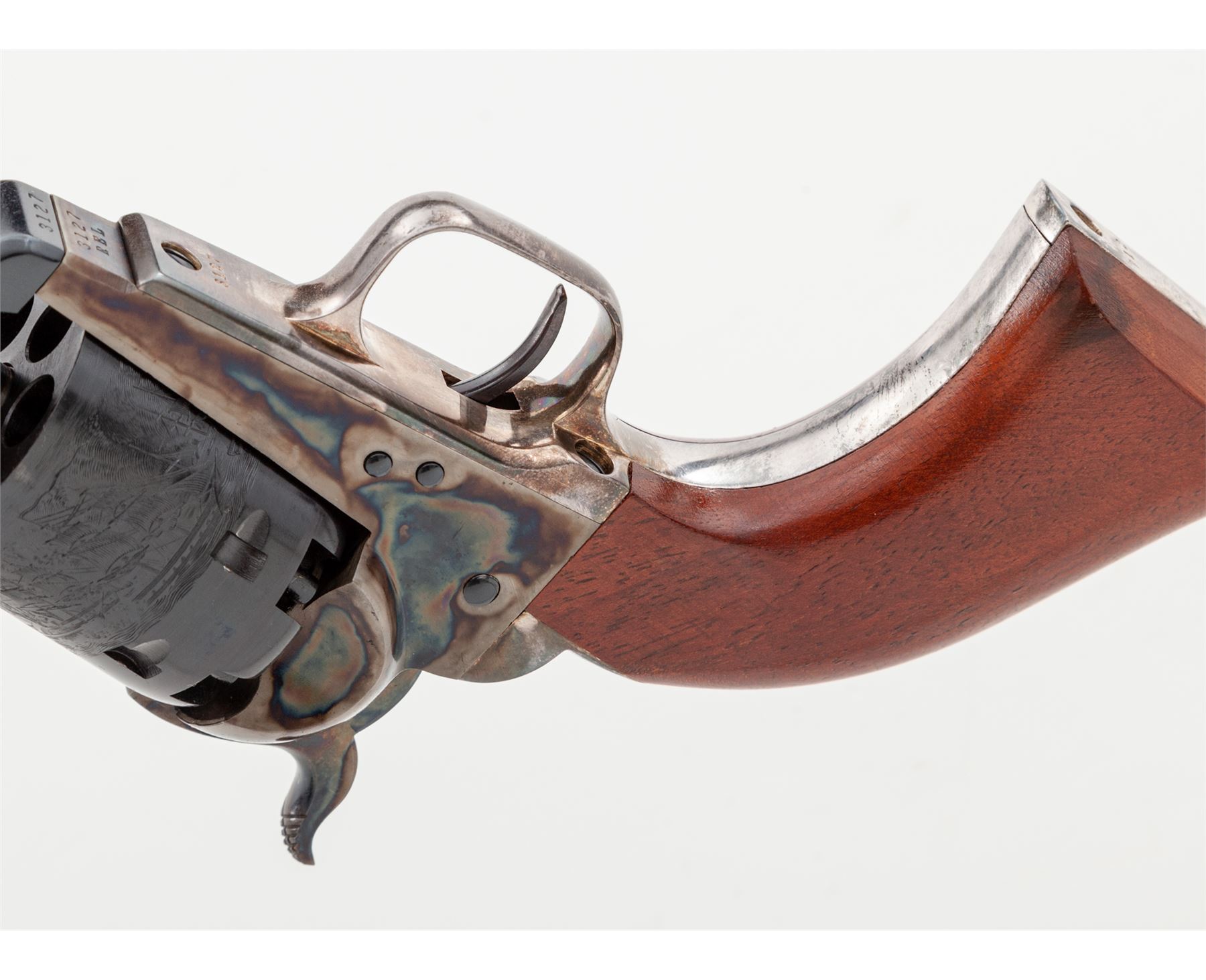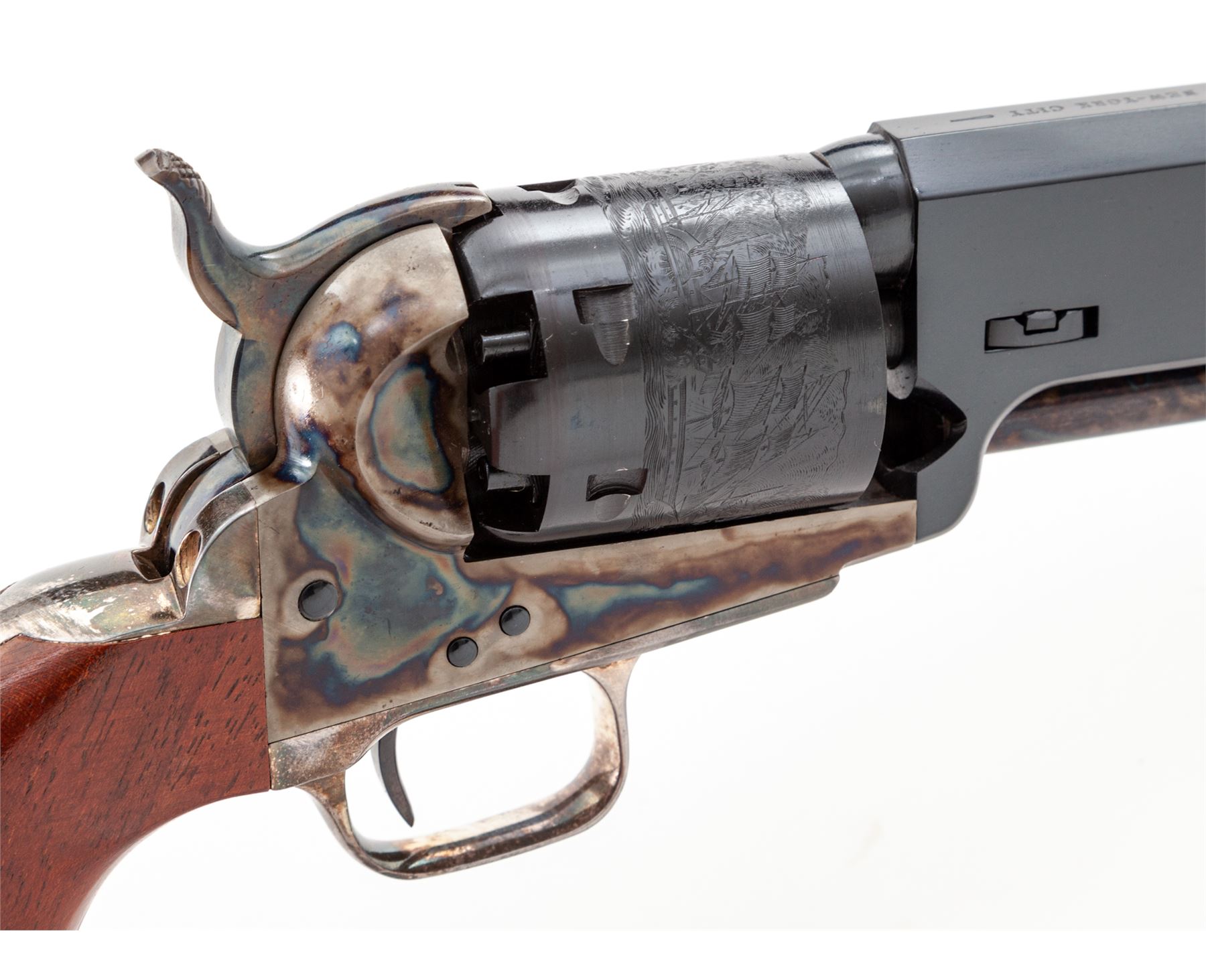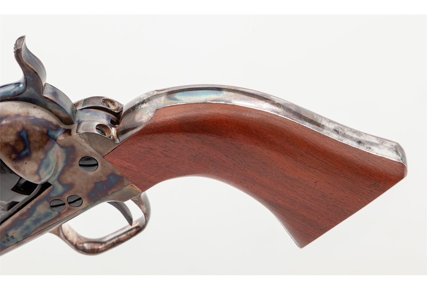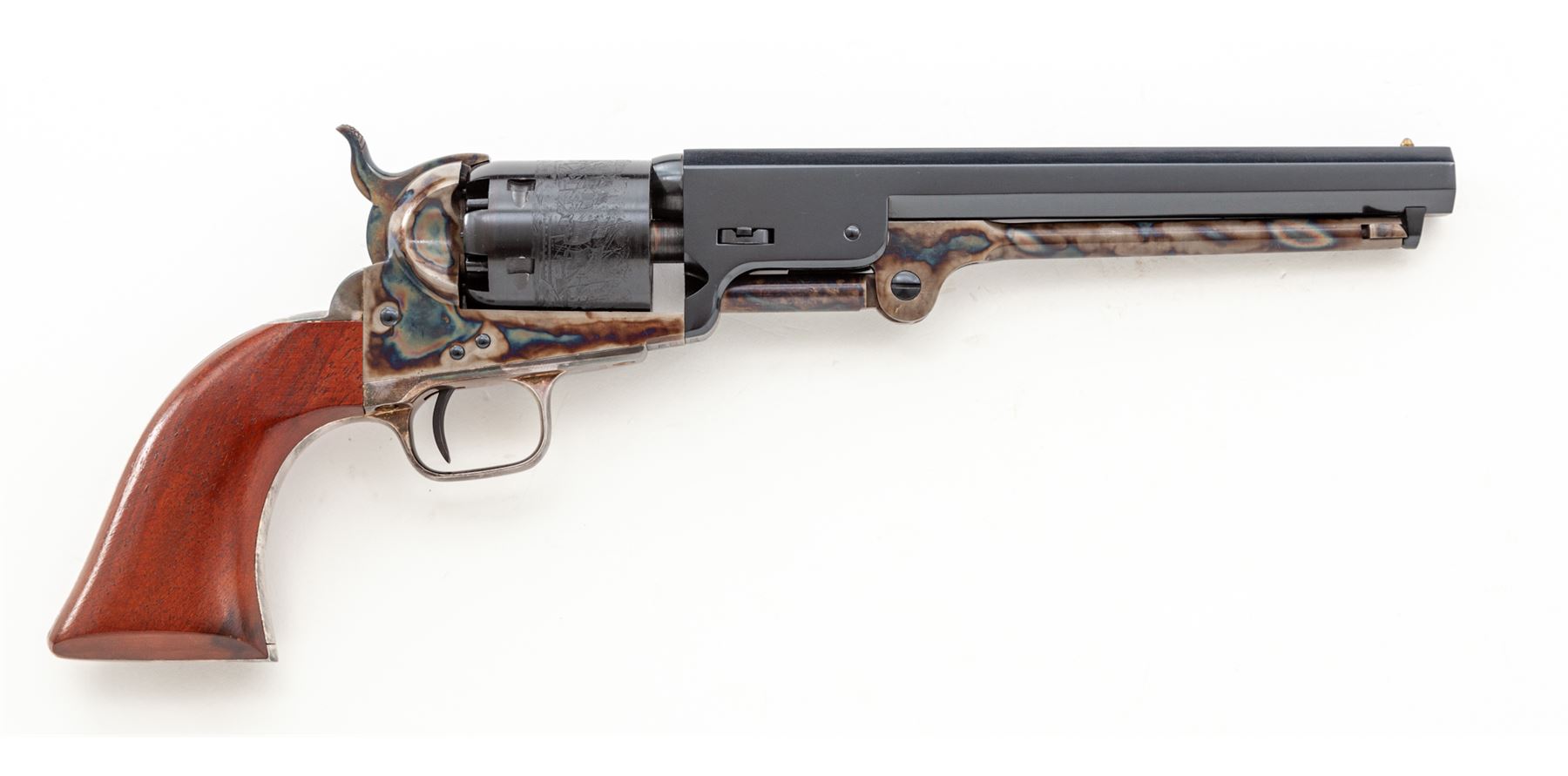 Second Generation Colt Model 1851 Navy Percussion Revolver, in original wood case complete with accessories, #3127REL, .36 cal., blued 7.5'' octagonal barrel is marked on top flat ''Address Saml Colt New-York City'' flanked by dashes, and ''Robert E. Lee Commemorative - Nineteen Seventy One'' on left flat; blued round 6-shot cylinder is roll-engraved with the standard naval battle scene, case hardened hammer, lever and plunger; silver-plated brass backstrap and rounded triggerguard; one-piece varnished walnut grips. Condition is mint and unfired, retaining 100% original blued finish, brilliant case colors, silver with a soft patina, and perfect grips with all of their original vanish finish. Action is crisp; bore shows brilliant blue with deep rifling. Mahogany case retains its soft oil-stained finish (a few dings along back side) with a brass ''Colt'' logo medallion inlay, and is marked on top lid ''Robert E. Lee Commemorative/Nineteen Seventy One''. Now almost a half-century old, these first Colt commemoratives are scarce; in this pristine state, they are almost impossible to find. Est.: $400-$600. (No FFL Required)