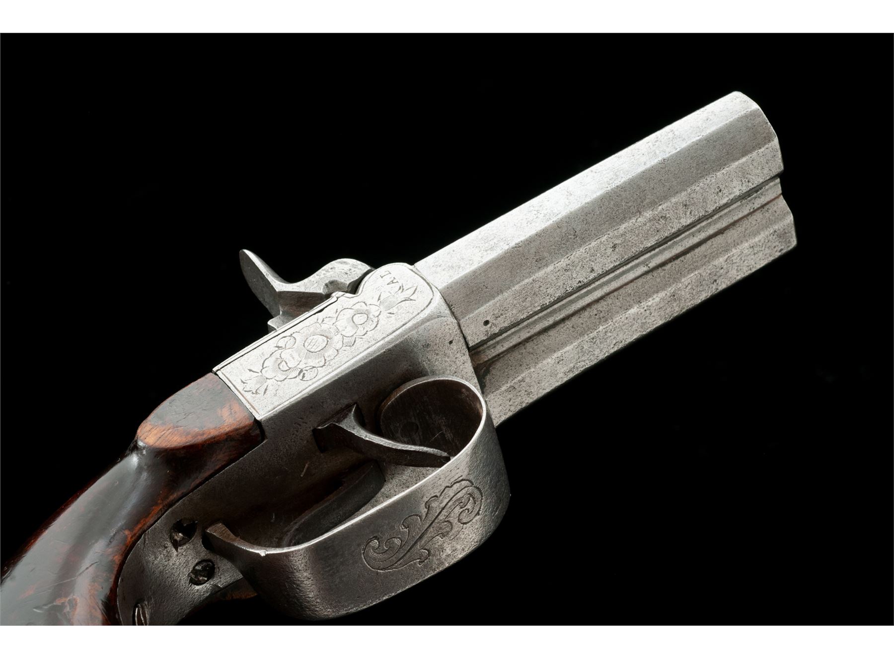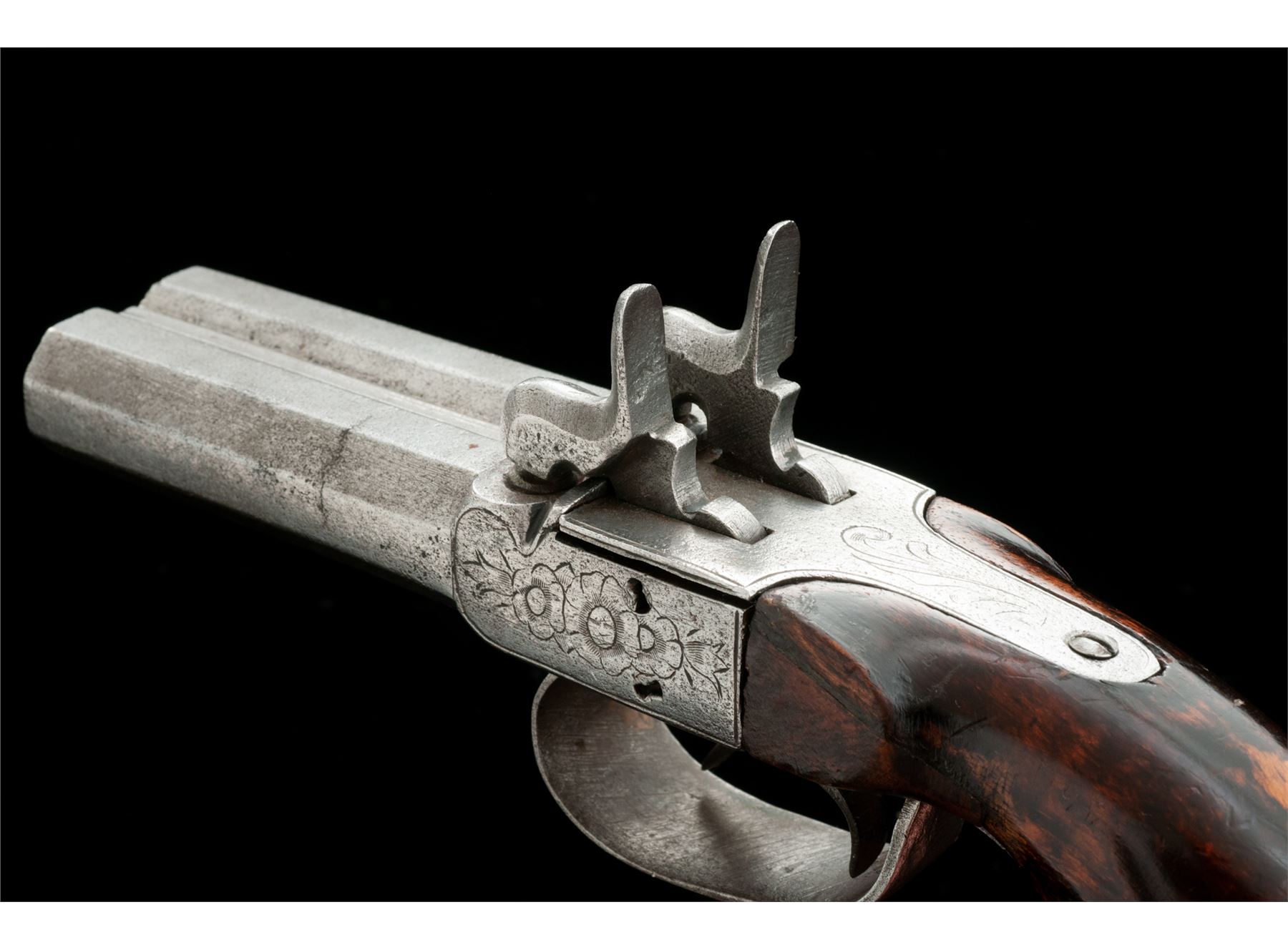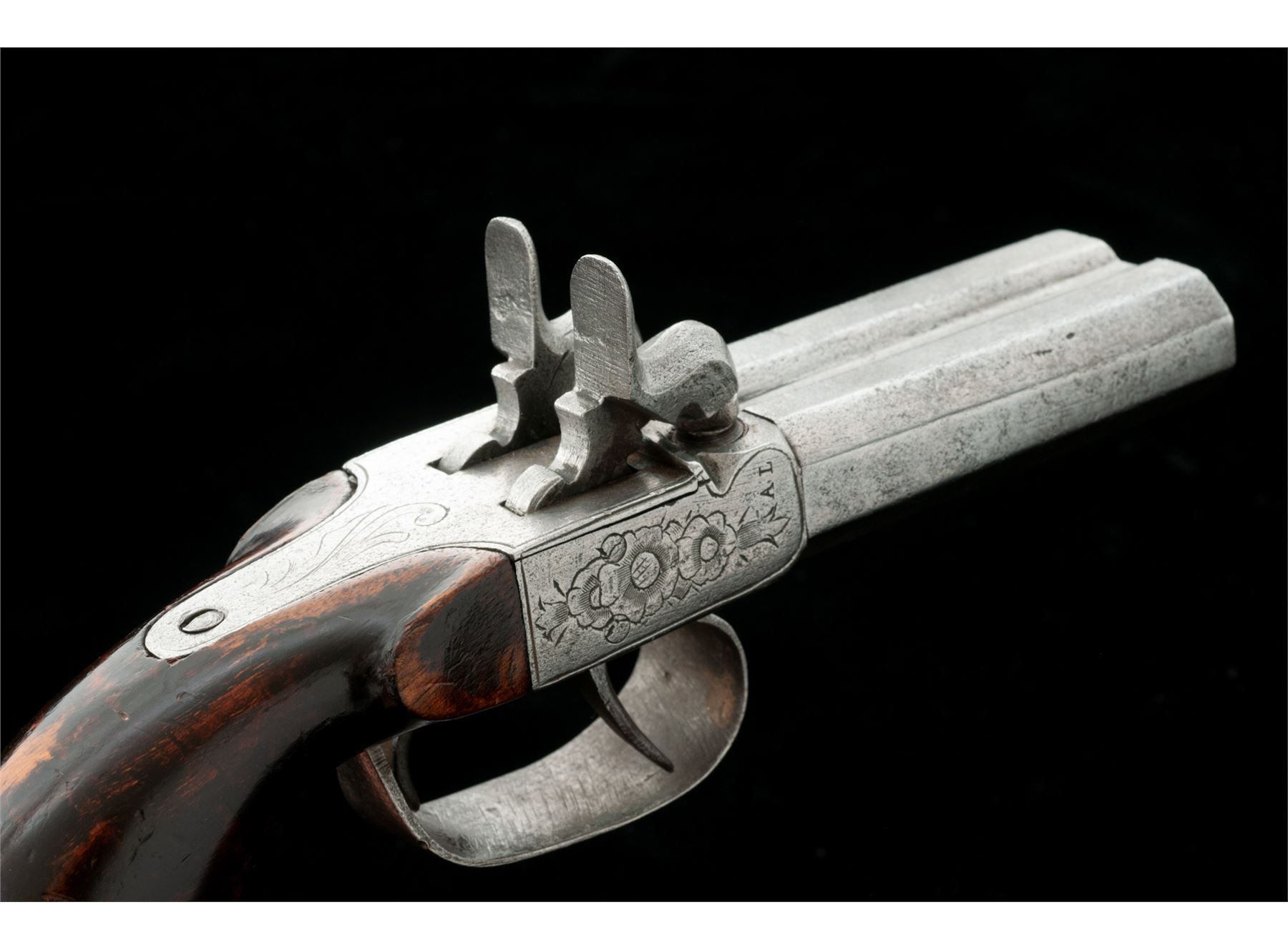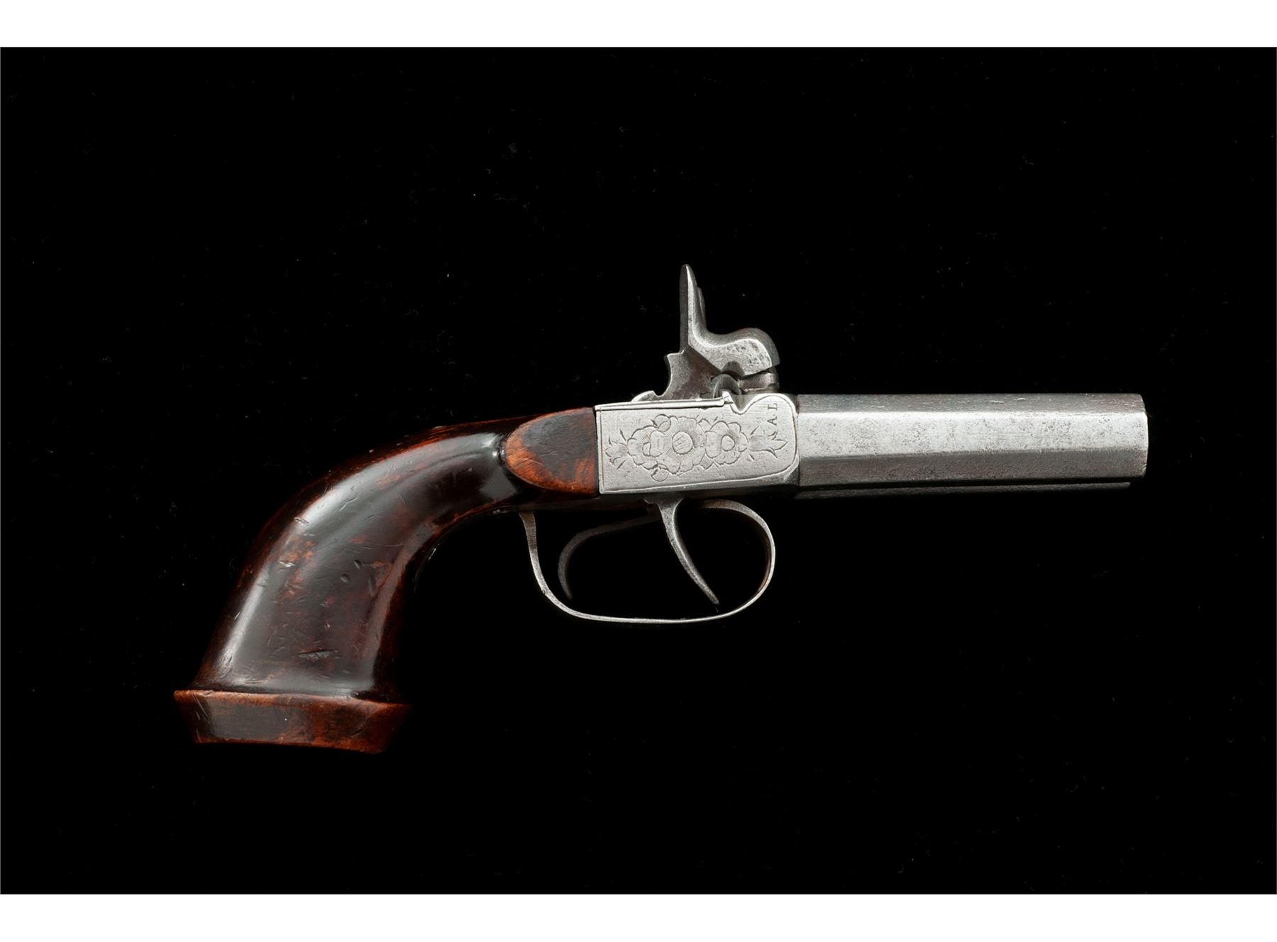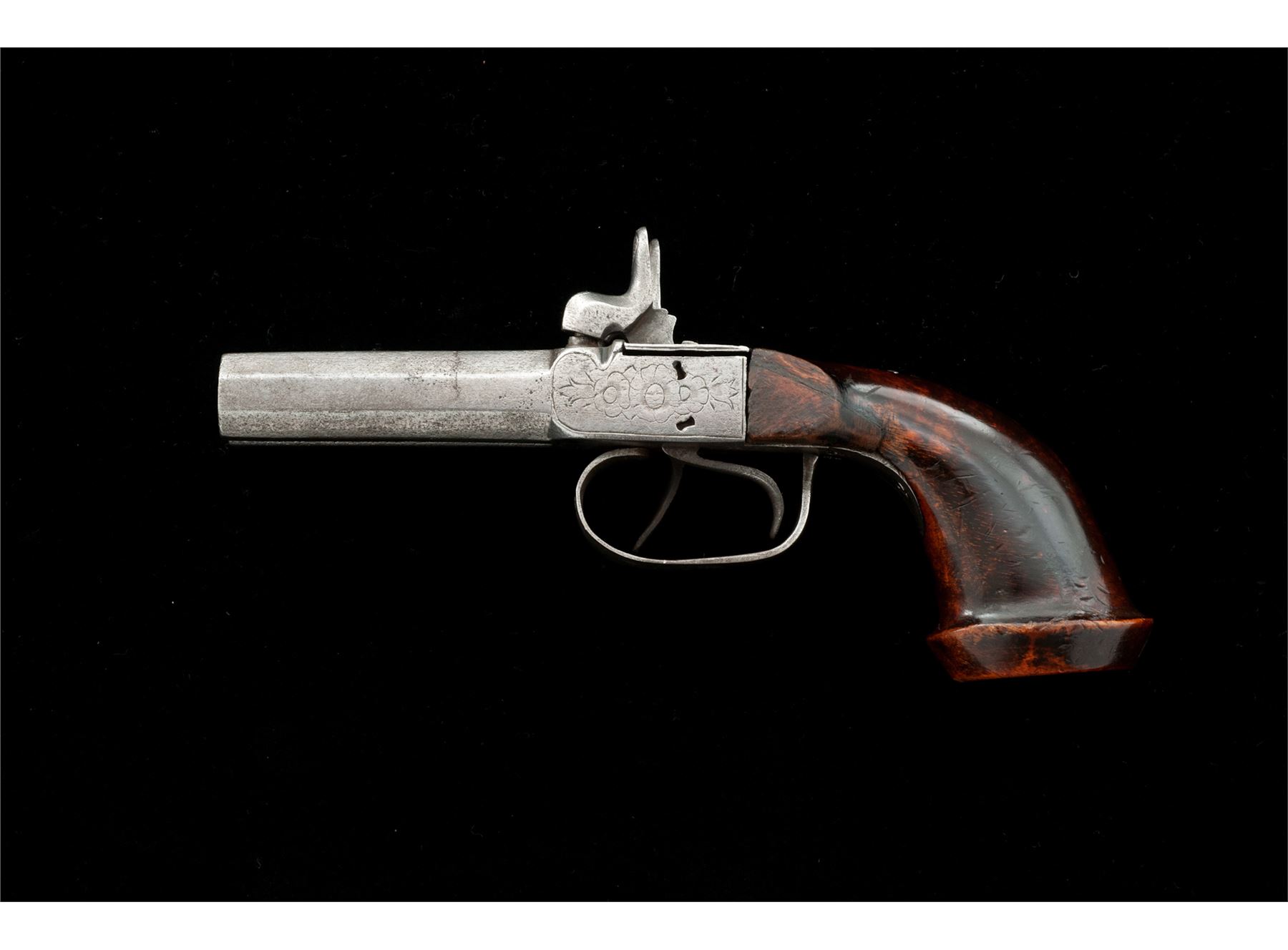 Antique European Double Barrel Boxlock Percussion Pistol, NVSN, approx. .48 cal., 2.75'' octagonal barrel group, steel frame with simple floral engraving on sides and rear tang, floral engraved triggerguard loop, twin hammers, one-piece hardwood stock having a raised oval butt. Pistol is completely unmarked as to maker and bears no identifying proofmarks. Condition is good+ showing no original metal finish, having been cleaned bright over very light pitting. Stock shows a crack at left wrist but is sound and retains most original reddish varnish finish. Action is stout and functions as designed; smoothbores appear clean. Est.: $250-$350. (Antique)