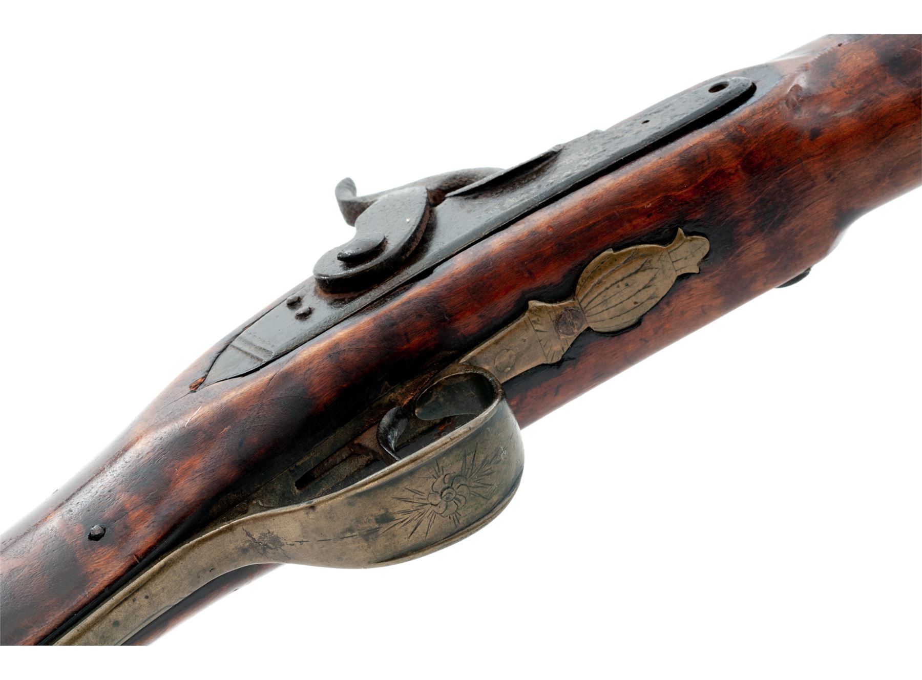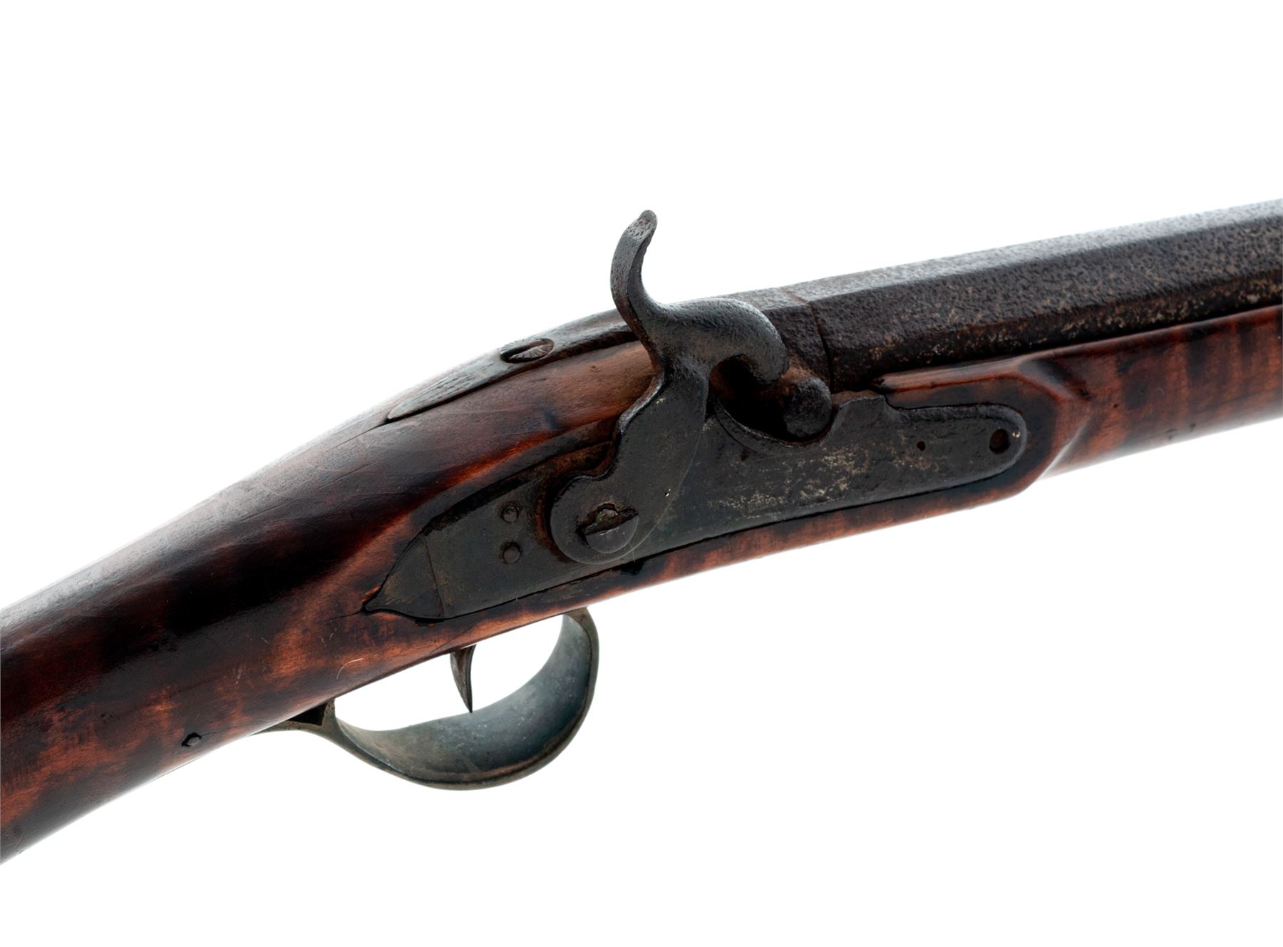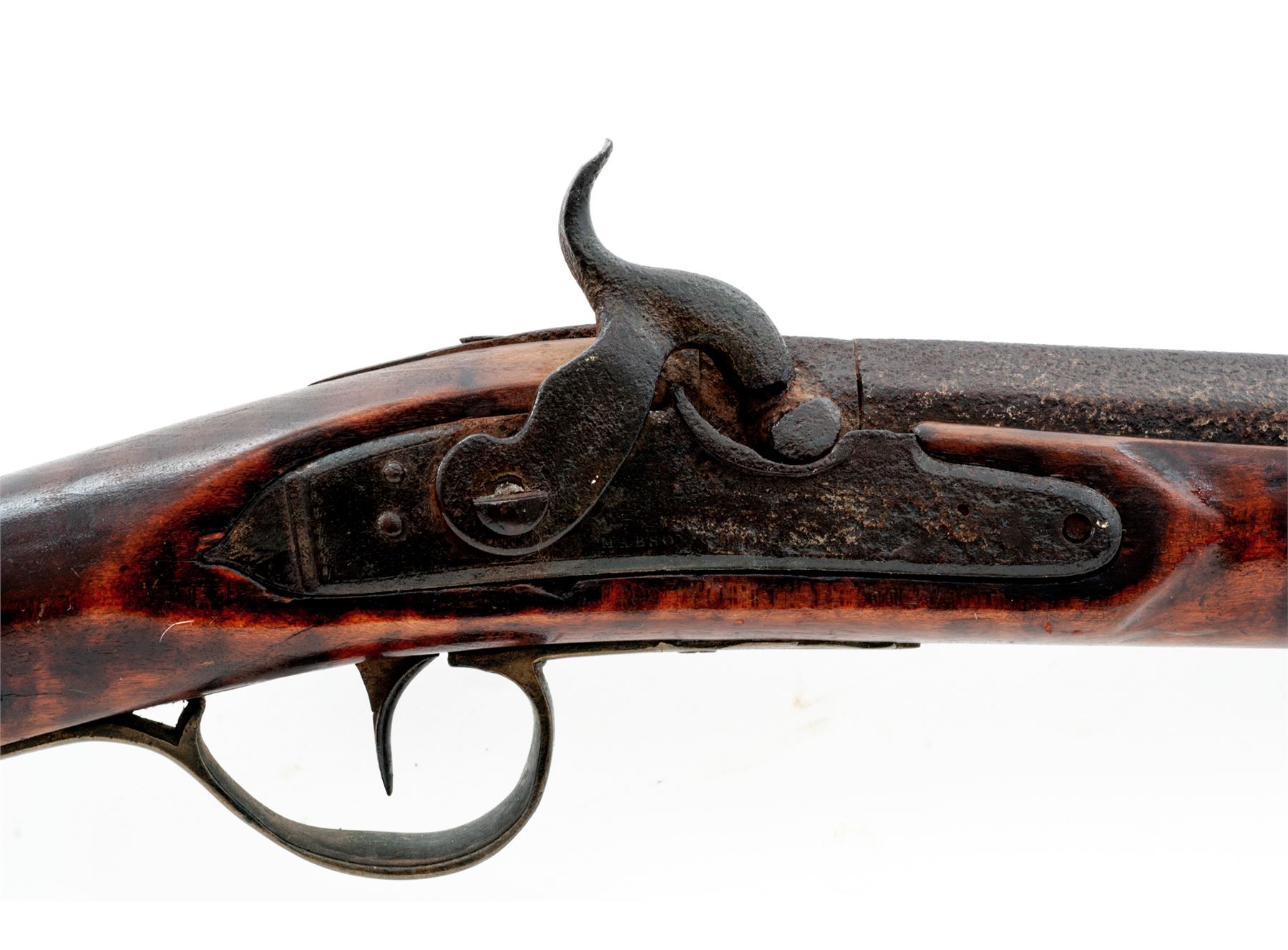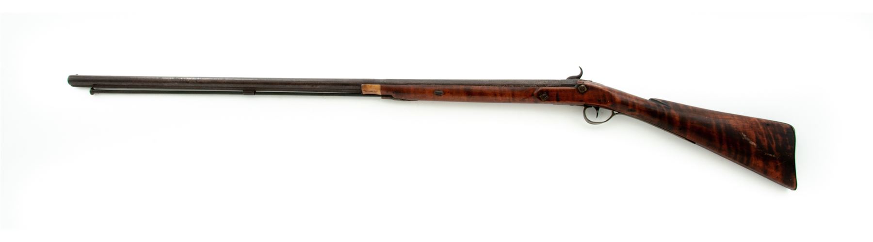 Antique American Halfstock Percussion Fowler, NVSN, 12 ga., 37'' part octagonal-part round barrel mounted with a tiny German silver post front and no rear sight; beveled iron lockplate with long rear teat is marked ''Mabson'' (the rest illegible but likely imported from Mabson & Lebron of Birmingham, England); brass furniture including diamond-shaped lock bolt escutcheons on left side, engraved triggerguard with fancy pineapple front and long rear tang, buttplate, three under-barrel ramrod ferrules (top 2 are iron), nosecap, and single barrel wedge escutcheon; artificially striped varnished walnut stock with carving where comb meets wrist; button-tip steel ramrod. Mfg'd 1850s-60s. Condition is good, the barrel showing a deep dark-brown aged patina with heavy pitting at breech/nipple area, the lockplate pitted with markings mostly obscured; brass with a dark age patina. Stock is sound showing nicks and scratches from age and use, two 1-2'' cracks at butt, but is overall smooth with much artificial striping remaining and nice color. Action functions; bore appears clean. Est.: $400-$600. (Antique)