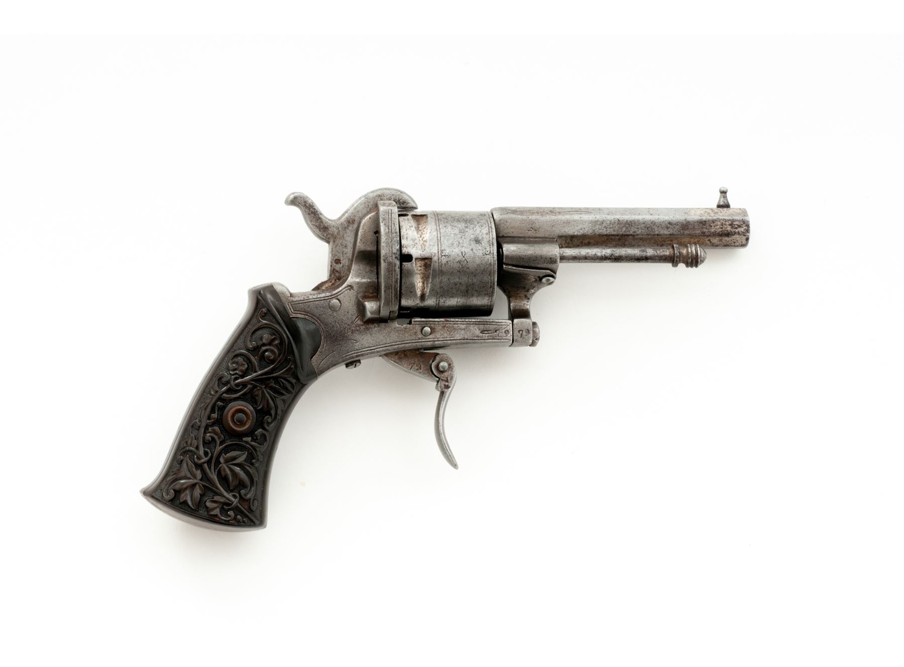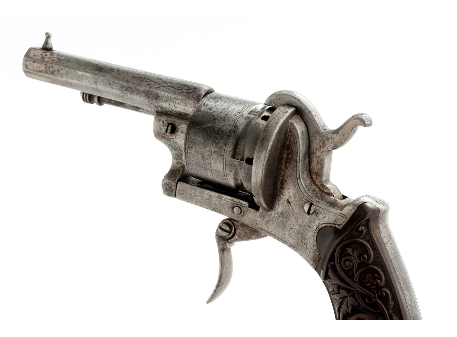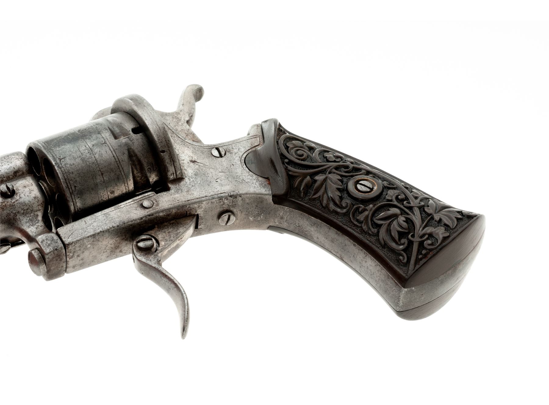 Antique Small Frame European Double Action Pinfire Pocket Revolver, in the style of Lefaucheux but likely of Belgian mfg., marking on cylinder periphery reads, in part, ''American'' (balance illegible), #79, approx. 7.5mm pinfire cal., 3'' octagonal barrel engraved with interlocking scroll design and with tall bead front sight, right-side-mounted ejector rod with turned head, hinged loading gate marked ''LH'', folding trigger, originally full nickel-plated finish, two-piece brown gutta percha grips with raised floral-and-vine motif in deep relief. Condition is good retaining perhaps 10% nickel (difficult to discern where missing as colors match closely). Grips show no wear or cracks, fit perfectly, and the raised design is lovely. Action is crisp in both double- and single-action; bore is dark. Est.: $200-$300. (Antique)