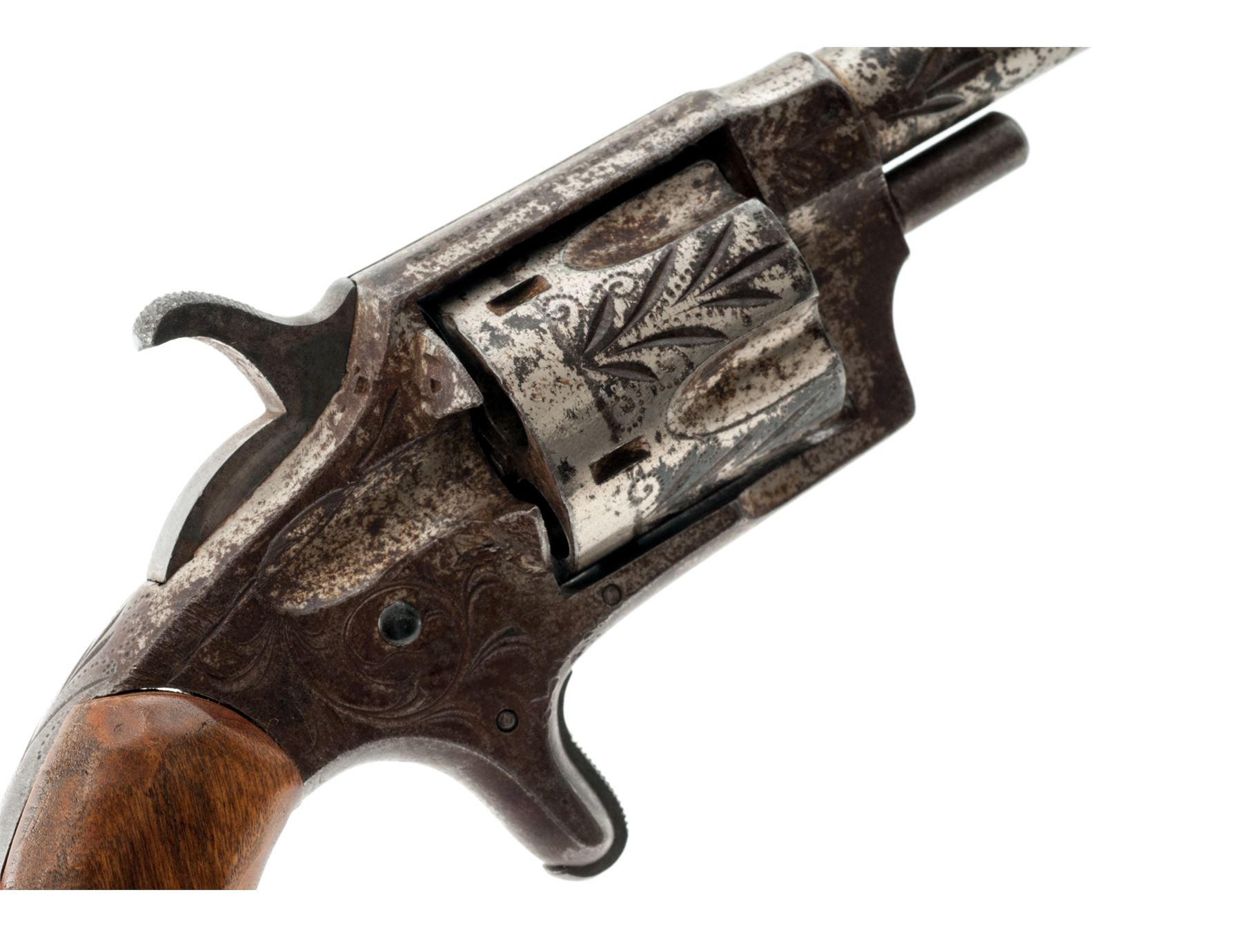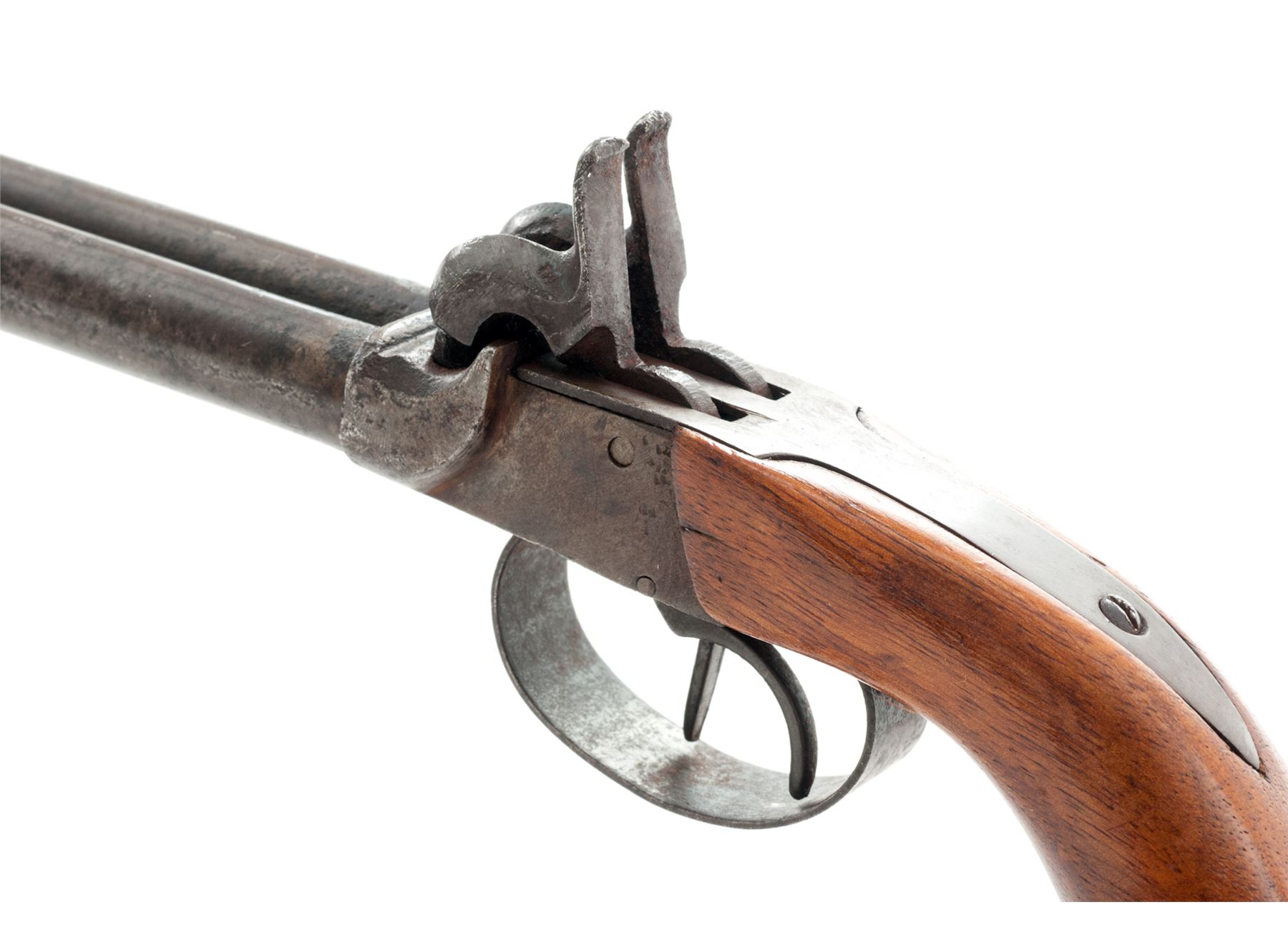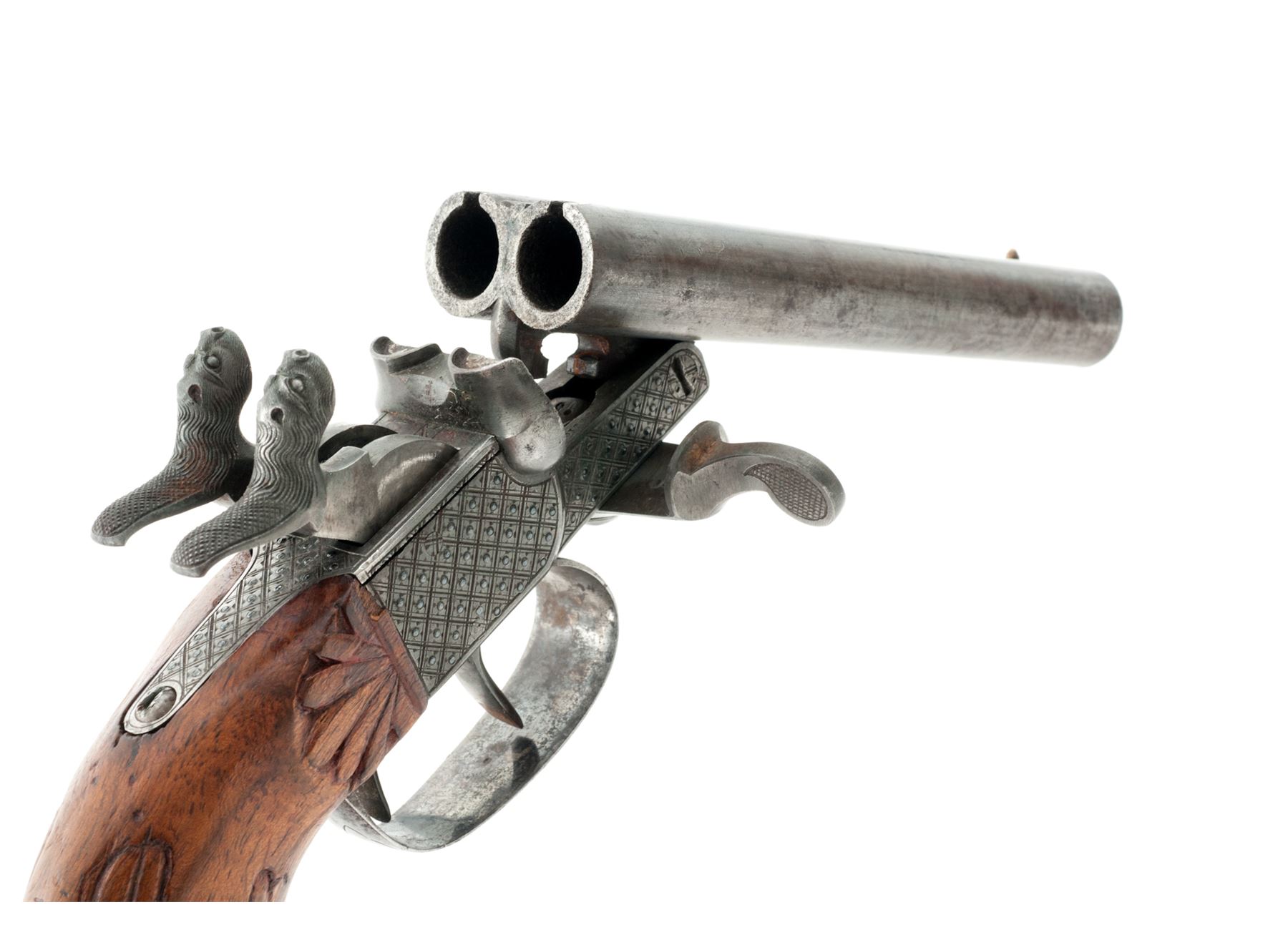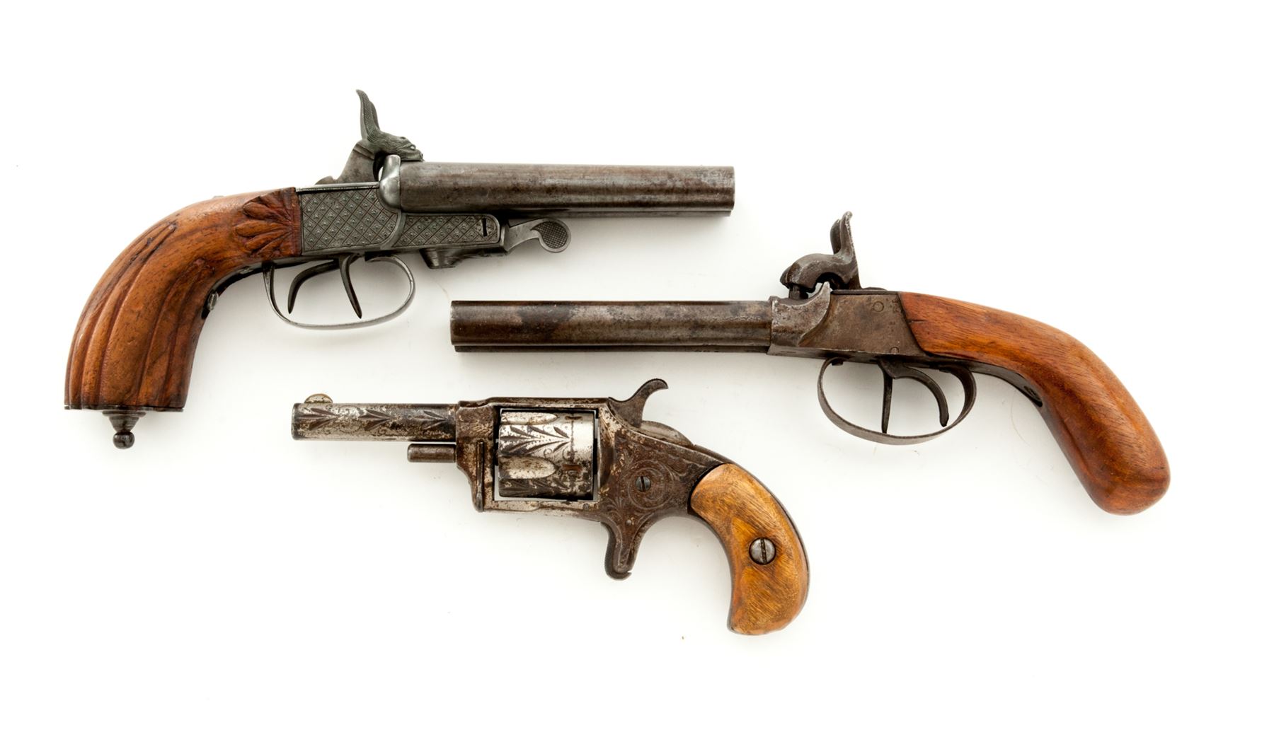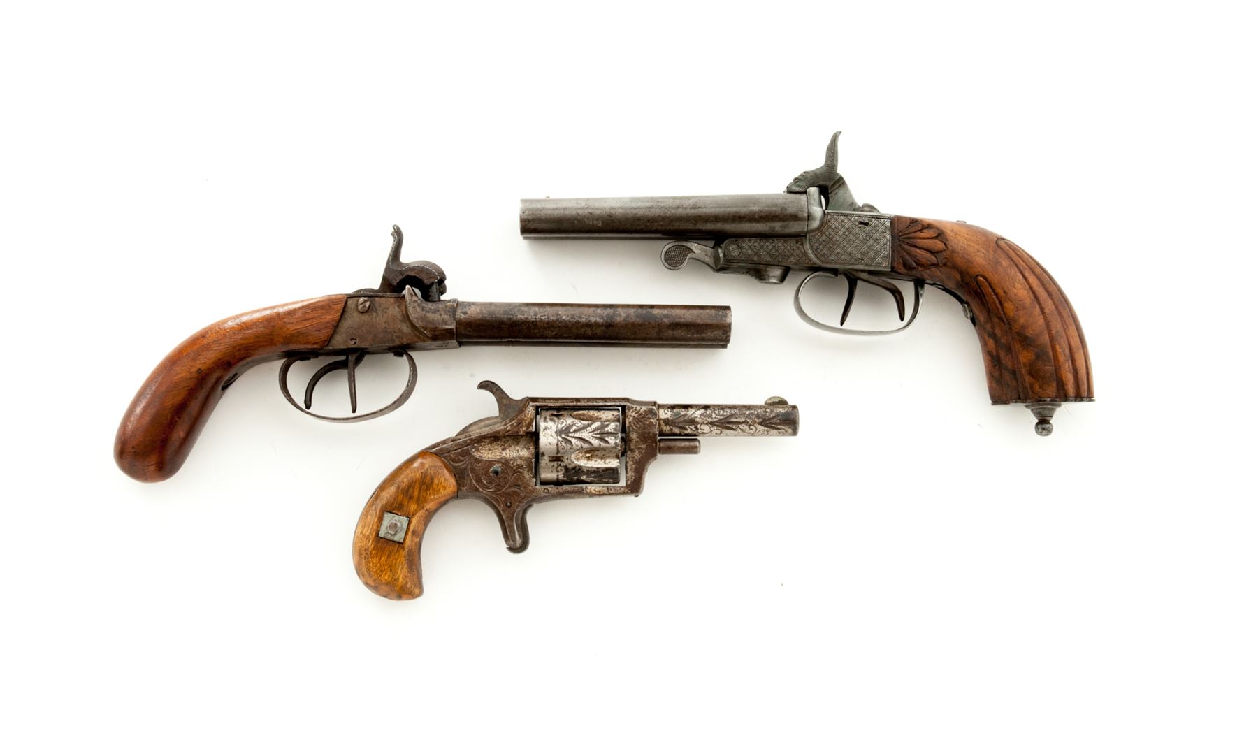 Lot of Three (3) 19th Century Handguns: (1) European Double Barrel Boxlock Percussion Pistol, #50, approx. .44 cal., 4-1/8'' round barrels marked ''Gussstahl'' (''Cast Steel'' in German) on top and serial number and proofmarks underneath, plain steel frame with serial number and proofmark, matching twin hammers and triggers, plain triggerguard, one-piece European hardwood grip. Condition is good to very good retaining no original metal finish with occasional light peppering and dings to barrels; grips are smooth and solid. Actions are crisp; bores appear dark. (2) European Double Barrel Boxlock Pinfire Pistol, #2, approx. .44 cal., 4-5/16'' tip-up round barrels with shotgun style top and bottom ribs and small brass pin front sight, frame engraved in a basketweave pattern with raised dots and marked ''2'' (perhaps one of a pair), engraved barrel release lever, hammer strikers are exquisitely formed as lion heads with finely checkered thumb spurs, twin triggers, carved and fluted one-piece European hardwood grip, flat metal buttplate with finial. Condition is very good showing faint original twist pattern finish to barrels, occasional dings, sharp engraving and an overall gunmetal gray color. Grip is smooth and solid showing nice color. Actions are tight; bores are clean with light rifling. (3) American Blue Jacket No. 2 ''Suicide Special'' Spurtrigger Cartridge Revolver, NVSN, .22 cal., 2-5/8'' round barrel marked ''Pat. March 25, 1871'' on top, solid frame marked ''Hopkins & Allen Mfg. Co.'' and ''Blue Jacket No. 2'' on top strap, floral engraving on barrel, frame and fluted 5-shot cylinder, two-piece hardwood grips. Condition is good retaining approx. 25% original nickel plating mixed with scattered roughness and discoloration. Grips are hobbyist replacements. Action functions but cylinder does not turn; bore is dark. Est.: $500-$750/lot. (Antique)
