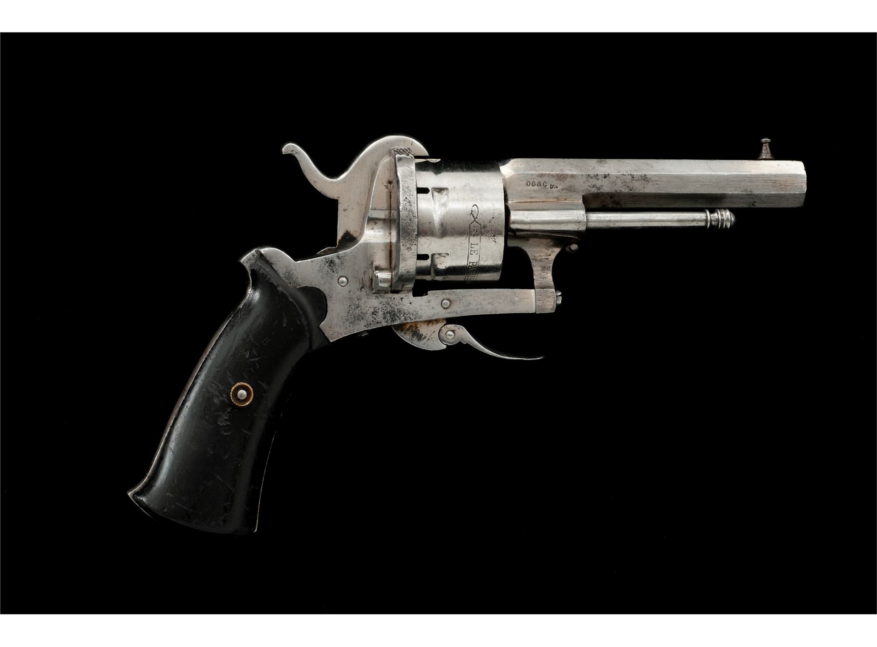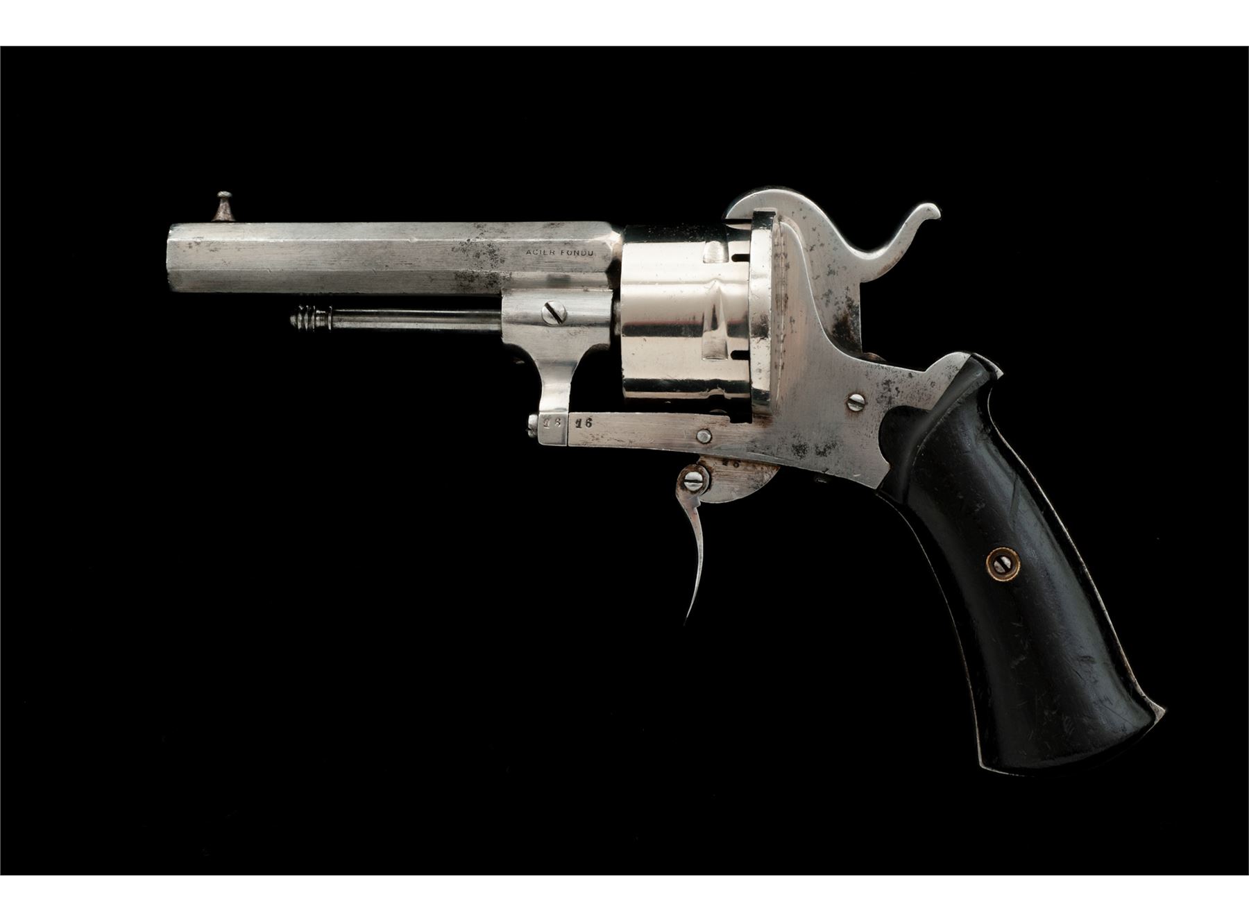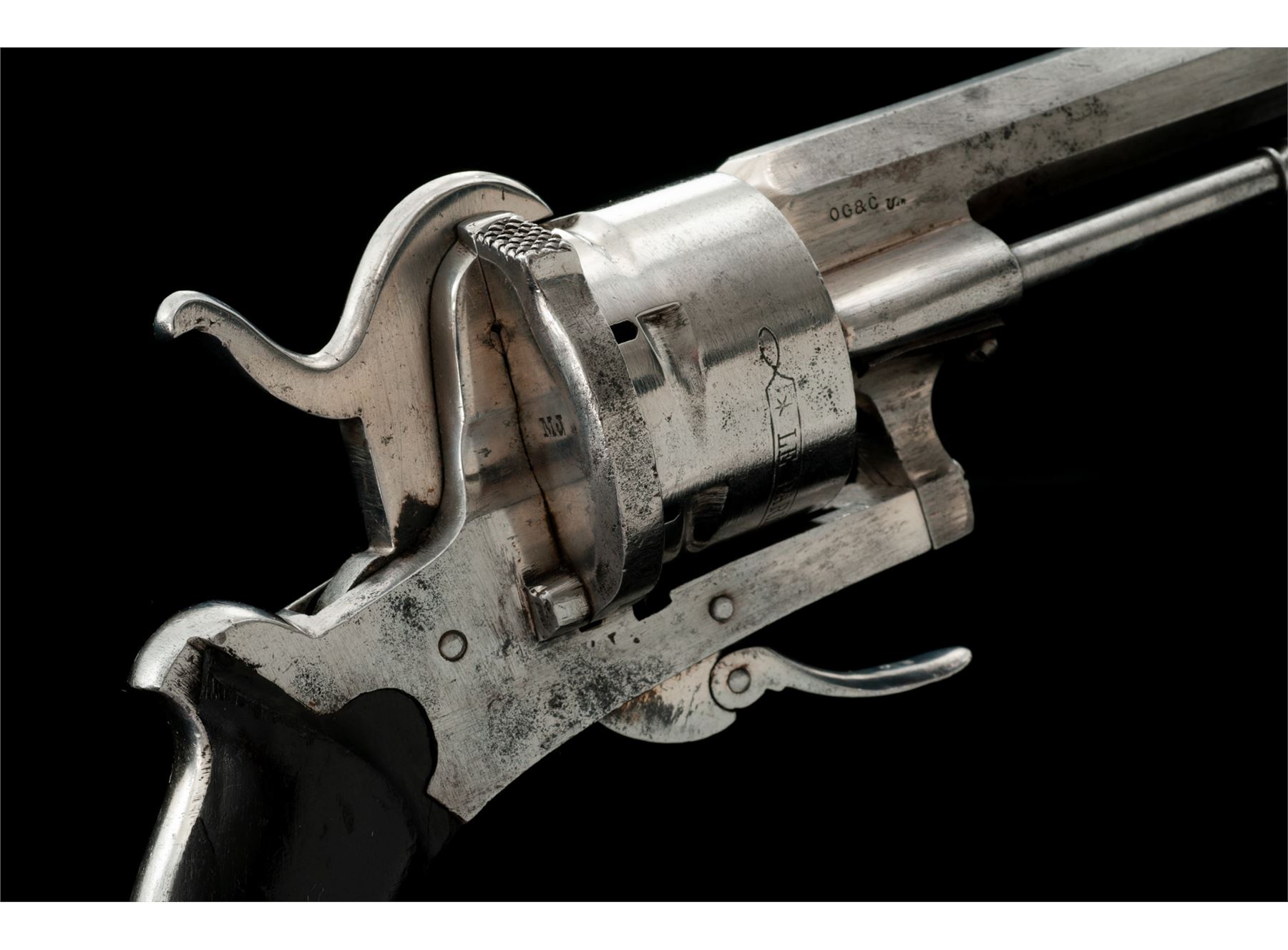 Antique Large Bore European Double Action Pinfire Revolver, in the style of Lefaucheux but likely of Belgian mfg., marked ''*Le Parisien*'' on cylinder periphery, #16, 11mm PF cal., 4'' octagonal barrel with tall bead front sight is maker marked ''OG&C'' on right side, ''Acier Fondu'' (''cast steel'') on left, right-side-mounted ejector rod with turned head, hinged loading gate marked ''MJ'', folding trigger, full nickel-plated finish, two-piece ebonized hardwood grips. Condition is fine retaining approx. 65% nickel (difficult to discern where missing as colors match closely). Grips show light dings from use but are without cracks and retain most original varnish finish. Action is crisp in both double- and single-action; bore is shiny with deep rifling. Est.: $300-$450. (Antique)