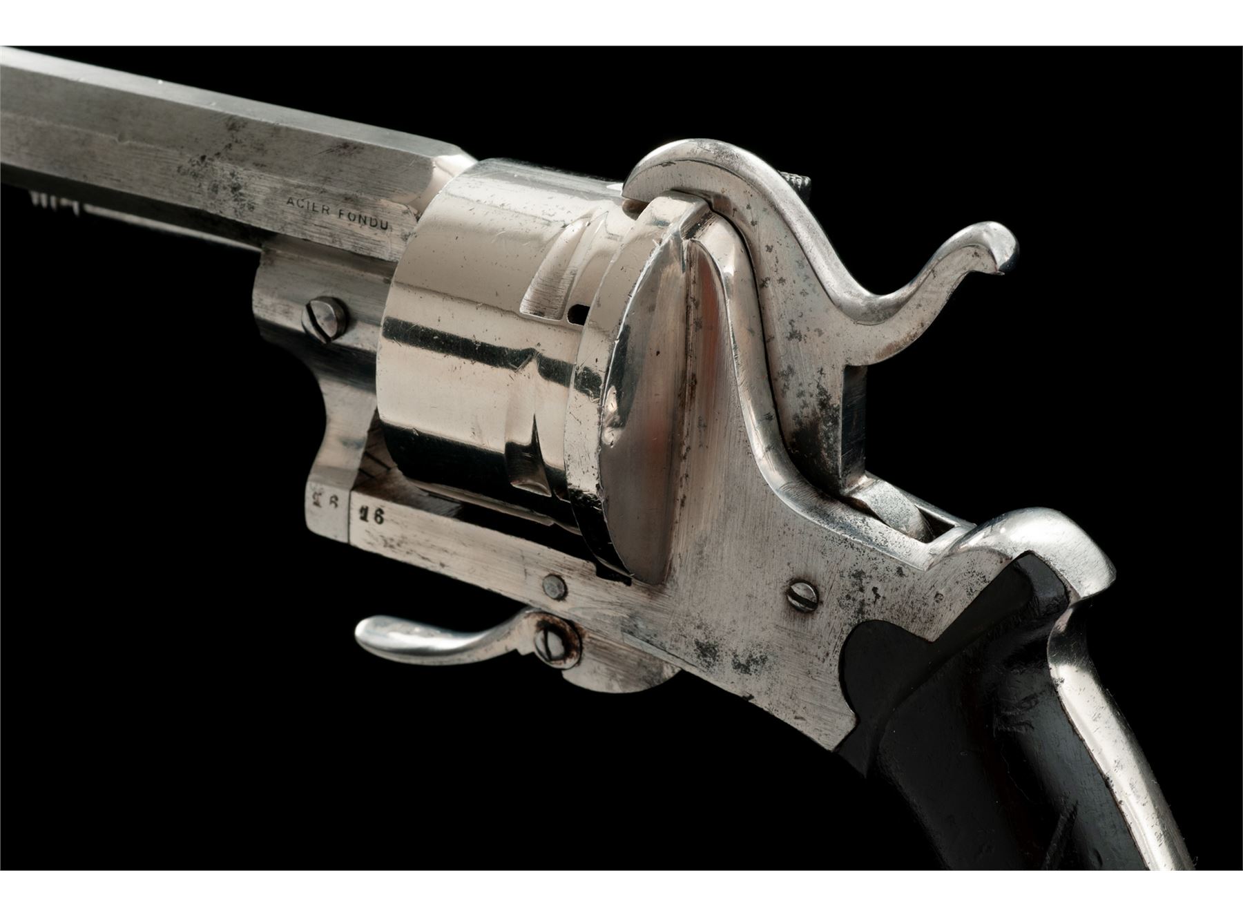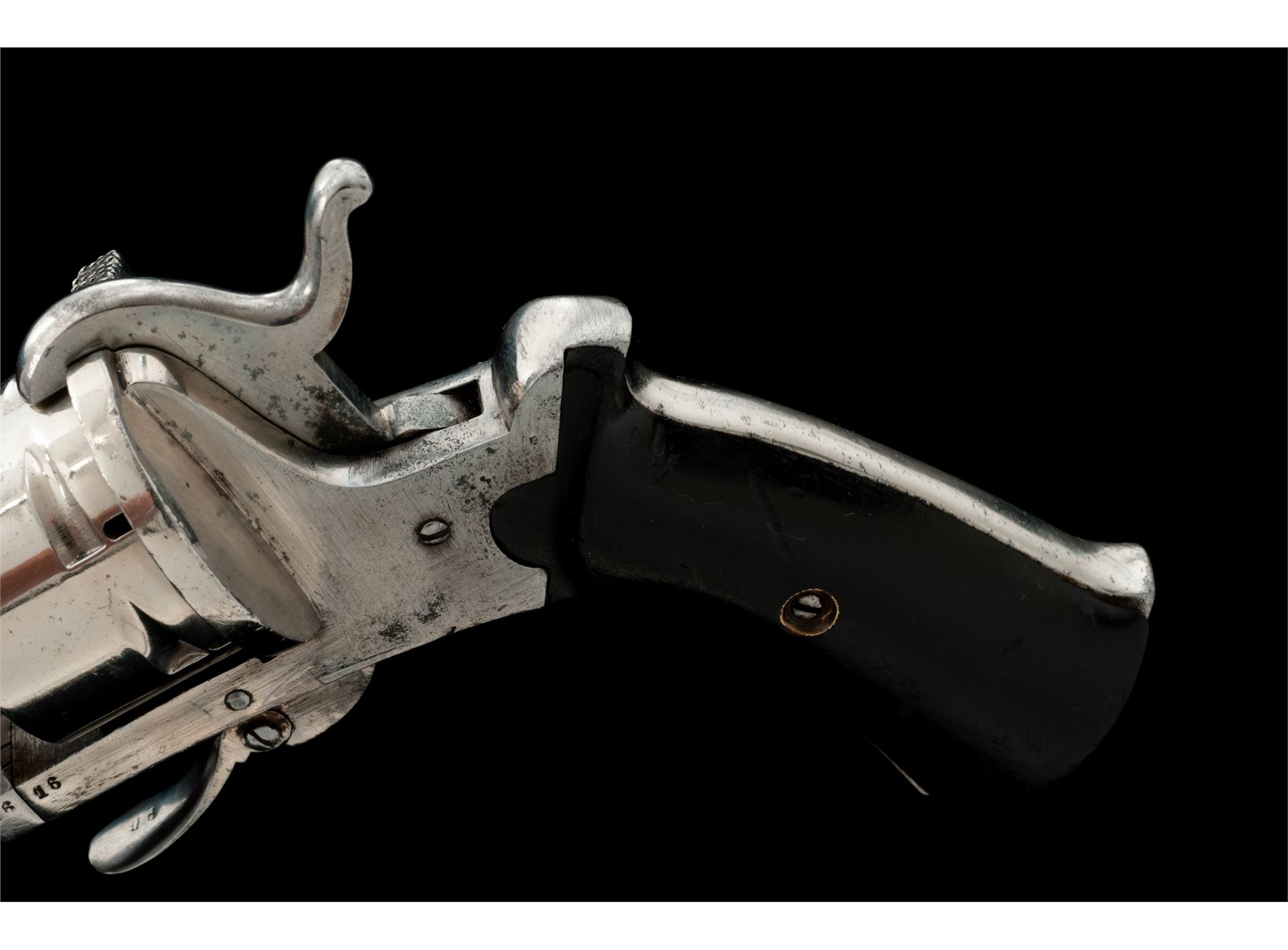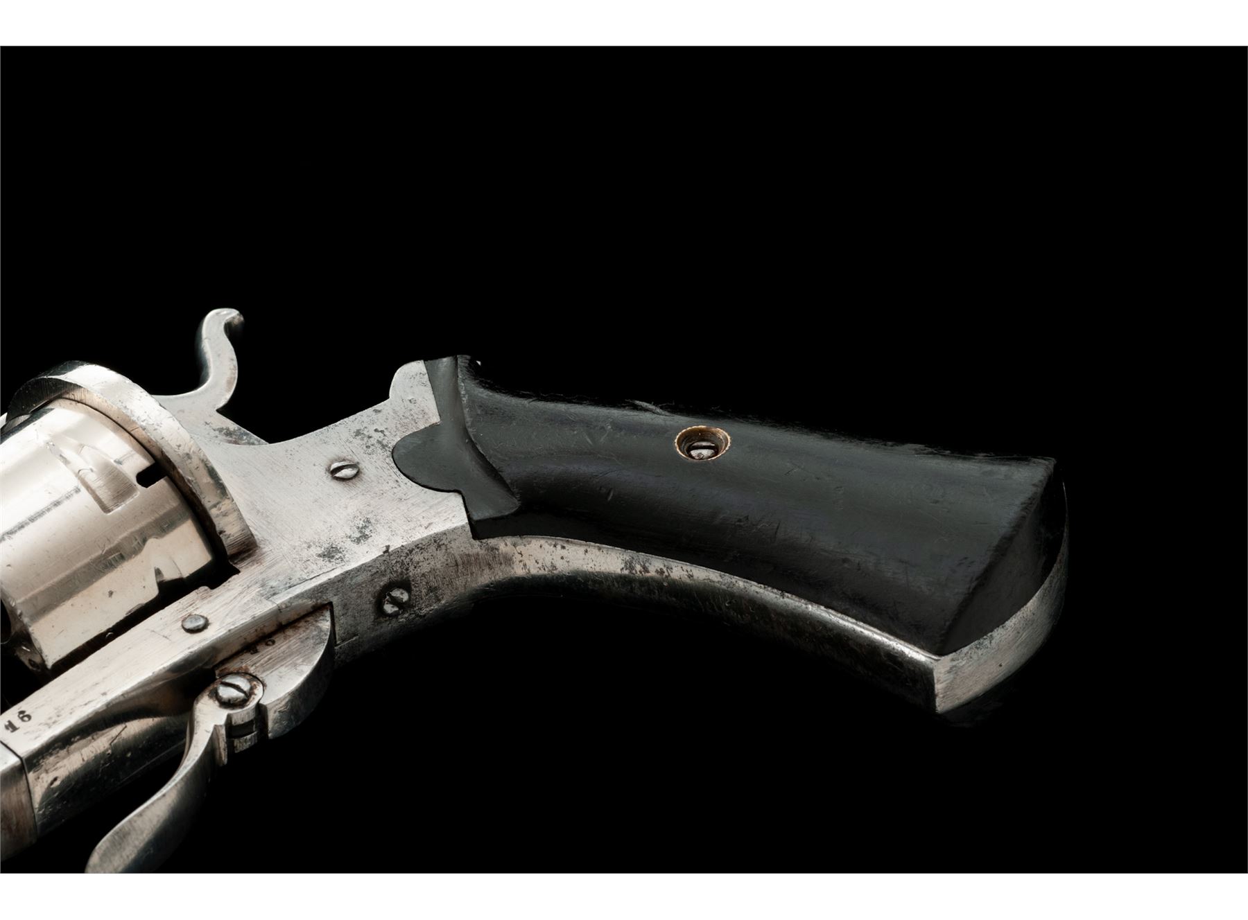 Antique Large Bore European Double Action Pinfire Revolver, in the style of Lefaucheux but likely of Belgian mfg., marked ''*Le Parisien*'' on cylinder periphery, #16, 11mm PF cal., 4'' octagonal barrel with tall bead front sight is maker marked ''OG&C'' on right side, ''Acier Fondu'' (''cast steel'') on left, right-side-mounted ejector rod with turned head, hinged loading gate marked ''MJ'', folding trigger, full nickel-plated finish, two-piece ebonized hardwood grips. Condition is fine retaining approx. 65% nickel (difficult to discern where missing as colors match closely). Grips show light dings from use but are without cracks and retain most original varnish finish. Action is crisp in both double- and single-action; bore is shiny with deep rifling. Est.: $300-$450. (Antique)