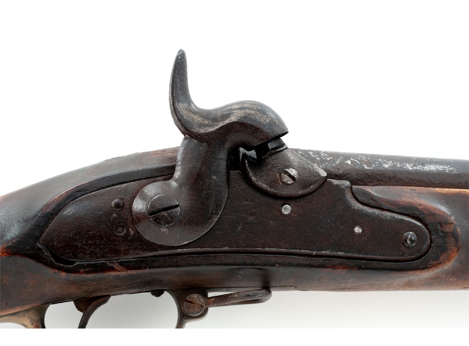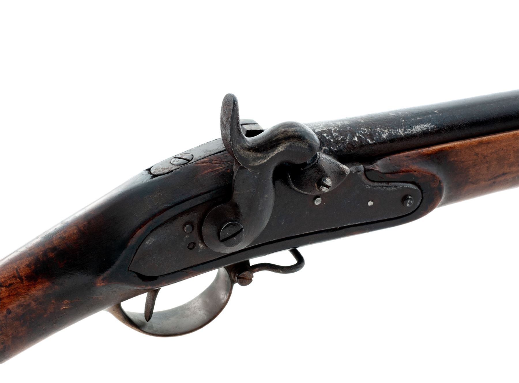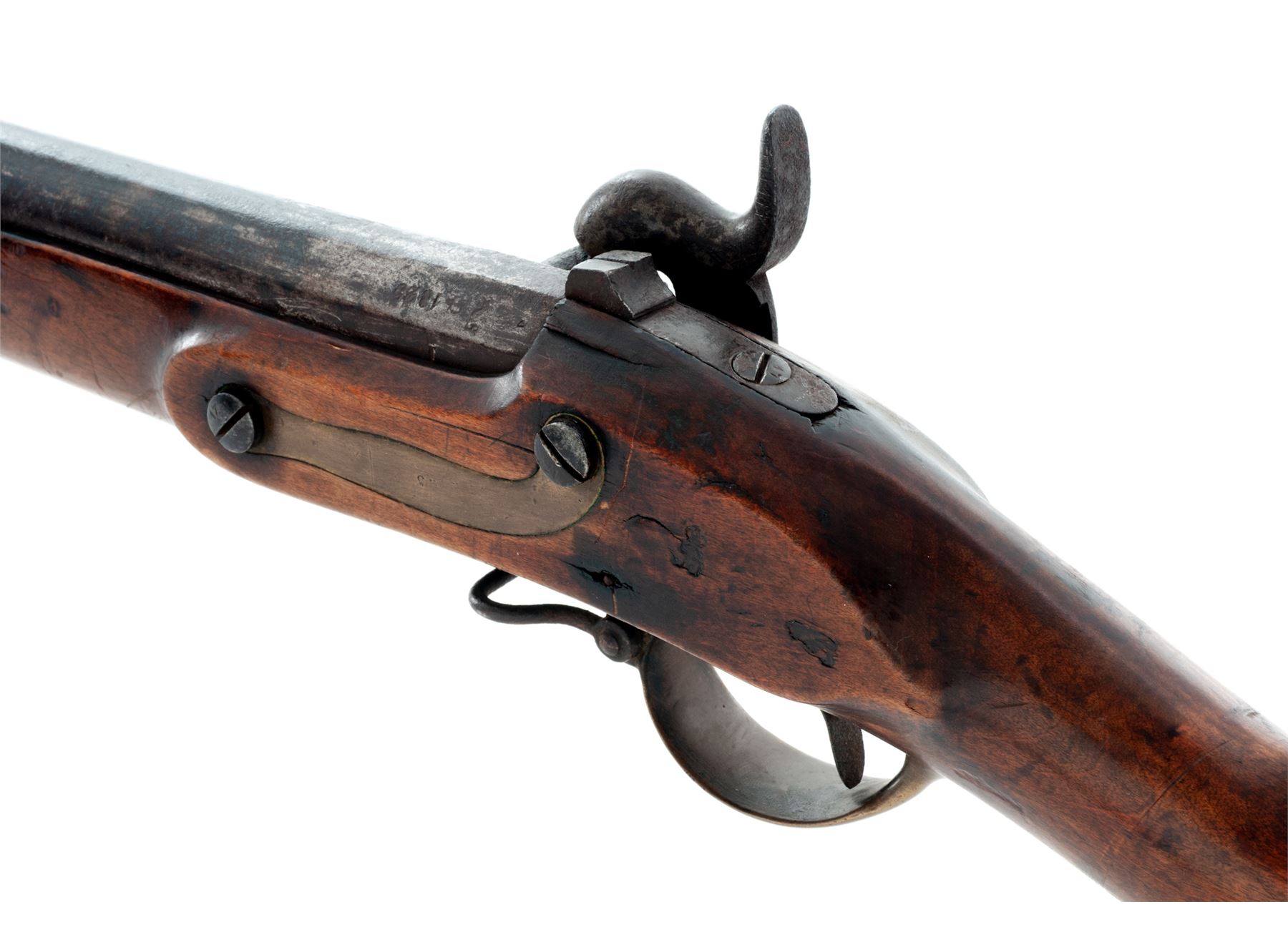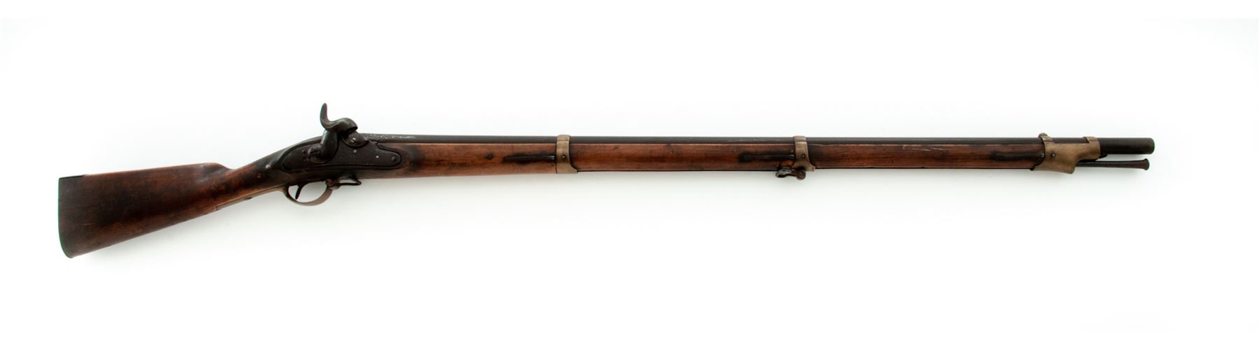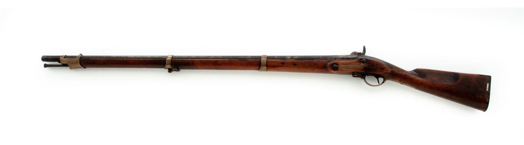 Antique Three-Band Fullstock Percussion Infantry Musket, Likely Adapted From a European Single Shot Flintlock Musket, NVSN, approx. .75 cal., 41'' round barrel (with a short octagonal section at breech) has a blade front sight integral with brass double-strap front barrel band and a raised grooved rear sight atop breech area; an arrow-shaped bayonet lug is mounted below the muzzle; beveled steel lockplate with pointed rear teat; heavy military-style hammer and percussion bolster; furniture including brass triggerguard with front sling swivel, brass serpentine sideplate, three spring-retained brass barrel bands (top with sling swivel), iron buttplate marked ''450'' at top tang screw; and iron ramrod, with one-piece hardwood fullstock. Condition is fair to good retaining no original finish, with metal having a deep brown age patina mixed with scattered medium-to-heavy pitting (especially heavy at breech/nipple area). Stock with left-side recessed ''cheekpiece'' shows a ''(crown)/HP'' mark at left butt, two ''(crown)/B'' marks on raised apron opposite lock, several associated marks on bottom of butt, and ''M168'' on right butt, in addition to the expected scars and scrapes from age and hard military use, but is solid. Action is strong; bore shows deep rust. Est.: $200-$400. (Antique)