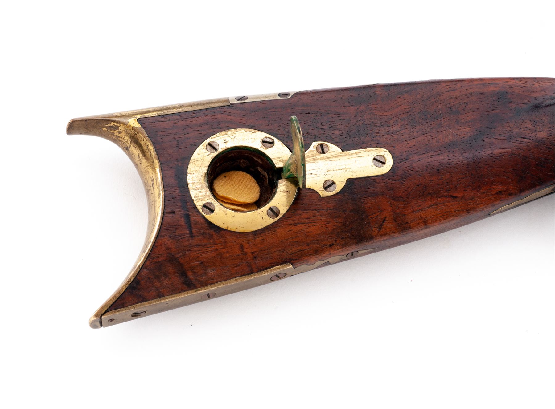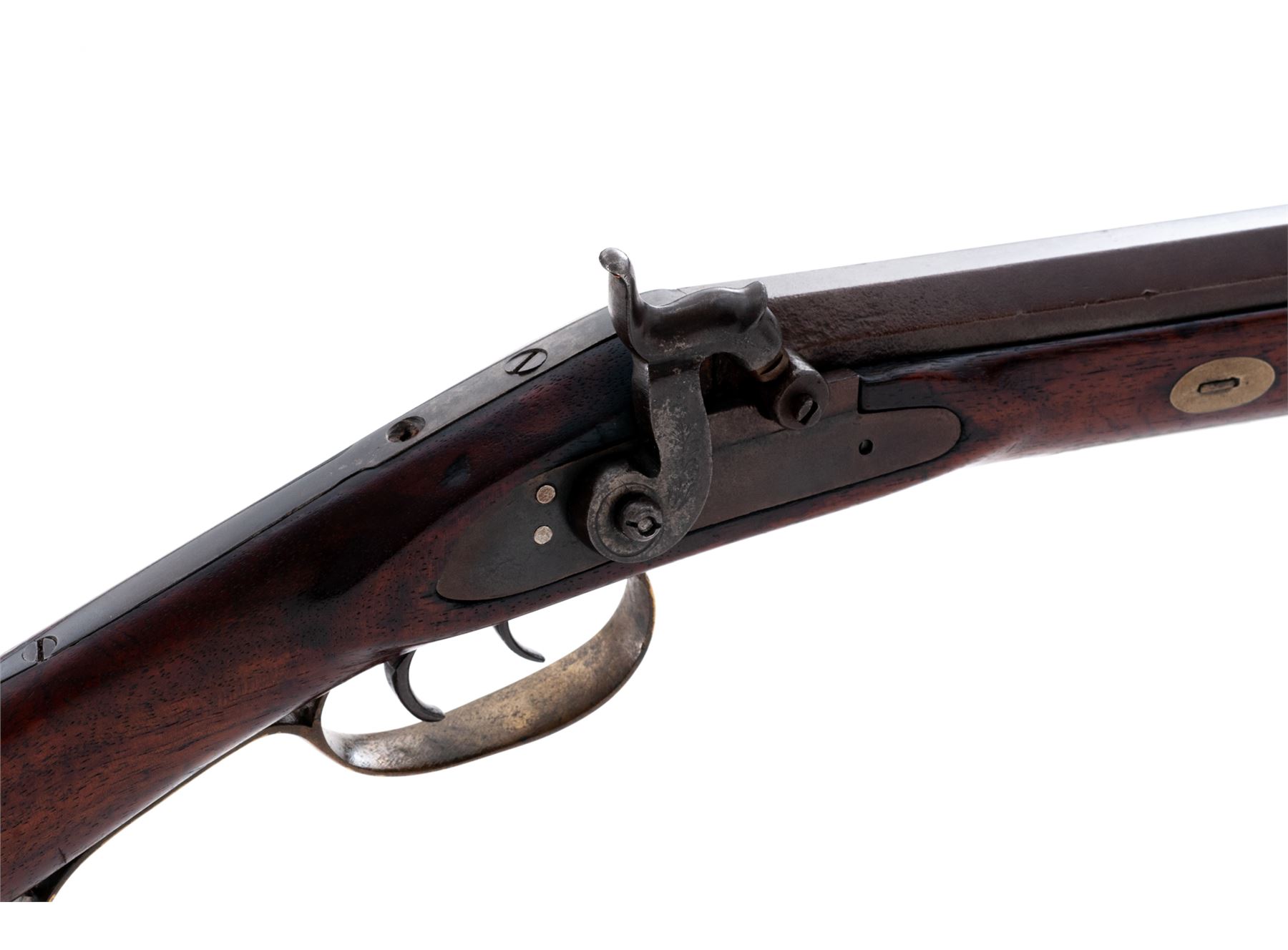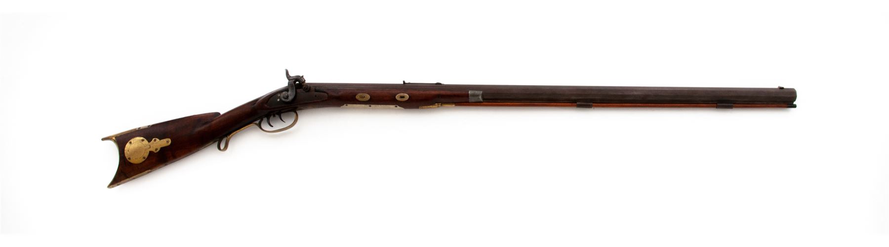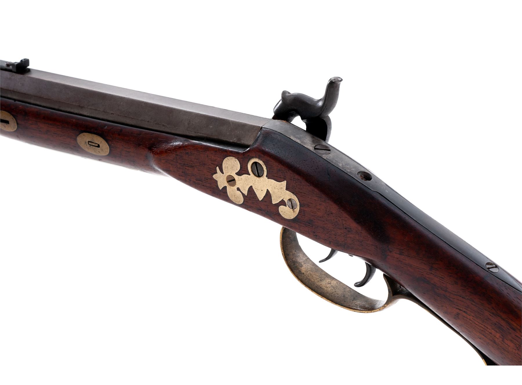 Antique American Halfstock Percussion Plains Style Sporting Rifle Converted From Original Flintlock, NVSN, approx. .36 cal., 33-5/8'' heavyweight octagonal barrel with dovetailed front blade sight (plus small hole within engraved area at top of muzzle, perhaps for an original post-type sight) and adjustable open rear sight; unmarked flush-mounted steel lockplate which appears to have had its upper portion, including pan and frizzen assembly, removed at the time of conversion to percussion using a simple bolster with nipple and lightly engraved hammer; double set triggers; brass furniture including triggerguard with rear finger rest and fancy pineapple front finial; patchbox with hinged door opening to trap containing a few linen patches, crescent buttplate with long lower tang having a fancy upper finial, and lower ramrod finial (two upper finials appear to be iron); German silver stock decorations including a recumbent stag inlay on left cheekpiece, fancy upper buttplate tang extension, ornately shaped sideplate, and large rectangular stock rest under the two oval barrel wedge escutcheons; pewter nosecap; hardwood ramrod with brass tip; gracefully-shaped and beautifully and tightly grained walnut halfstock having a carved left-side cheekpiece. Condition is very good, the barrel and lockplate having a smooth (perhaps later) pleasing brown finish, the brass with a glossy (perhaps originally gold or brass plated) finish, the German silver a natural light patina. Stock is smooth and solid having nice color with an oil-stained finish and showing just a bit of age darkening in bolster area. All stock inlays are present and fit tightly, screw head slots are clean, nipple is a modern replacement, middle barrel tang screw is missing. Action functions when rear trigger is pushed forward; bore is shiny and clean with deep rifling. Est.: $600-$800. (Antique)