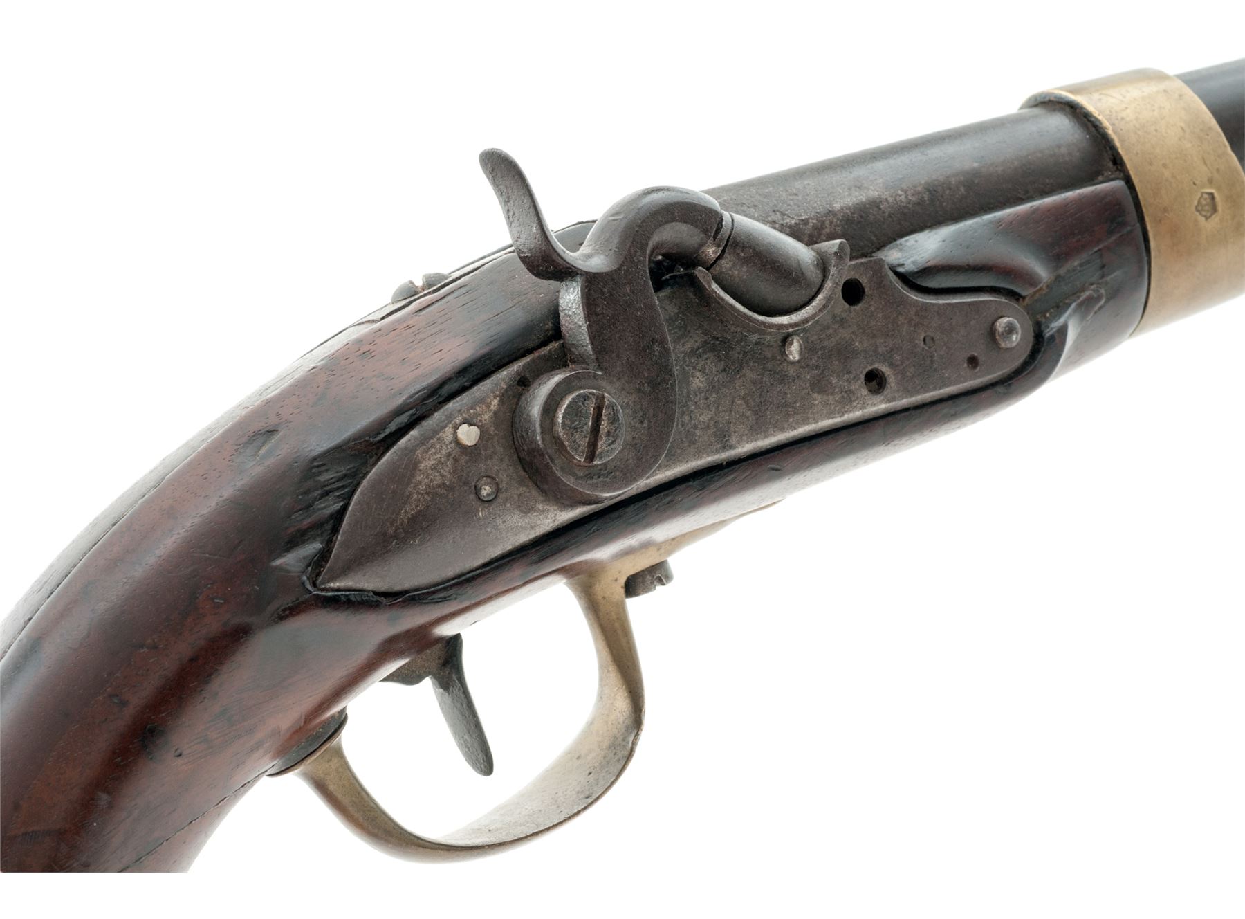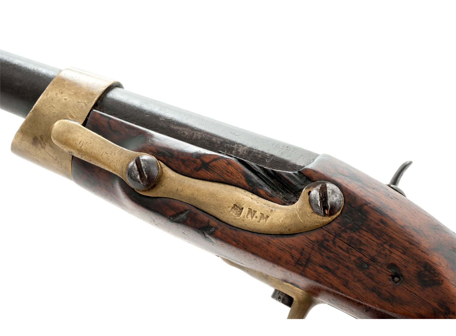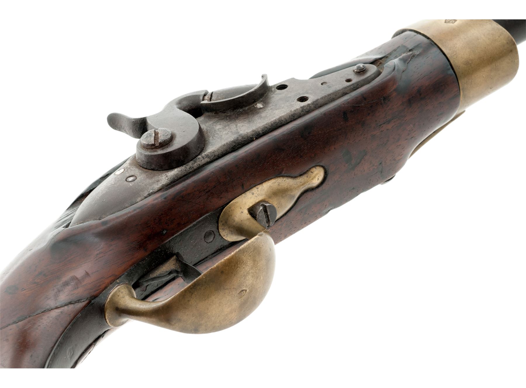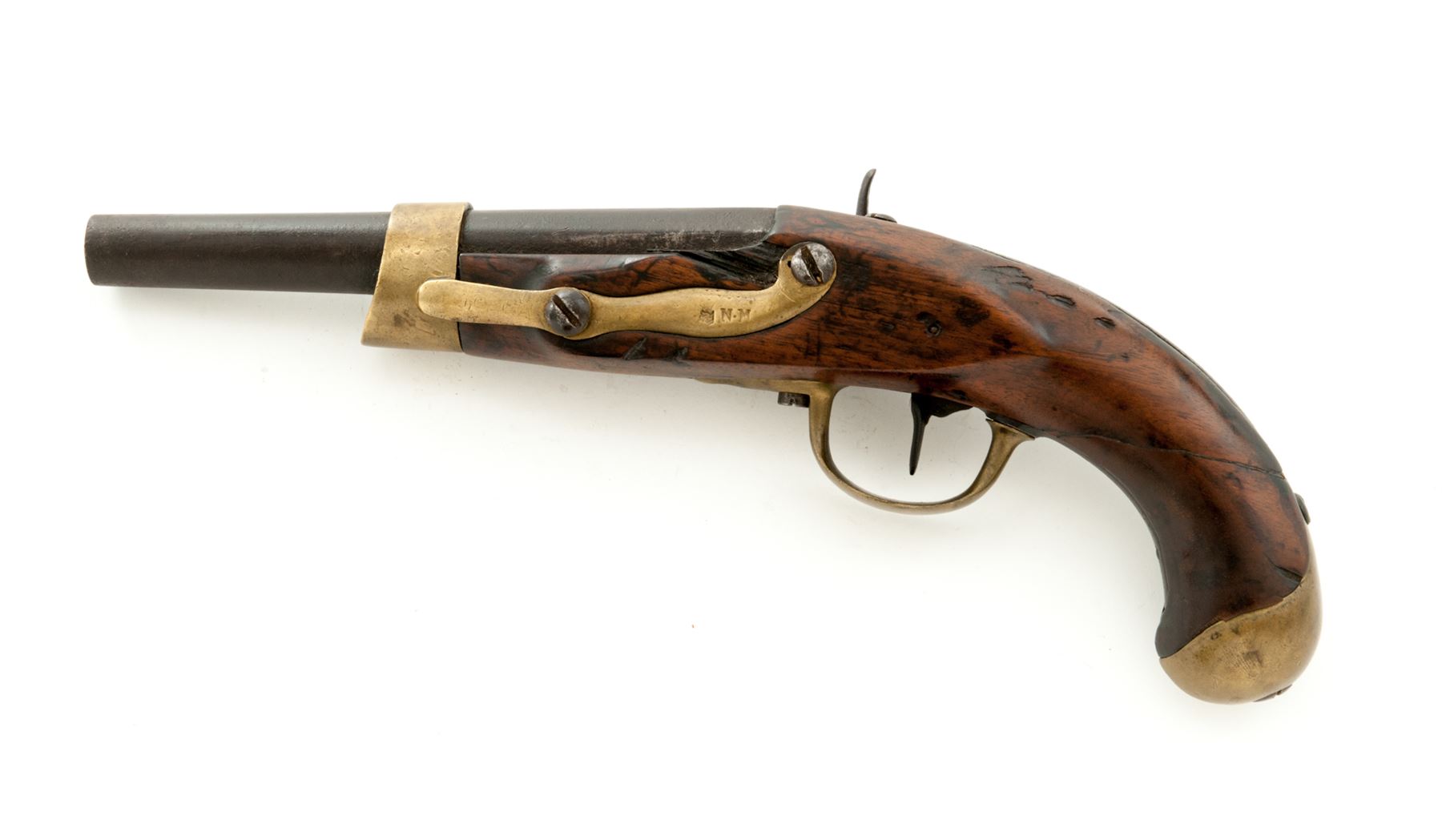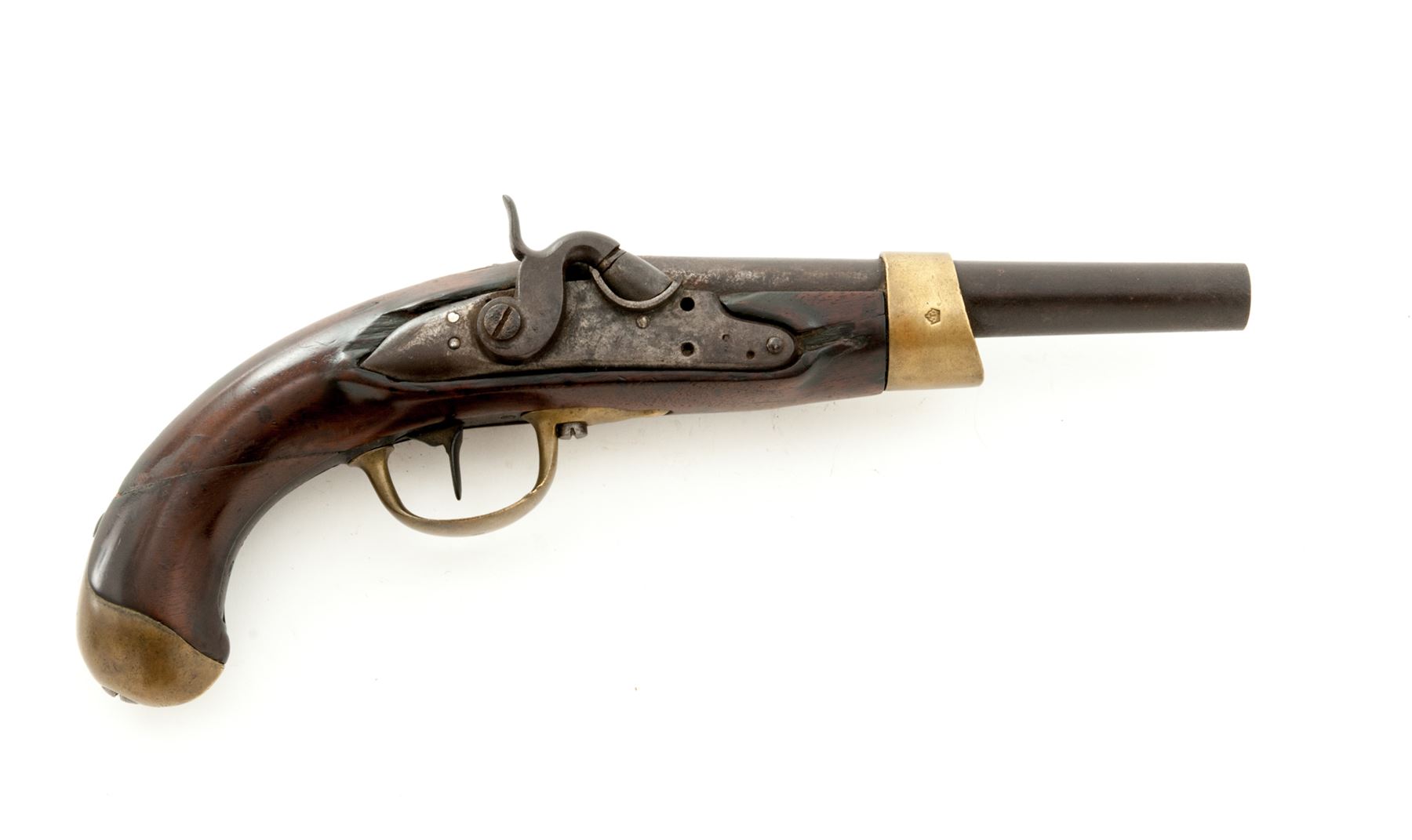 Antique European Military Style Single Shot Percussion Pistol, converted from original flintlock, NVSN, approx. .72 cal., 7-7/8'' round thin wall barrel without sights, iron lockplate is unmarked (may retain traces of original markings but illegible), distinctive percussion bolster fitted to original lockplate, iron backstrap runs full-length from barrel tang to buttcap; single brass barrel band, serpentine sideplate marked ''NM'' and with proofmark, brass triggerguard with long lower tang, brass buttcap. One-piece European walnut stock with raised carved areas surrounding the lock and on opposite side. Condition is good showing black powder pitting covering the iron parts under a dark aged patina; brass shows an aged patina; stock is solid with a longitudinal crack (securely repaired but evident) at wrist, and chips missing at front and back of lockplate. Lacks a ramrod. Action is rough but functioning; bore is dark and pitted. Est.: $400-$600. (Antique)
