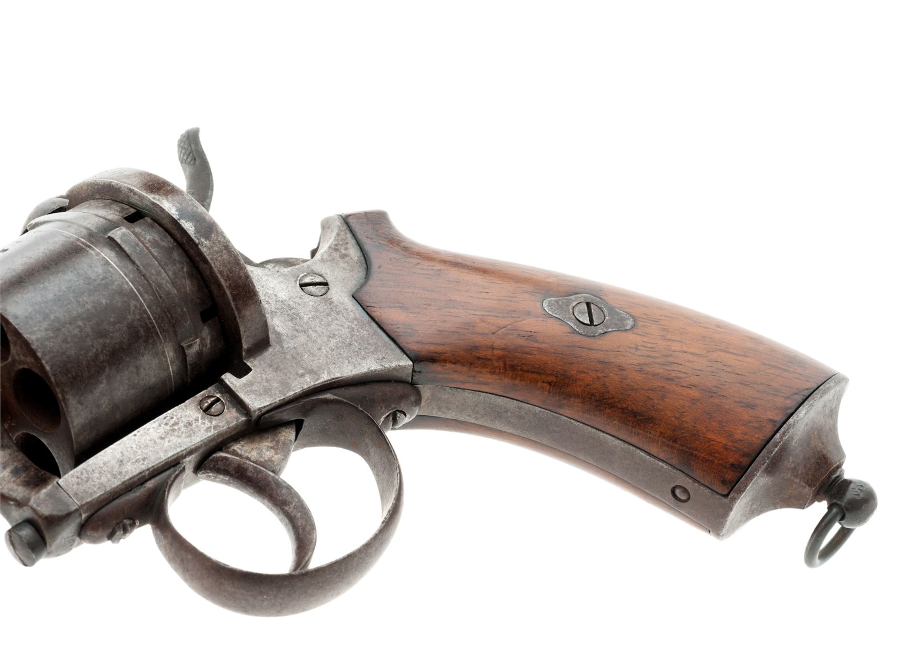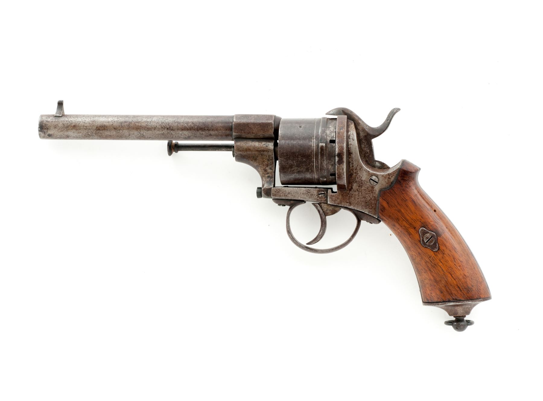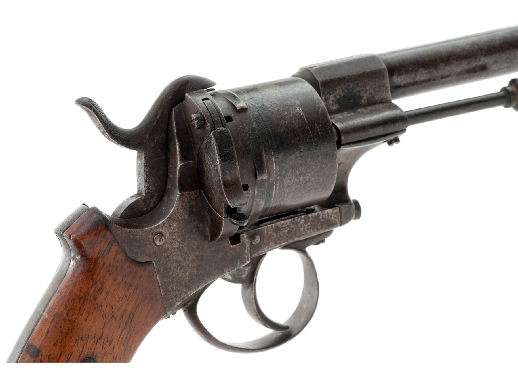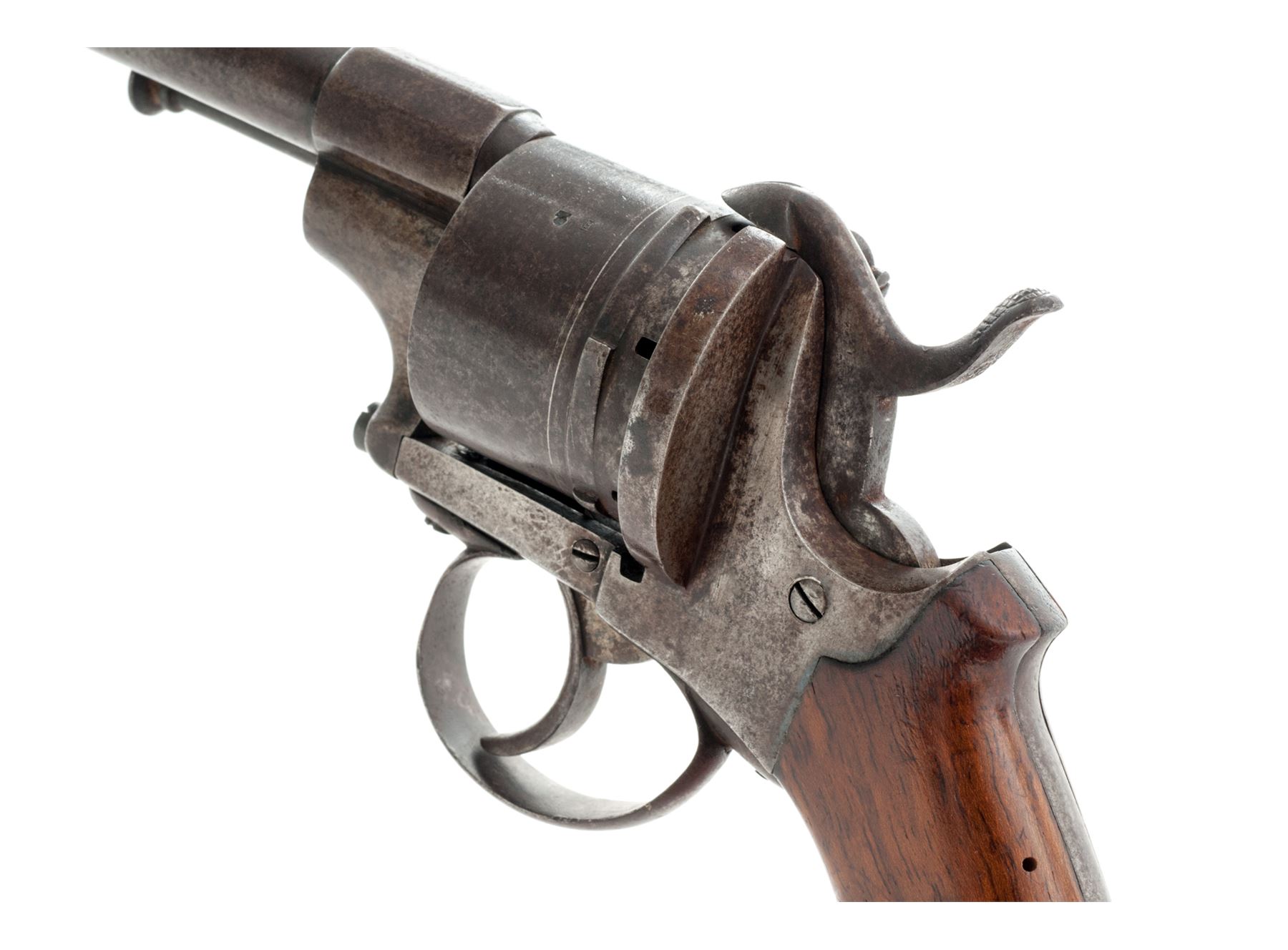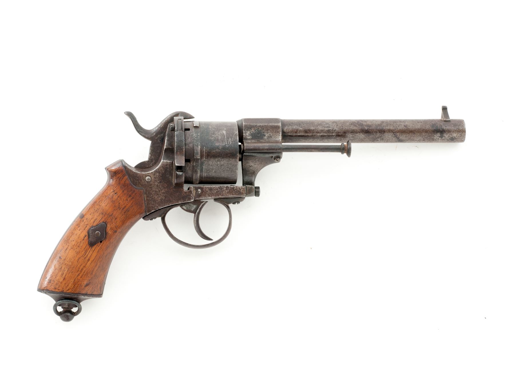 Civil War Era Lefaucheux Large Bore Model 1854 Military Double Action Pinfire Revolver, NVSN, 12mm cal., 6'' round barrel marked ''Lefaucheux'' in tiny letters on top flat of lug and with right-side mounted ejector rod having a button tip; 6-shot round cylinder is marked ''F'' and with a deeply struck (but illegible) proofmark on periphery; plain steel frame, hammer and loop triggerguard; two-piece European hardwood grips; fluted buttcap with lanyard ring. Condition is very good retaining no original finish to smooth steel parts and having an overall gunmetal patina. Grips are smooth and without chips or cracks. Action is defective, as cylinder does not rotate when trigger or hammer is pulled; bore appears clean with distinctive rifling. Est.: $450-$600. (Antique)
