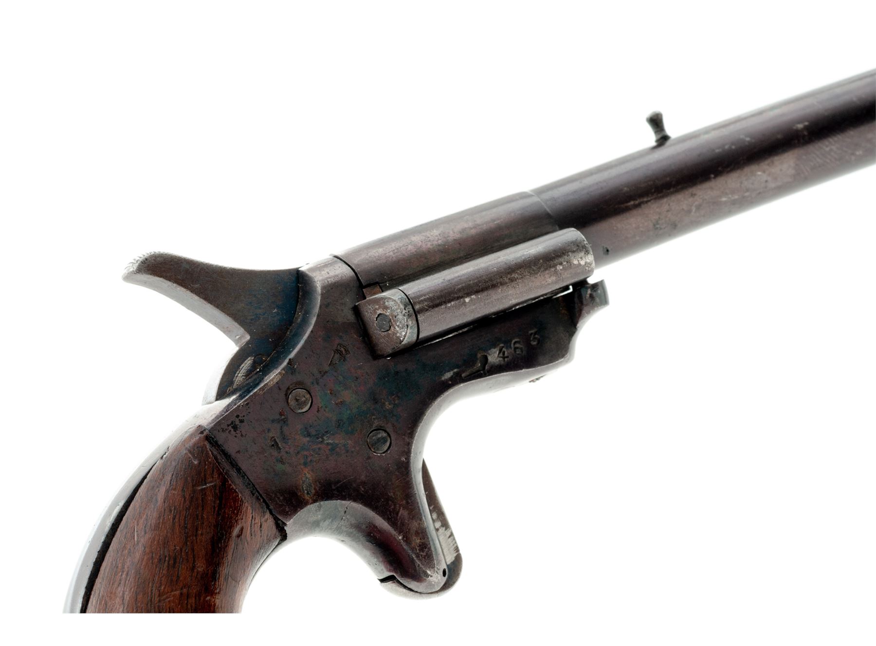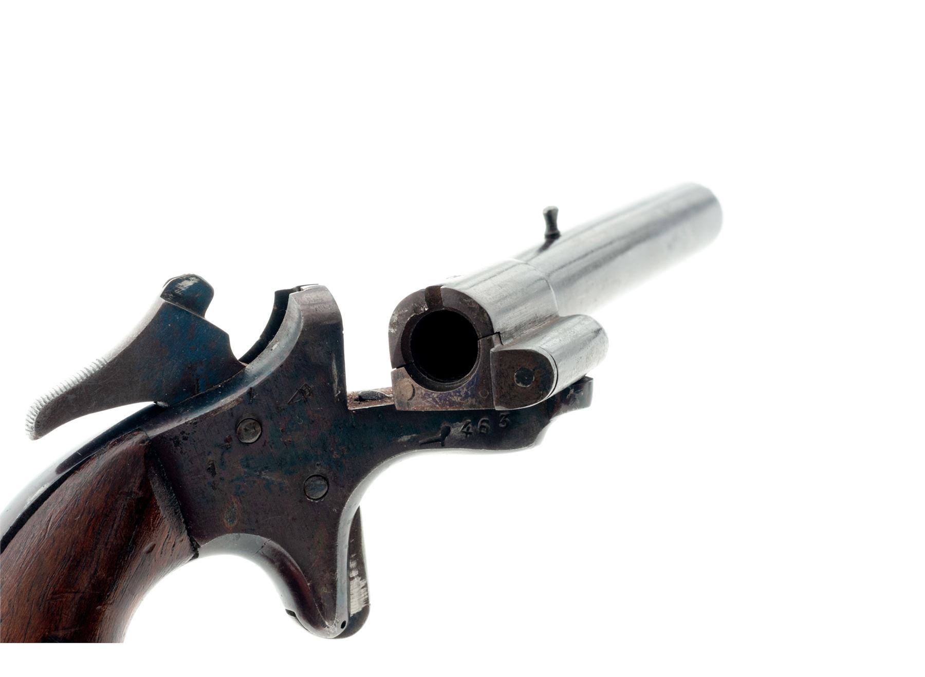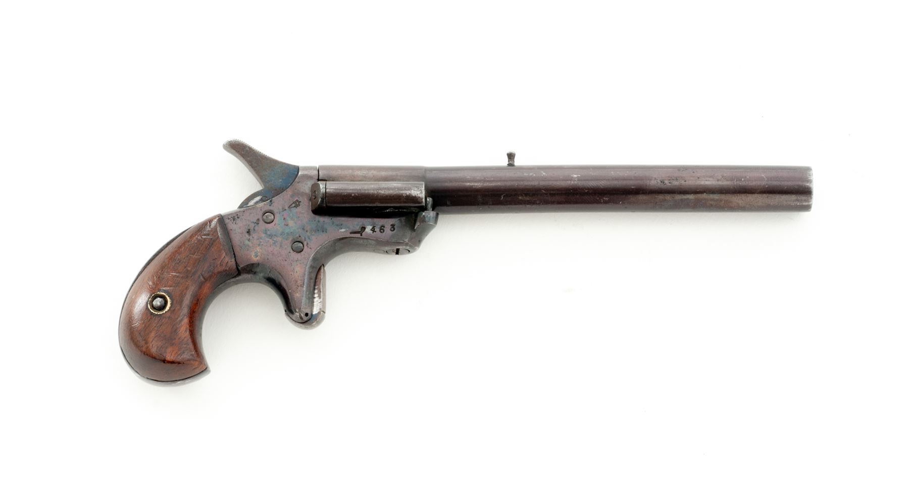 Antique Belgian Single Shot Pocket Pistol, #7463, approx. 8mm cal., 5.5'' round swing-out barrel is marked with a ''(crown)/V'' on top at breech, ''E/LG/(star)'' within an oval and ''(star)/X'' on left lug; the latter mark is repeated on left side of frame; ''(crown)/V'' appears on right frame along with the serial number. The barrel, with its tall post sight located mid-length, swings to the right for cartridge loading and features automatic ejection. Blued long-spur hammer; two-piece plain hardwood grips. Condition is fine retaining most of what appears to be an original plum-blue finish; grips are solid and fit well. Action is strong; smoothbore is clean. Est.: $150-$250. (Antique)