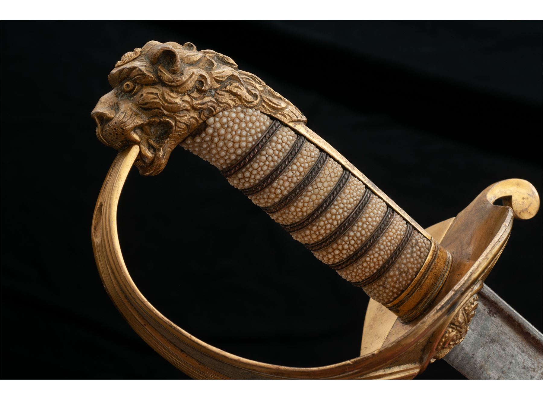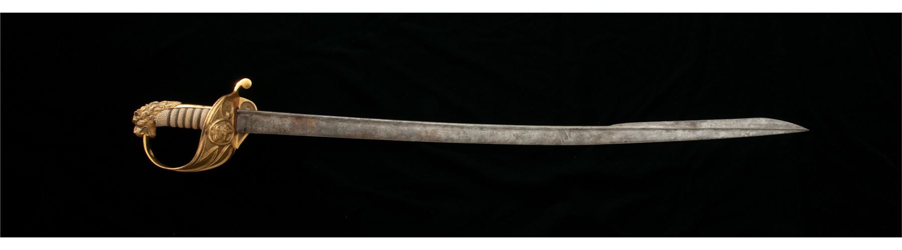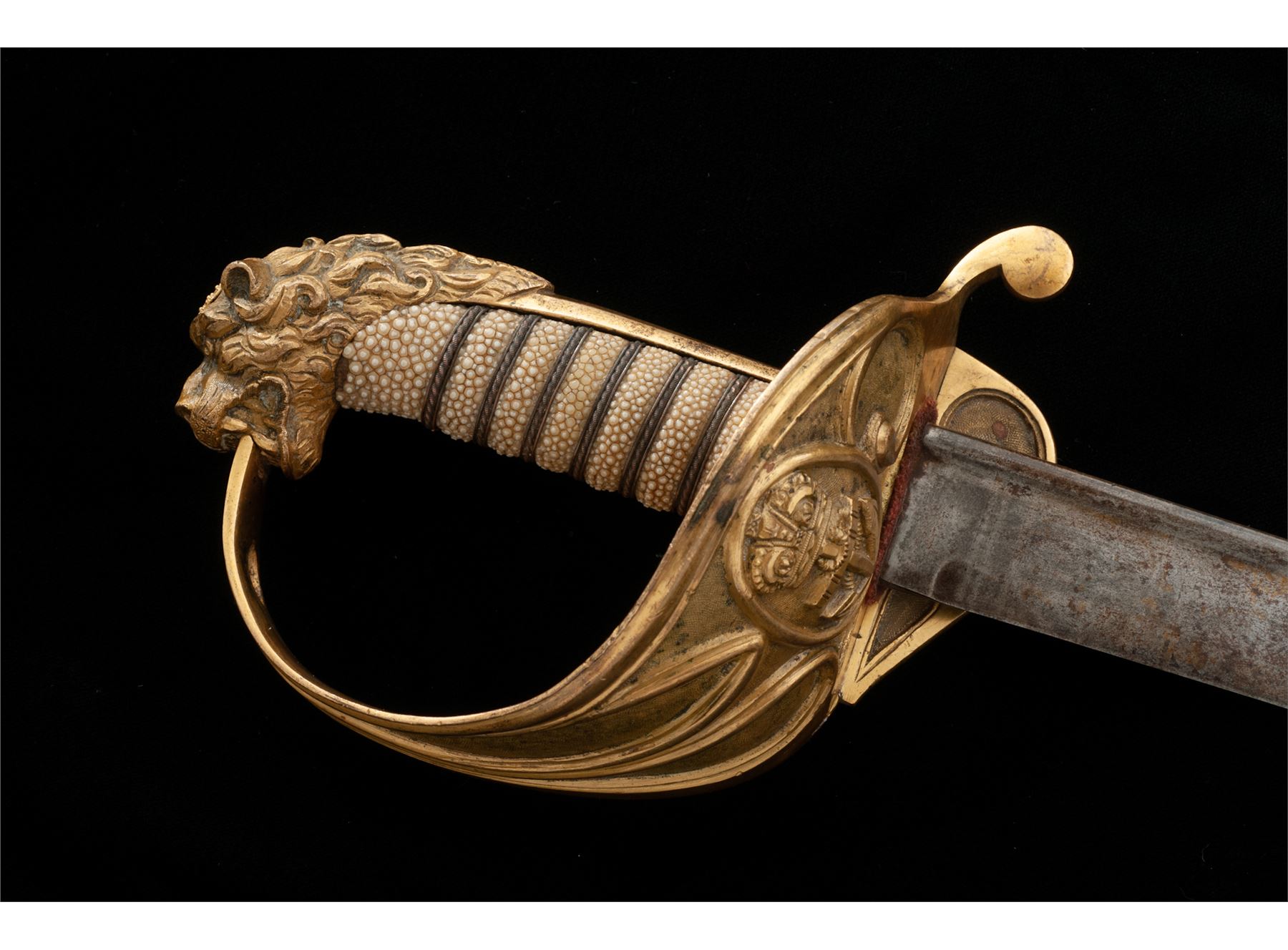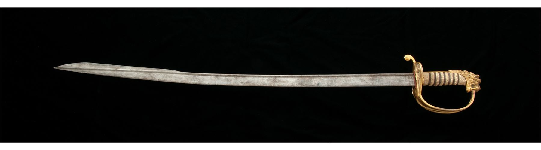 1827 Pattern British Naval Officer's Lion Head Sword, with 30'' long quill backed blade of the early 1827 pattern type swords. Lightly etched engraved with naval fouled anchor and floral motifs, showing no visible maker's mark. The fire gilted gold lions head hilt is wonderfully carved and chased. The large solid basket guard has the queen's crown over a fouled anchor, with folding rear langet. Condition is good overall. Hilt fittings retain most all of their original gold finish with some minor age spotting. Rayskin covered grip with triple wire wrapping intact. Original red cloth blade washer is present. No scabbard. Blade shows light rust patina overall, but should clean well. Overall length is 35.5''. Est.: $300-$500.
